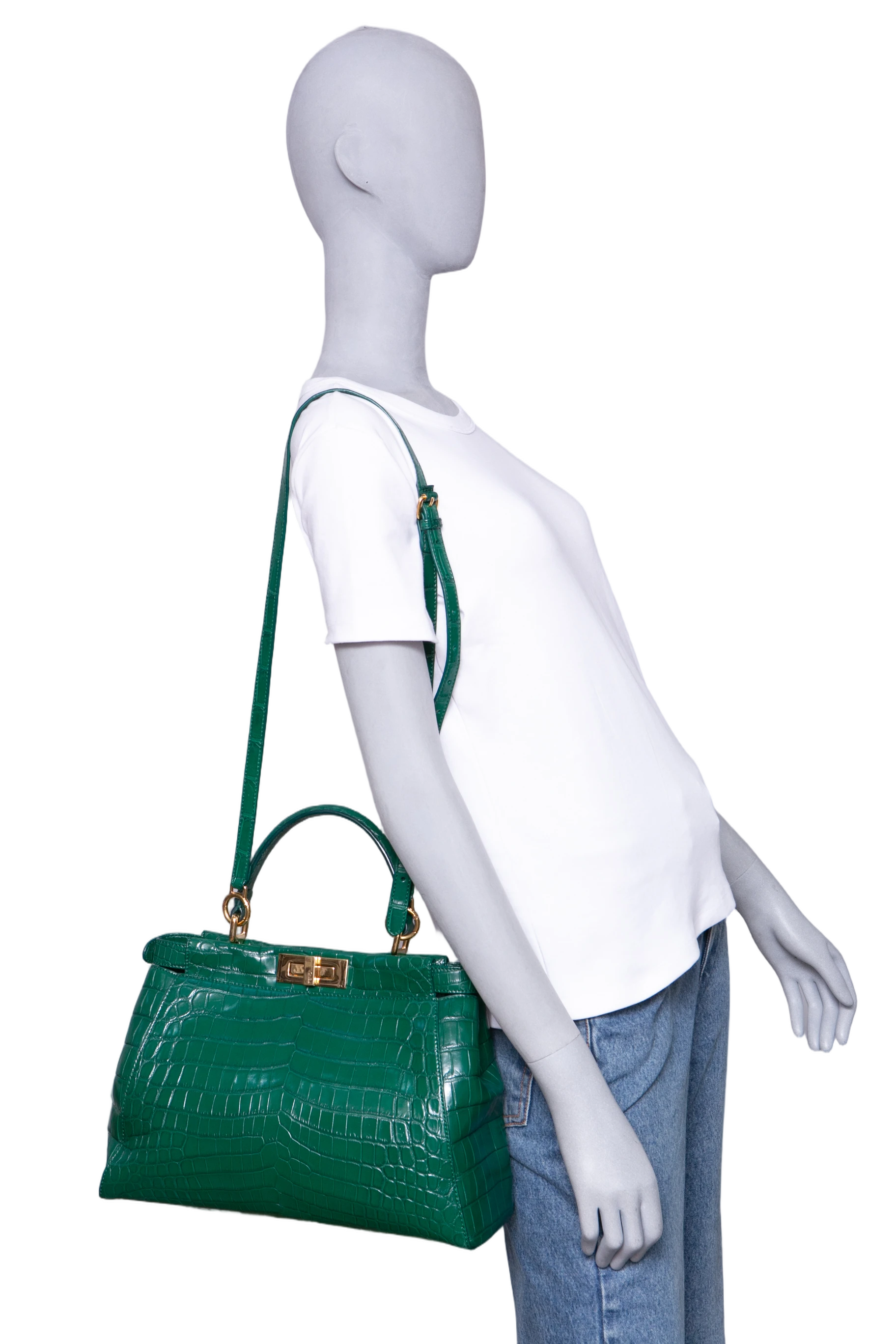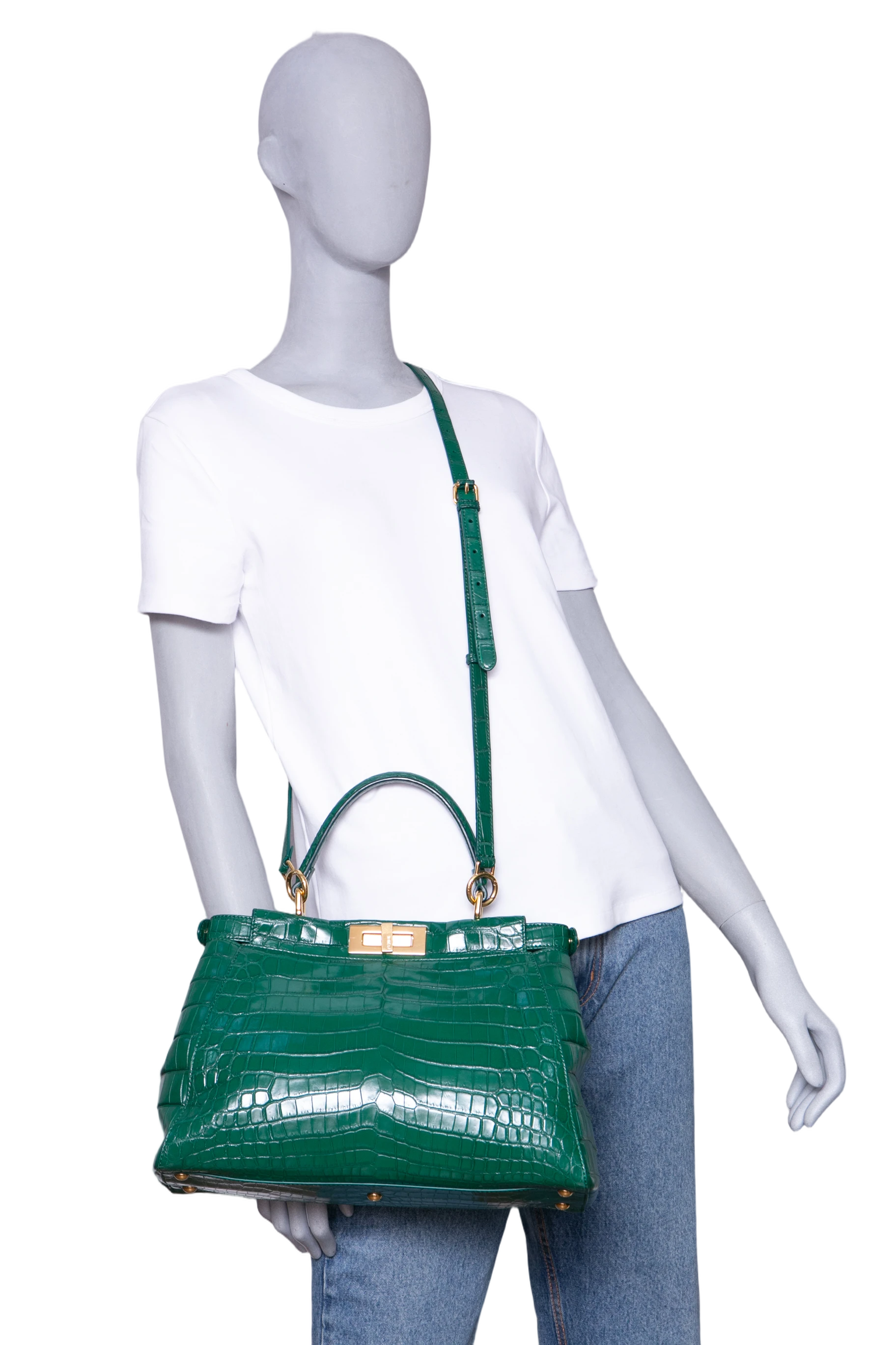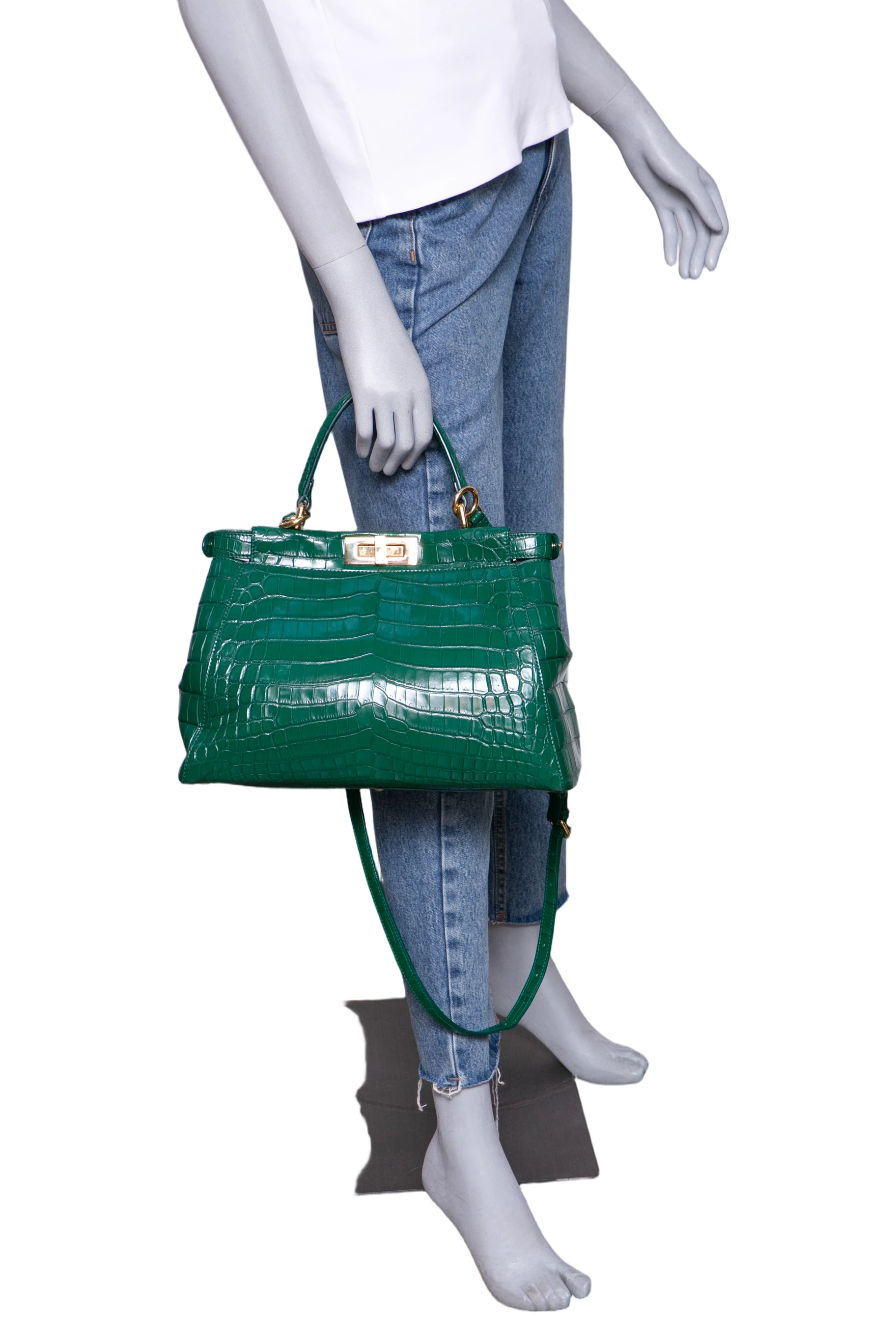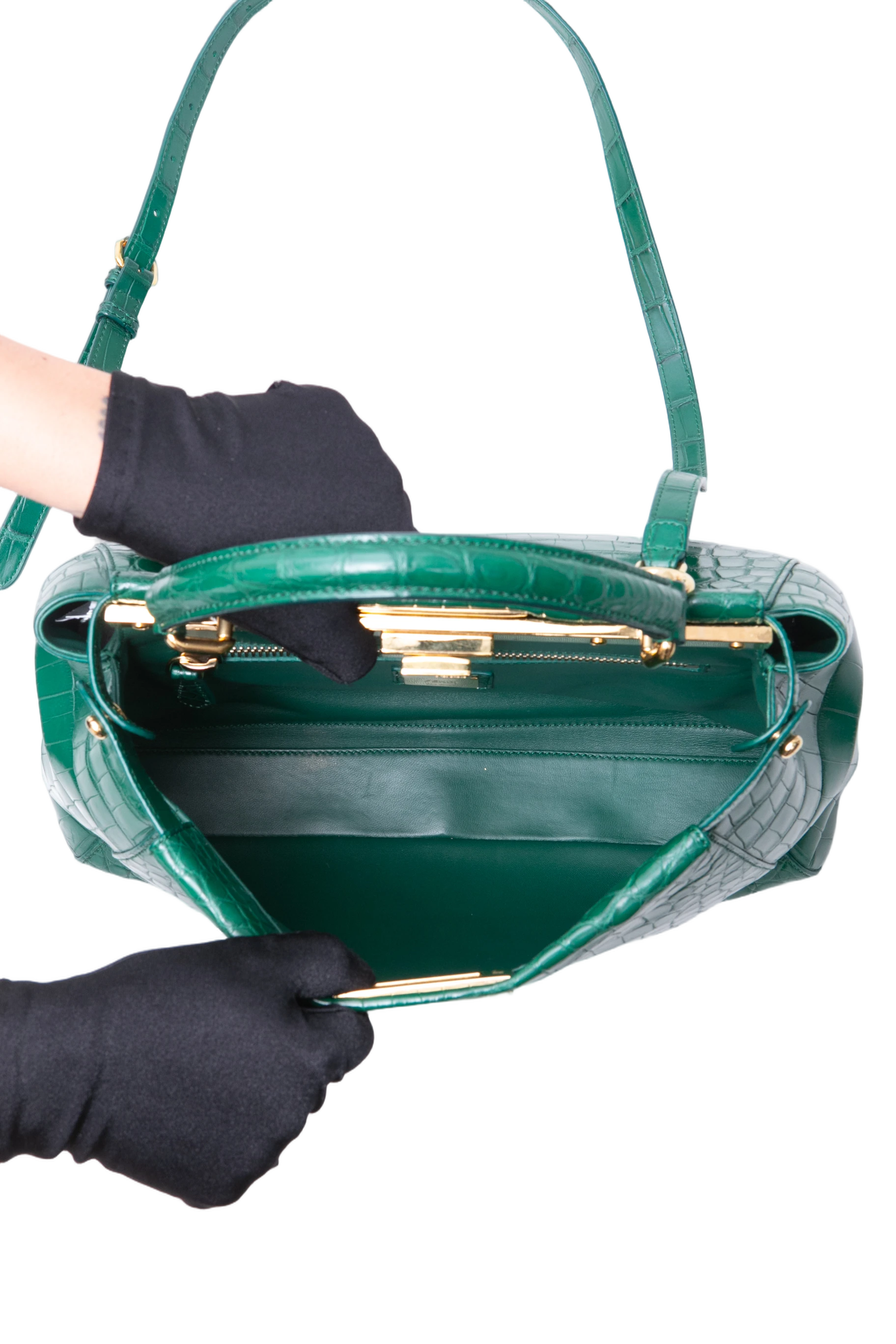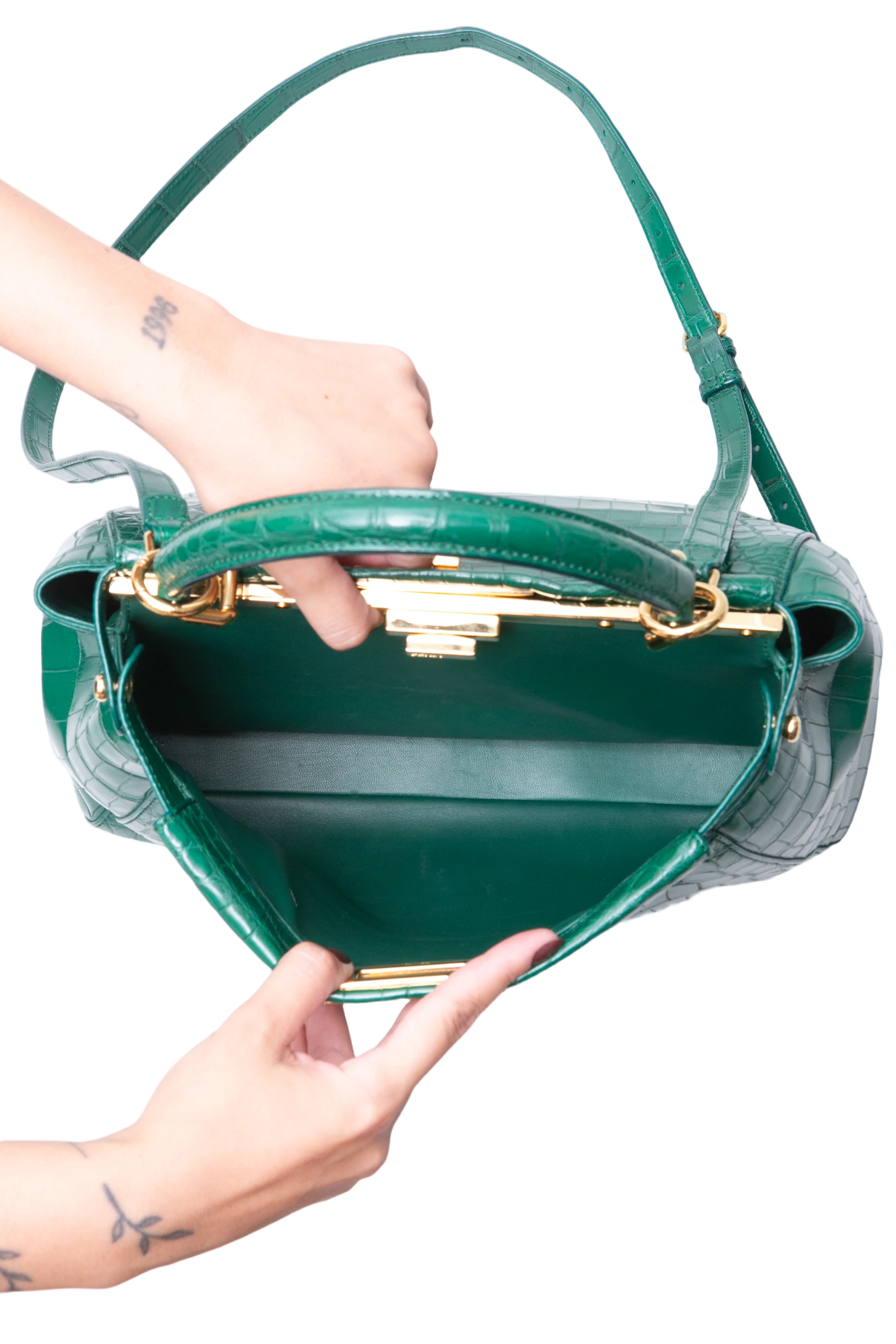 Fendi Peekaboo Medium Croco Embossed Green. Peça em perfeito estado, possui pequenos scratches nas ferragens. Acomoda todos os tamanhos de telefone.
