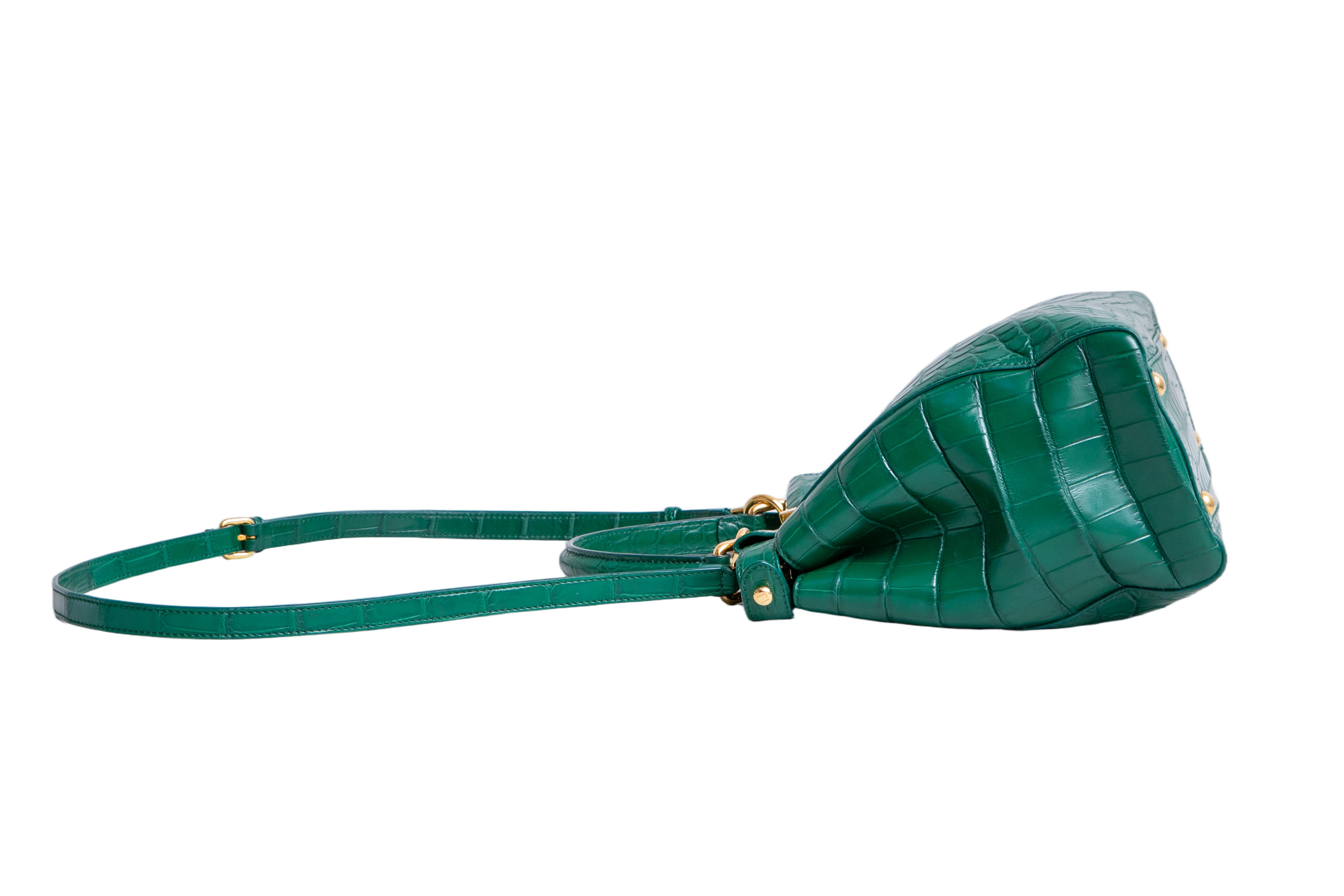 Bolsa confeccionada em couro croco na cor verde, com fechos giratórios e compartimentos separados. Possui alça de mão e alça longa ajustável e removível para uso shoulder, crossbody e handle bag ou antebraço.