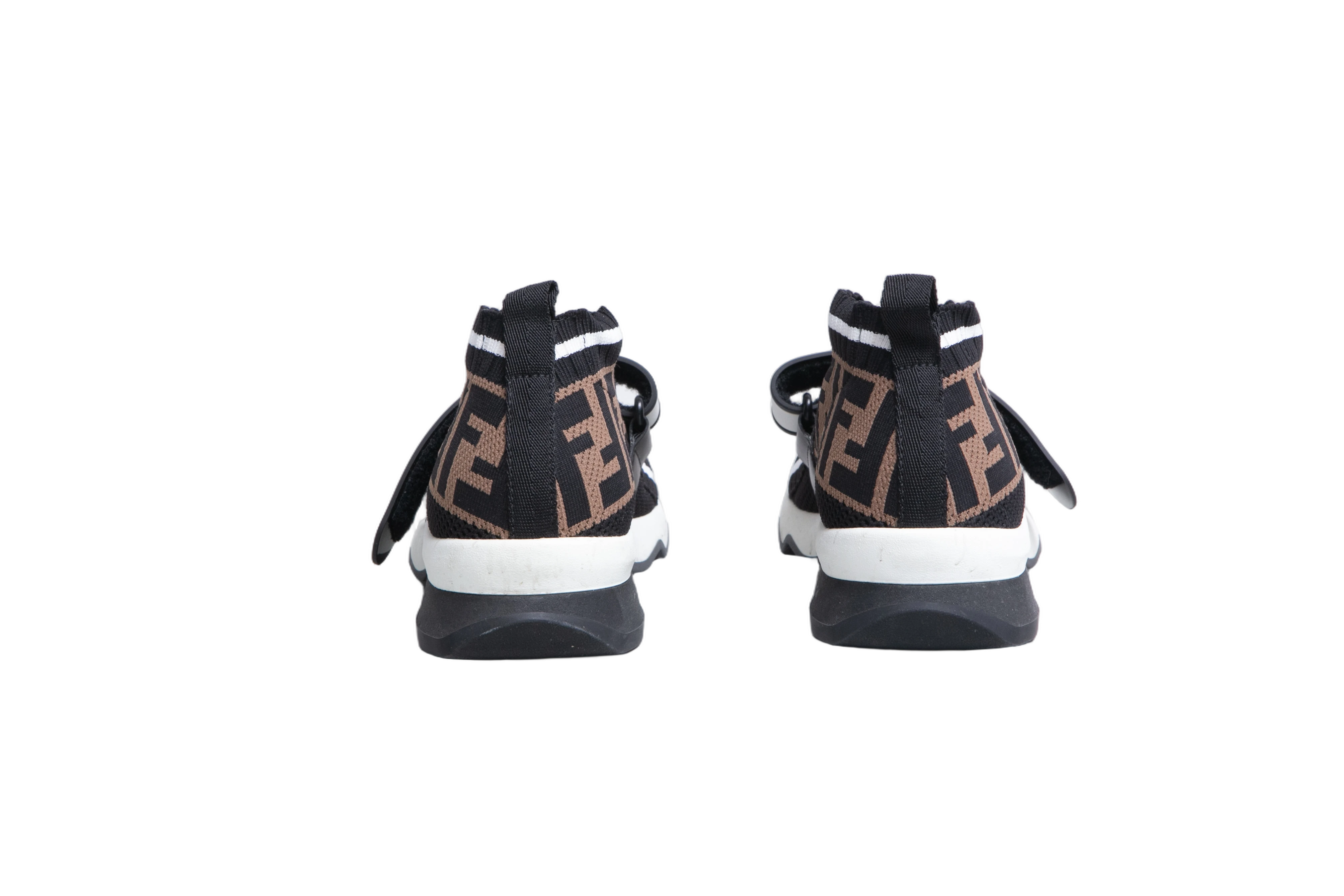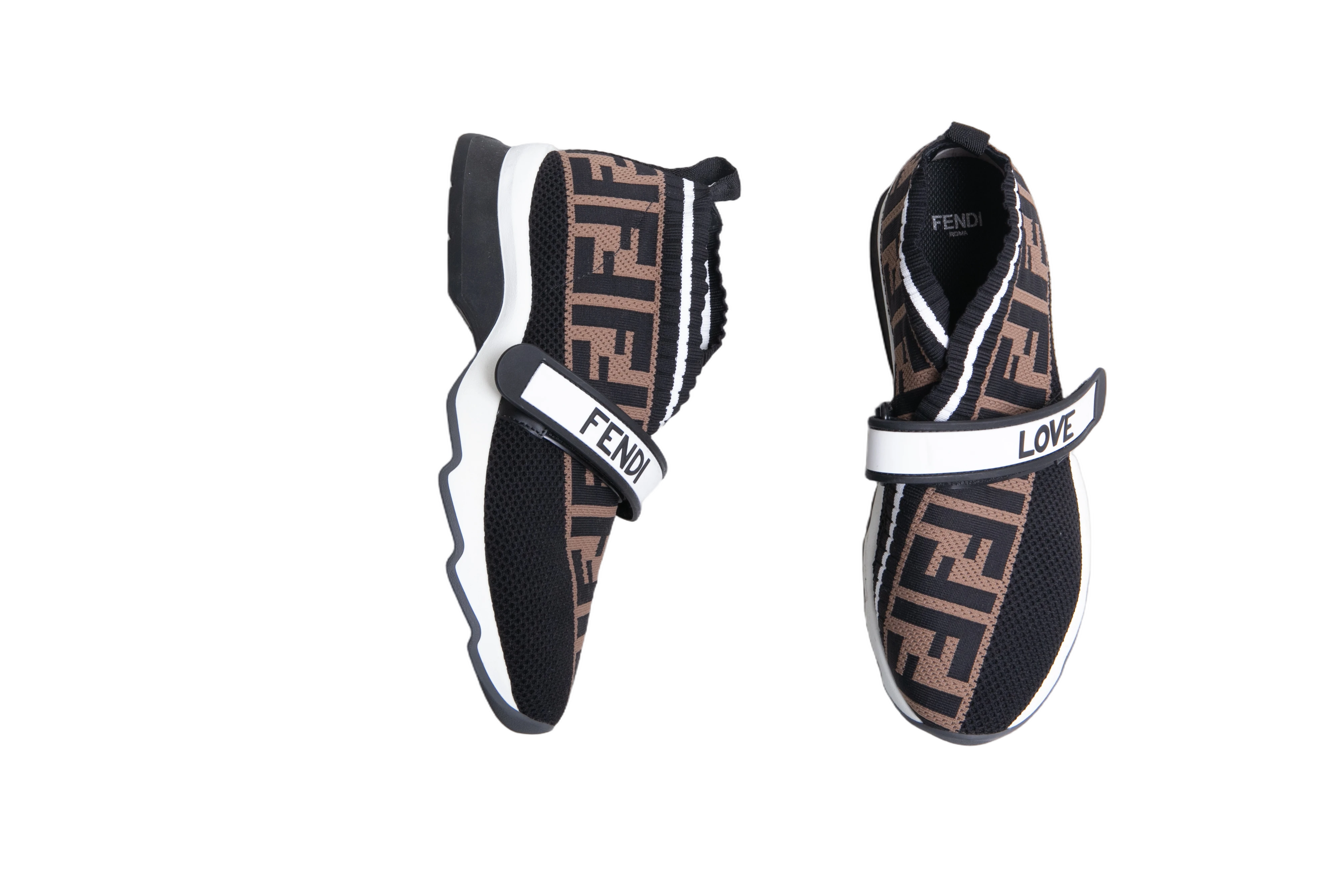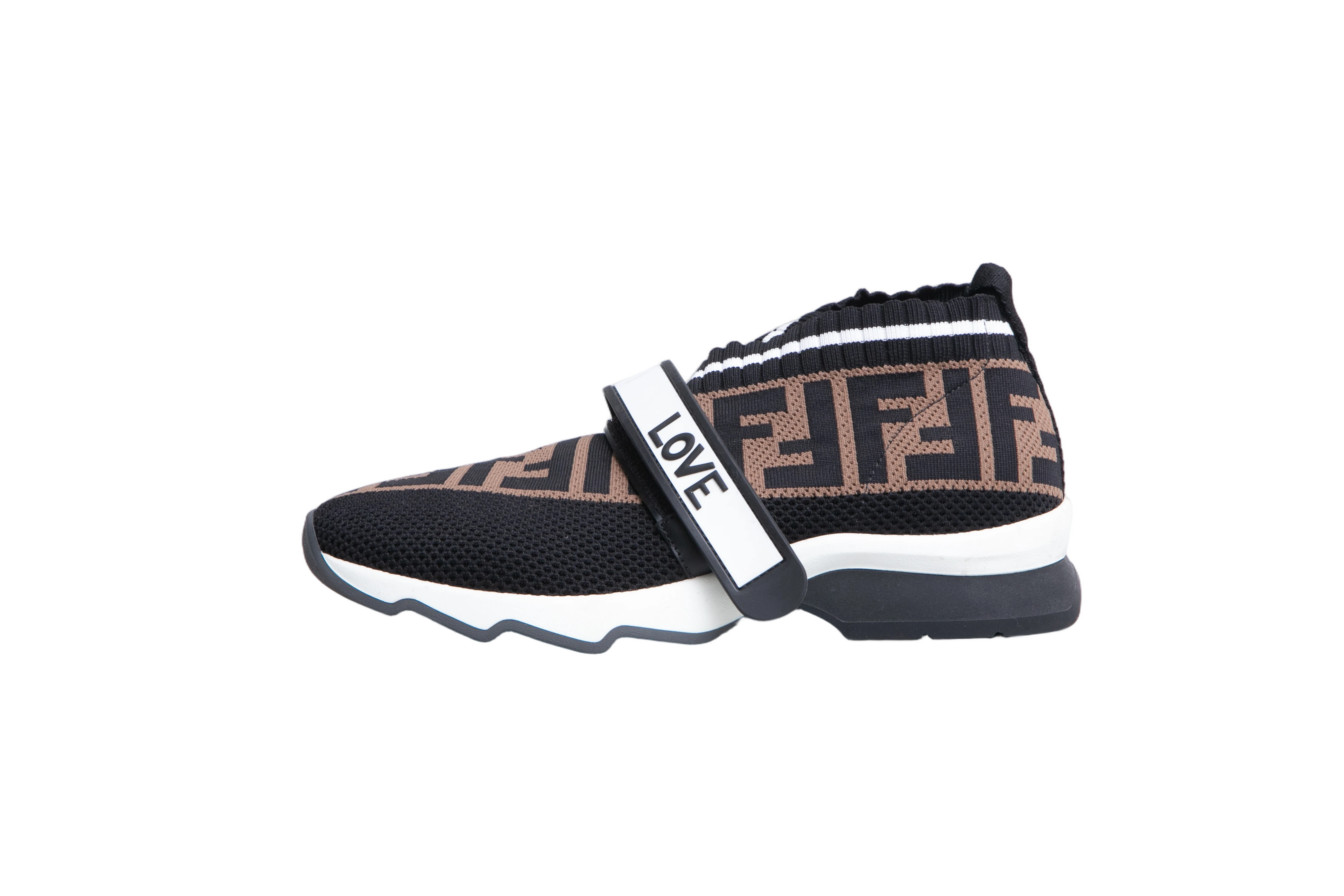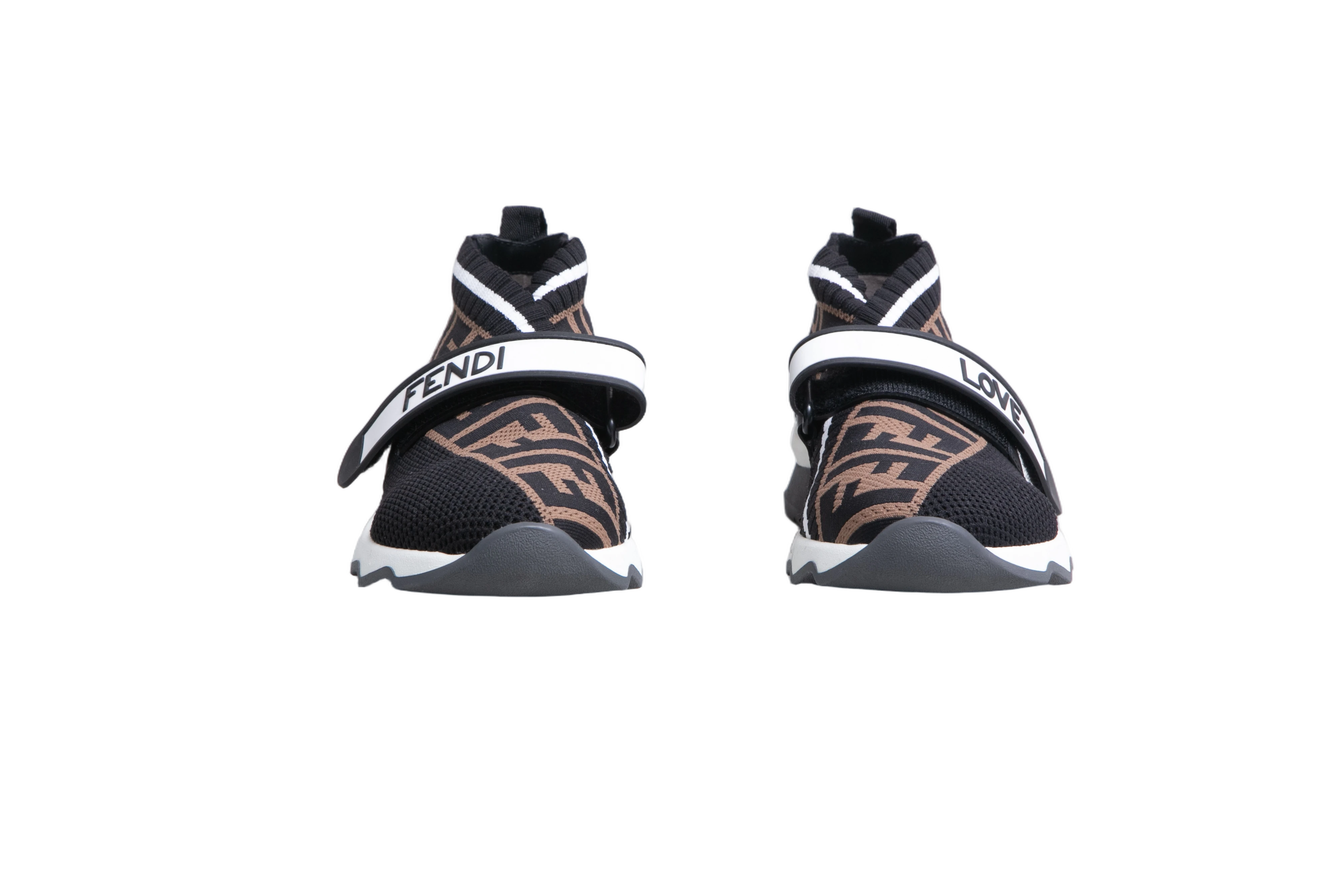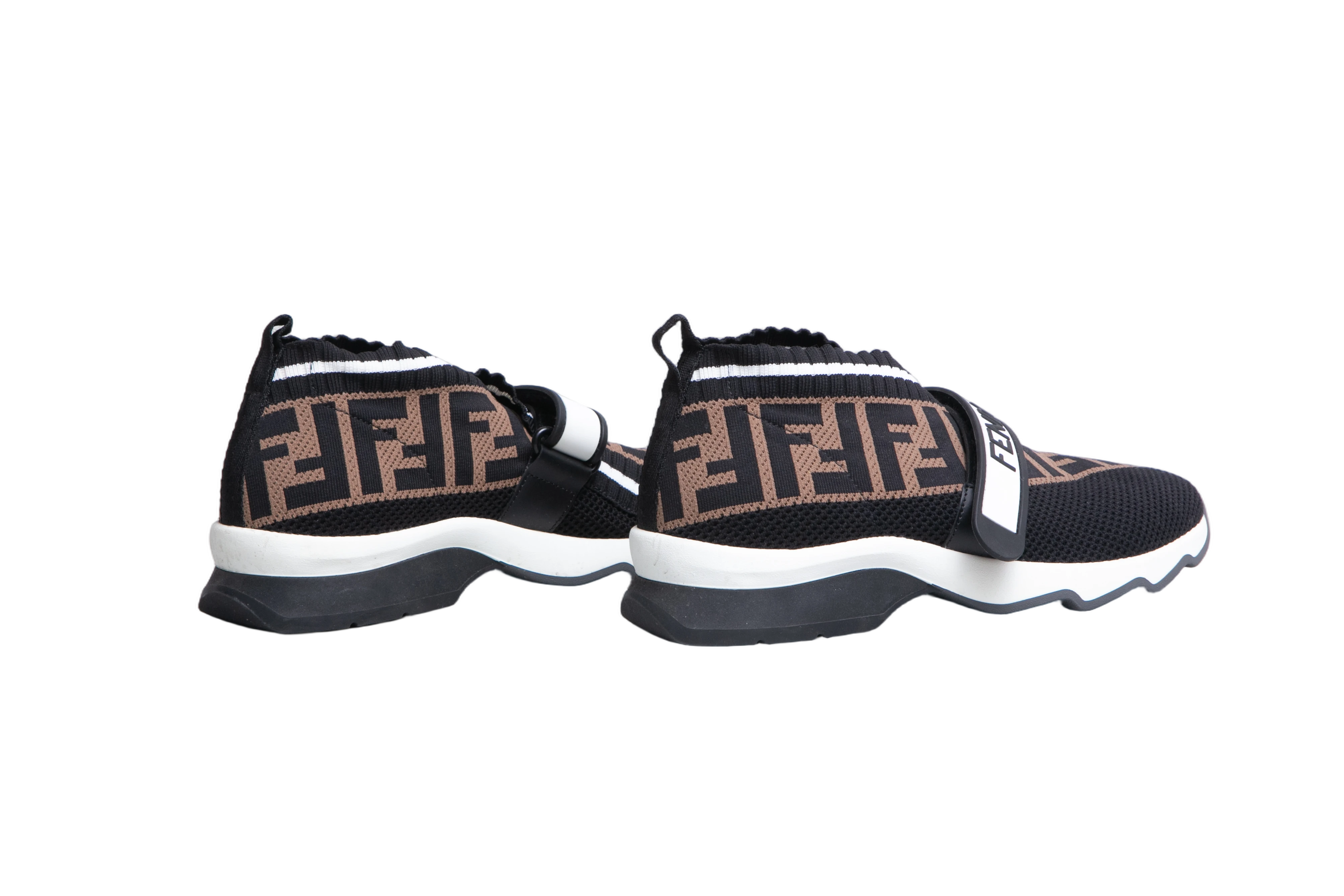 Tênis em tecido knit nas cores preto e marrom, com estampa do monograma FF por toda a peça. Modelo estilo slip-on com elástico no tornozelo para melhor ajuste e tira em velcro no peito do pé. Solado em borracha bicolor com design robusto.