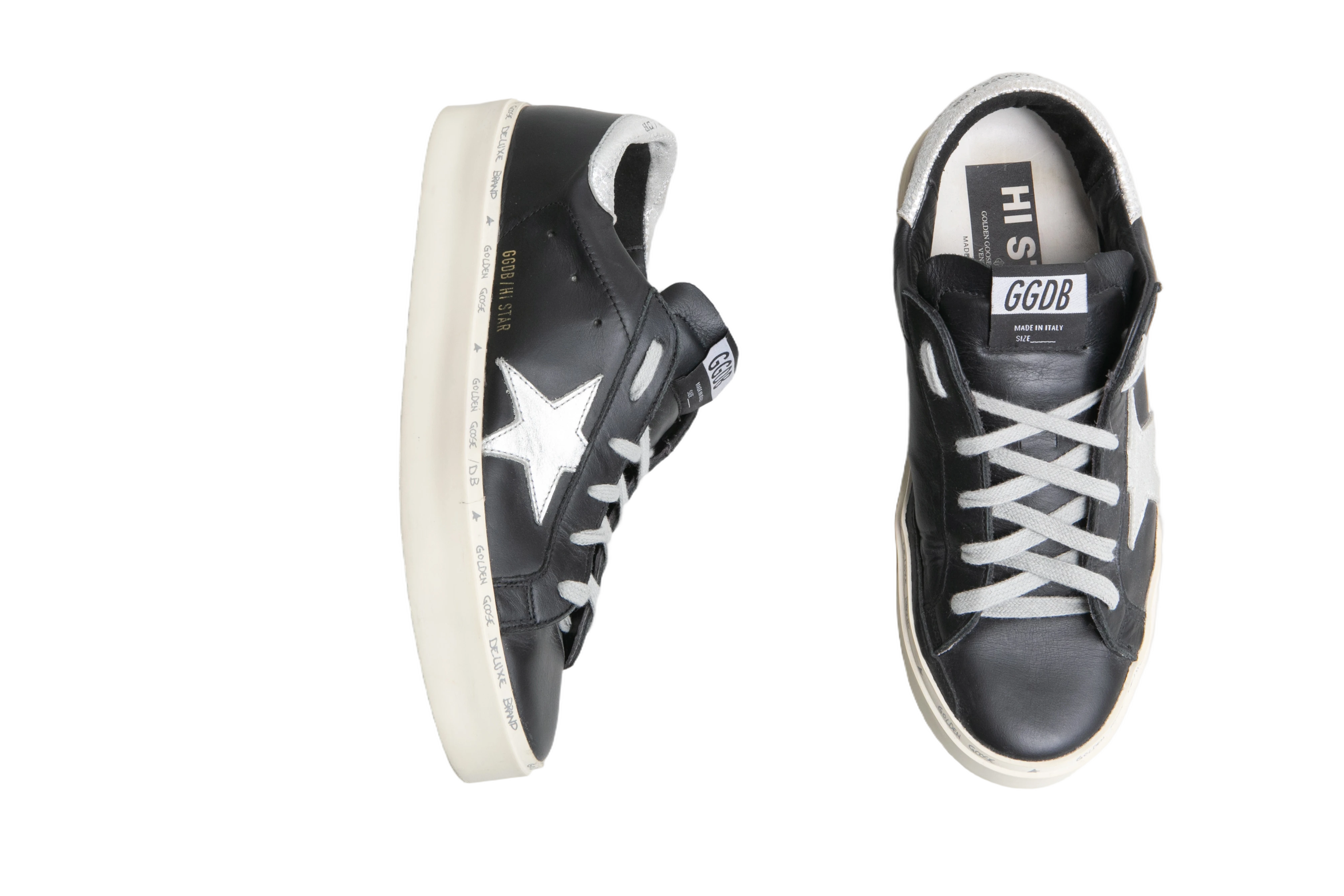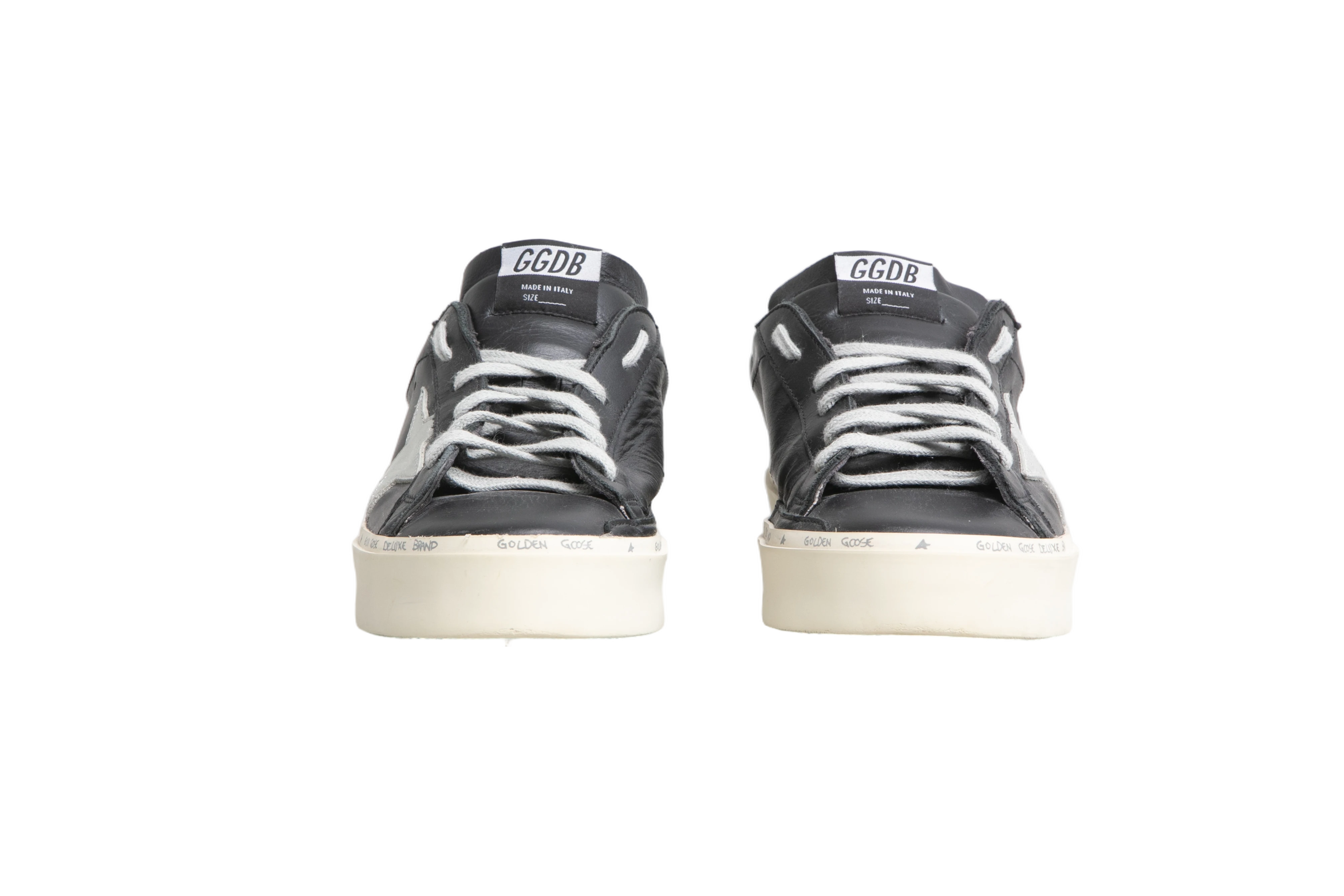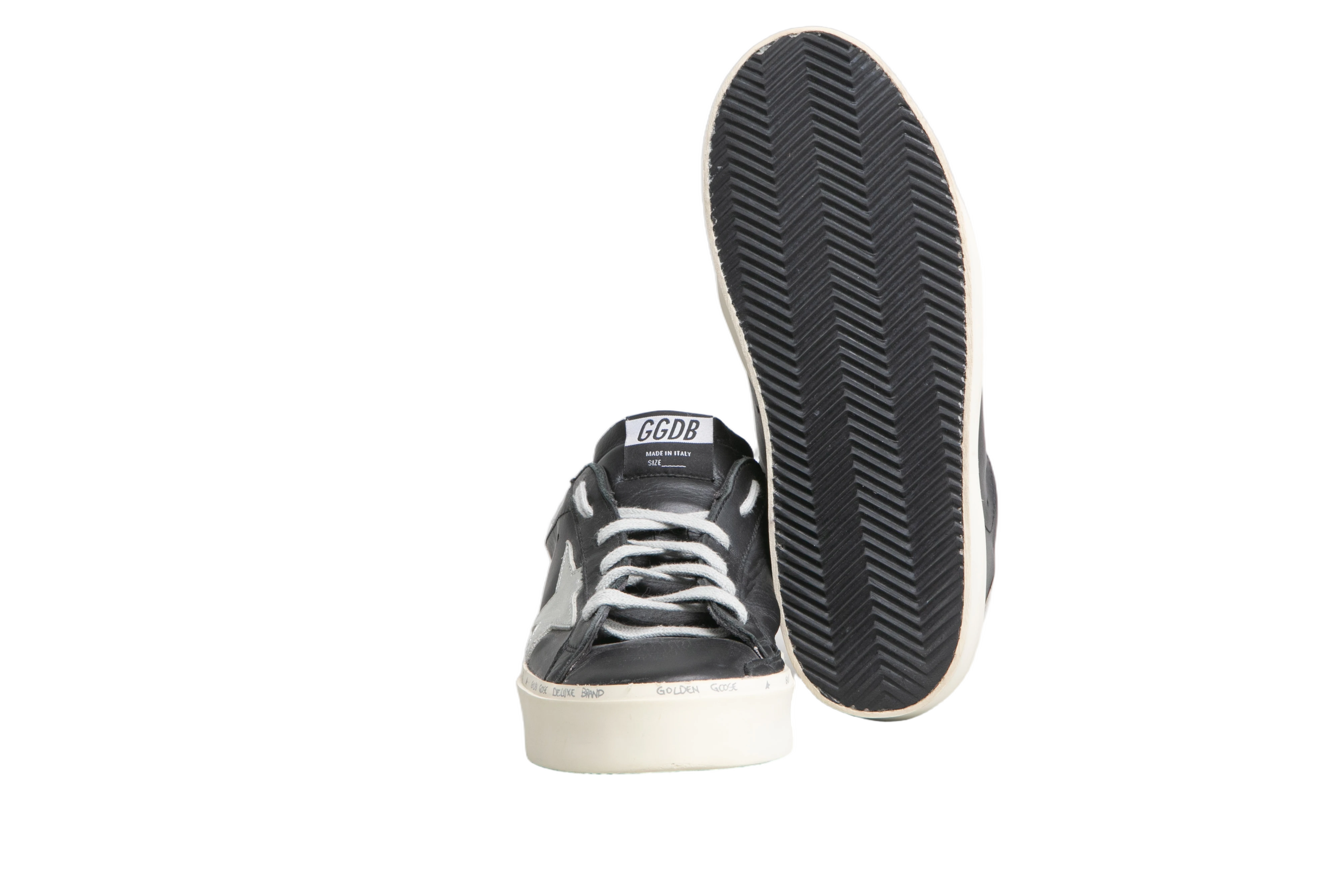 Tênis confeccionado em couro preto com estrela branca aplicada na lateral, detalhe característico da marca. Possui acabamento propositalmente desgastado, cadarços em tom cinza, solado em borracha off-white com inscrições “Golden Goose Deluxe Brand”.
