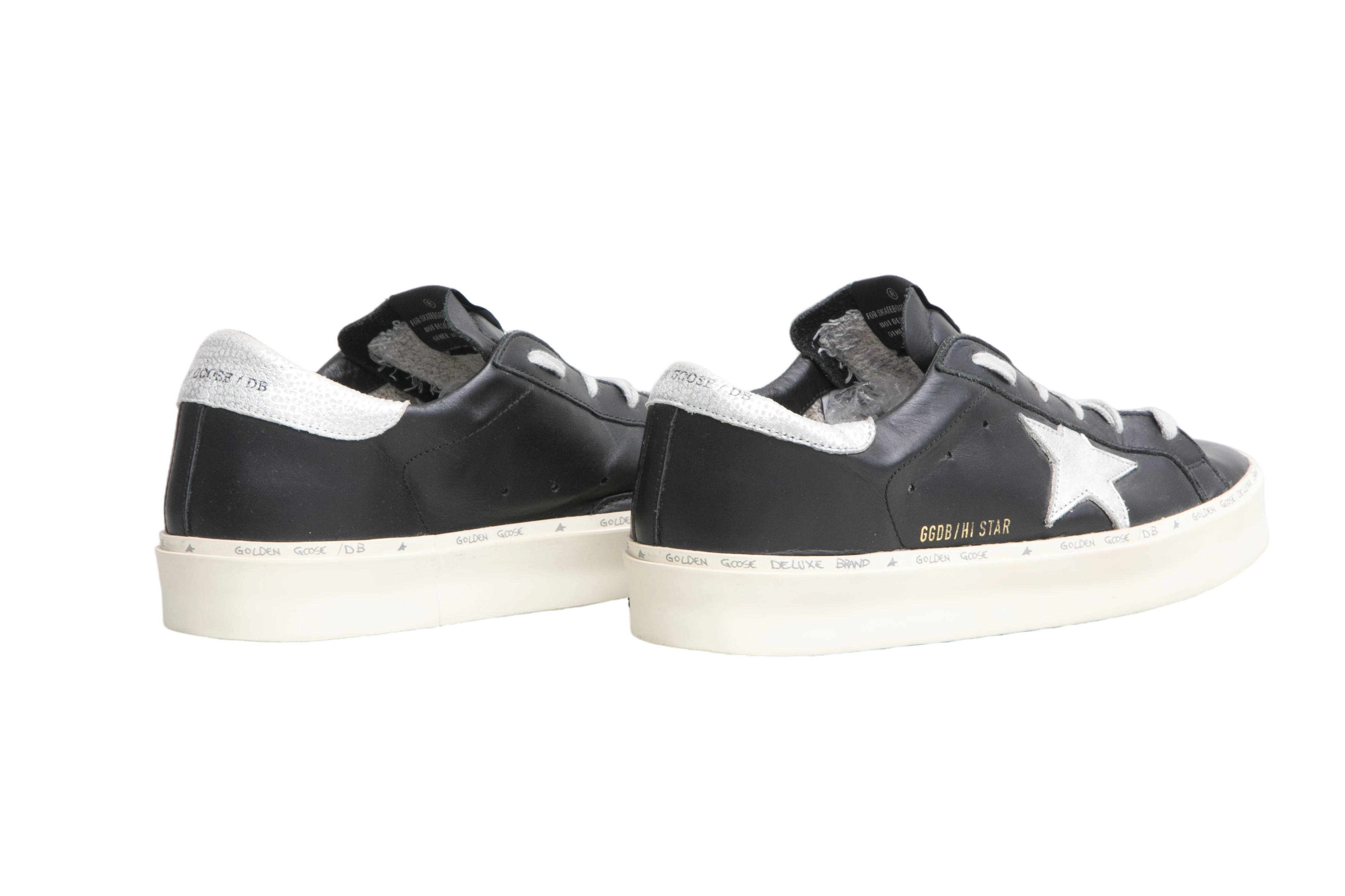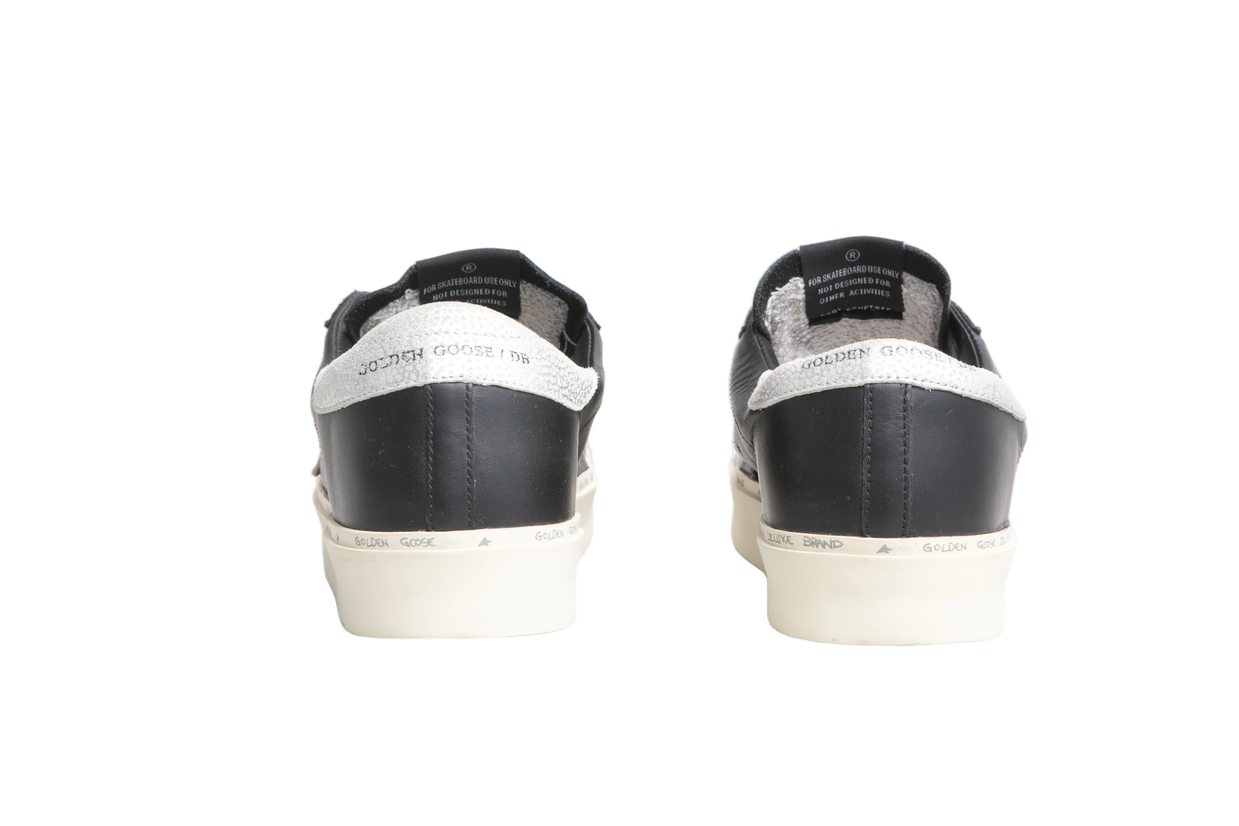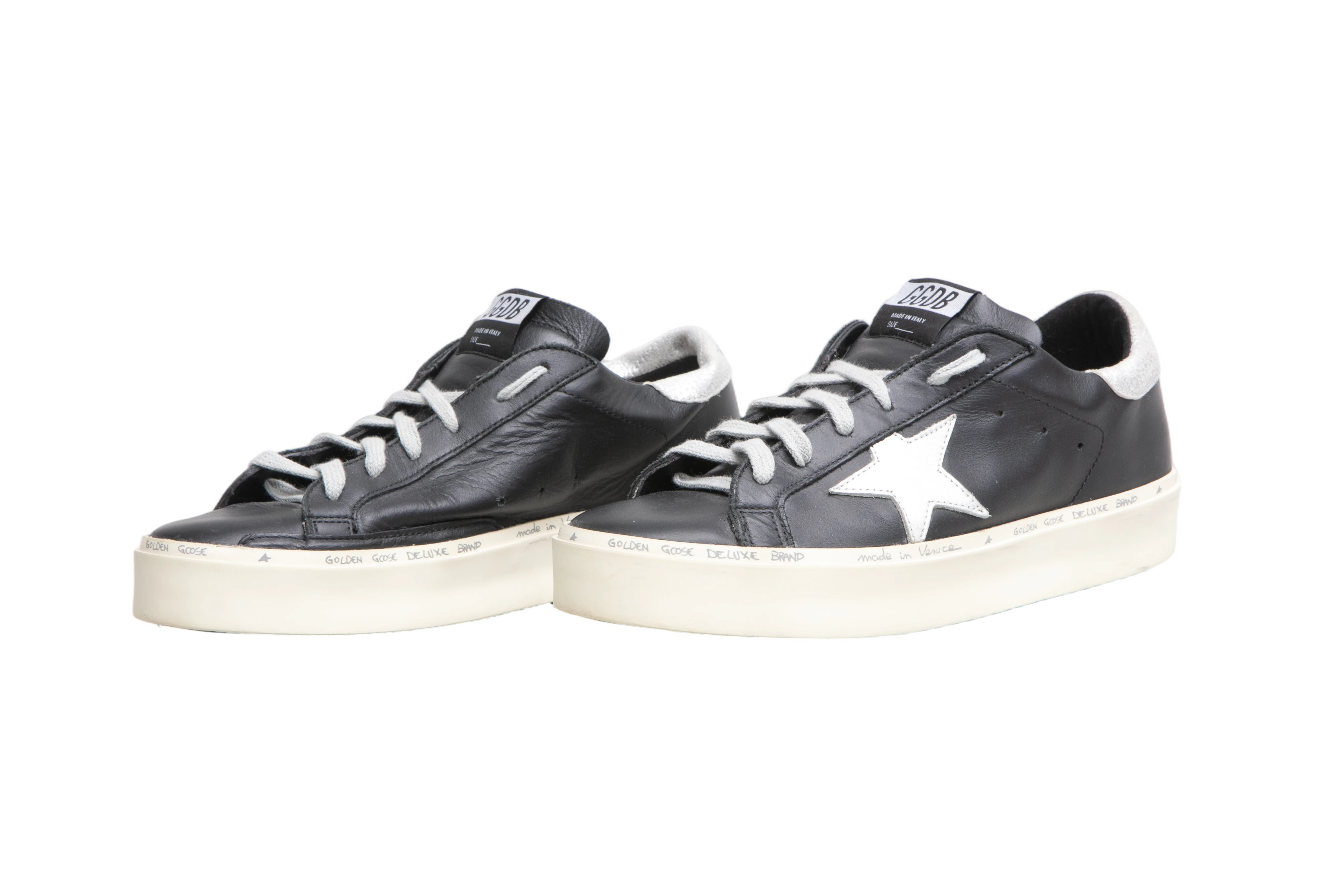 Tênis confeccionado em couro preto com estrela branca aplicada na lateral, detalhe característico da marca. Possui acabamento propositalmente desgastado, cadarços em tom cinza, solado em borracha off-white com inscrições “Golden Goose Deluxe Brand”.