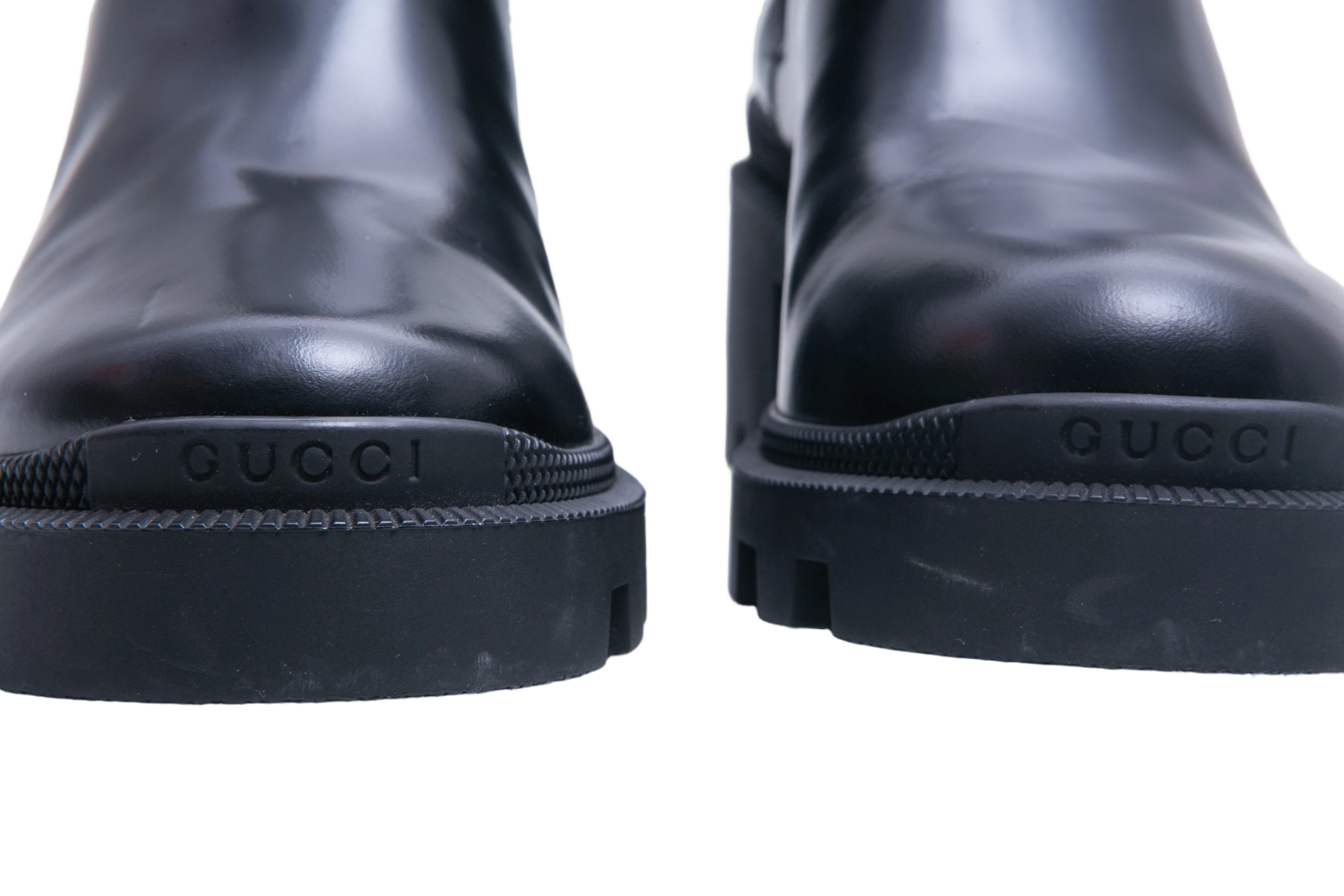 Bota de cano curto confeccionada em couro preto, com design robusto. Possui elásticos laterais, solado tratorado em borracha e tira no tornozelo adornada pelo logo GG em metal dourado e aplicações de pedrarias.