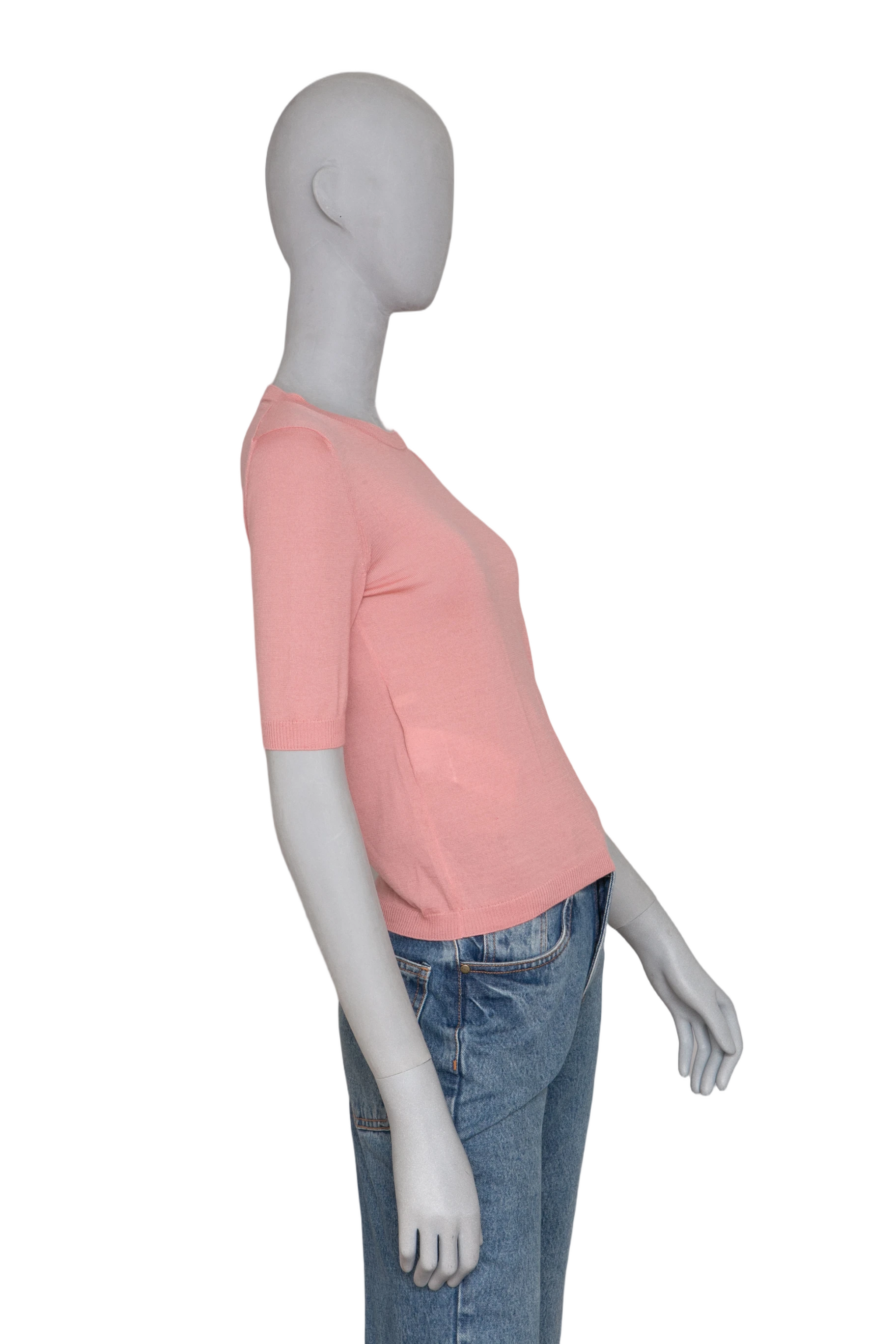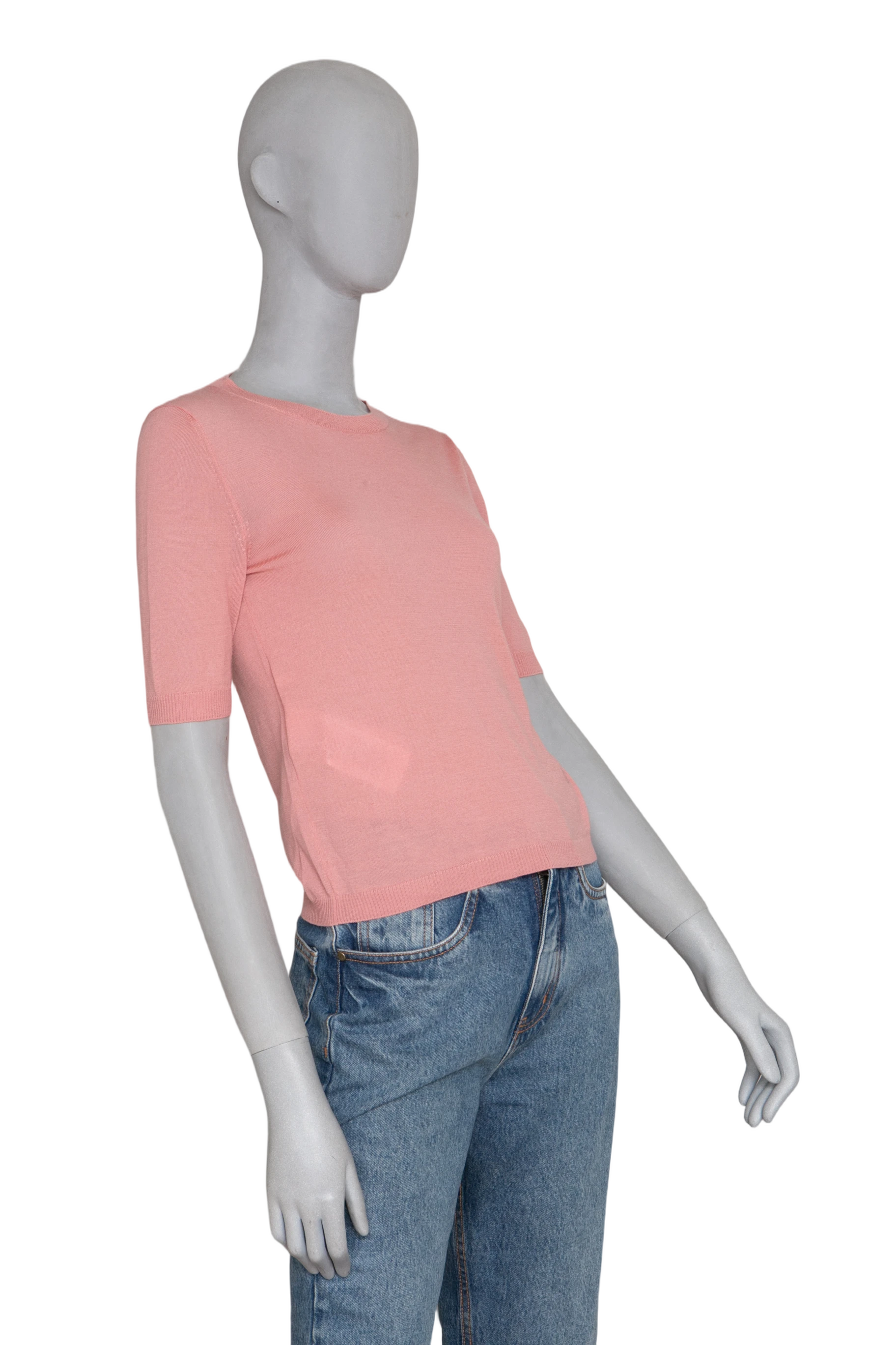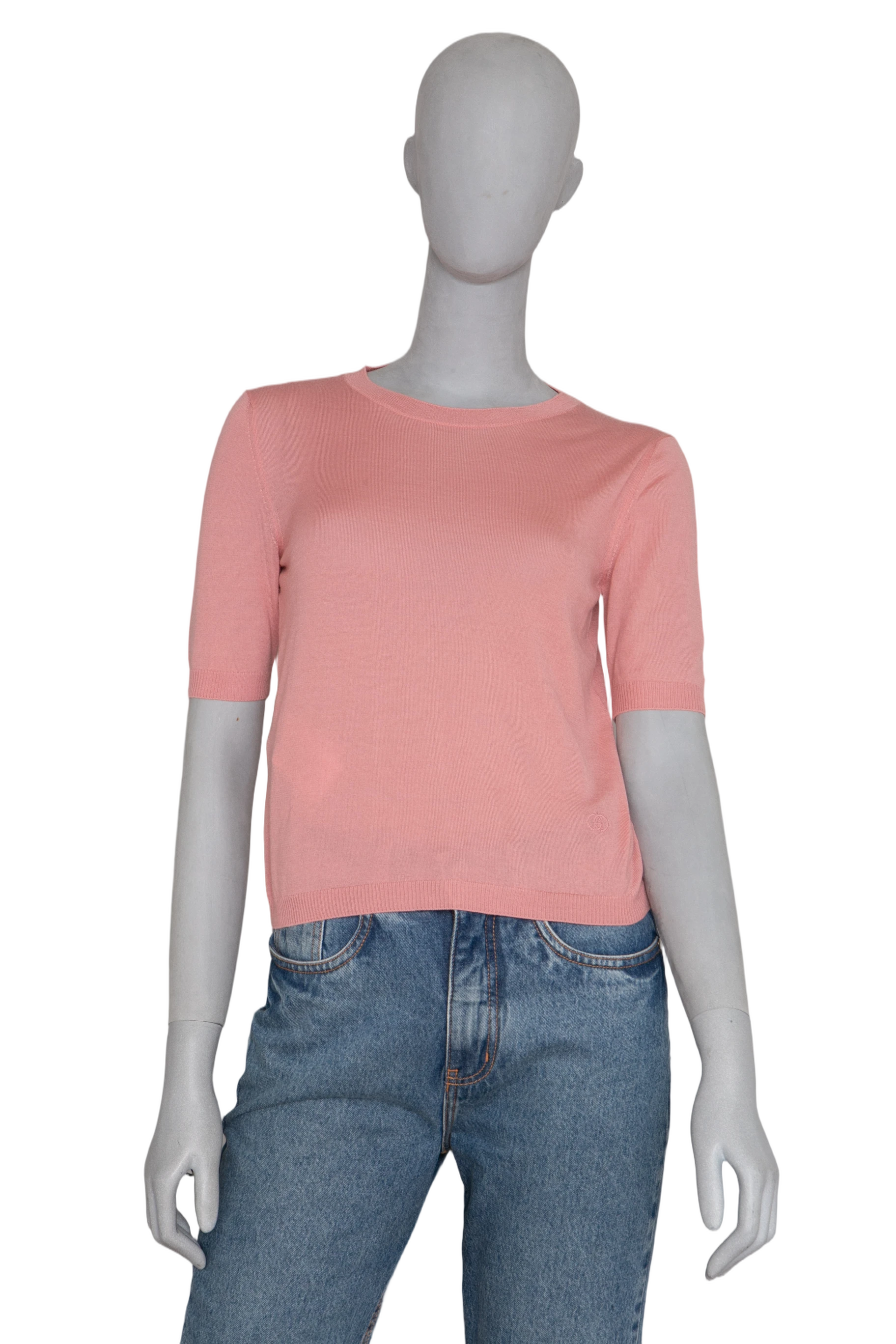 Blusa confeccionada em tom rosa suave, com modelagem reta e mangas curtas. A peça possui gola redonda e acabamento canelado na barra, punhos e decote, garantindo um caimento delicado e sofisticado.