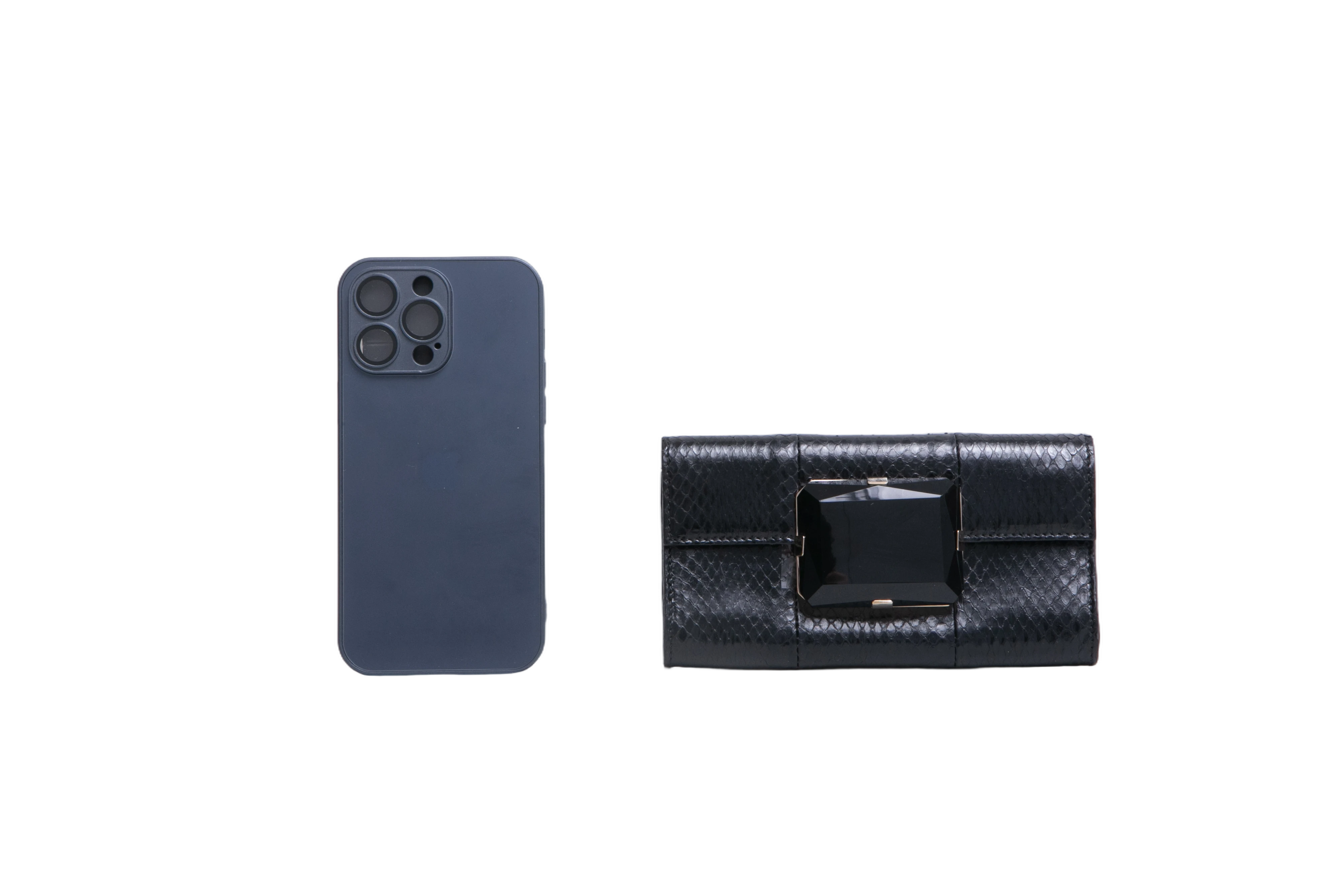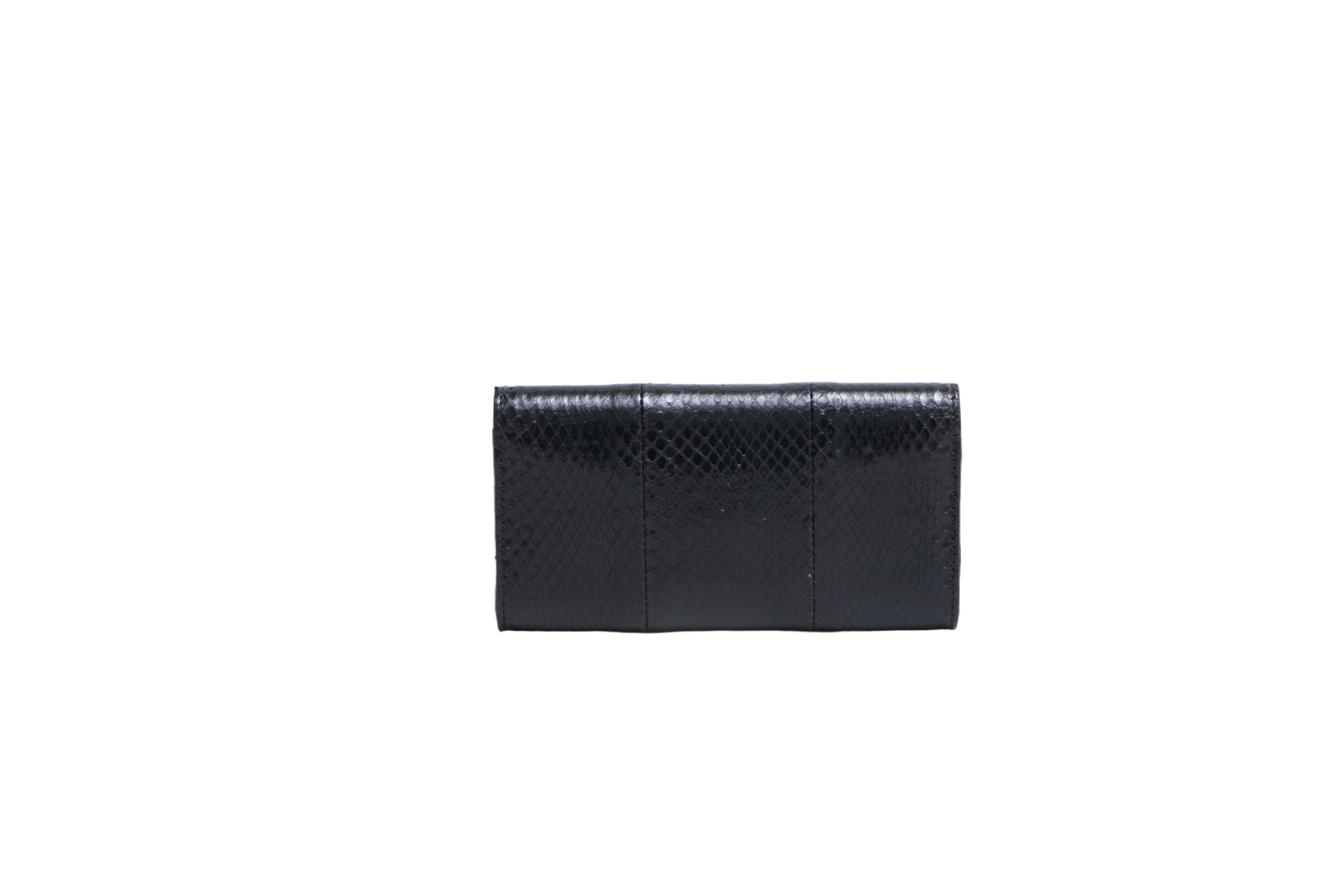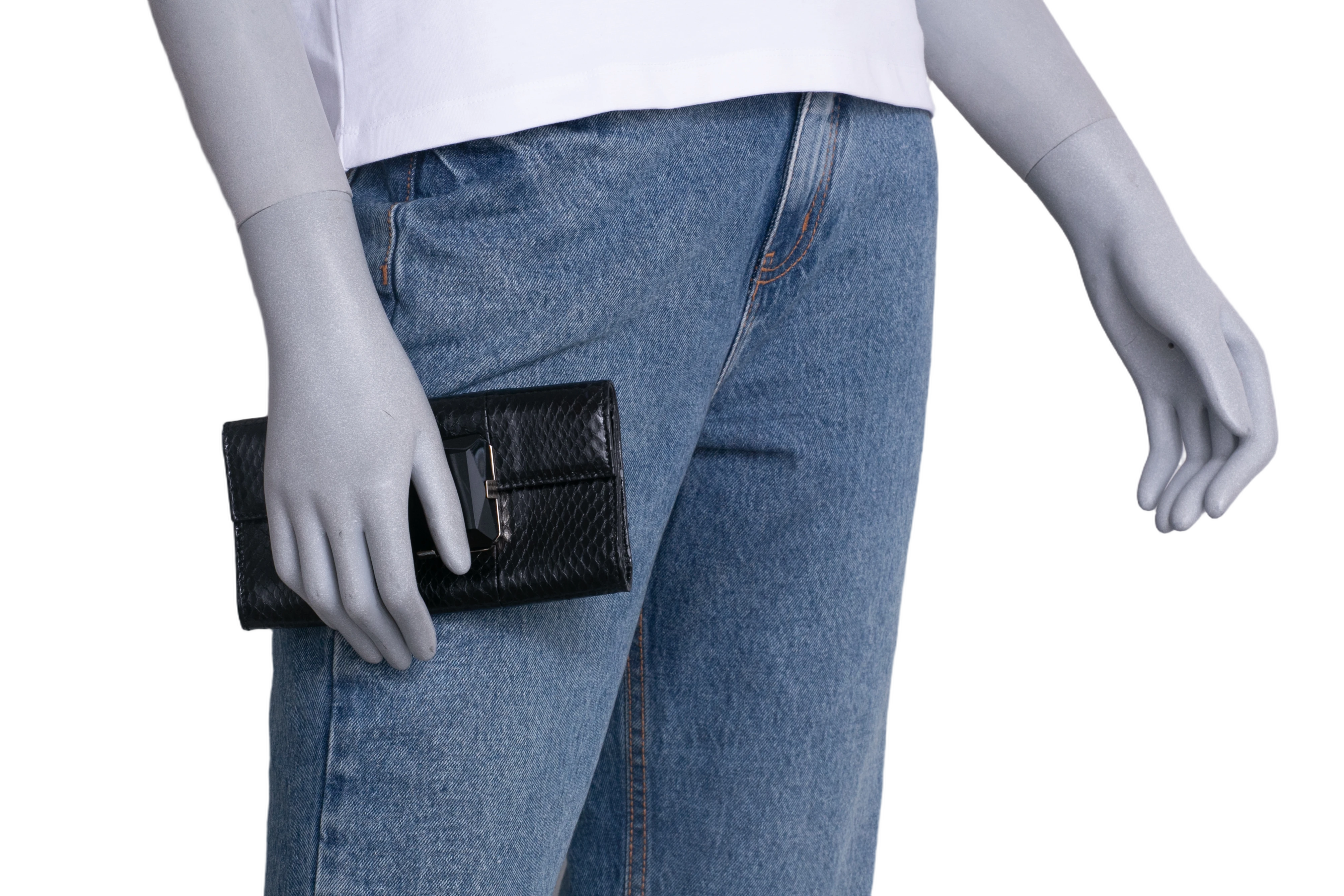 Bolsa modelo clutch em couro python preto, fecho em aba e botão de pressão, apresenta design retangular estruturado e detalhe frontal em pedra oversized