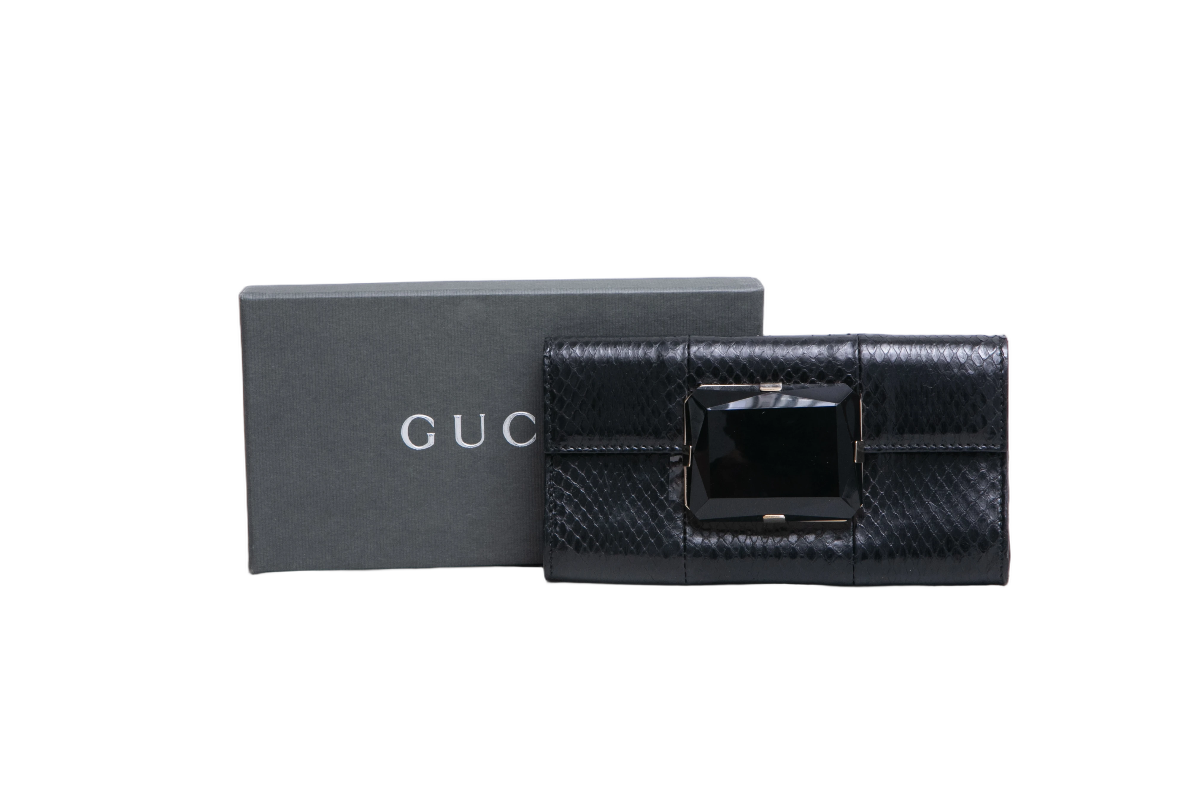 Gucci Clutch Python With Large Faceted Stone Black. Peça em perfeito estado, possui pequenos sinais no couro.
