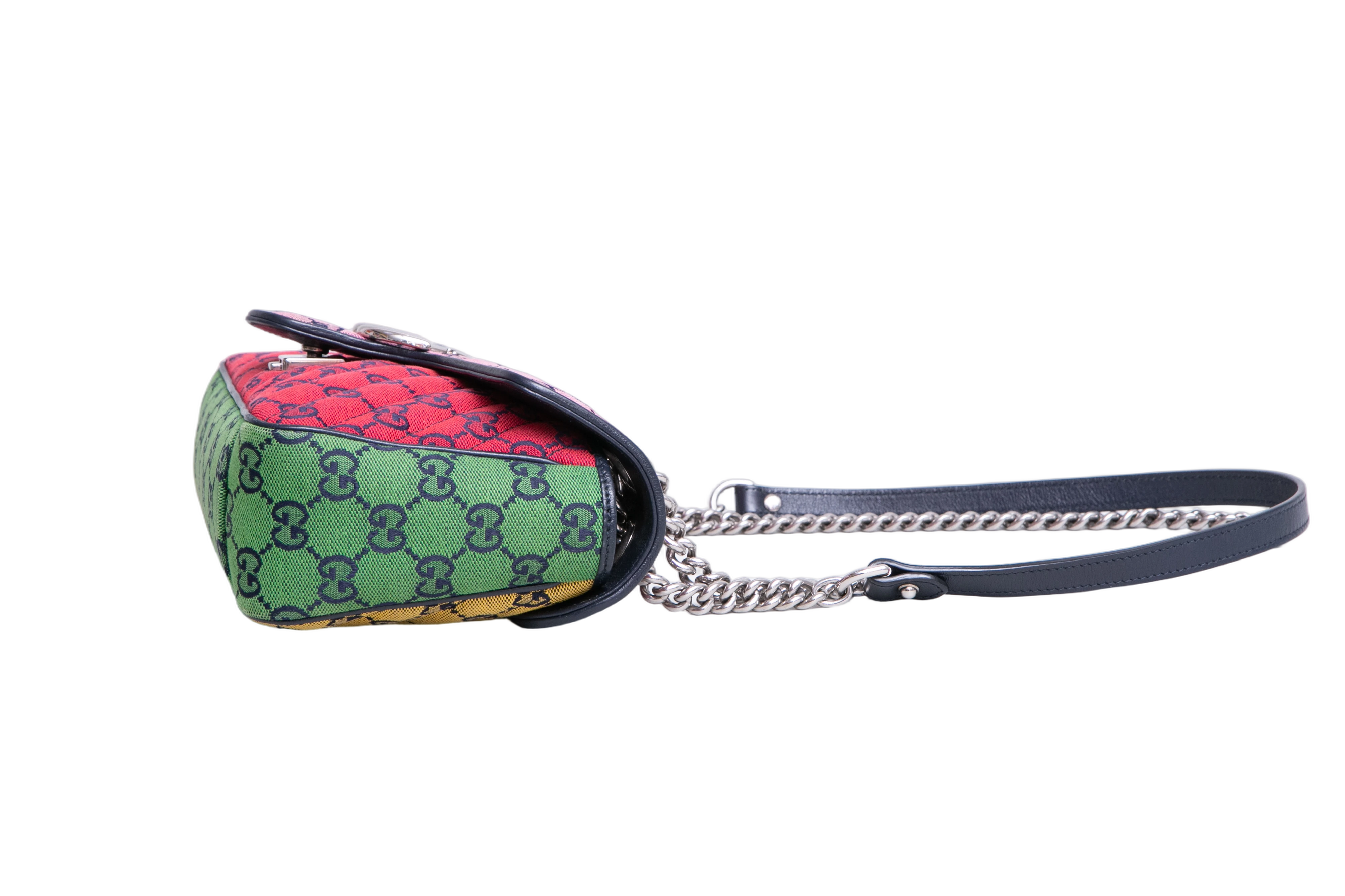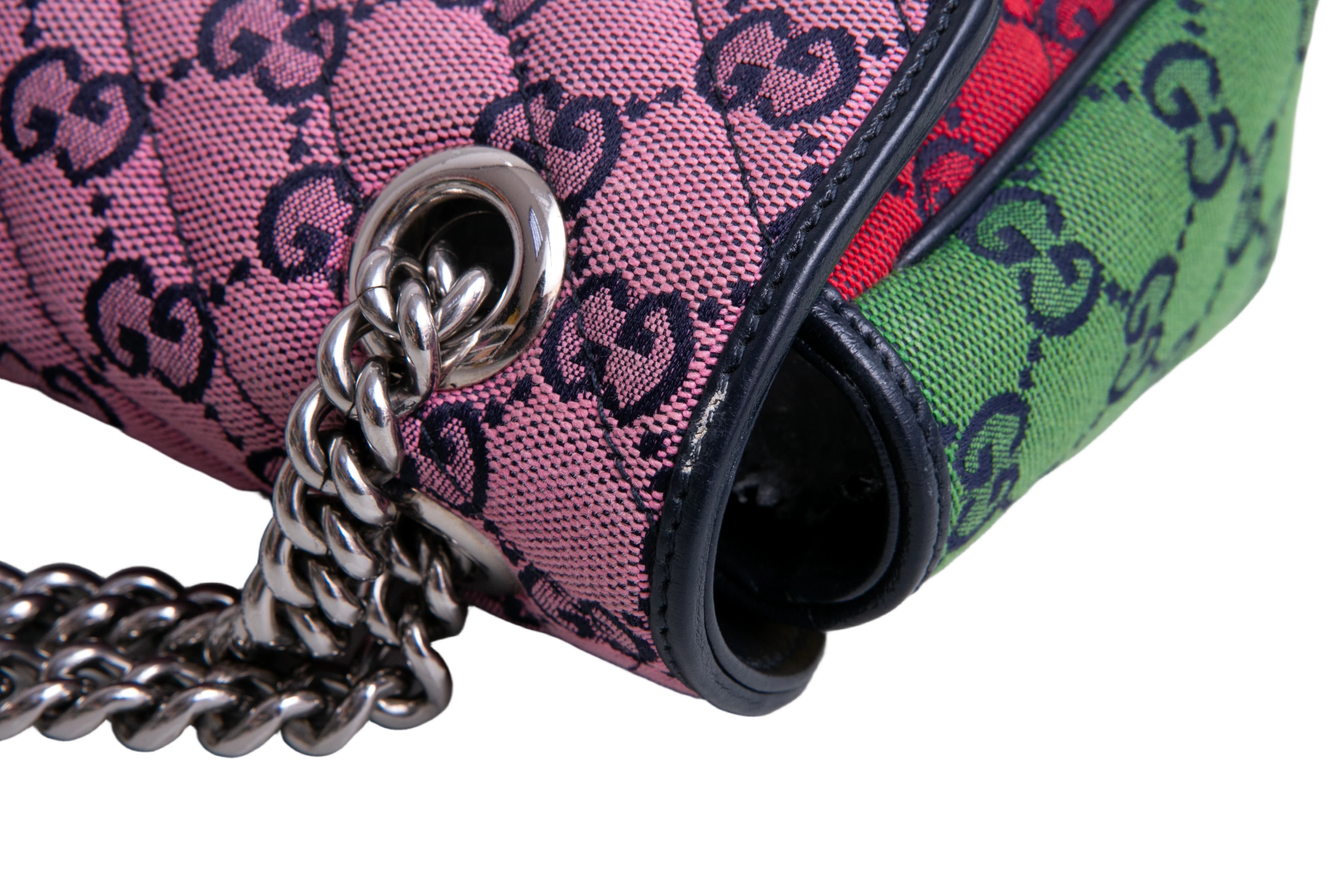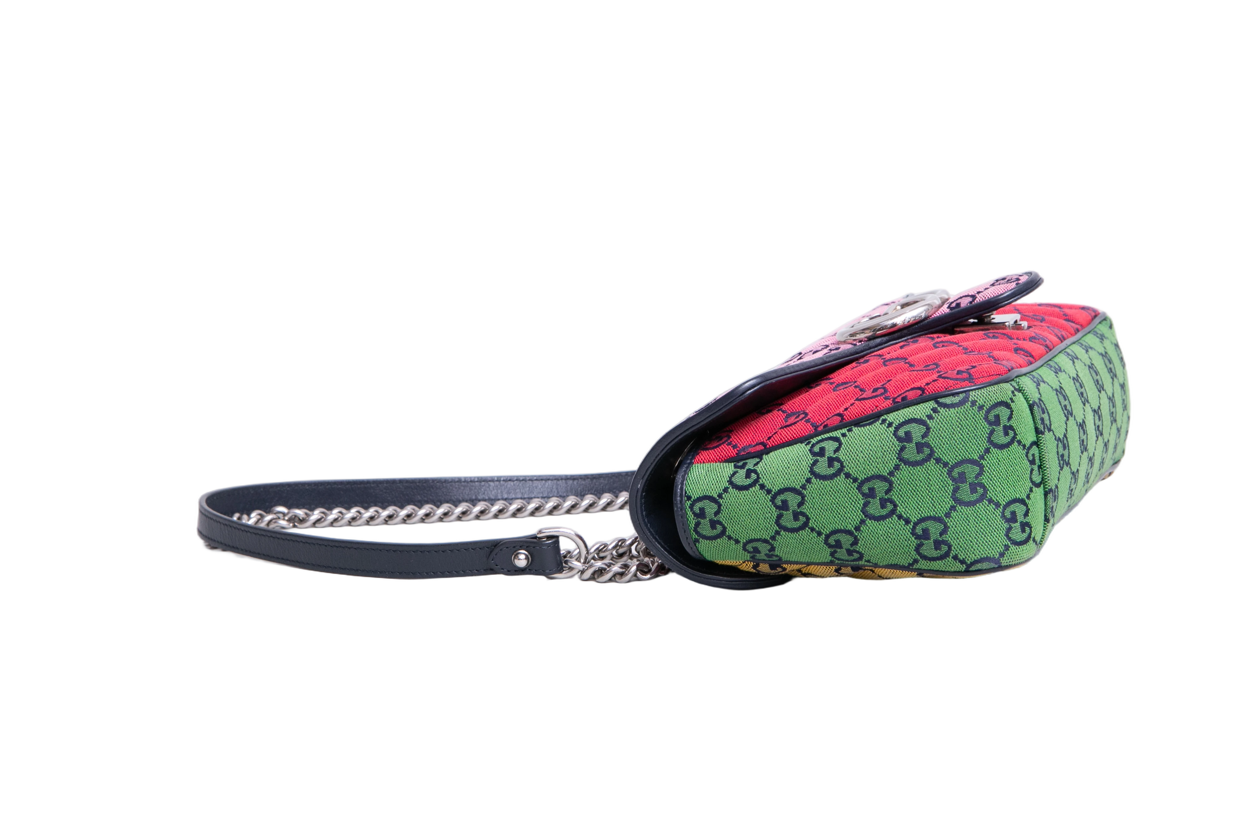 Bolsa confeccionada em tecido nas cores verde, rosa, vermelho e amarelo com estampa GG supreme em navy. Possui fechamento por aba com botão de pressão e alça em corrente, para uso shoulder e e crossbody.