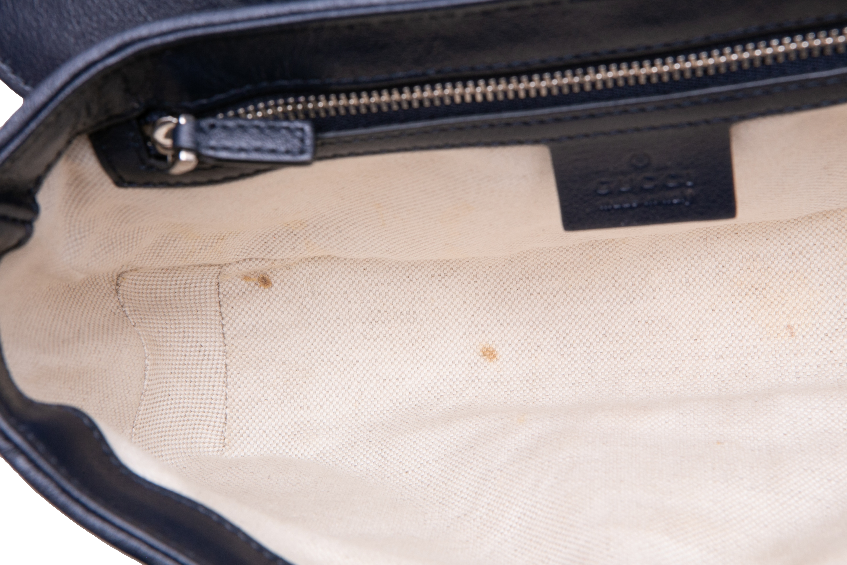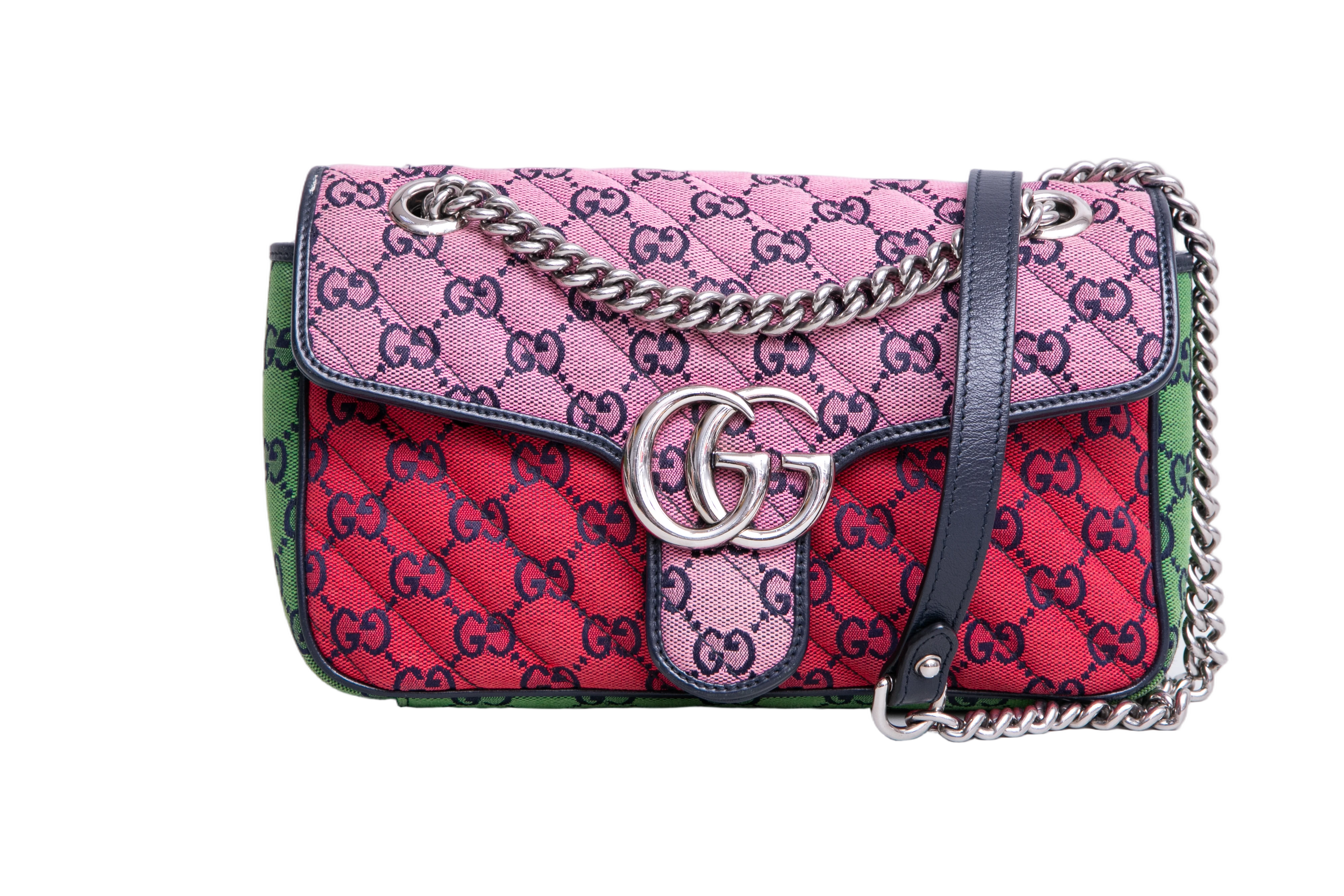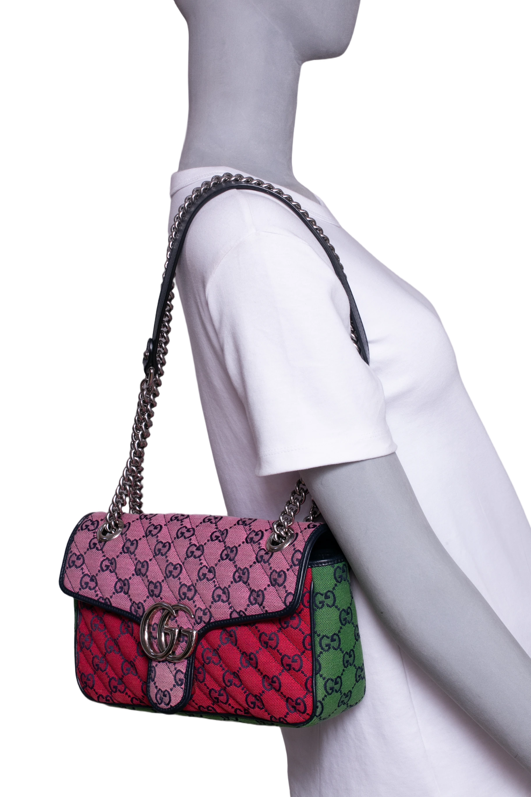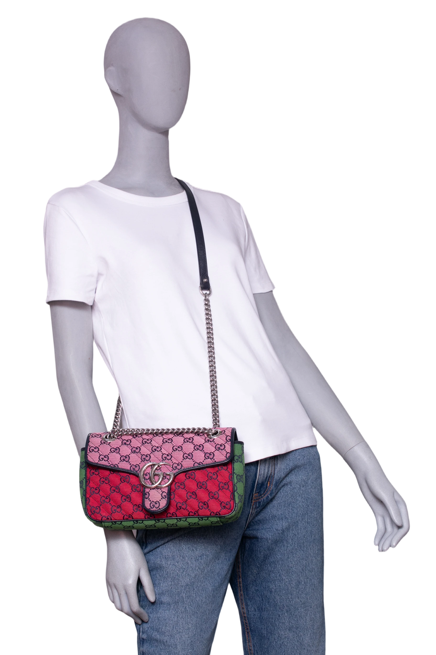 Bolsa confeccionada em tecido nas cores verde, rosa, vermelho e amarelo com estampa GG supreme em navy. Possui fechamento por aba com botão de pressão e alça em corrente, para uso shoulder e e crossbody.