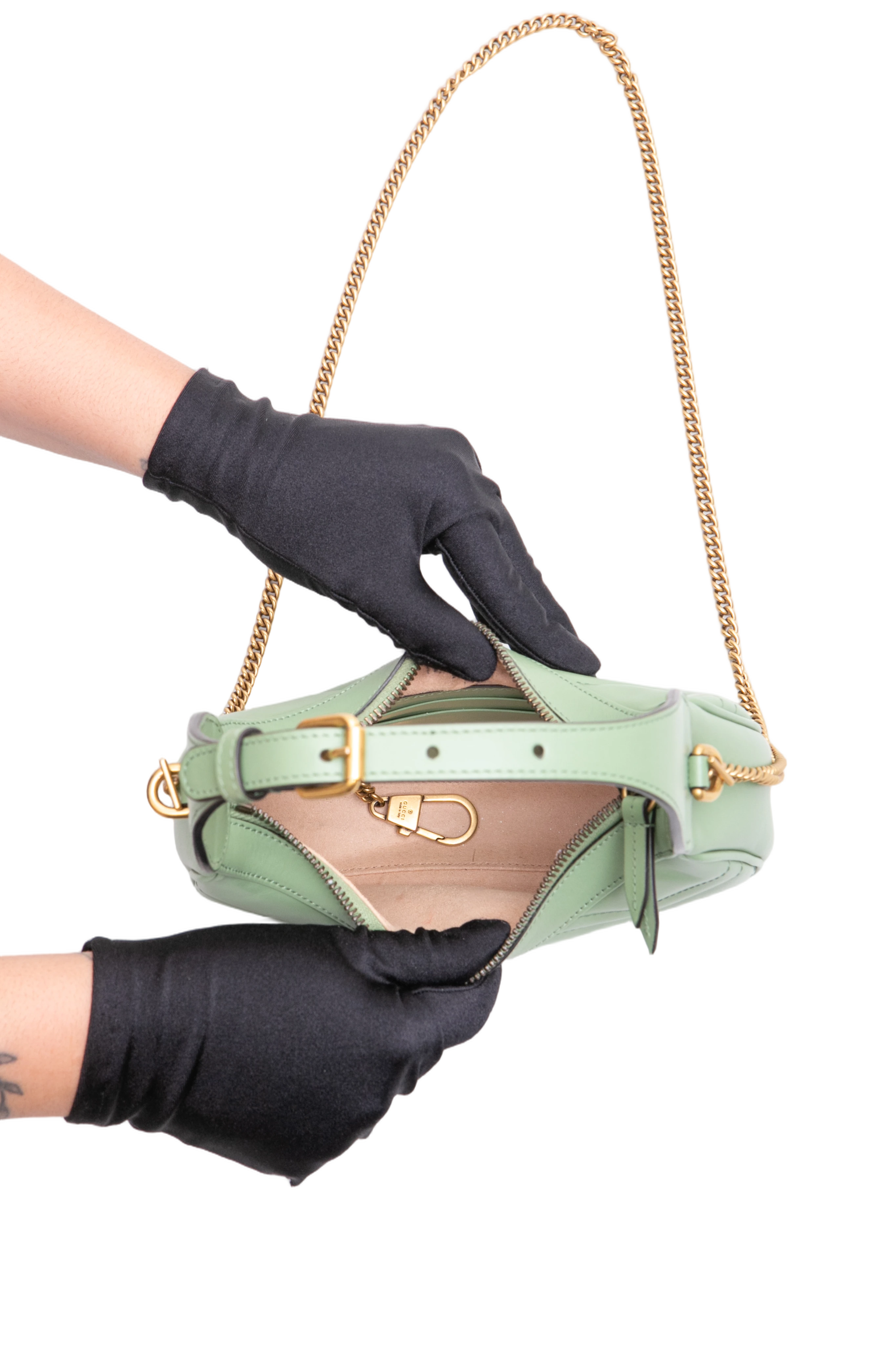 Bolsa em couro verde com fecho em zíper e logo GG na parte frontal. Com alça de mão e alça longa em corrente, para uso shoulder e handle bag