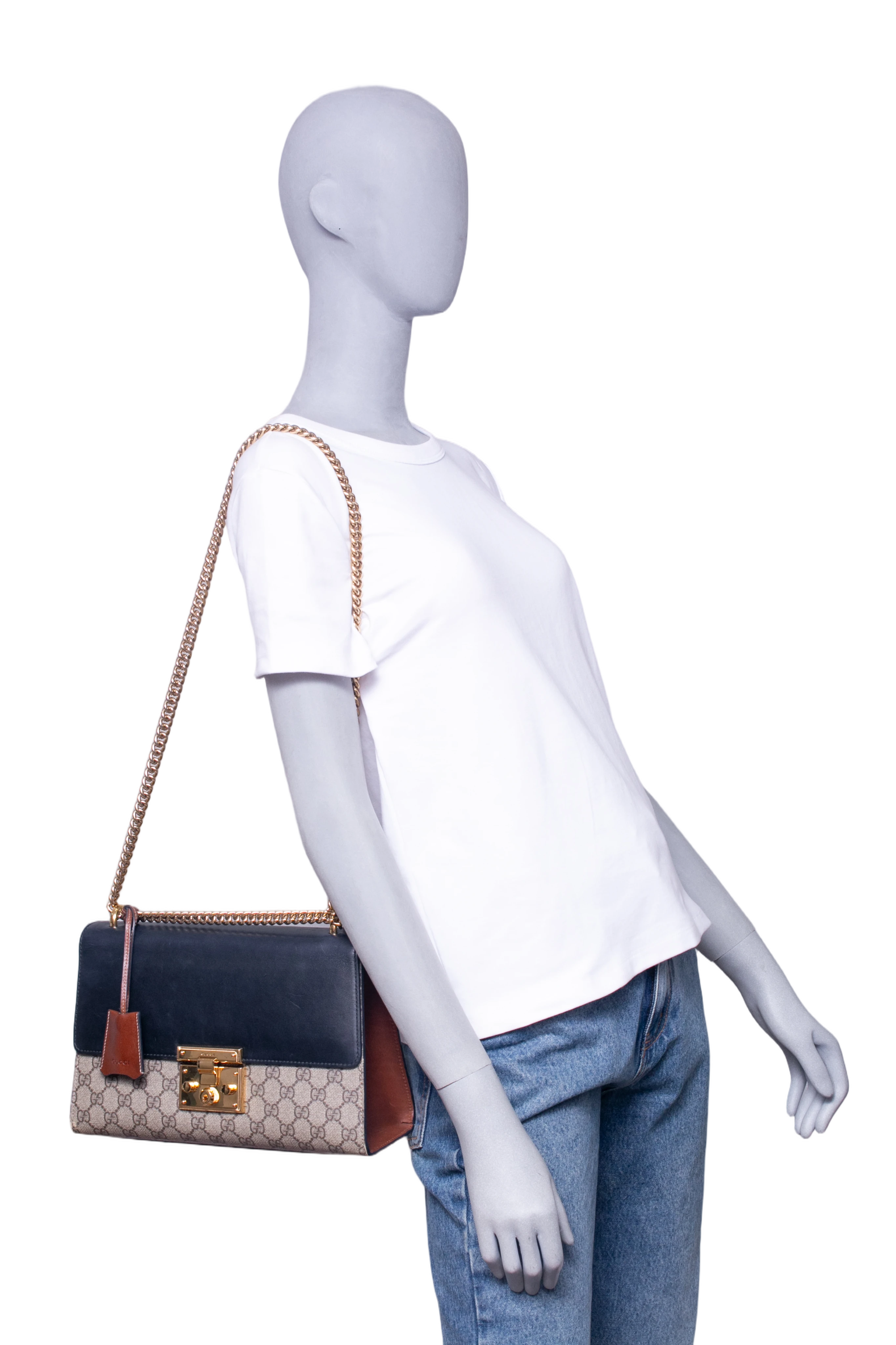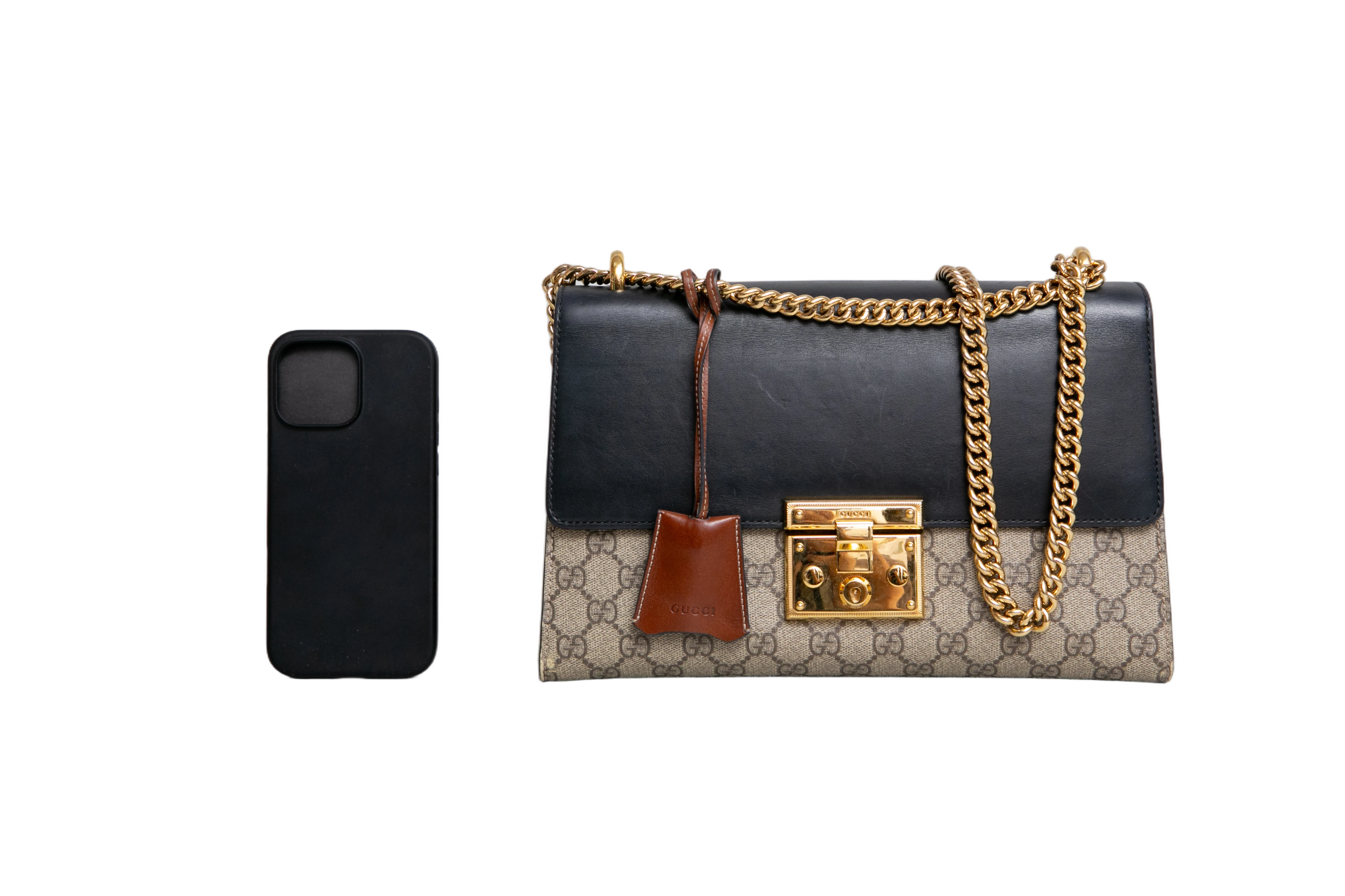 Gucci Padlock GG Supreme. Peça em ótimo estado, possui sinais na aba de couro e bolso externo. Acomoda todos os tamanhos de telefone.