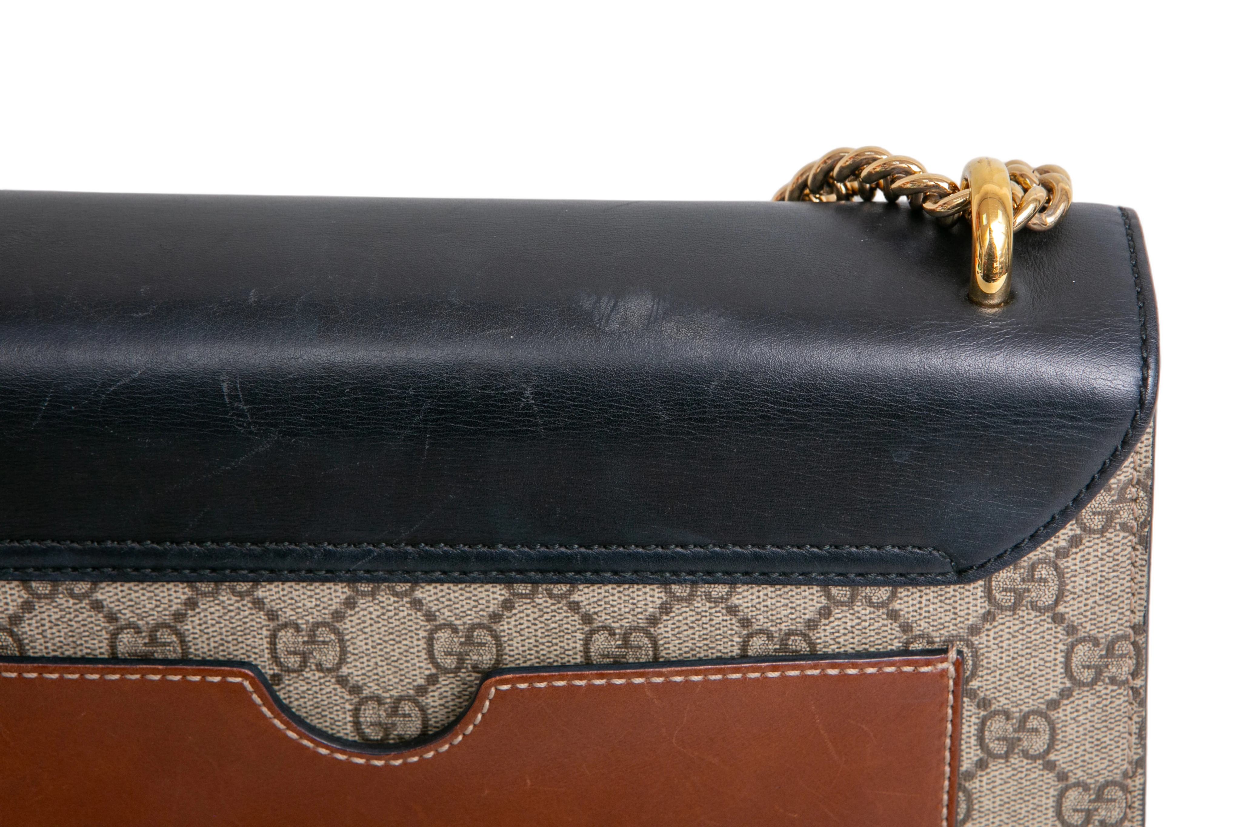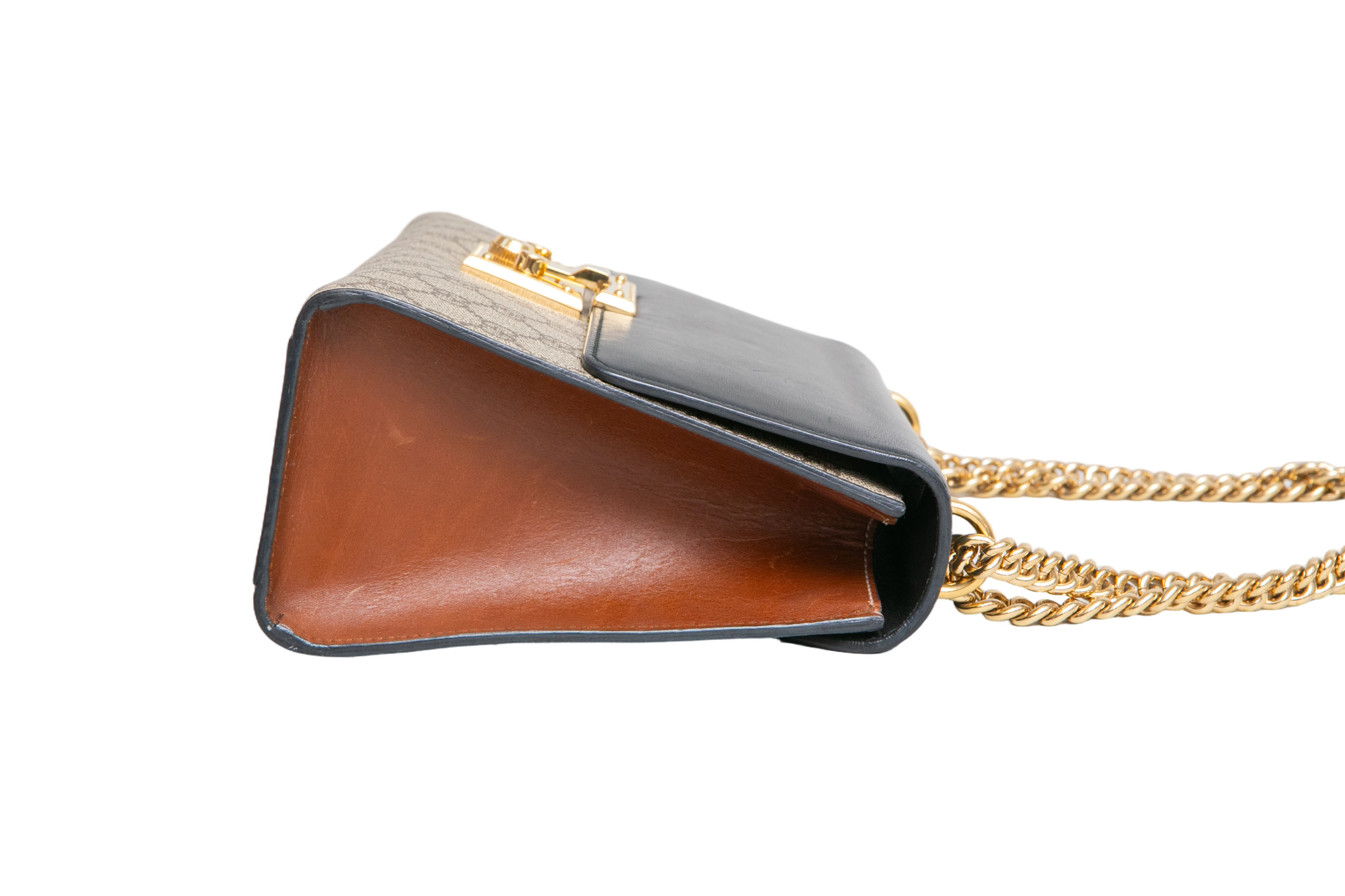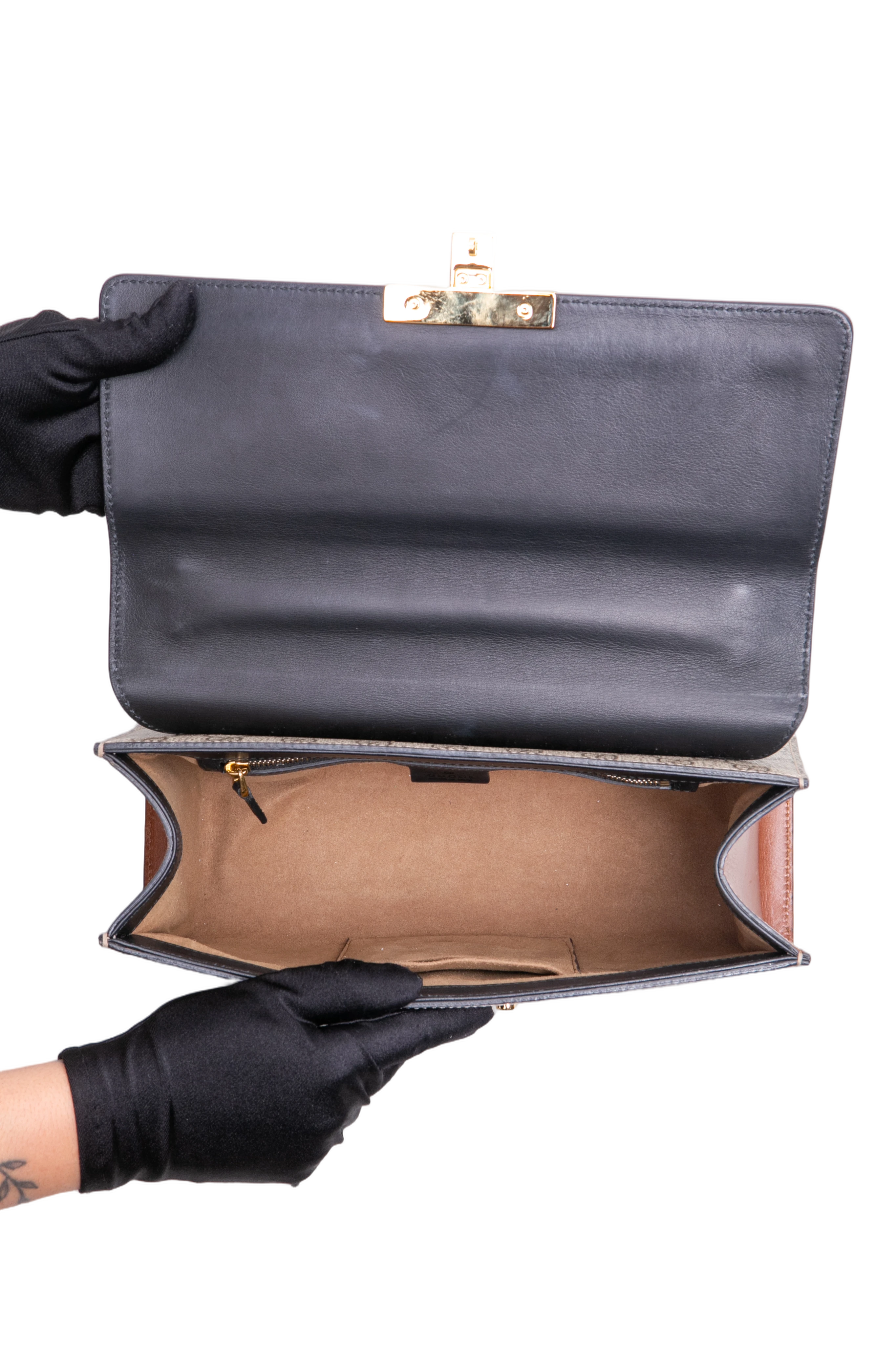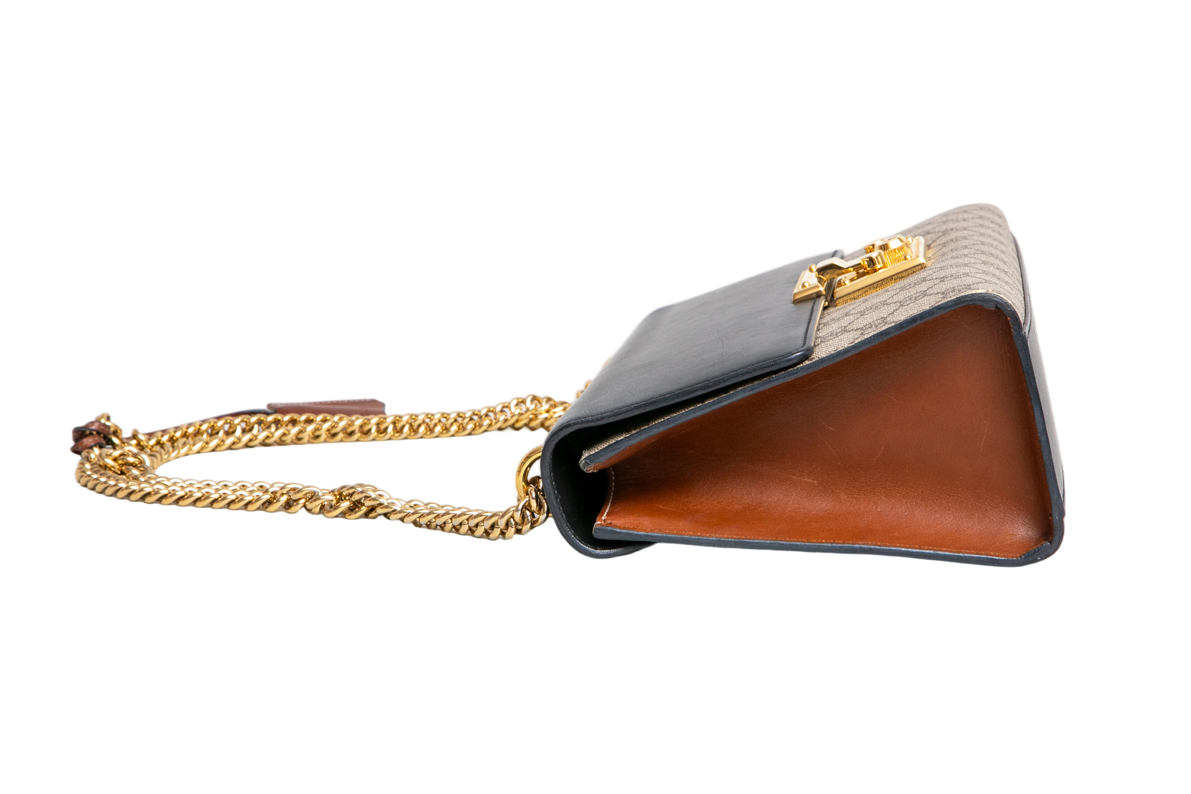 Bolsa em canvas GG Supreme com acabamento em couro preto. O modelo apresenta fecho metálico dourado com trava e detalhe em couro marrom com chave decorativa. A alça em corrente, para uso shoulder e crossbody