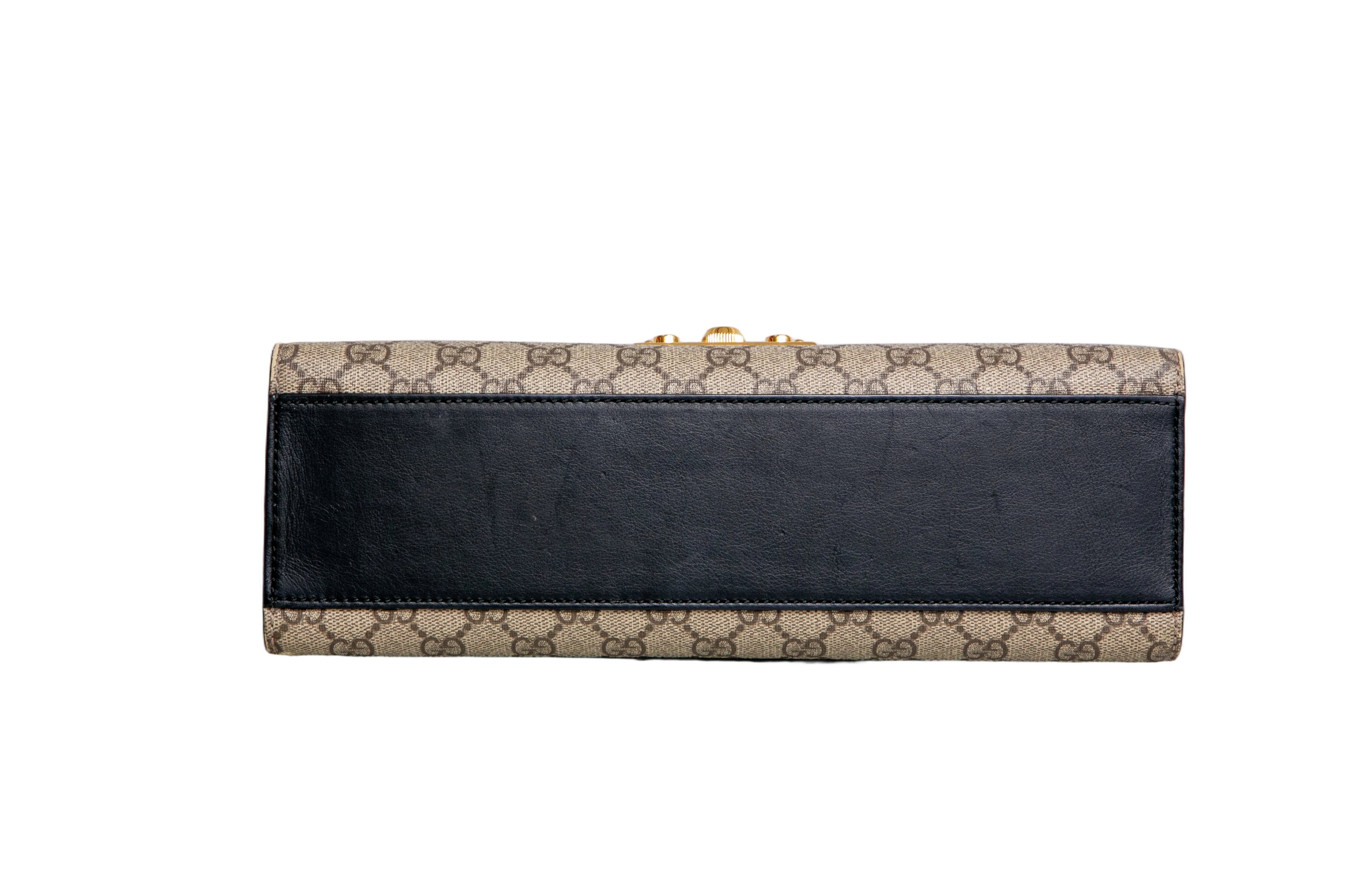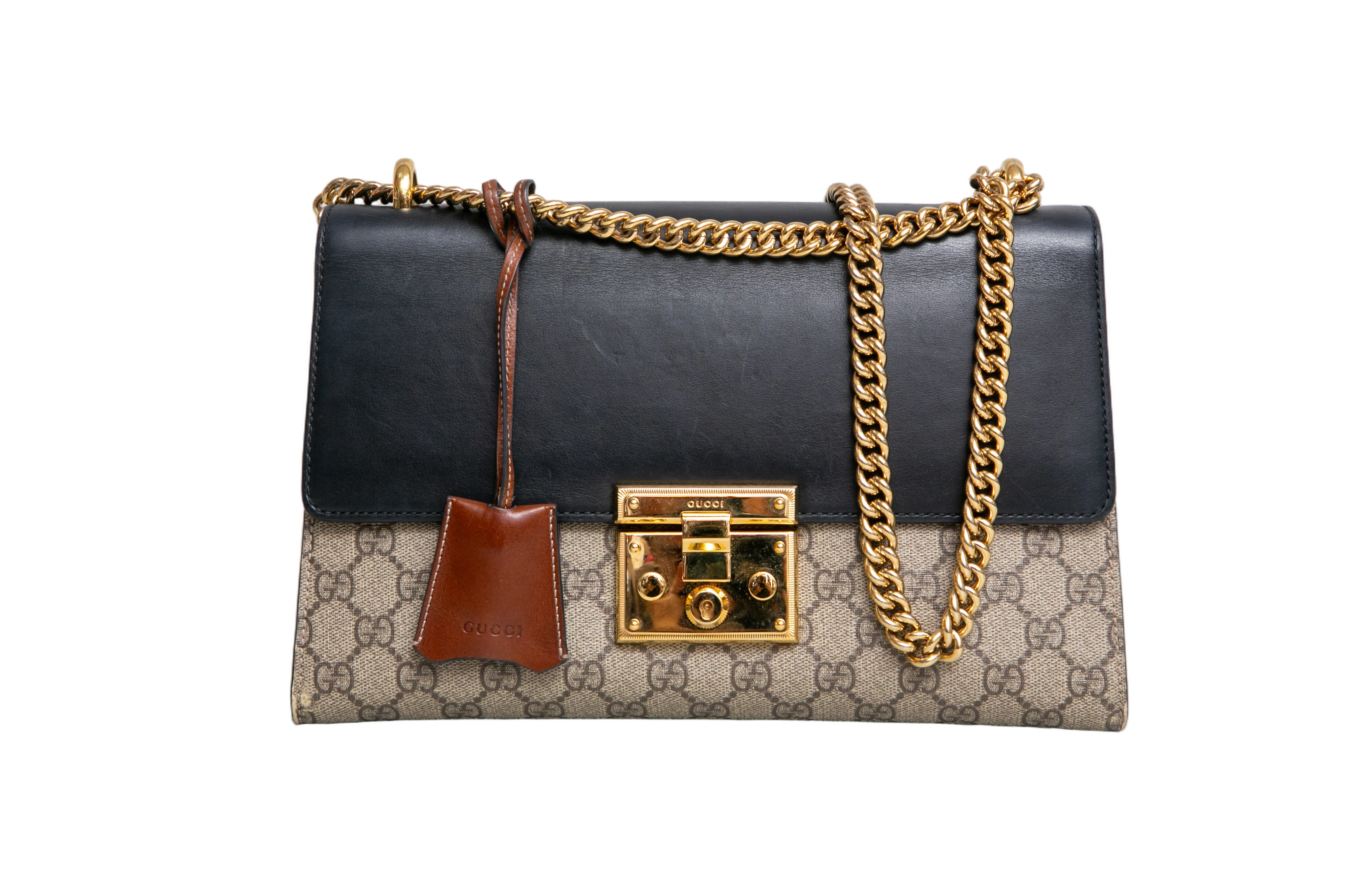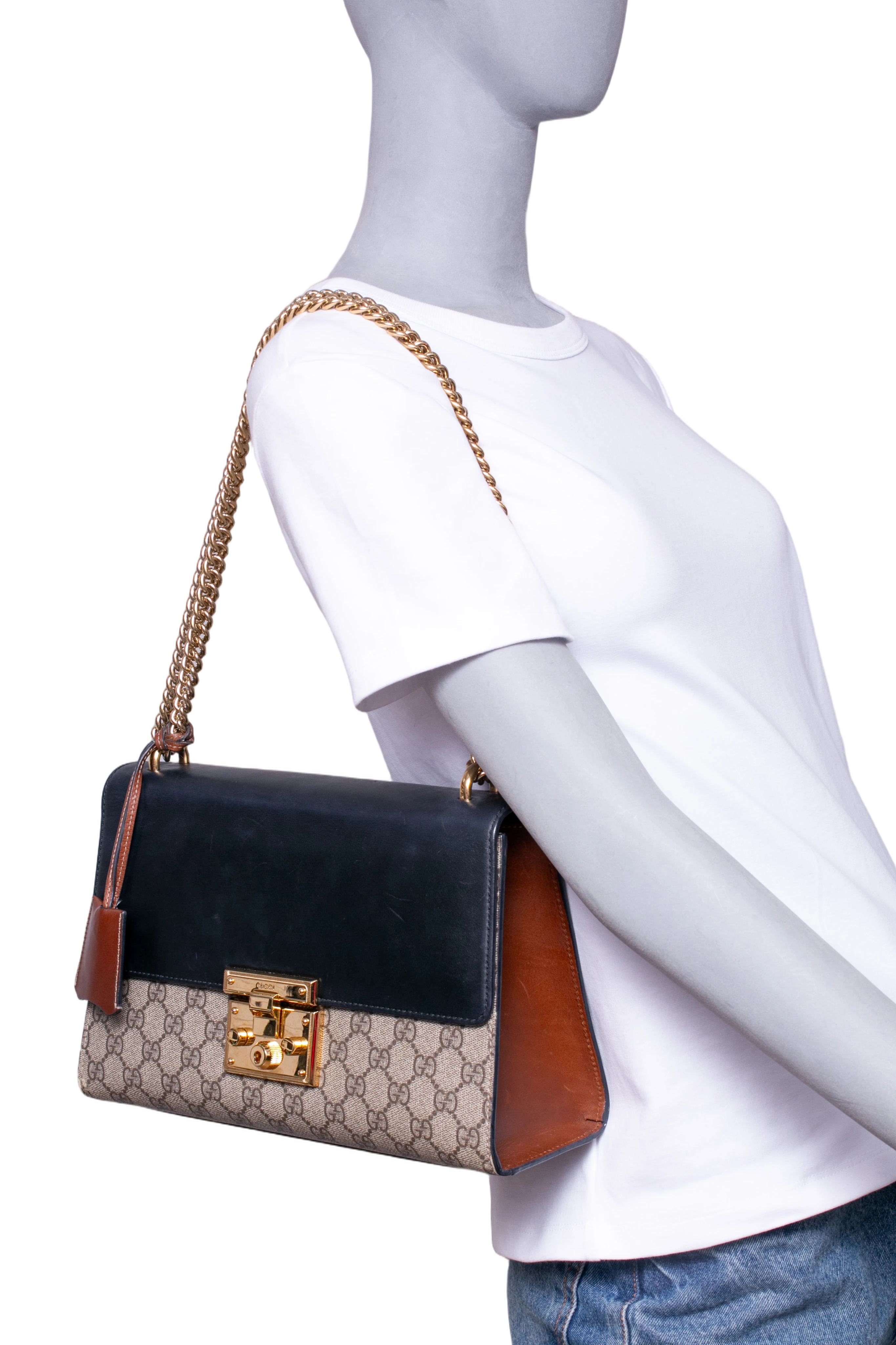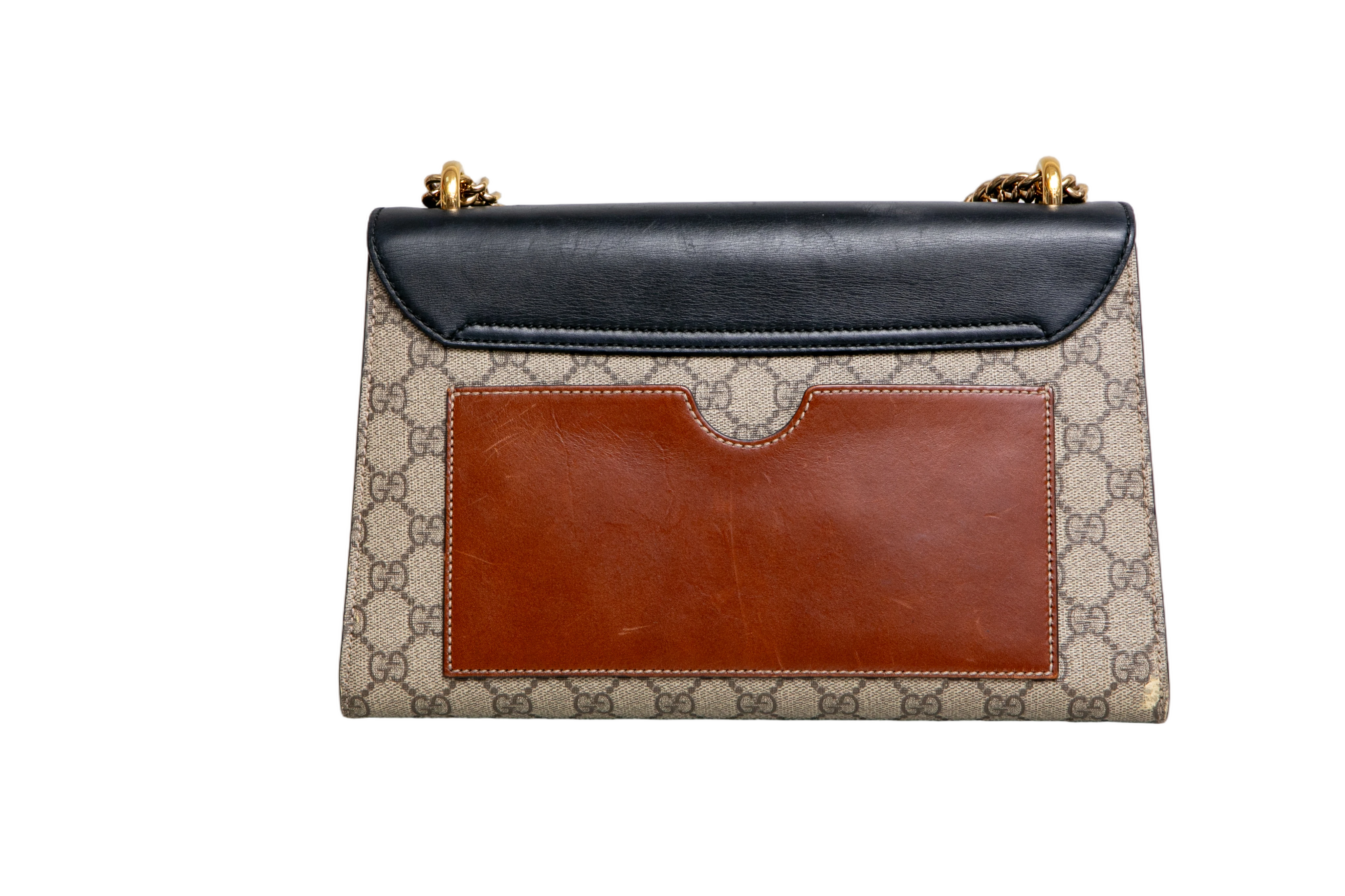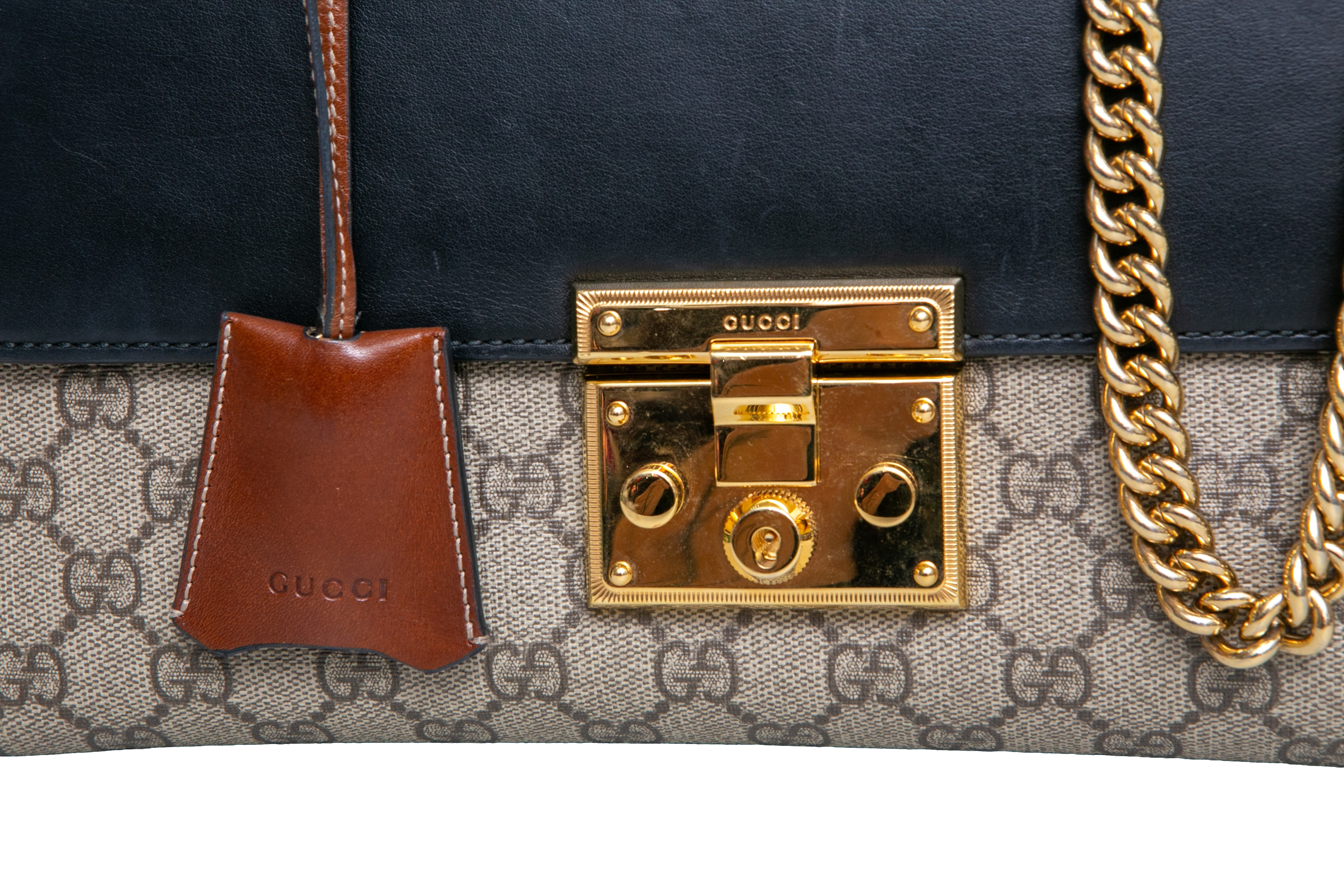 Bolsa em canvas GG Supreme com acabamento em couro preto. O modelo apresenta fecho metálico dourado com trava e detalhe em couro marrom com chave decorativa. A alça em corrente, para uso shoulder e crossbody
