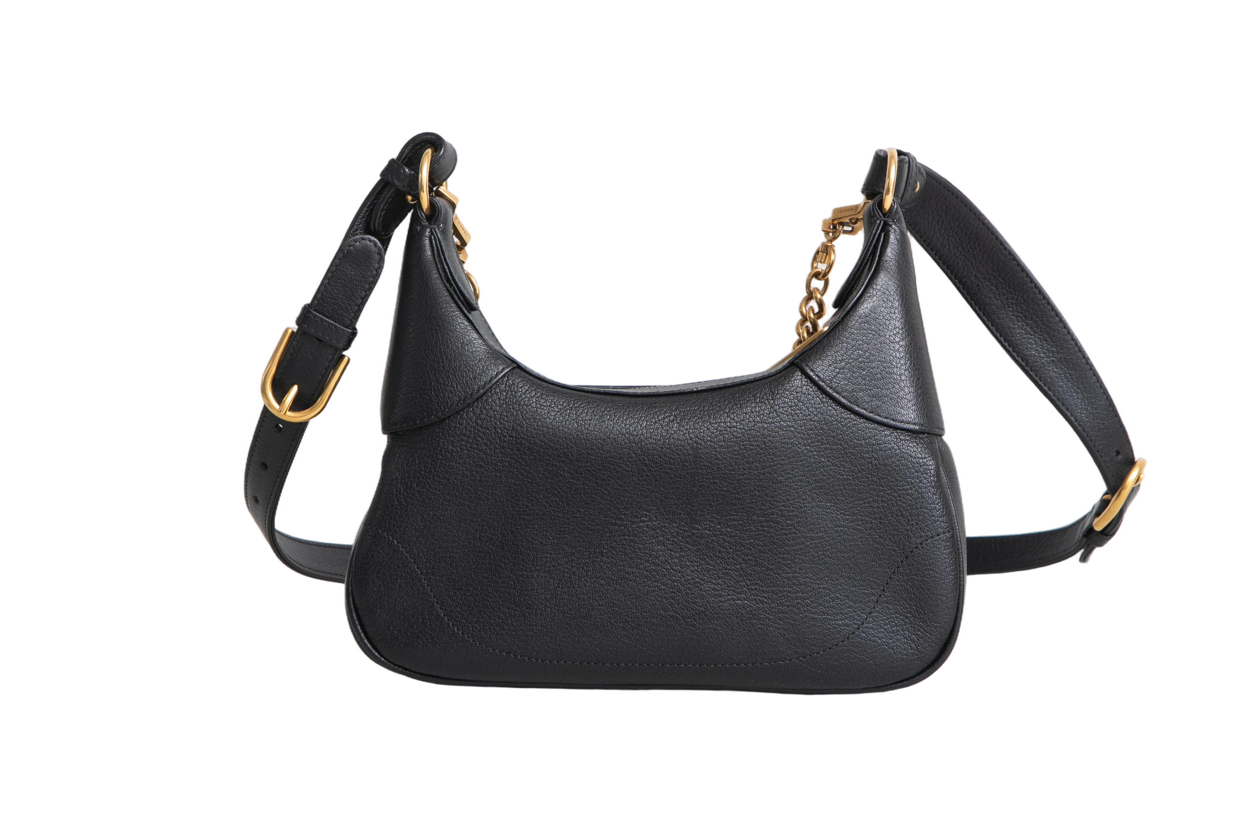 Bolsa em couro preto, com fecho em zíper possui alça longa em couro com ajuste e removível, e alça curta em correntaria para uso shoulder, crossbody e handle bag