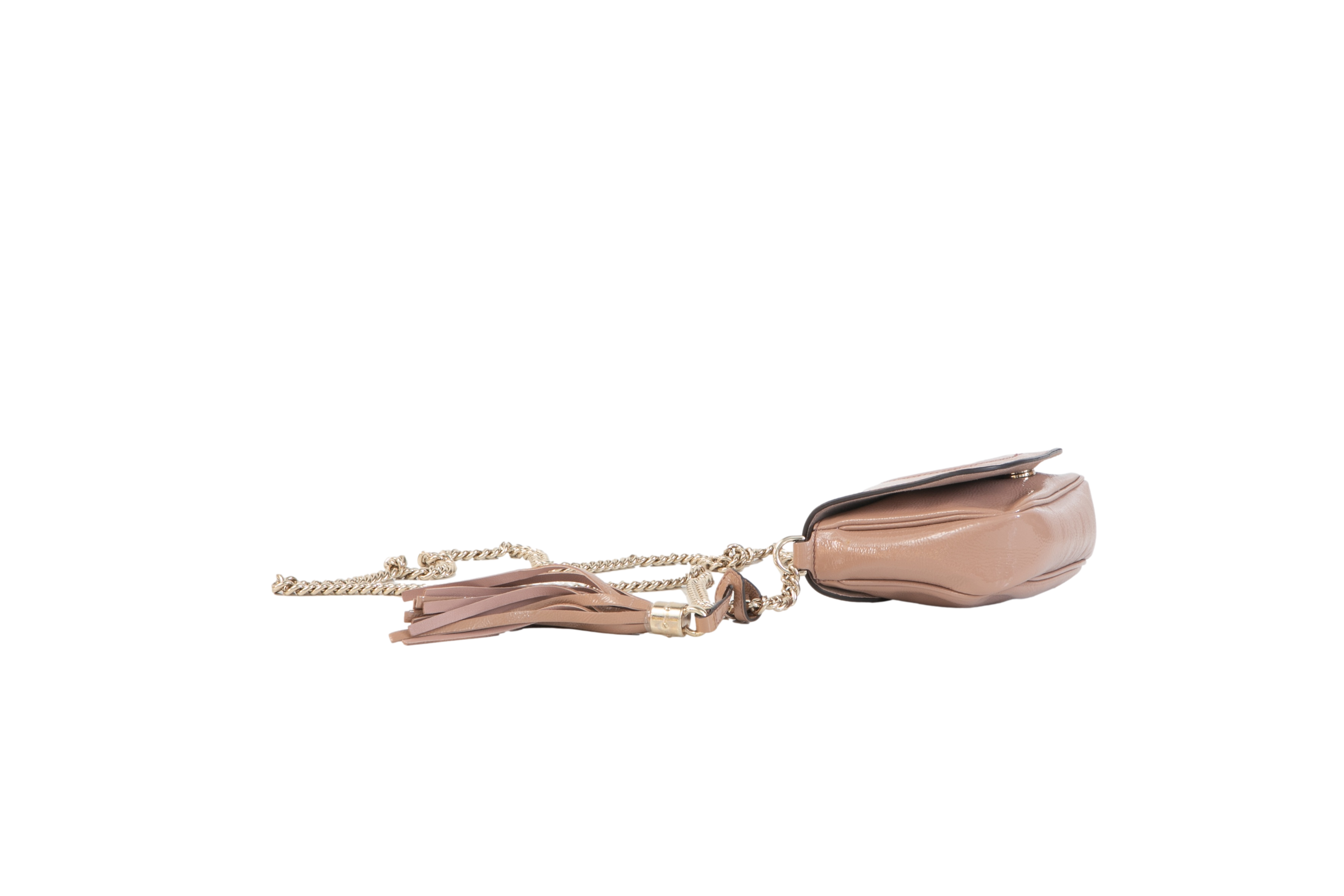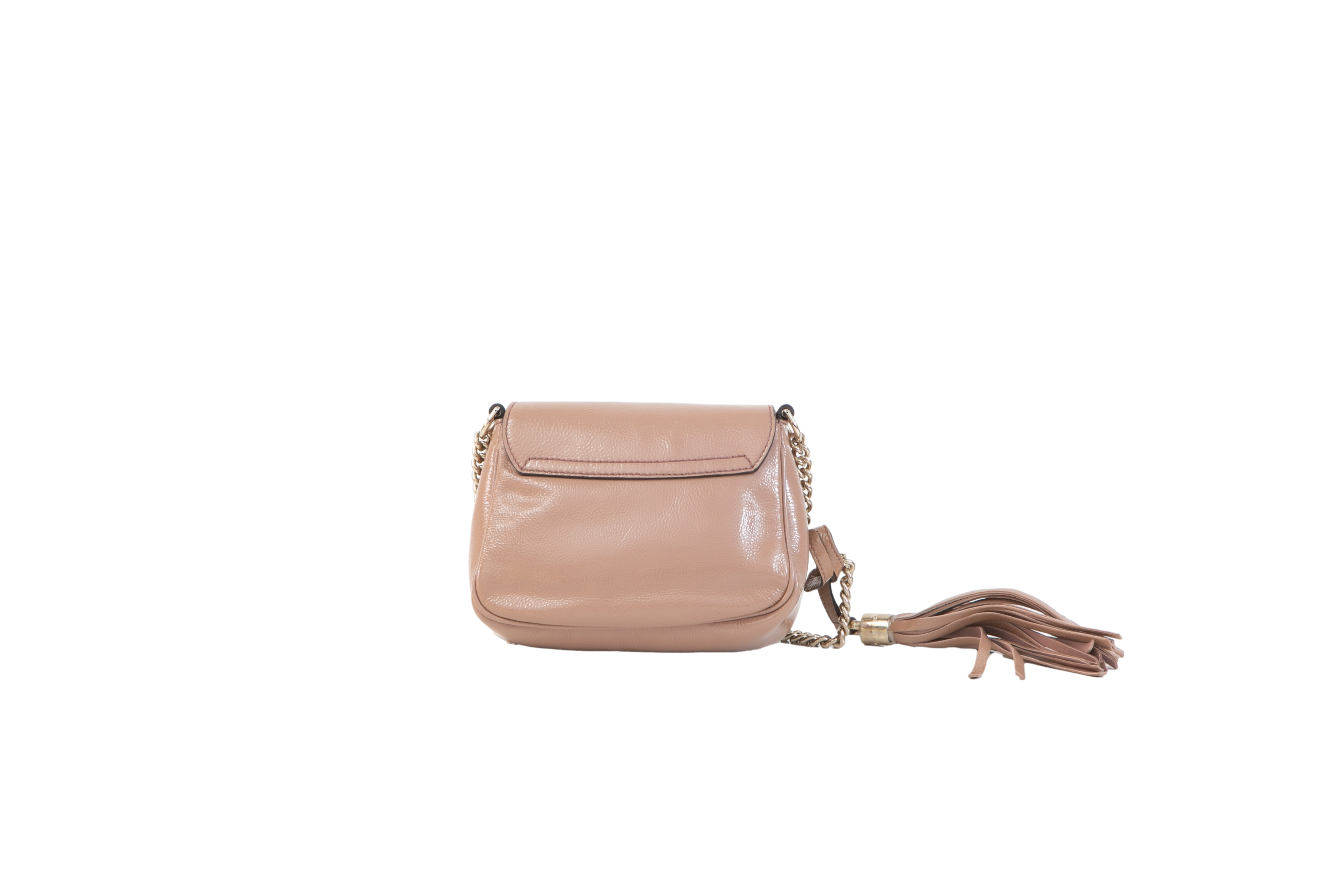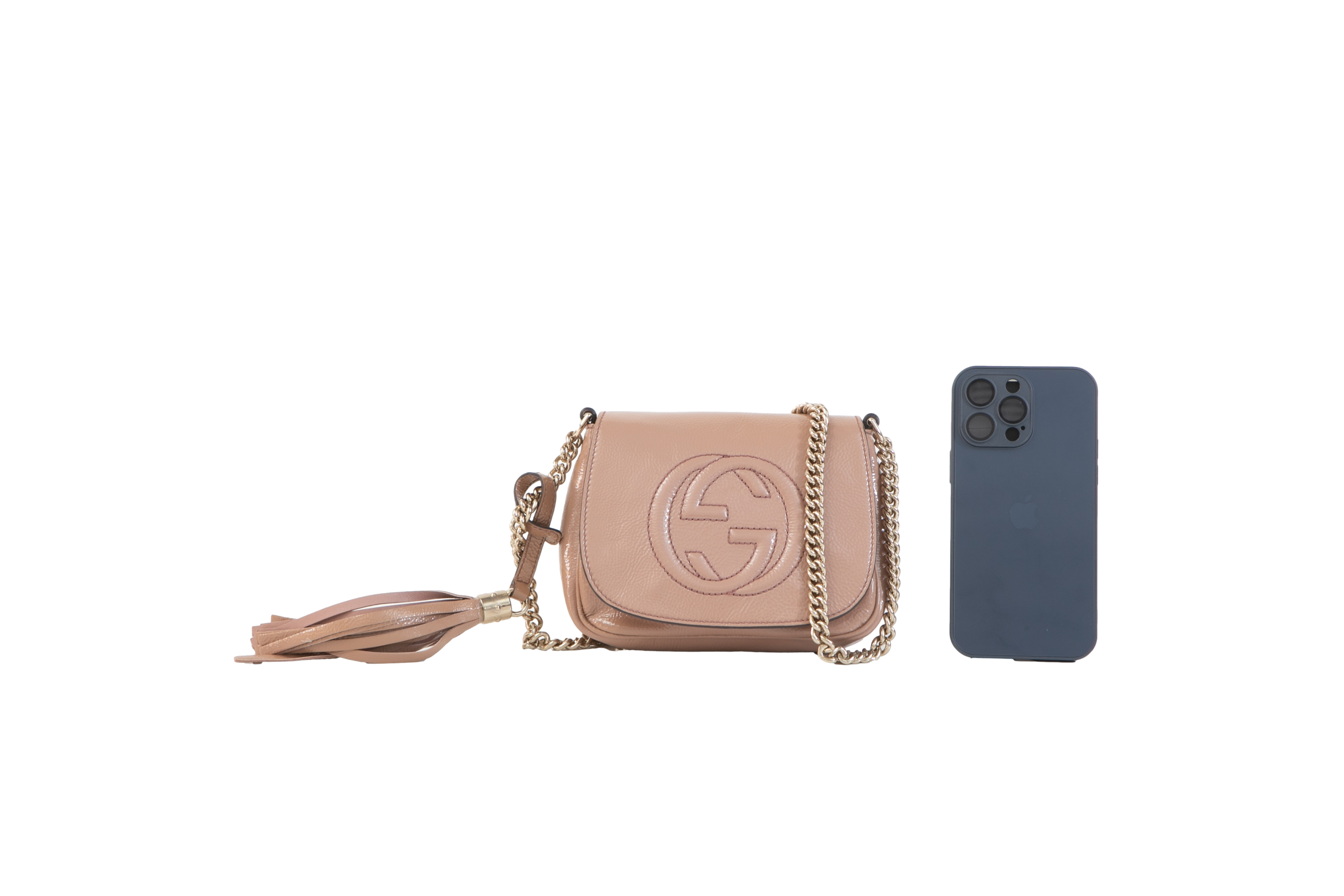 Gucci Small Soho Chain Patent Blush. Peça em perfeito estado, contém mínimas manchas internas e leve odor de armazenamento. Acomoda todos os tamanhos de telefone.