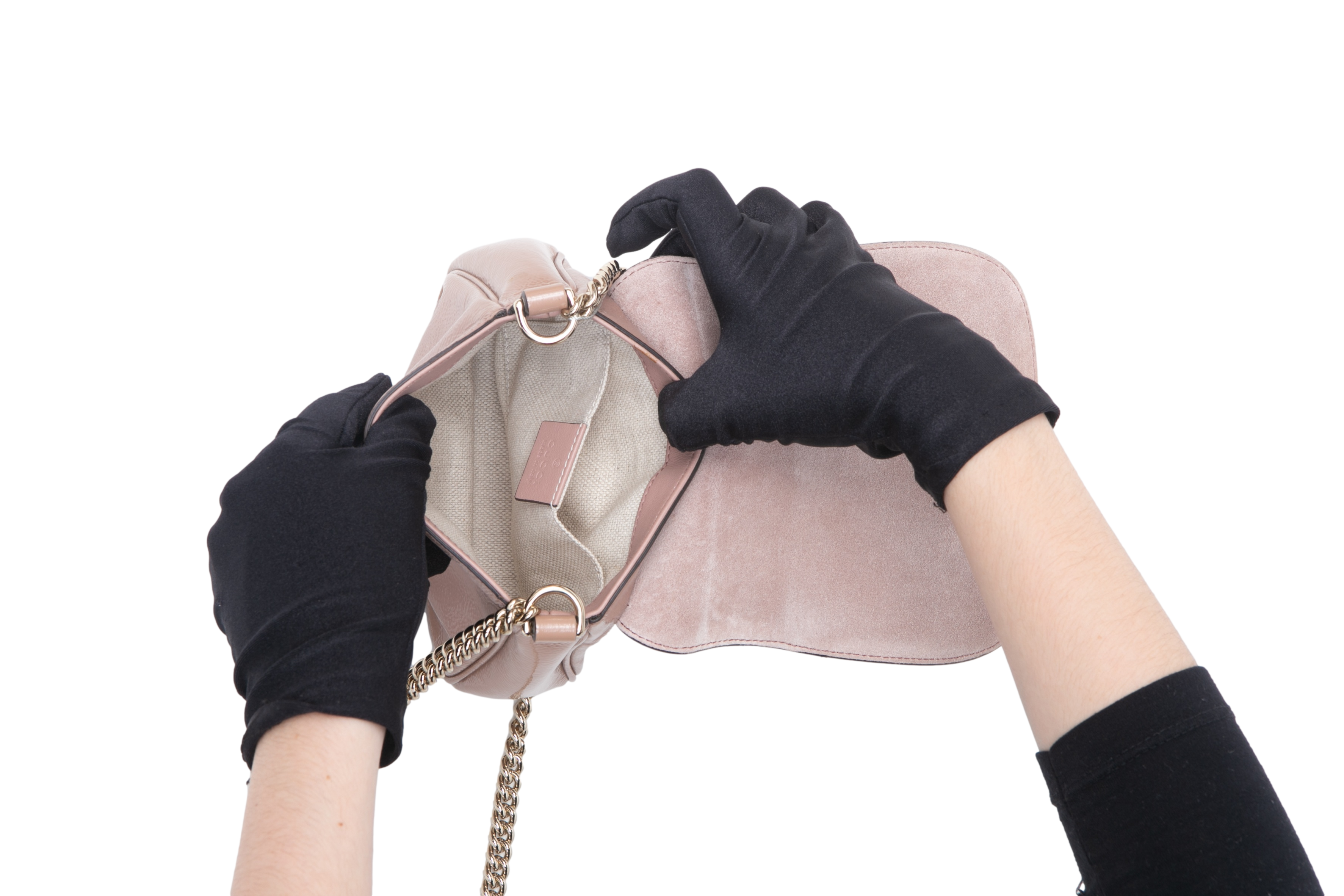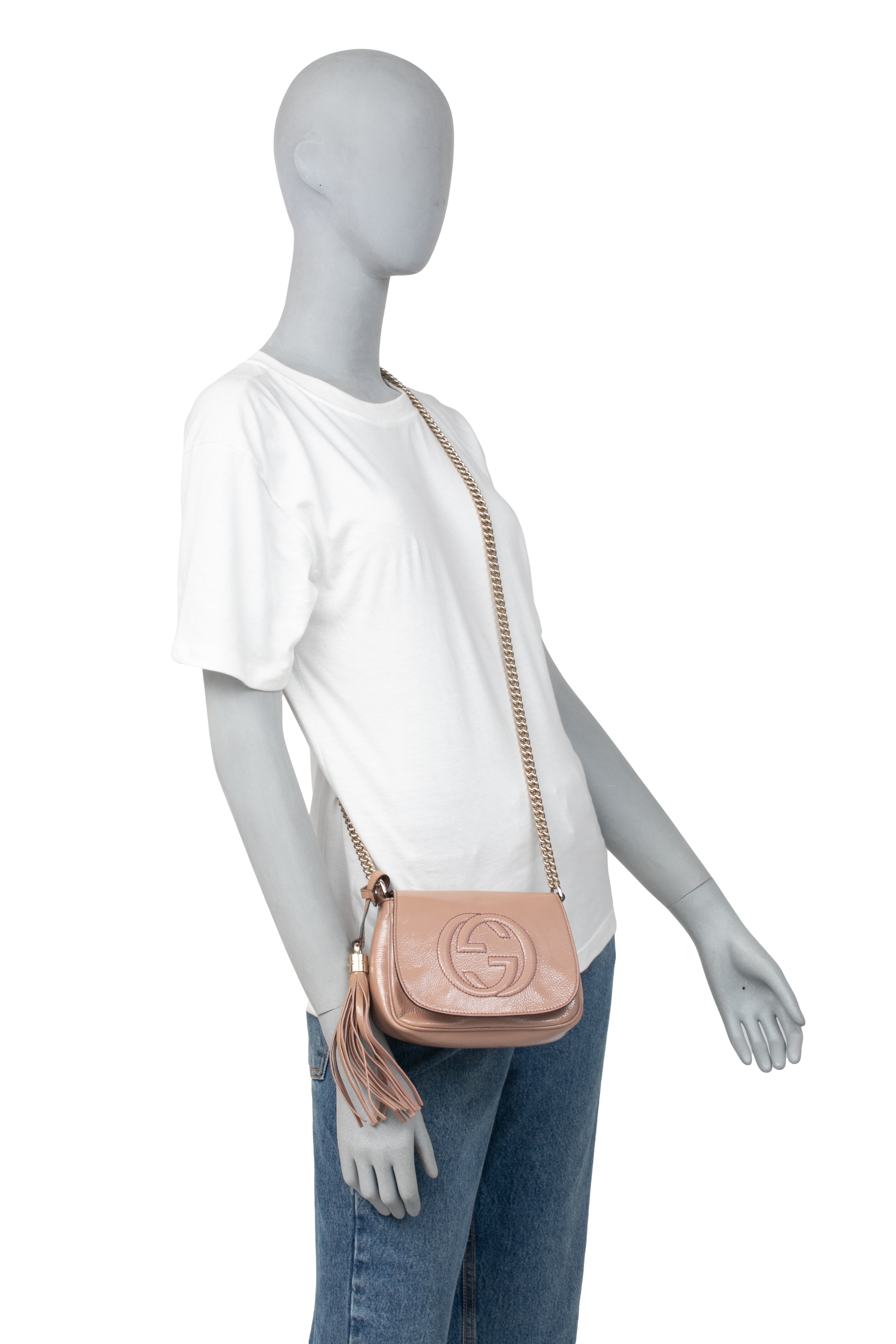 A Gucci Small Soho Chain é uma bolsa compacta e elegante, feita de couro envernizado em um tom de blush suave. O logo GG em relevo na parte frontal é um destaque que reflete o estilo distintivo da marca.