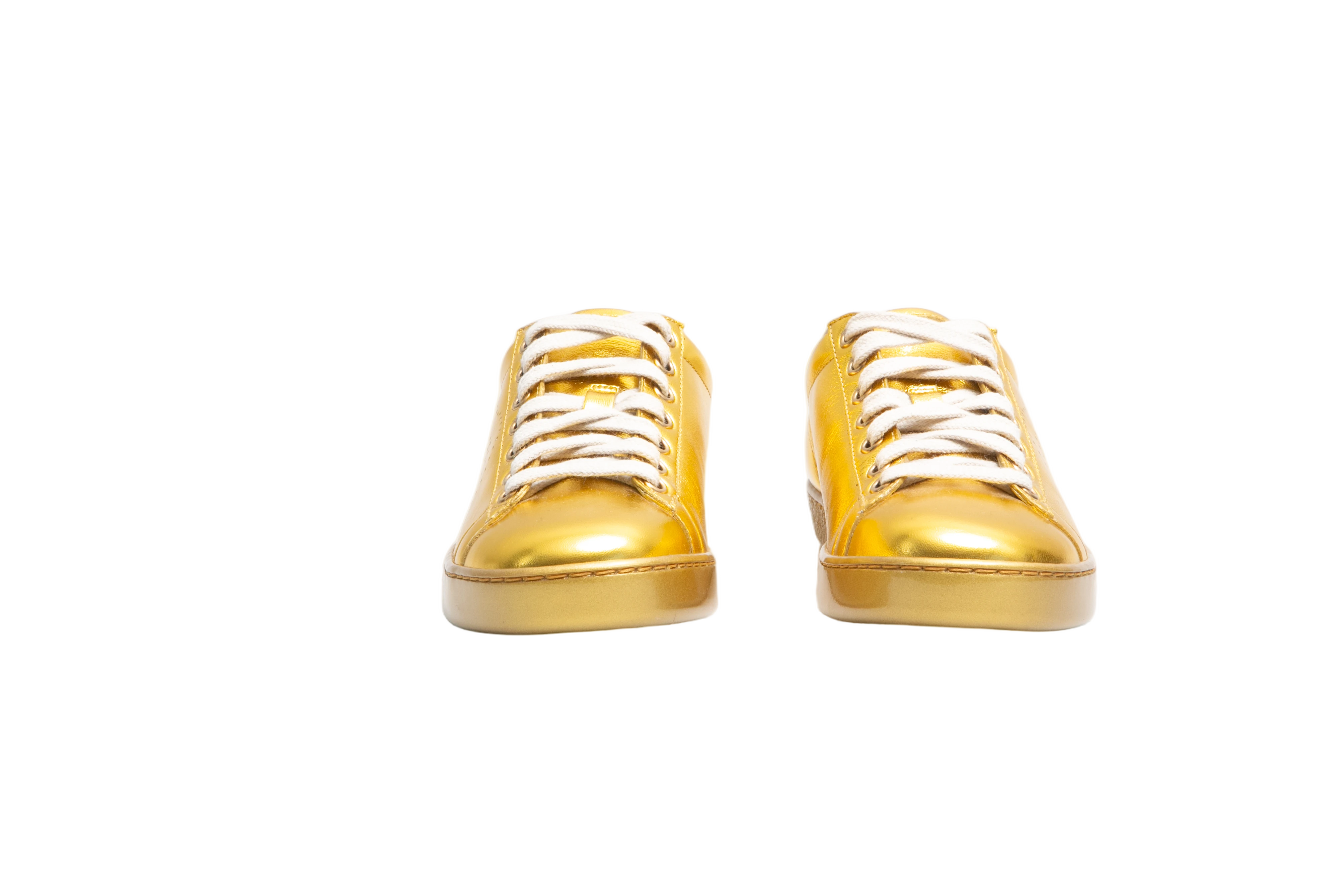 Tênis confeccionado em couro metalizado dourado. Modelo de cano baixo com cadarço branco, detalhe perfurado lateral em formato do icônico monograma da marca e solado emborrachado em tom dourado.