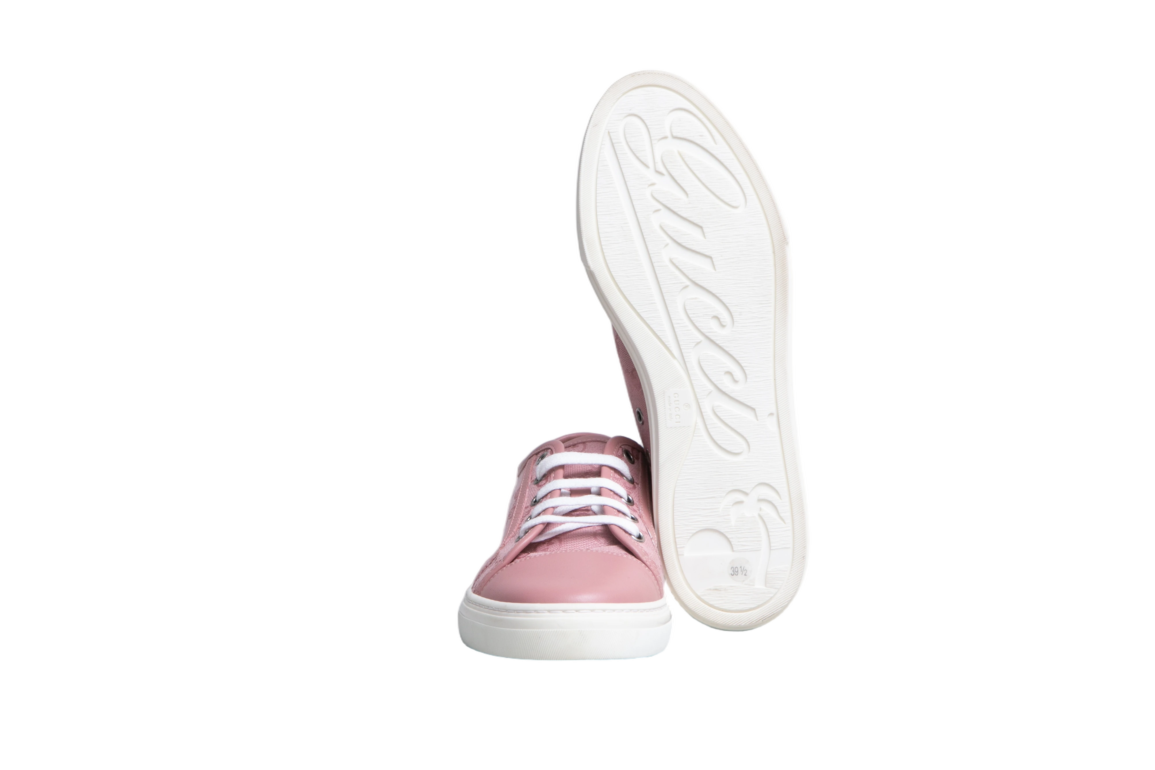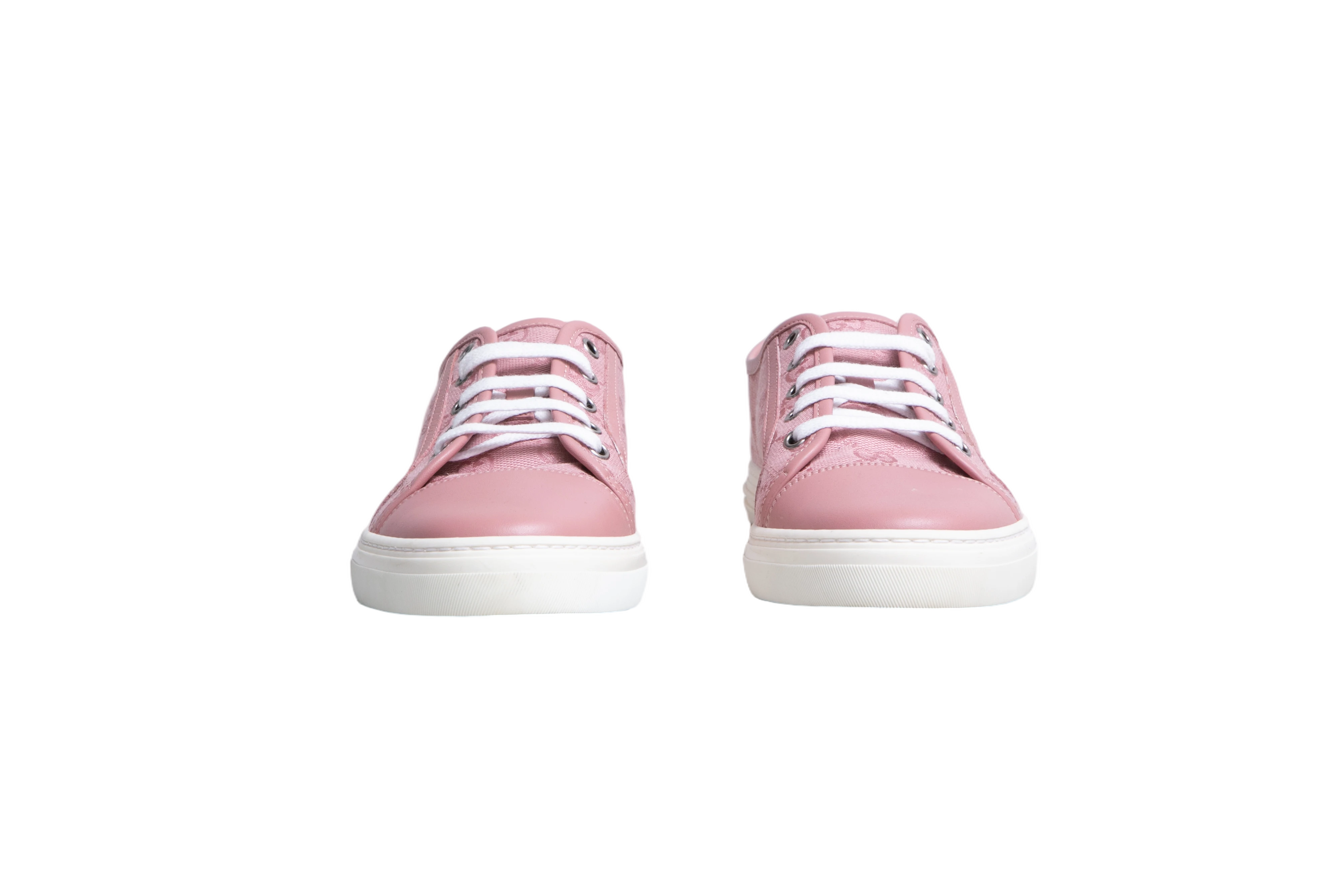 Tênis em tecido monograma rosa com acabamento em couro no mesmo tom. Modelo de cadarço branco, solado em borracha branca.