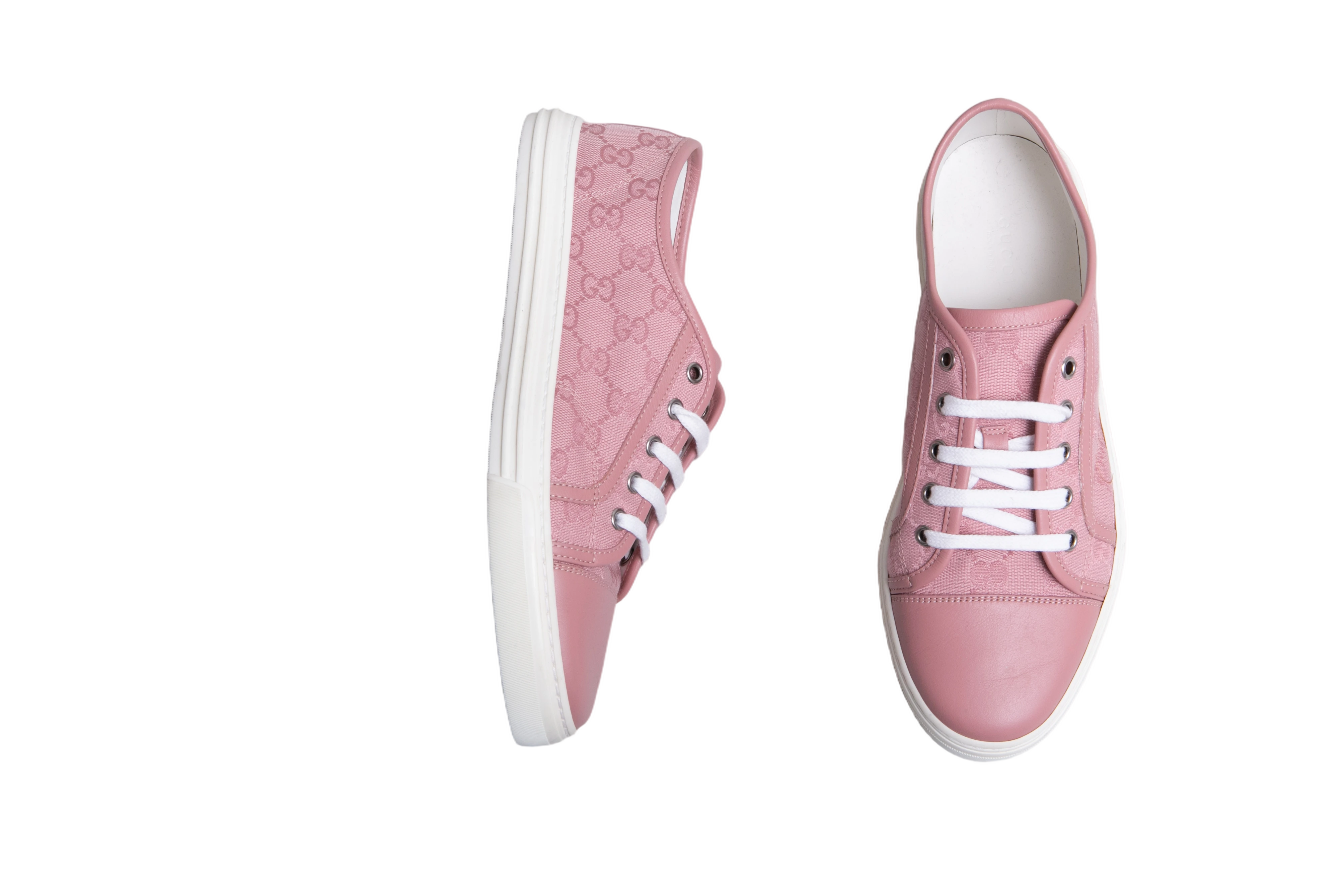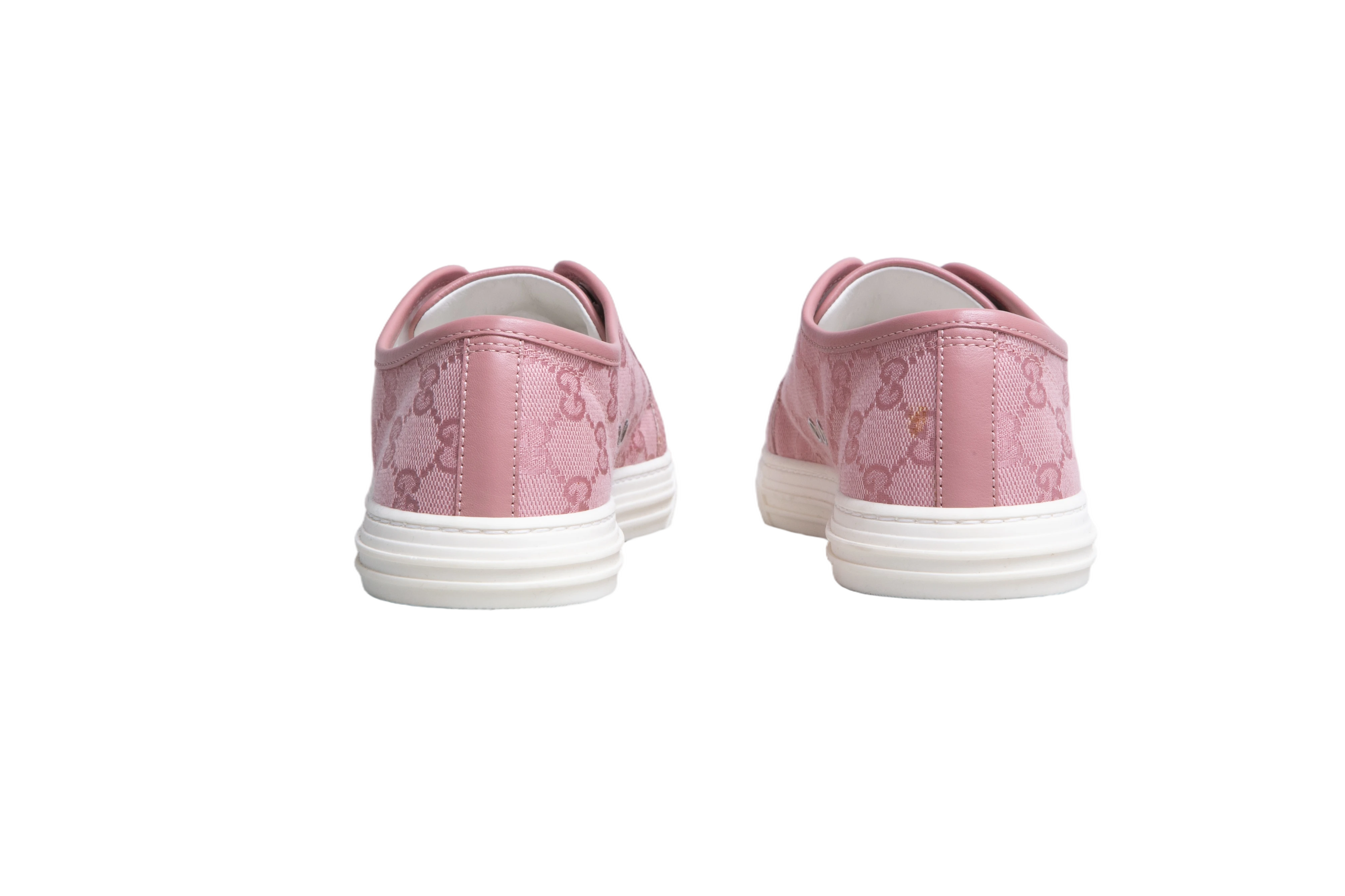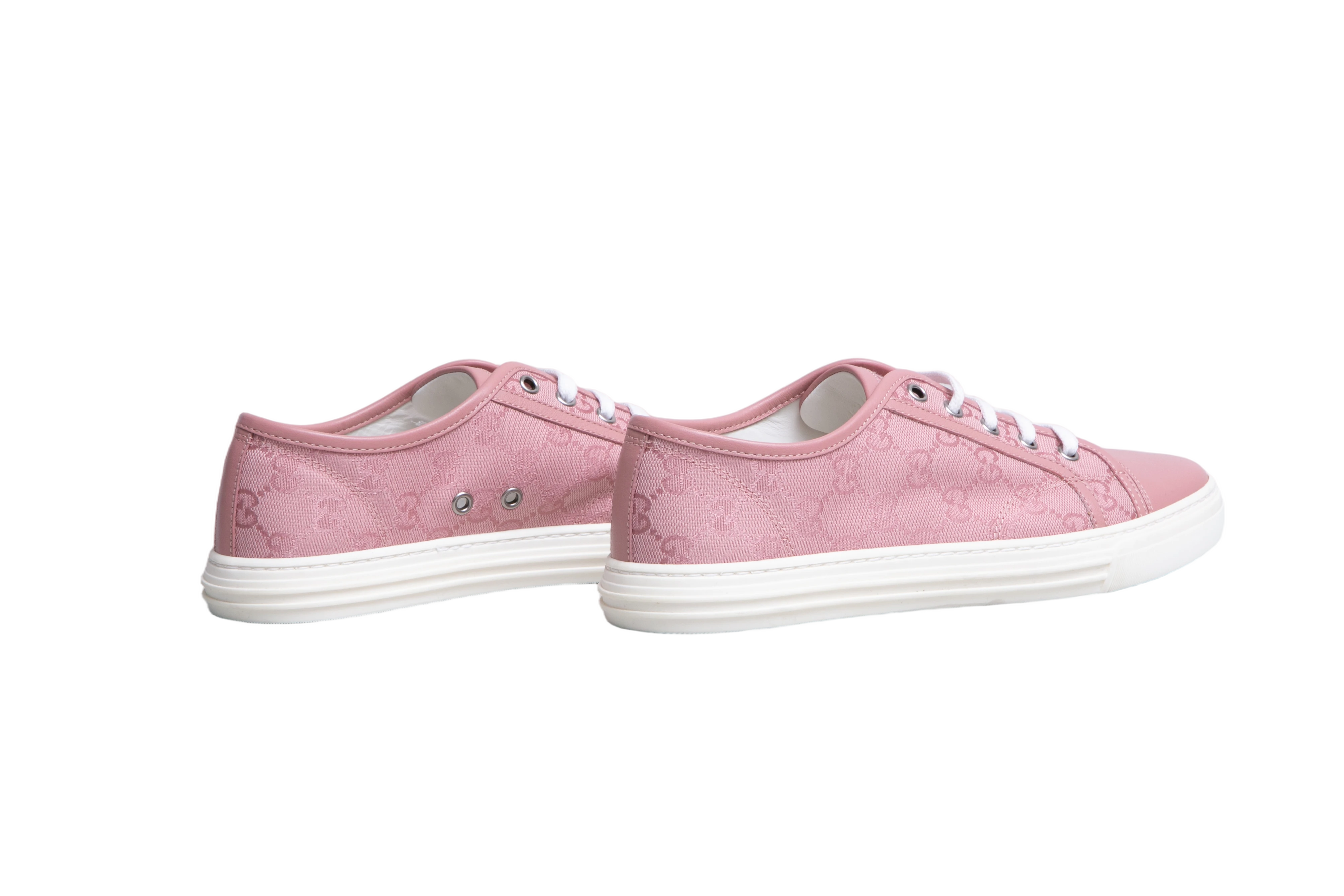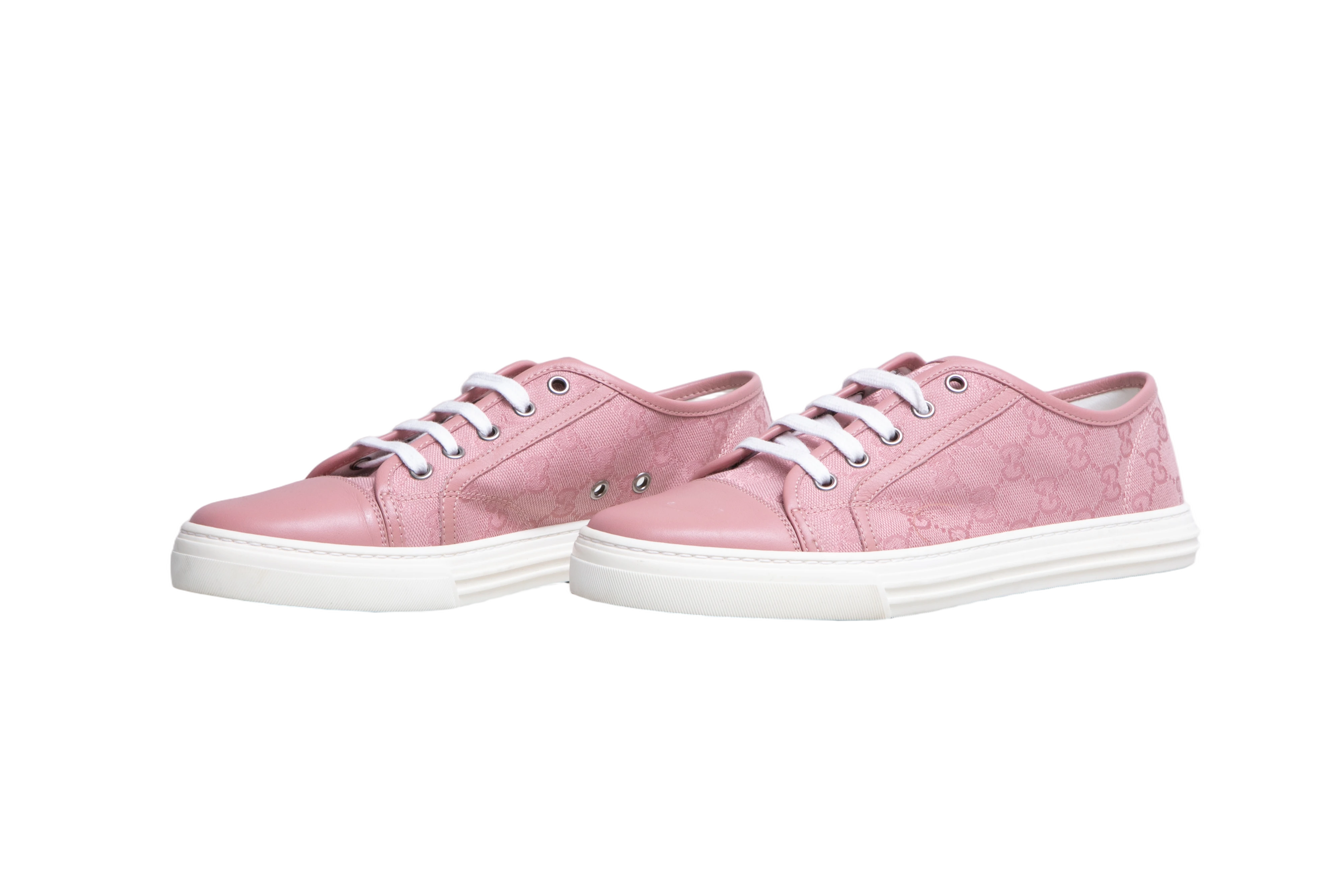 Gucci Sneakers GG Canvas and Leather Low Pink. Peça em perfeito estado, possui pequenos sinais de uso na sola.