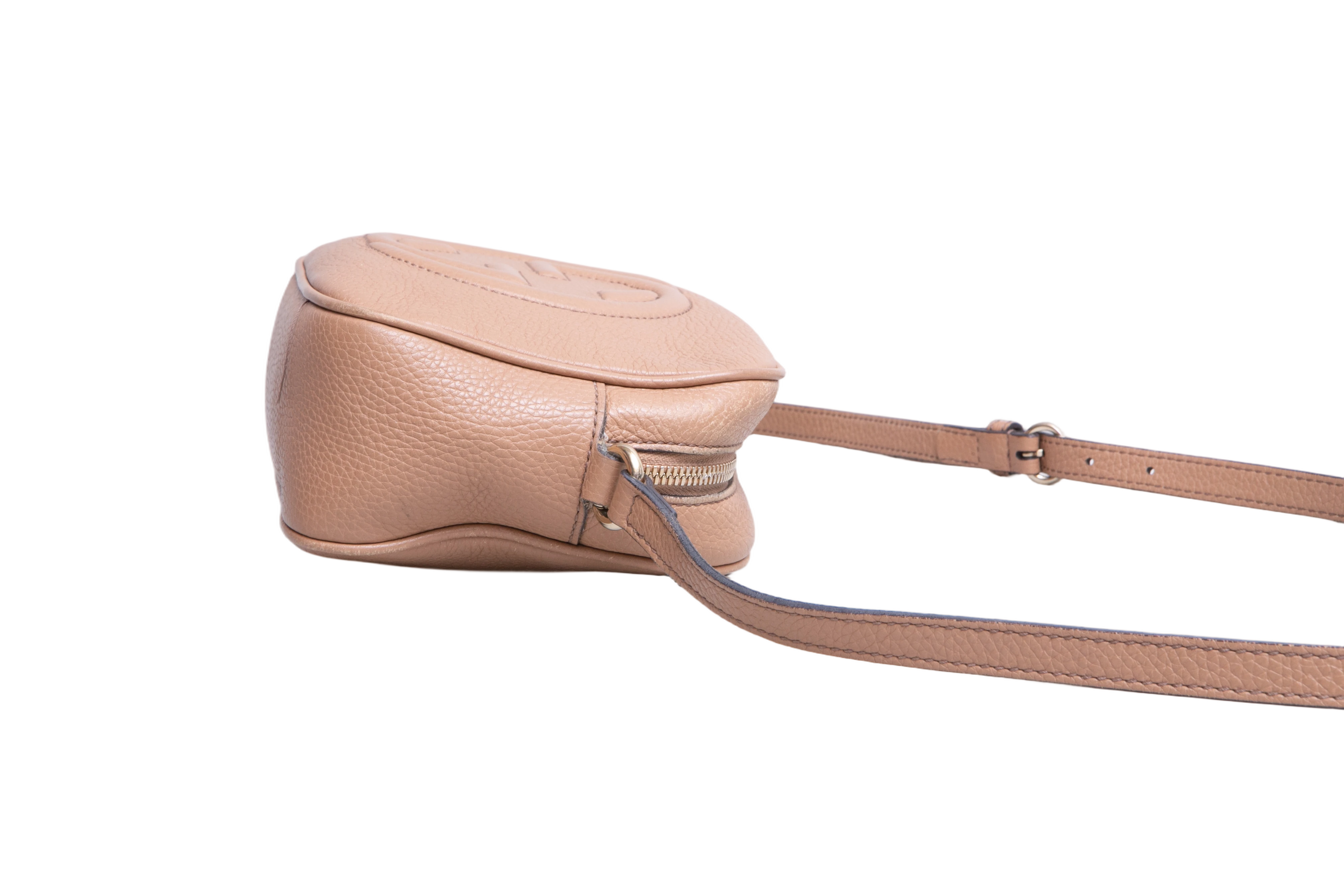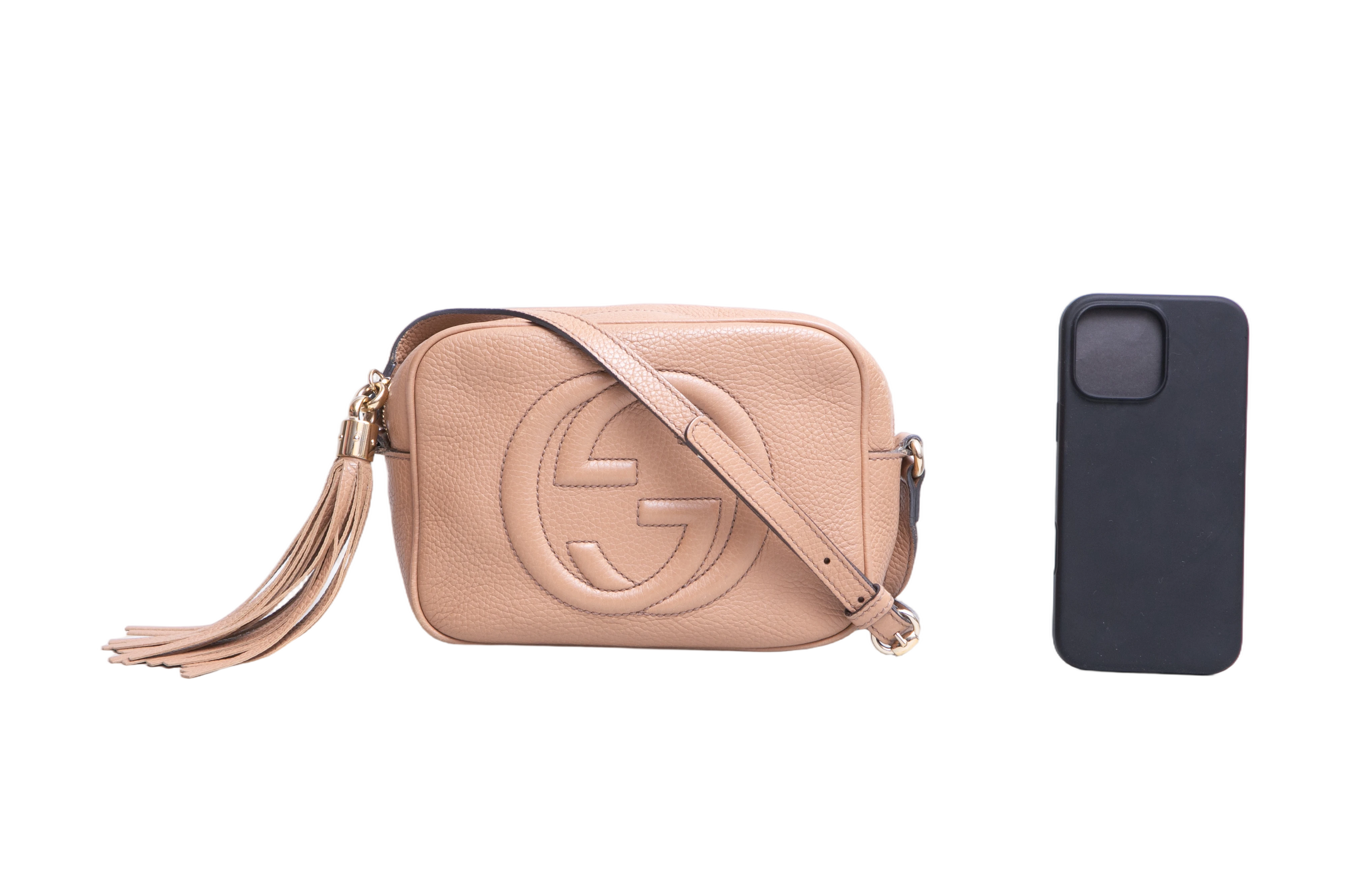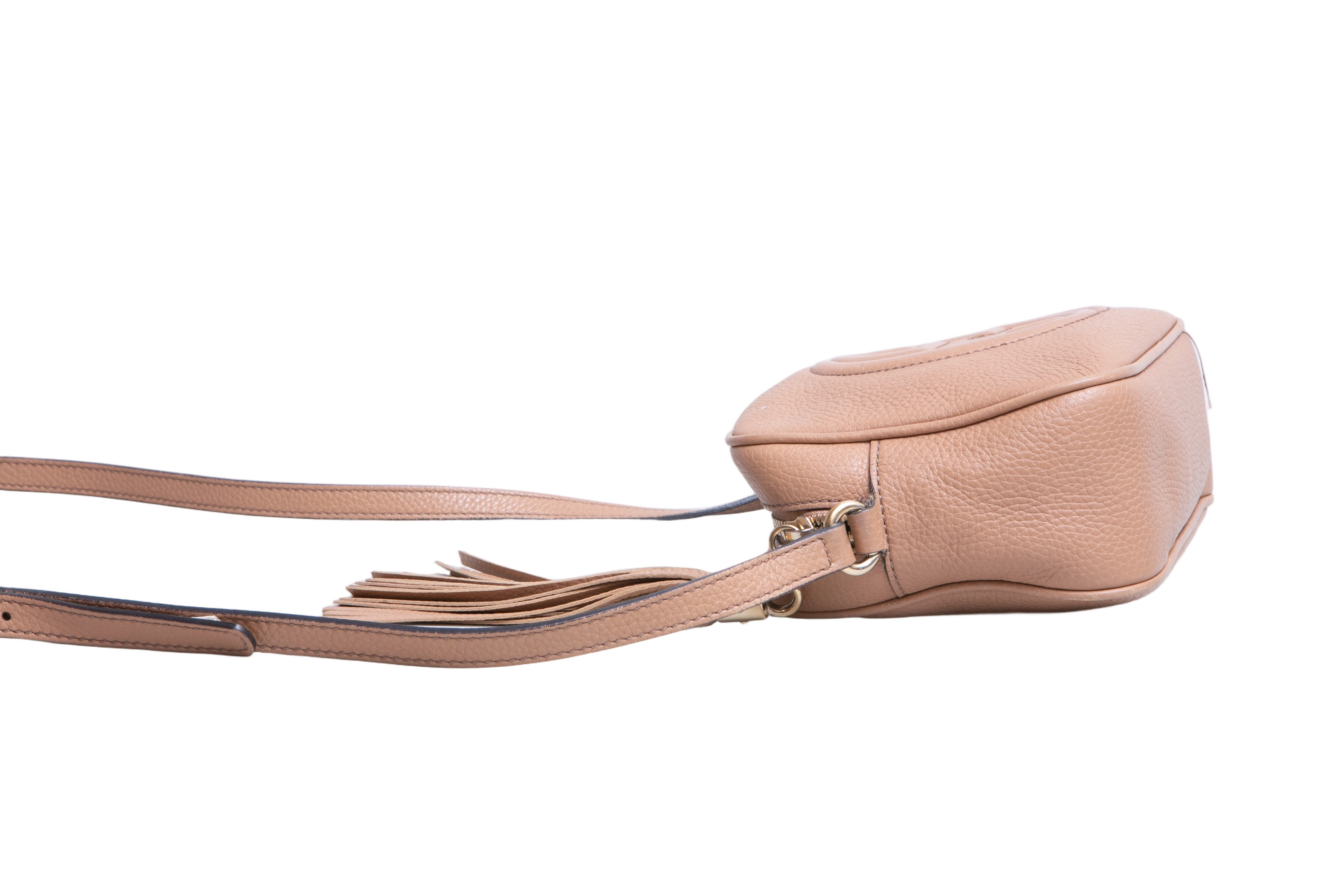 Gucci Soho Disco Camera Bag Beige. Peça em ótimo estado, possui sinais no couro, arestas e manchas no forro. Acomoda todos os tamanhos de telefone.