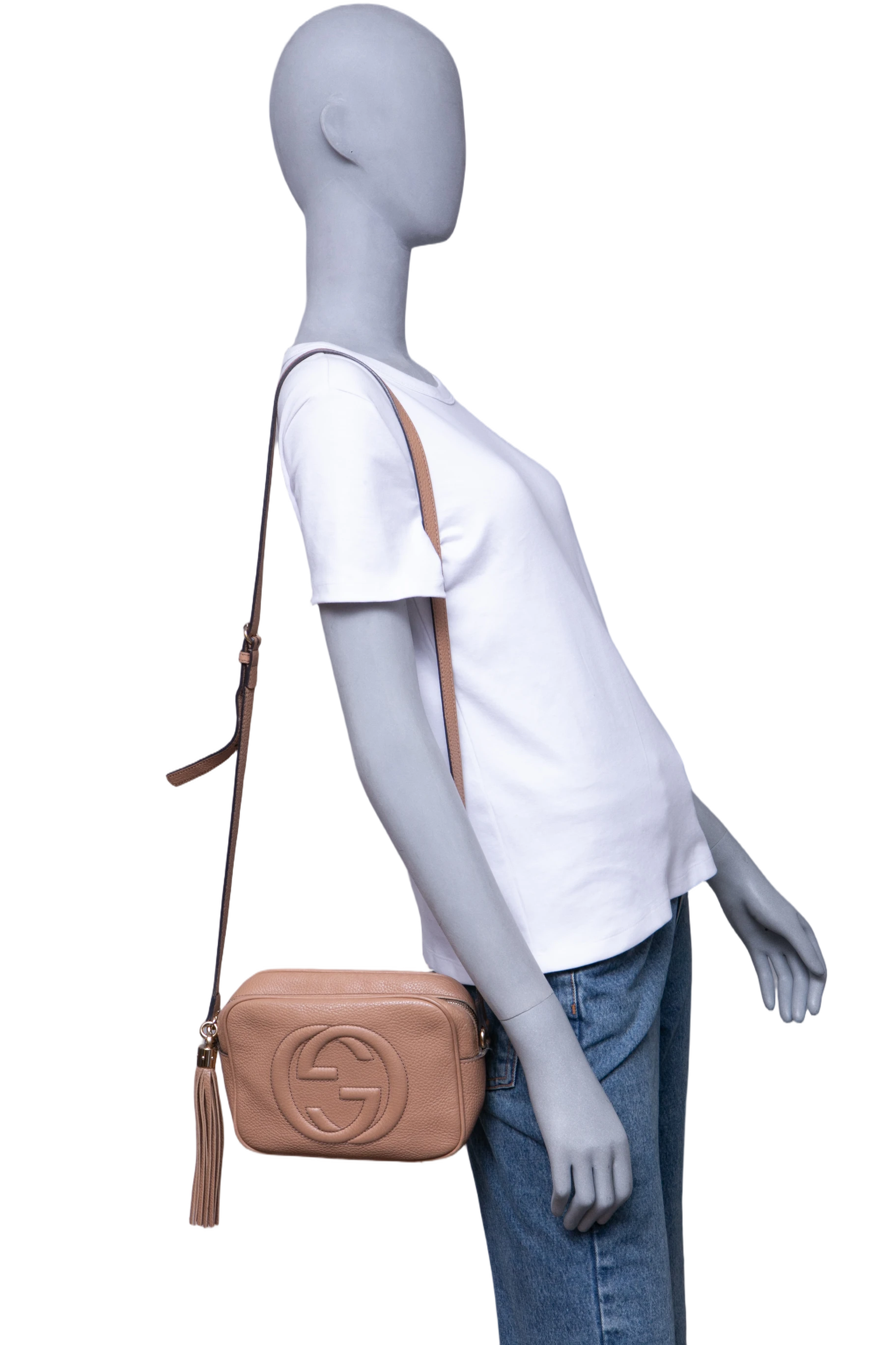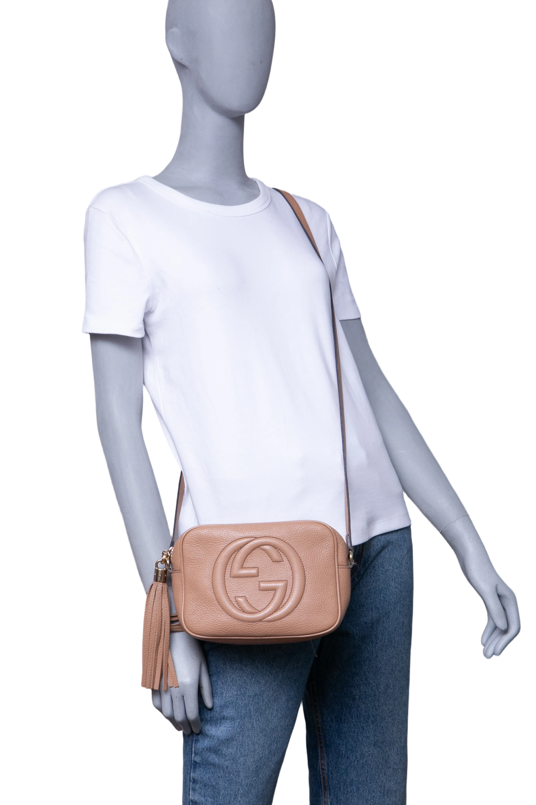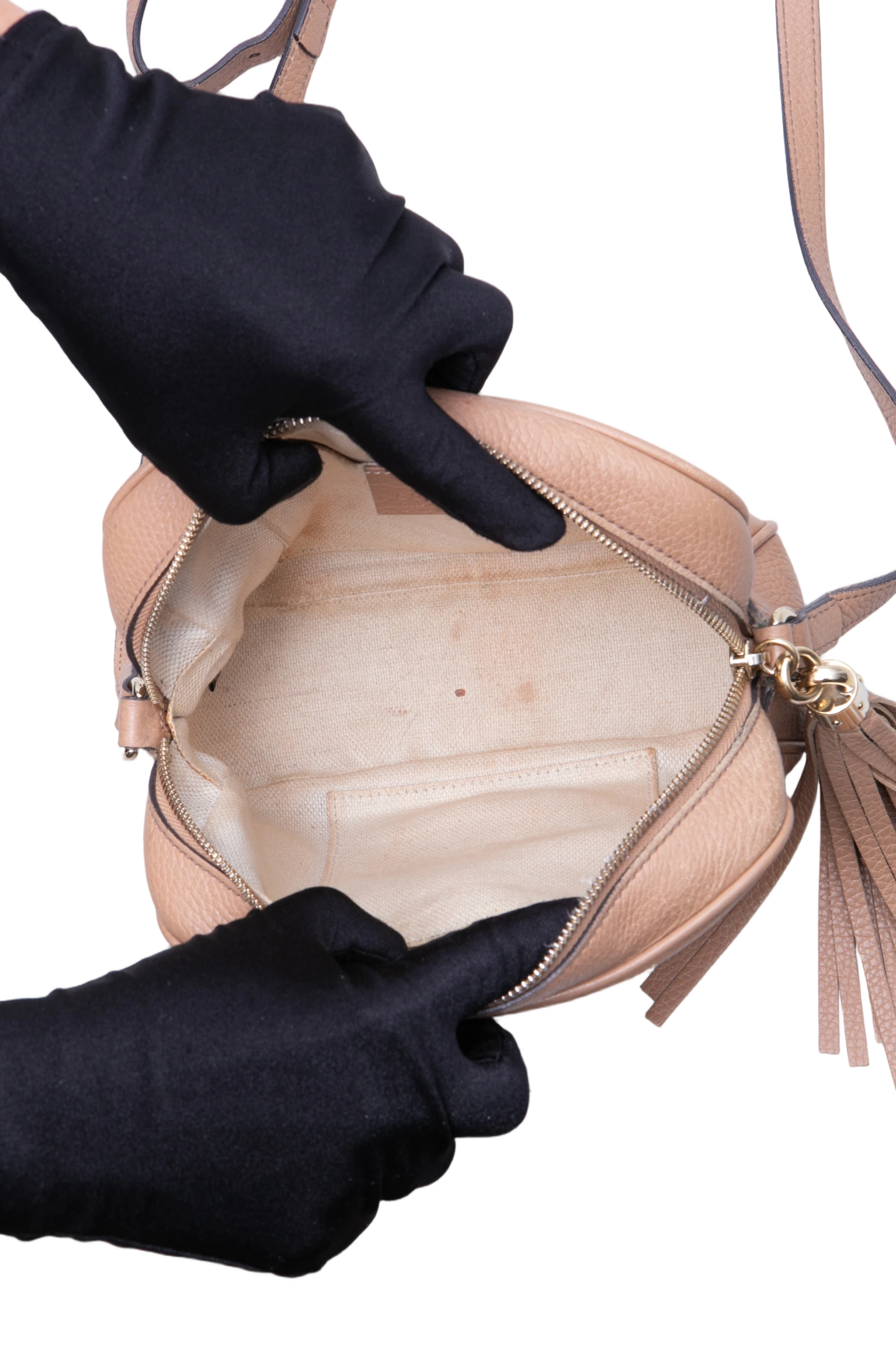 Gucci Soho Disco Camera Bag Beige. Peça em ótimo estado, possui sinais no couro, arestas e manchas no forro. Acomoda todos os tamanhos de telefone.
