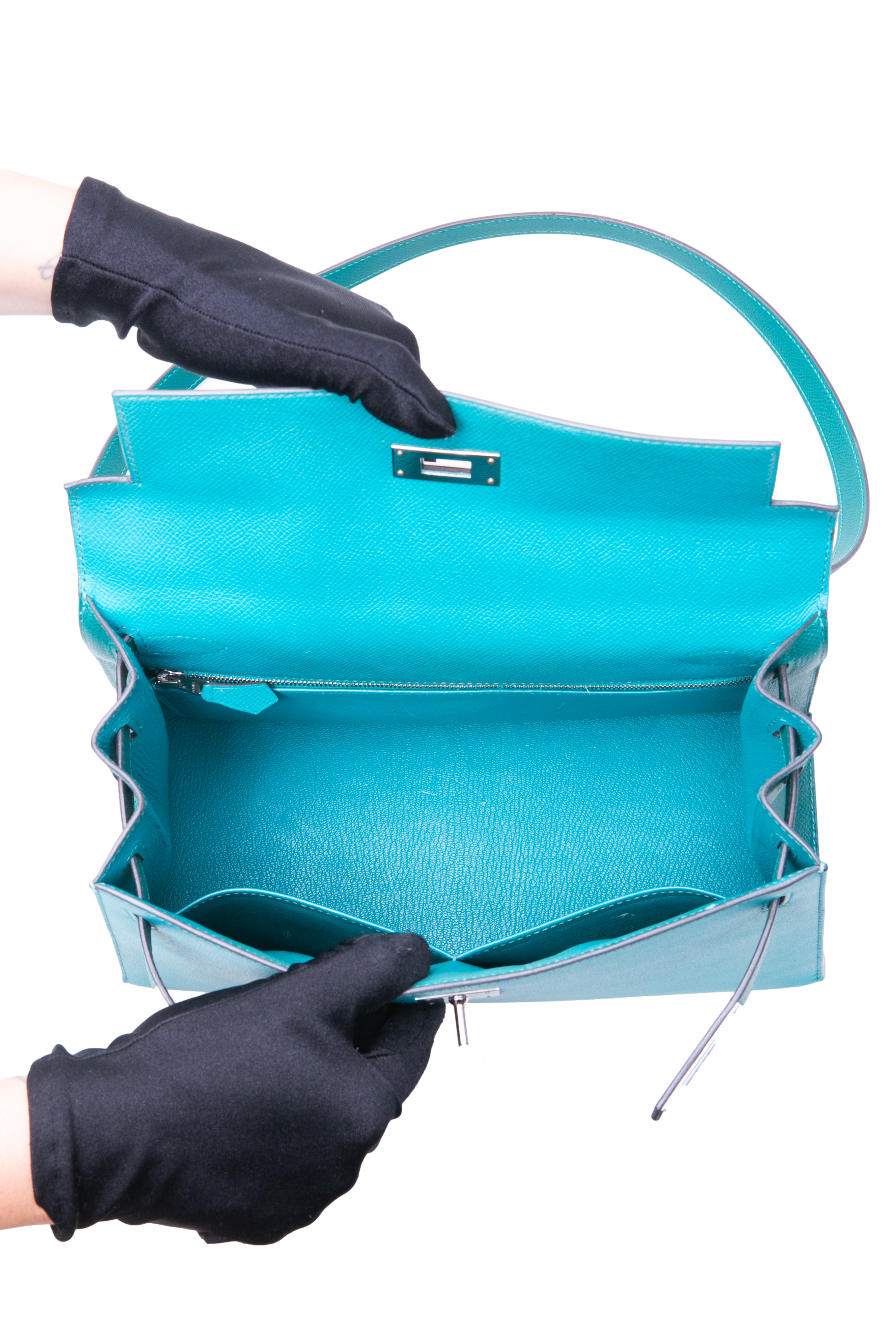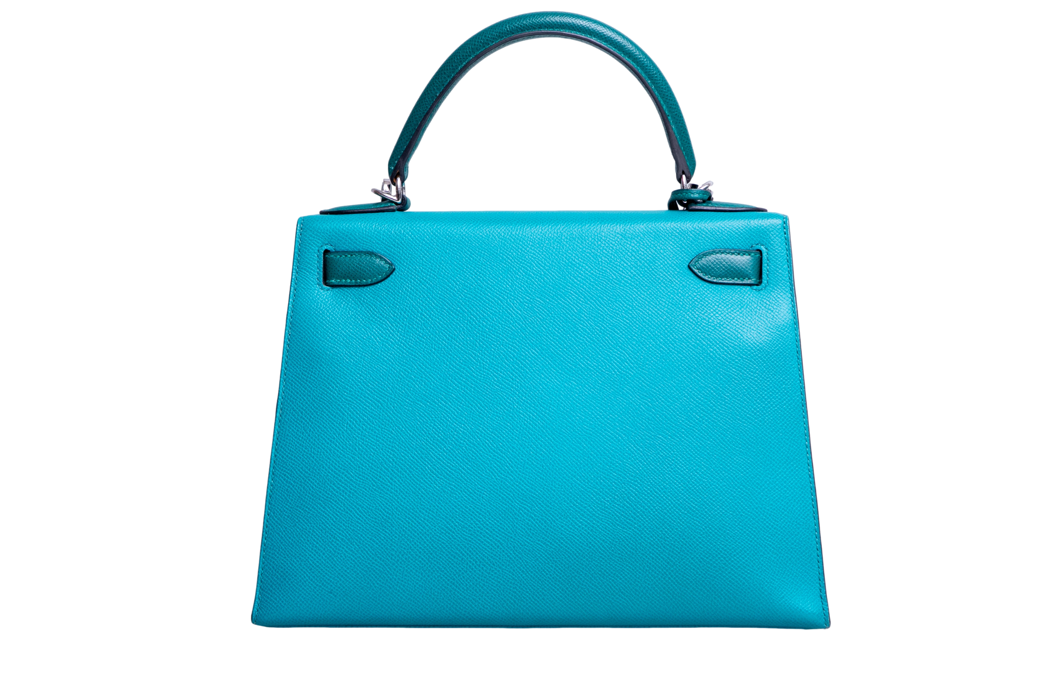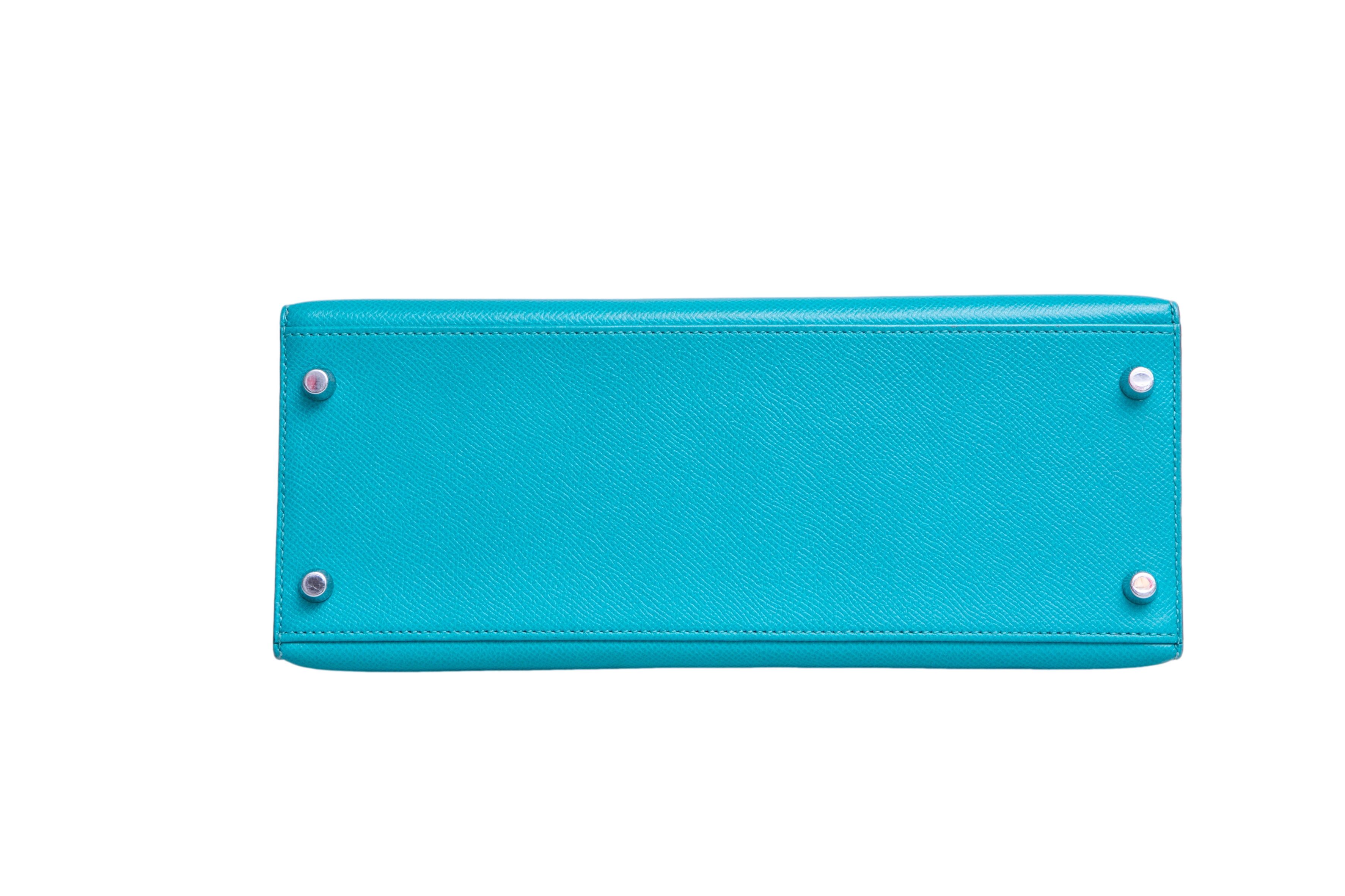 Hermès Kelly 28 Sellier Epson Bleu Paon. Peça perfeito estado, possui pequenos sinais no couro e arestas. Acomoda todos os tamanhos de telefone.