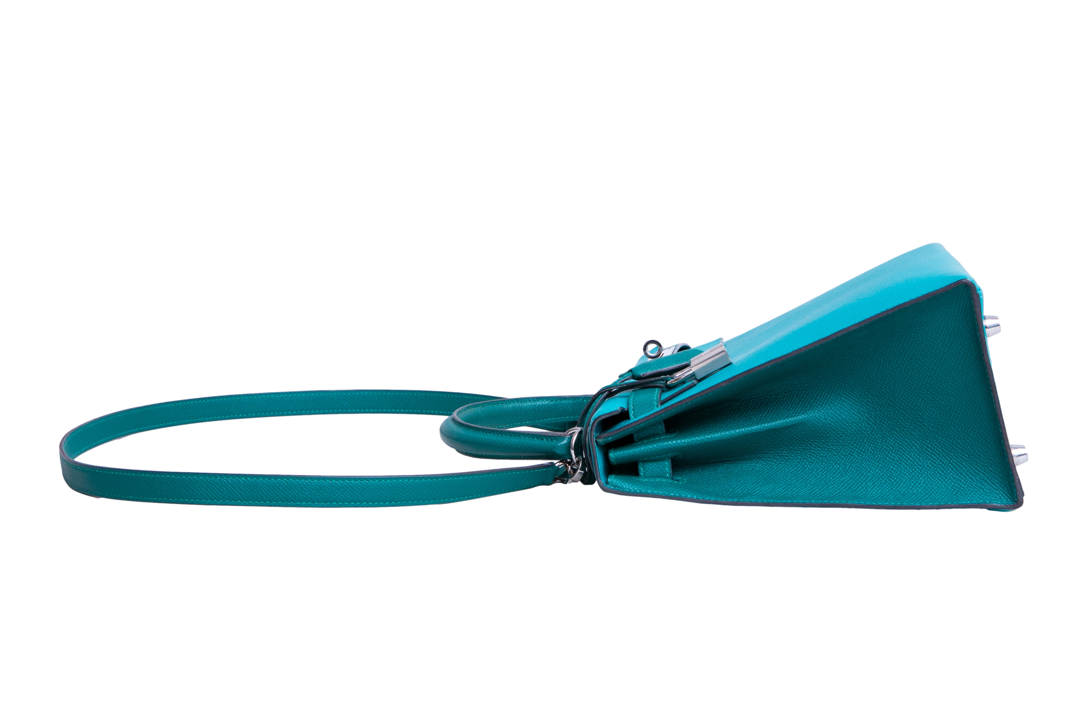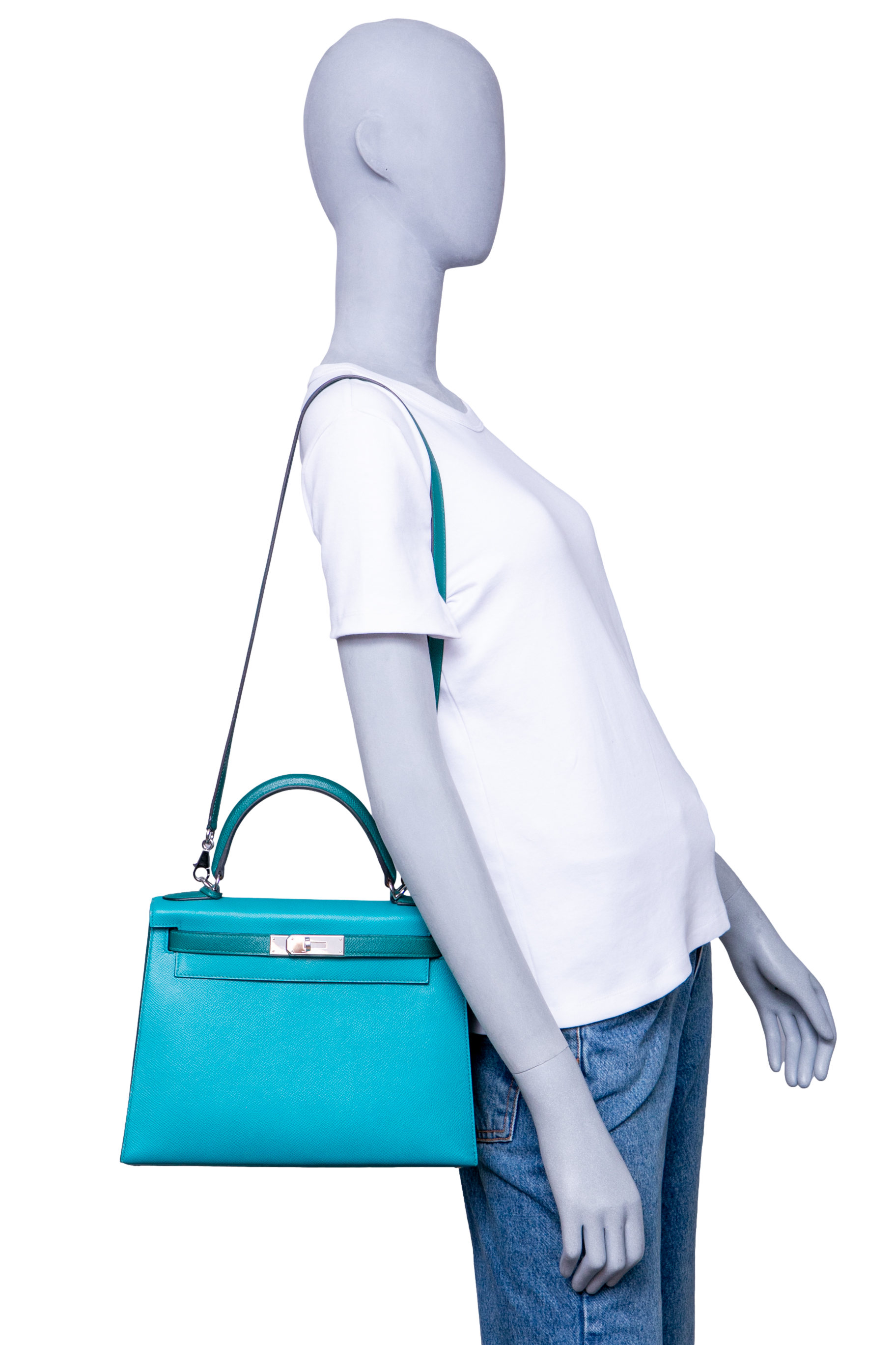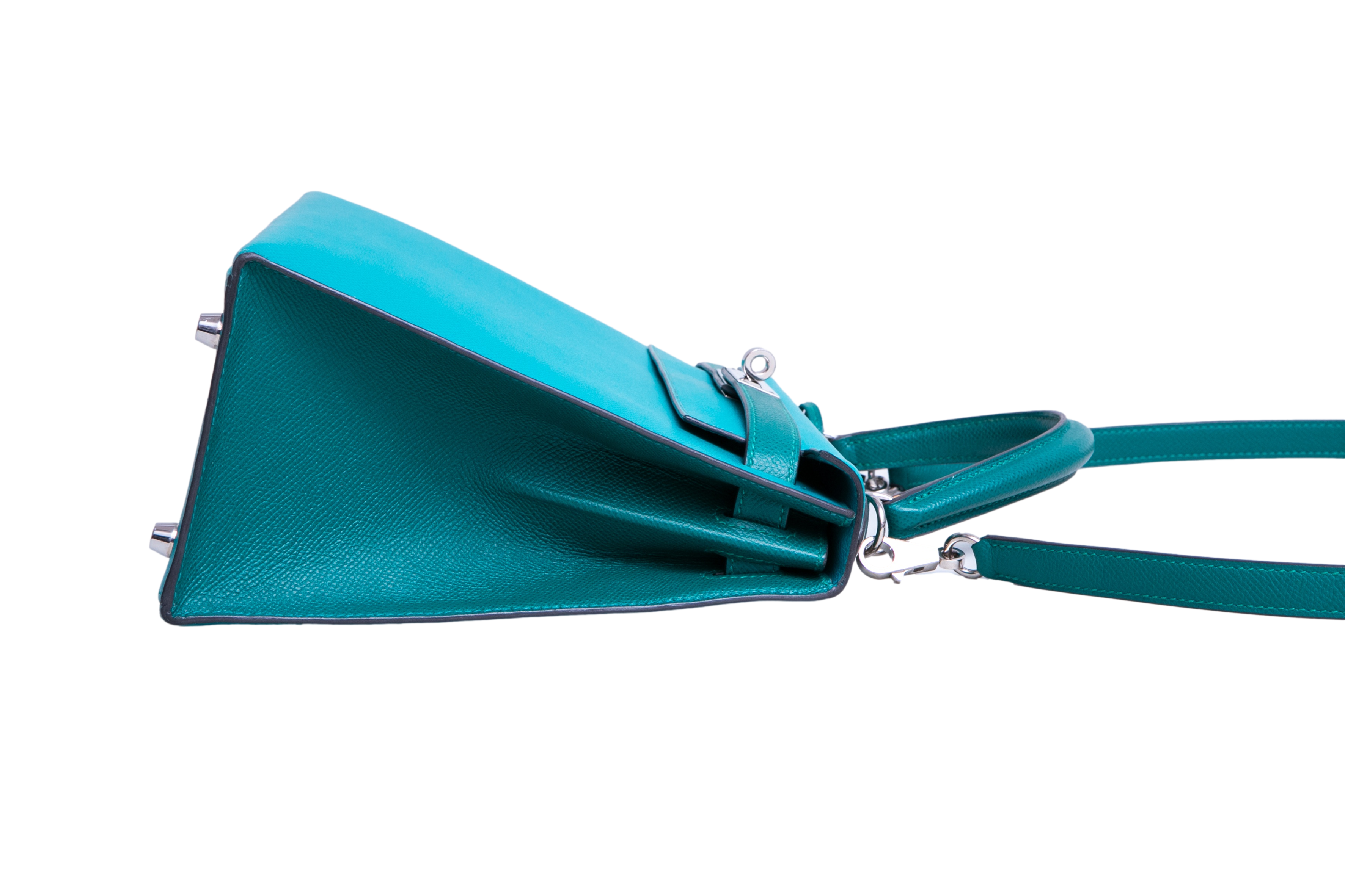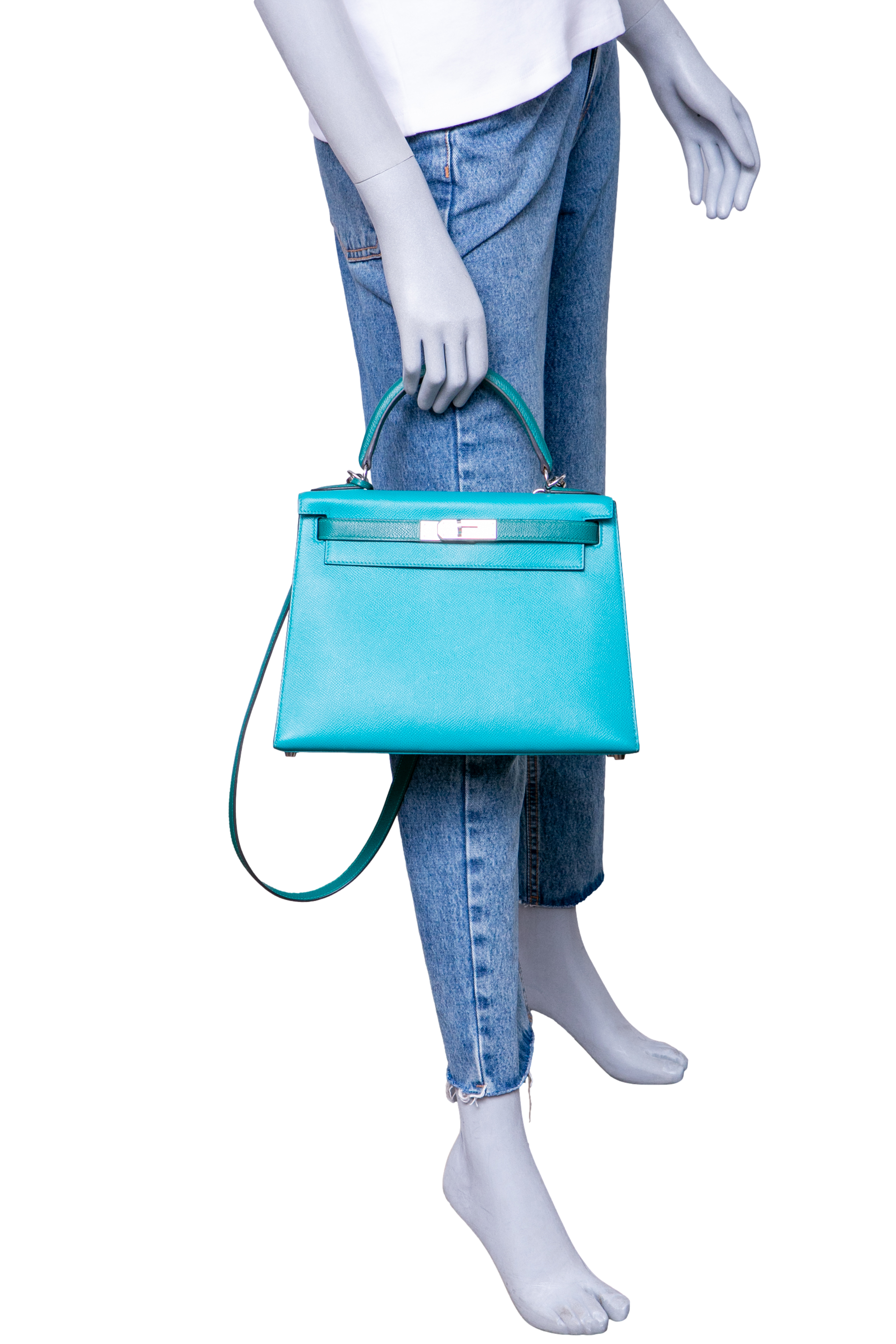 Hermès Kelly 28 Sellier Epson Bleu Paon. Peça perfeito estado, possui pequenos sinais no couro e arestas. Acomoda todos os tamanhos de telefone.