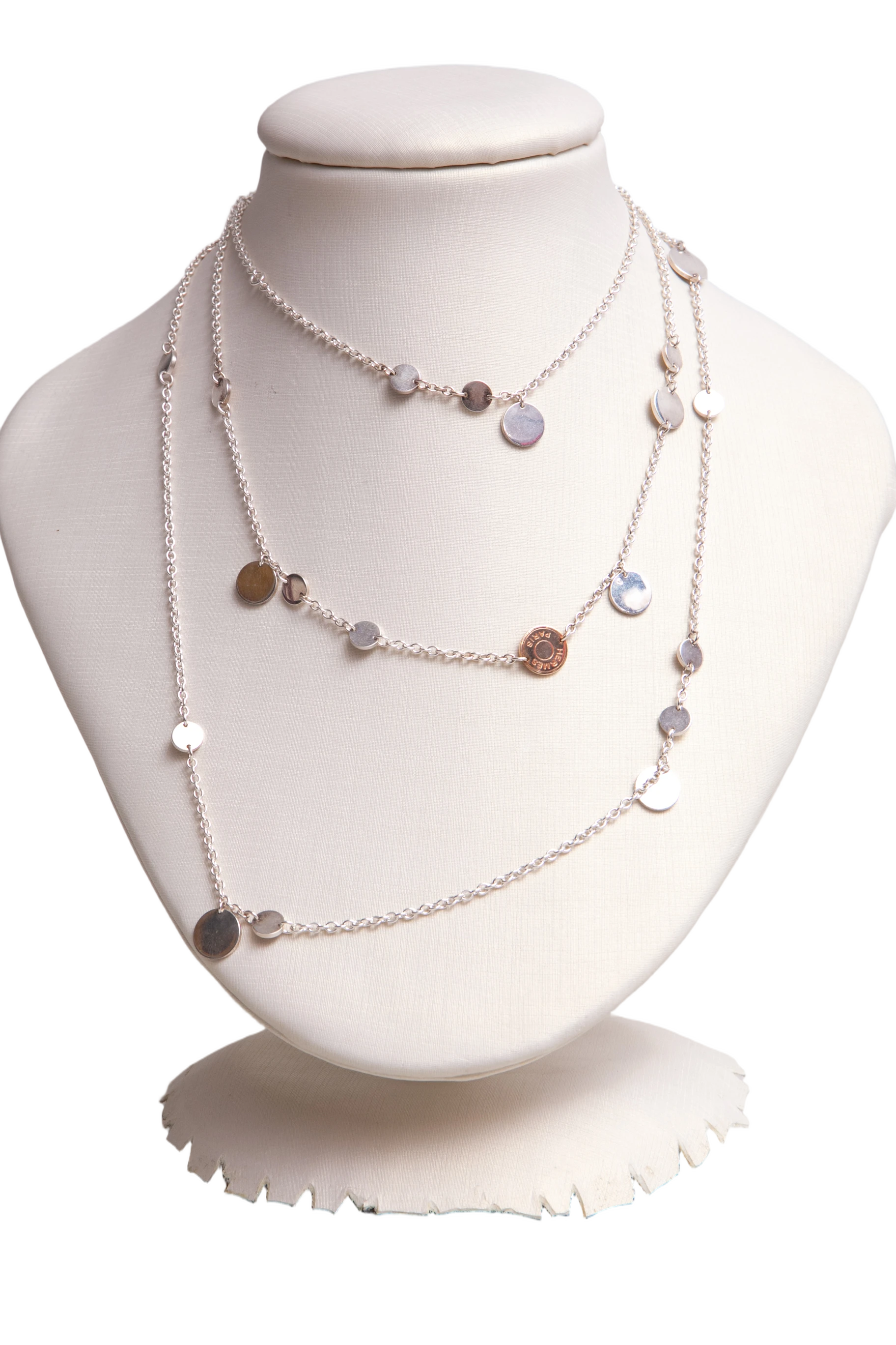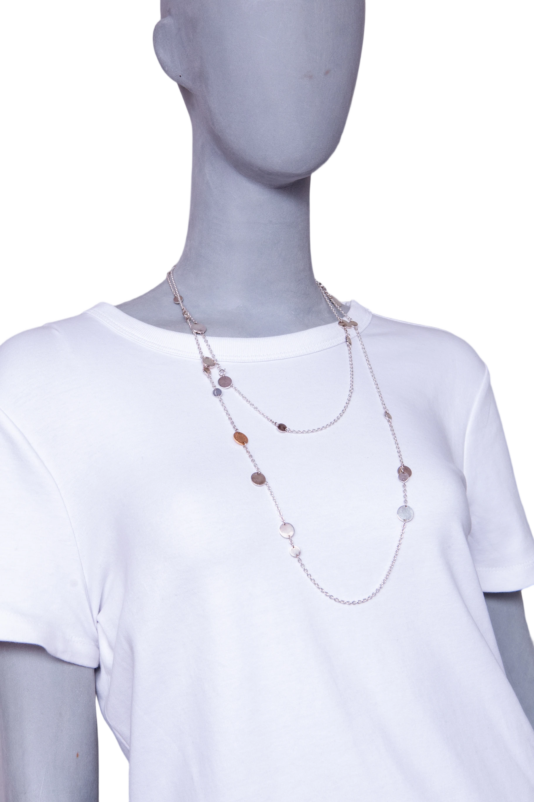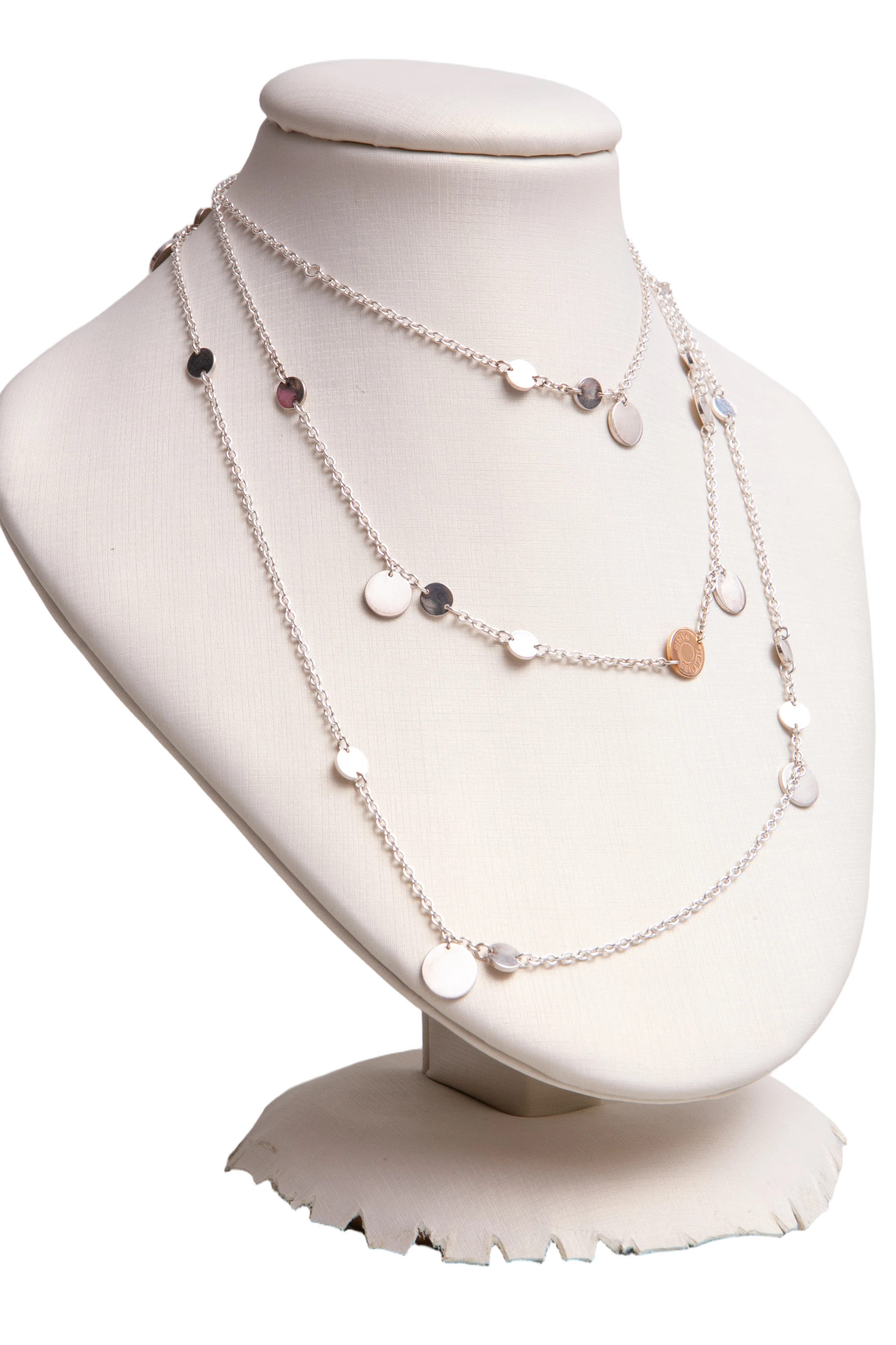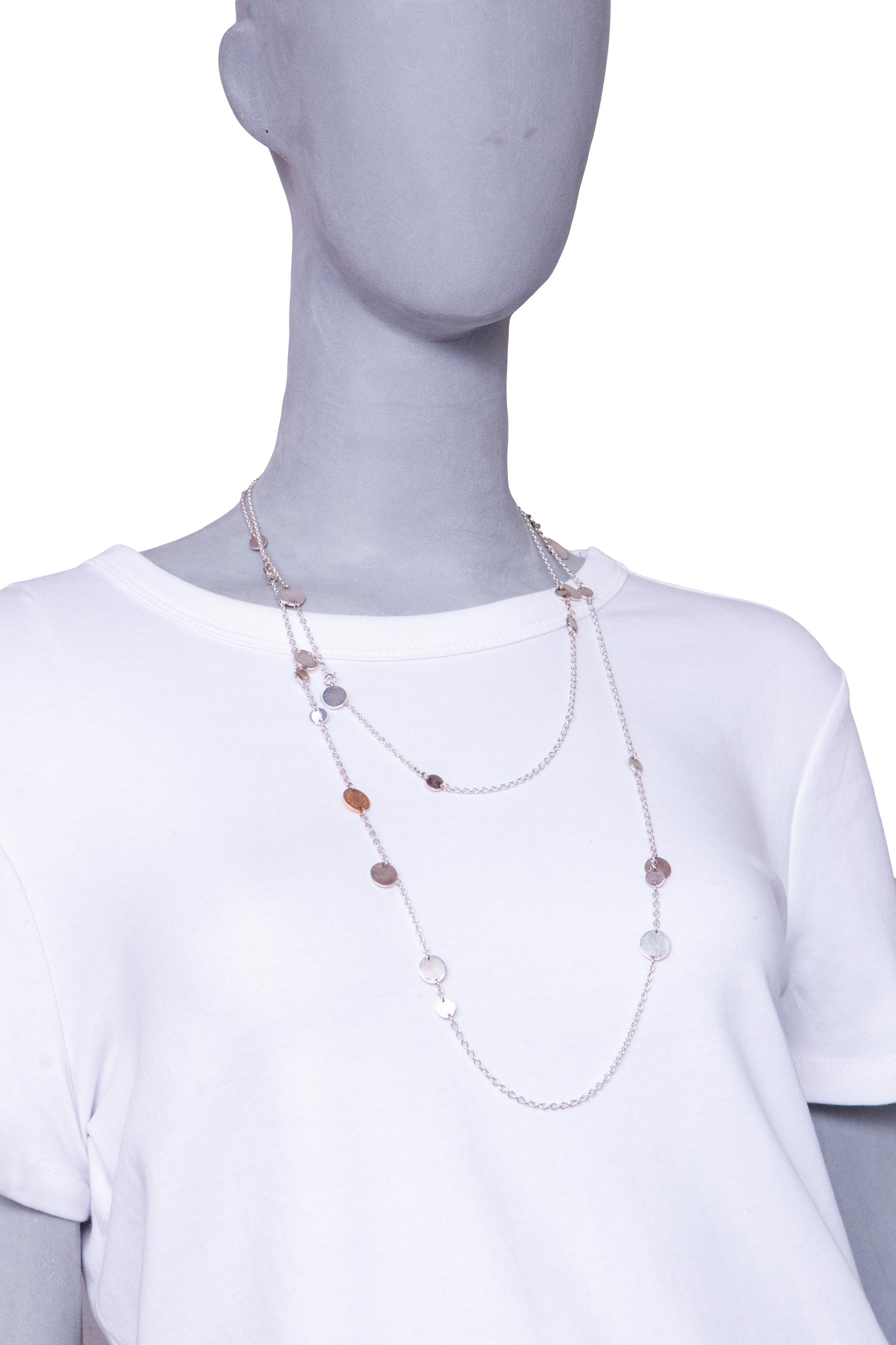 Colar confeccionado em metal prateado. Possui corrente longa com aplicação de pequenos discos metálicos ao longo do comprimento.