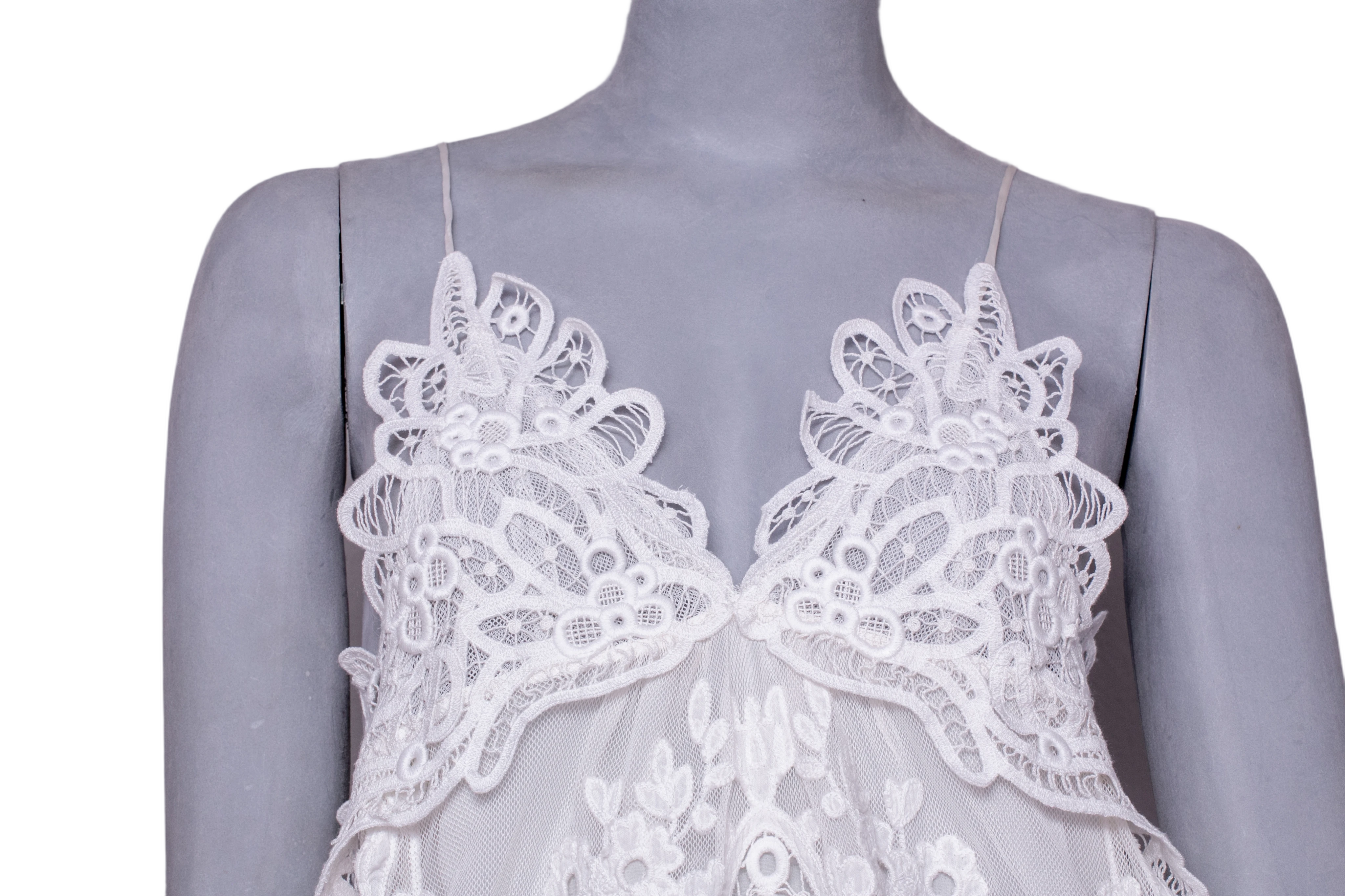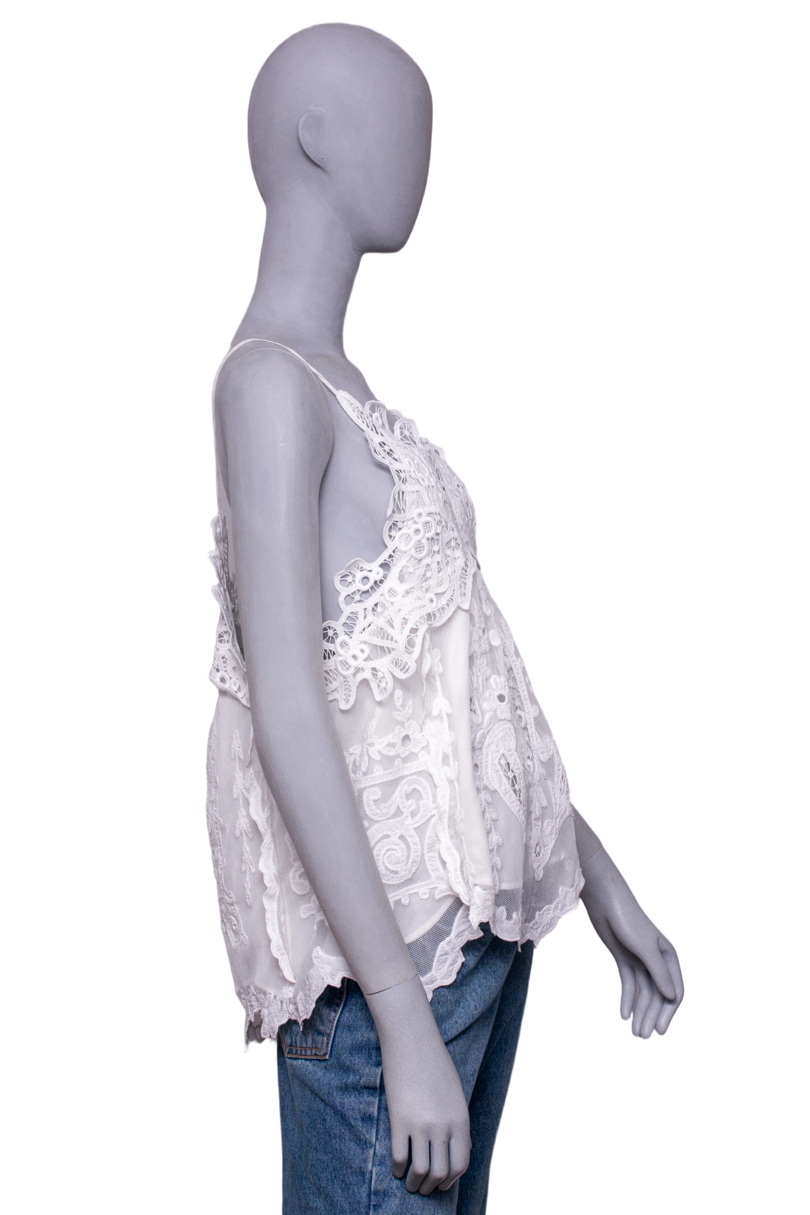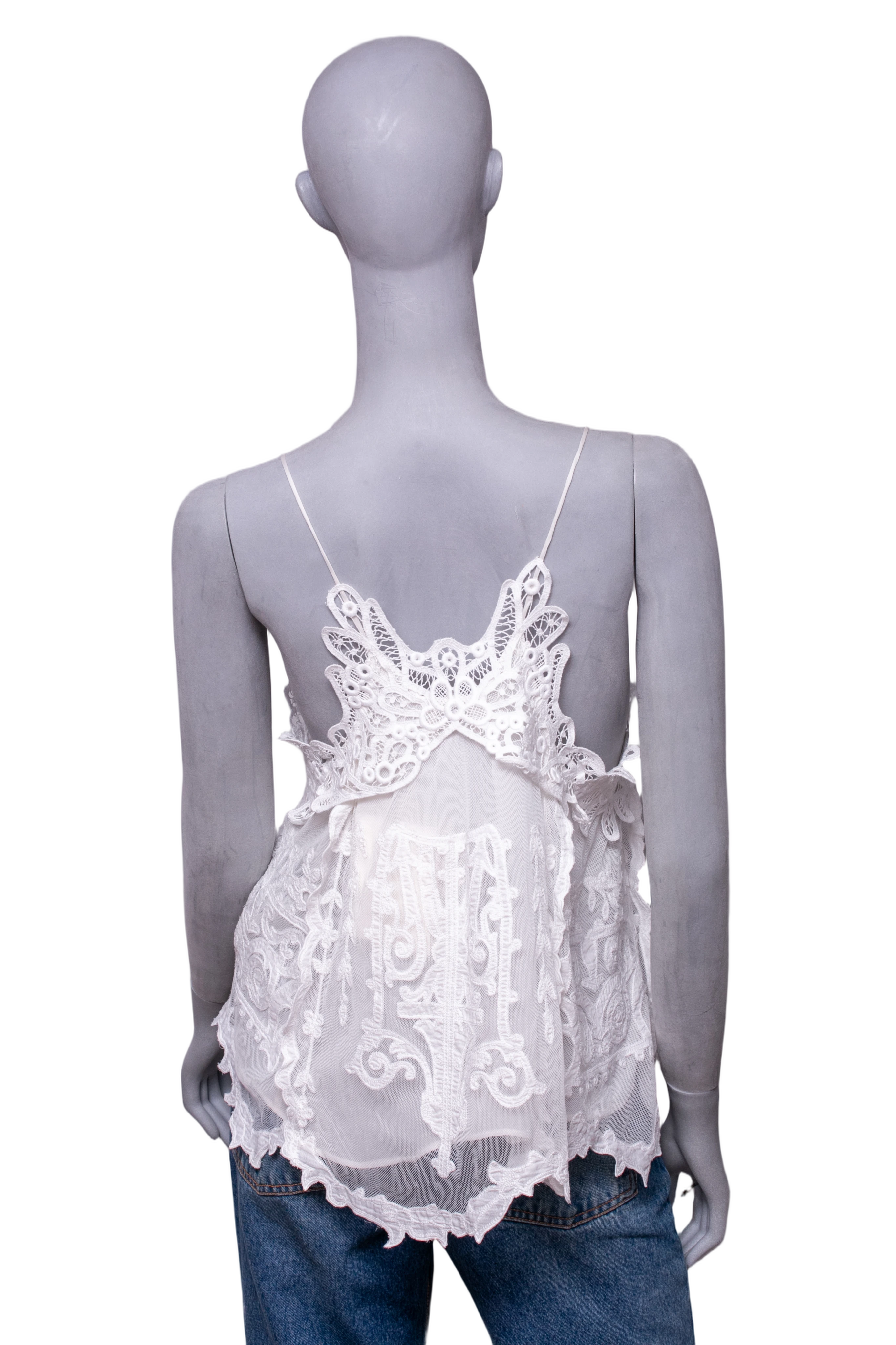 Regata em tule branco com renda aplicada, apresentando alças finas. A peça traz detalhes florais elaborados e recortes delicados com caimento fluido.