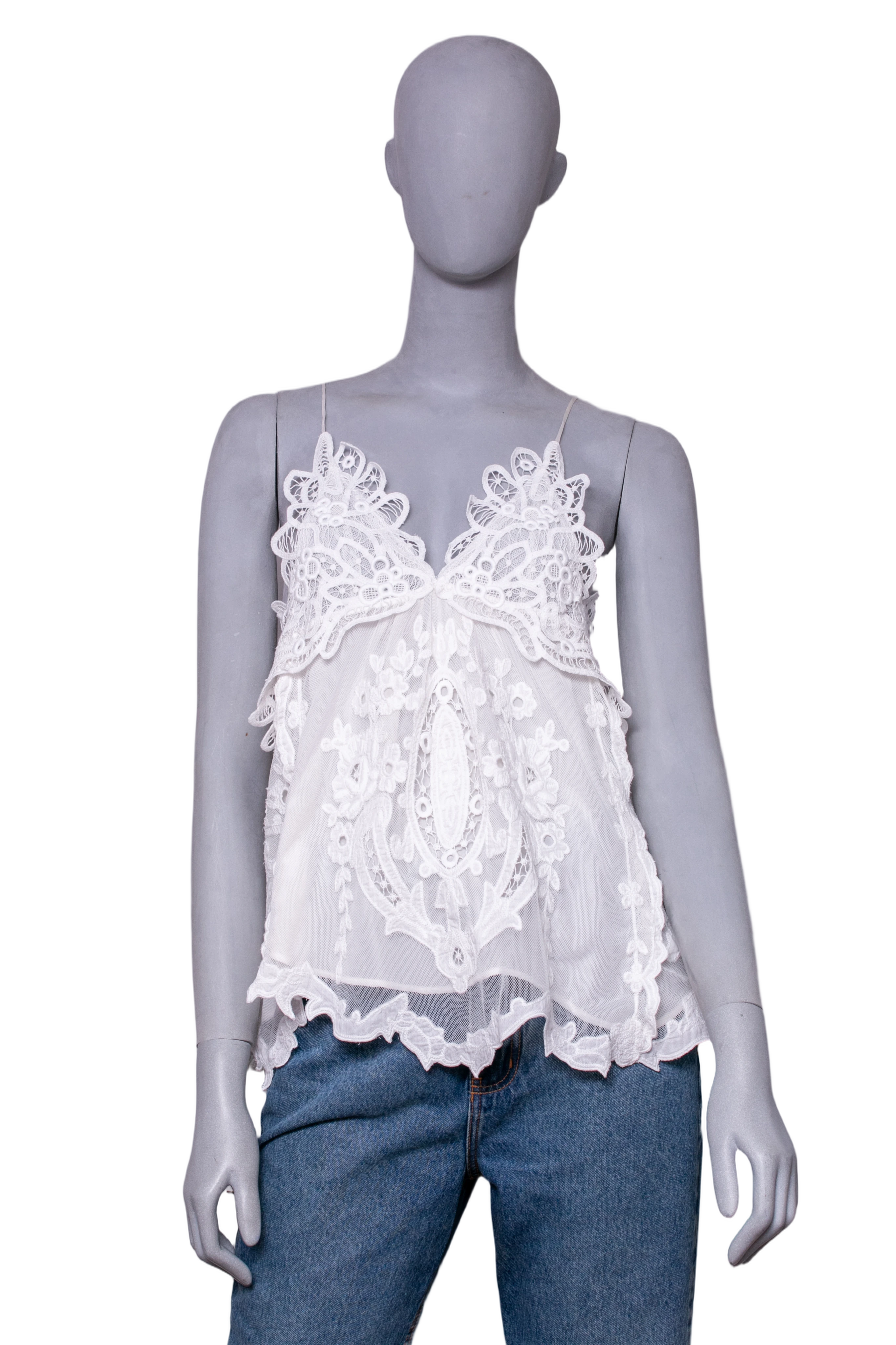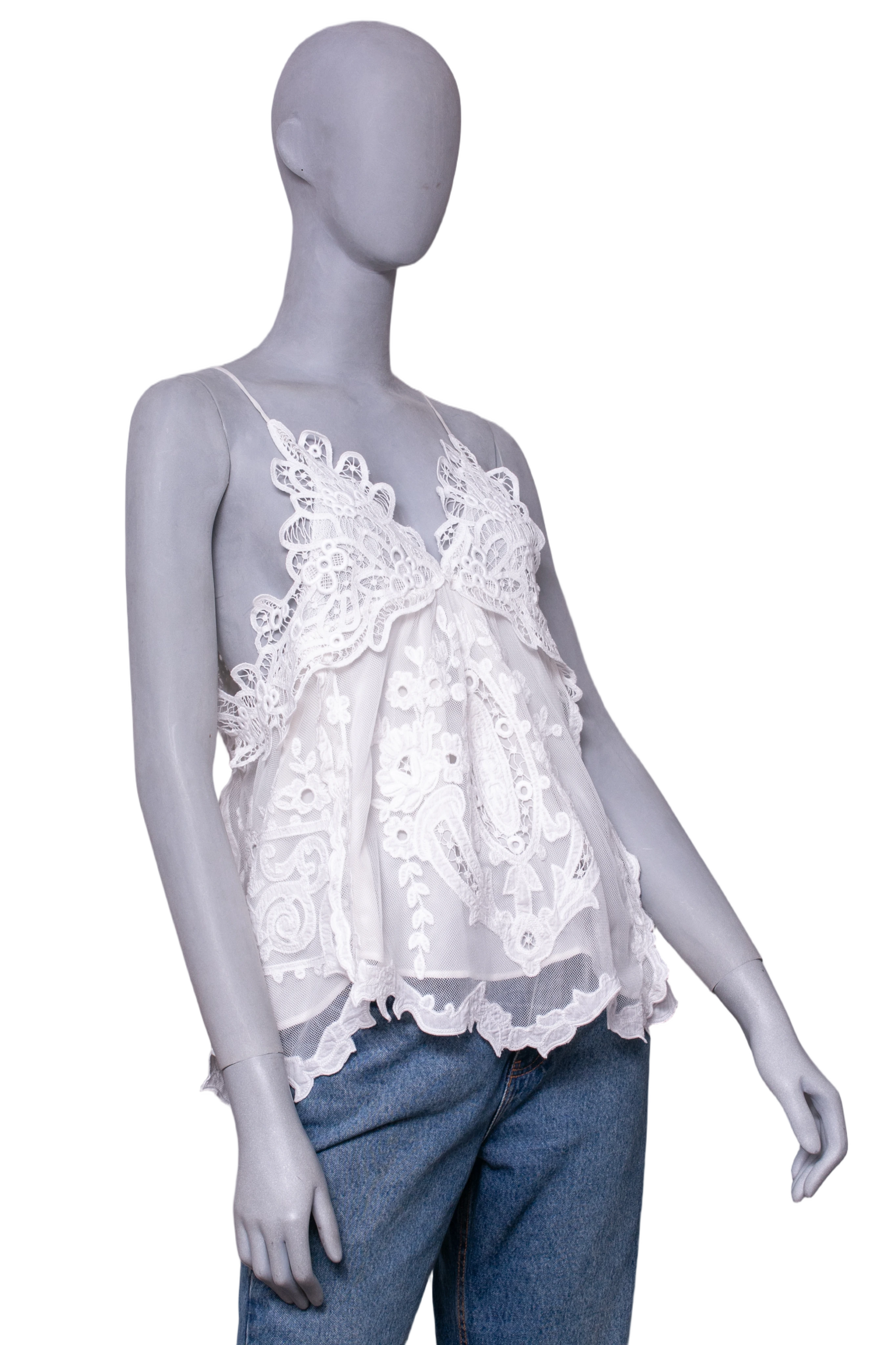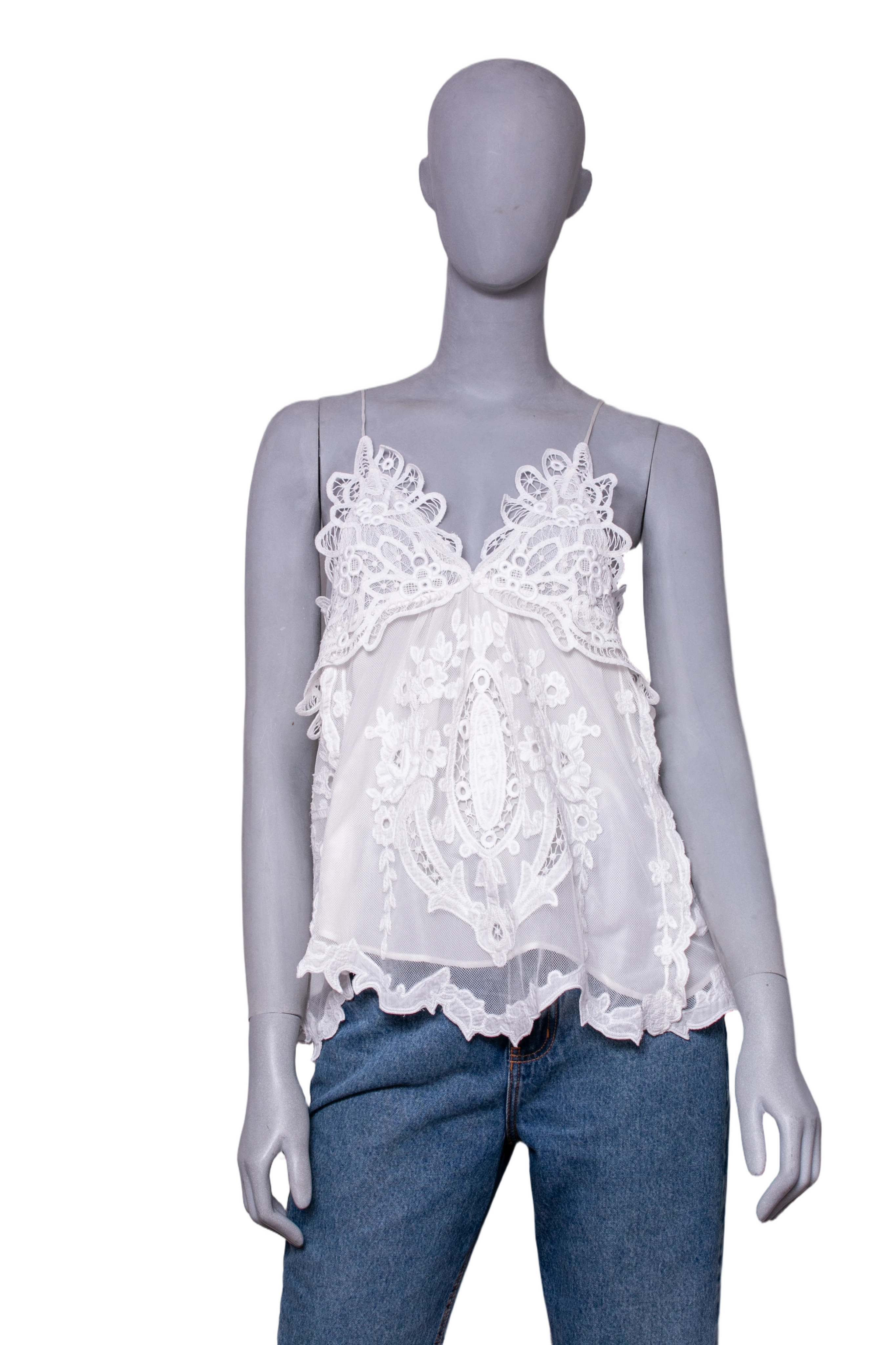 Regata em tule branco com renda aplicada, apresentando alças finas. A peça traz detalhes florais elaborados e recortes delicados com caimento fluido.