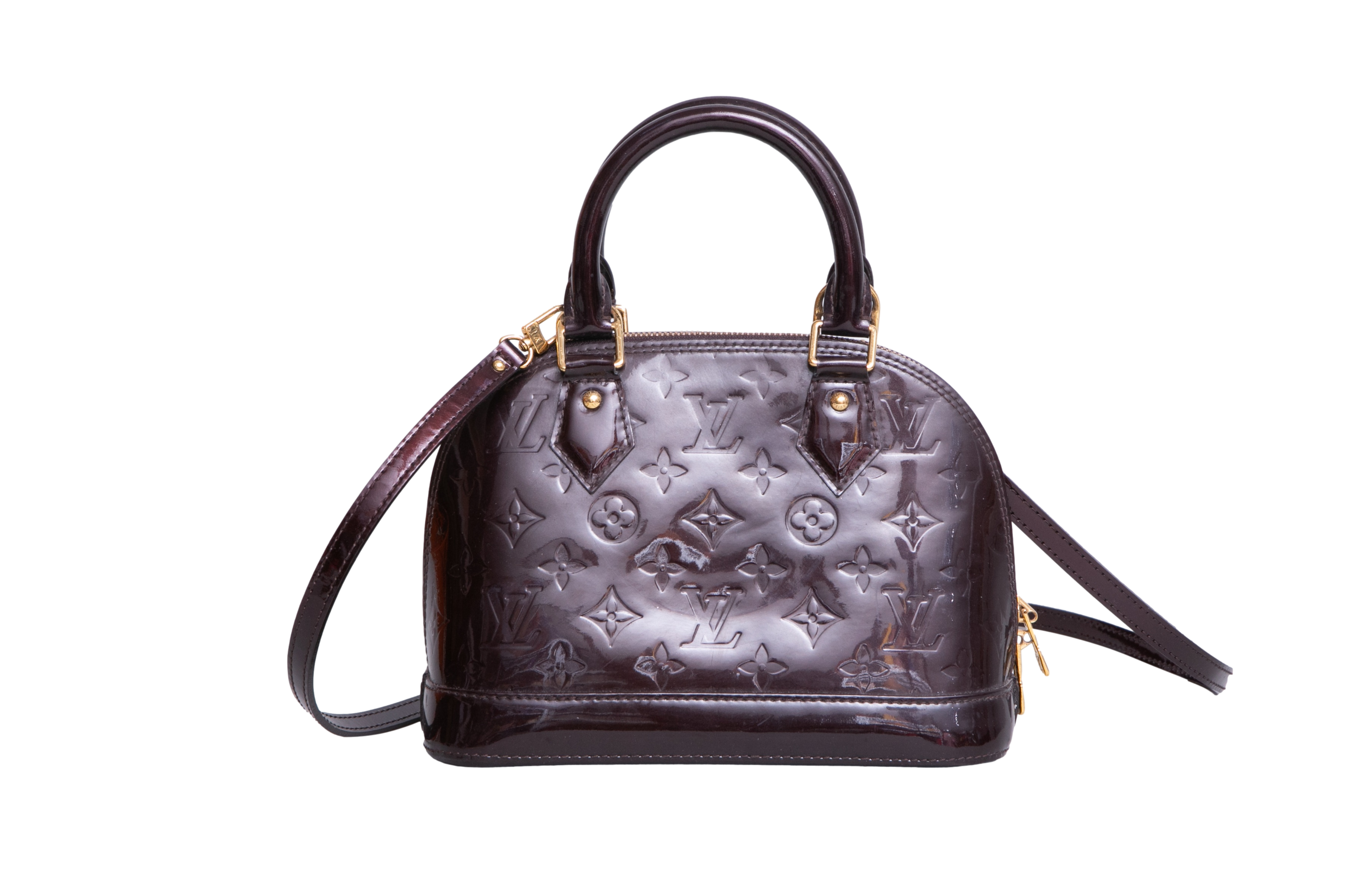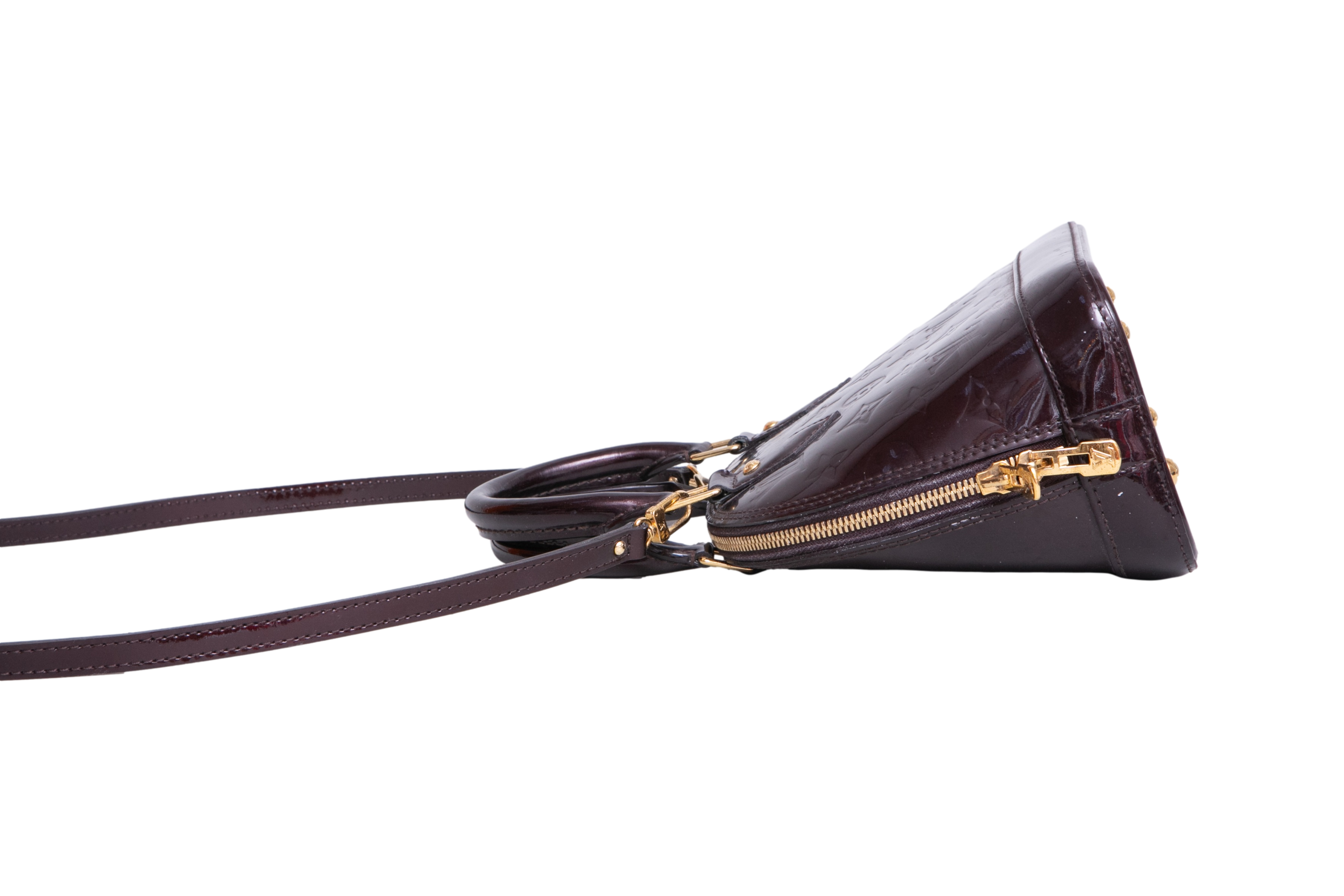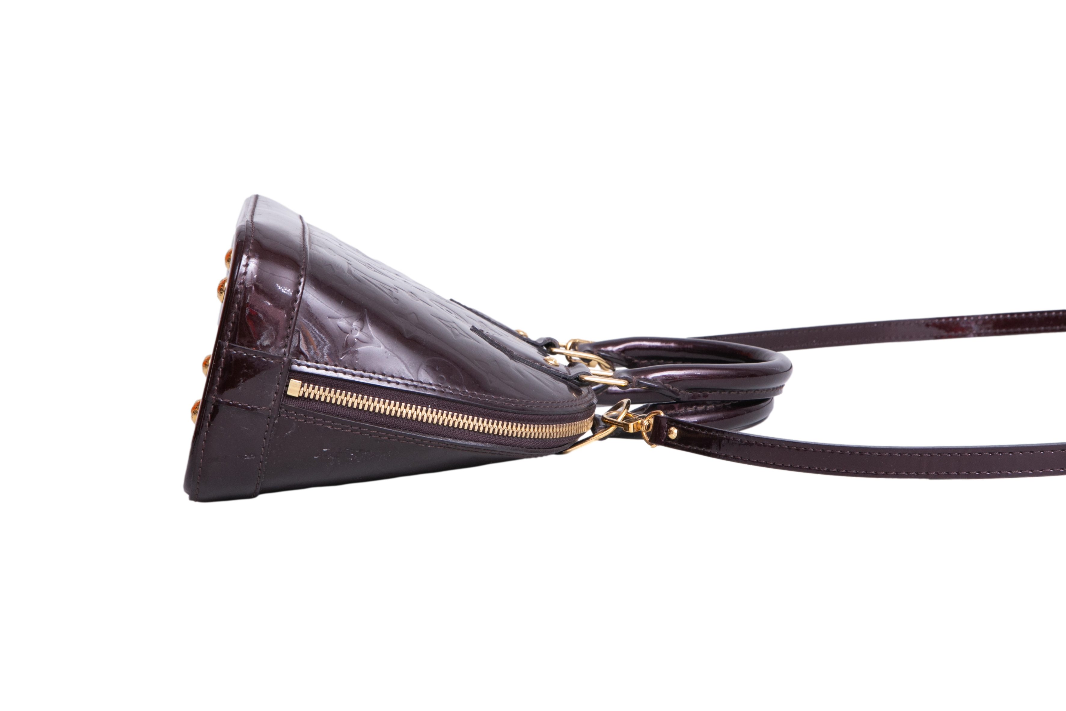 Bolsa modelo Handbag confeccionada em couro verniz Monogram na cor Amarante, um tom de bordô escuro com acabamento glossy. O modelo é um dos mais clássicos da Louis Vuitton, é conhecido por sua silhueta estruturada, base rígida, fechamento em zíper duplo e alças de mão arredondadas. Possui ferragens douradas e acompanha alça longa removível para uso transversal, sendo um modelo estruturado e compacto, ideal para o dia a dia e ocasiões especiais.