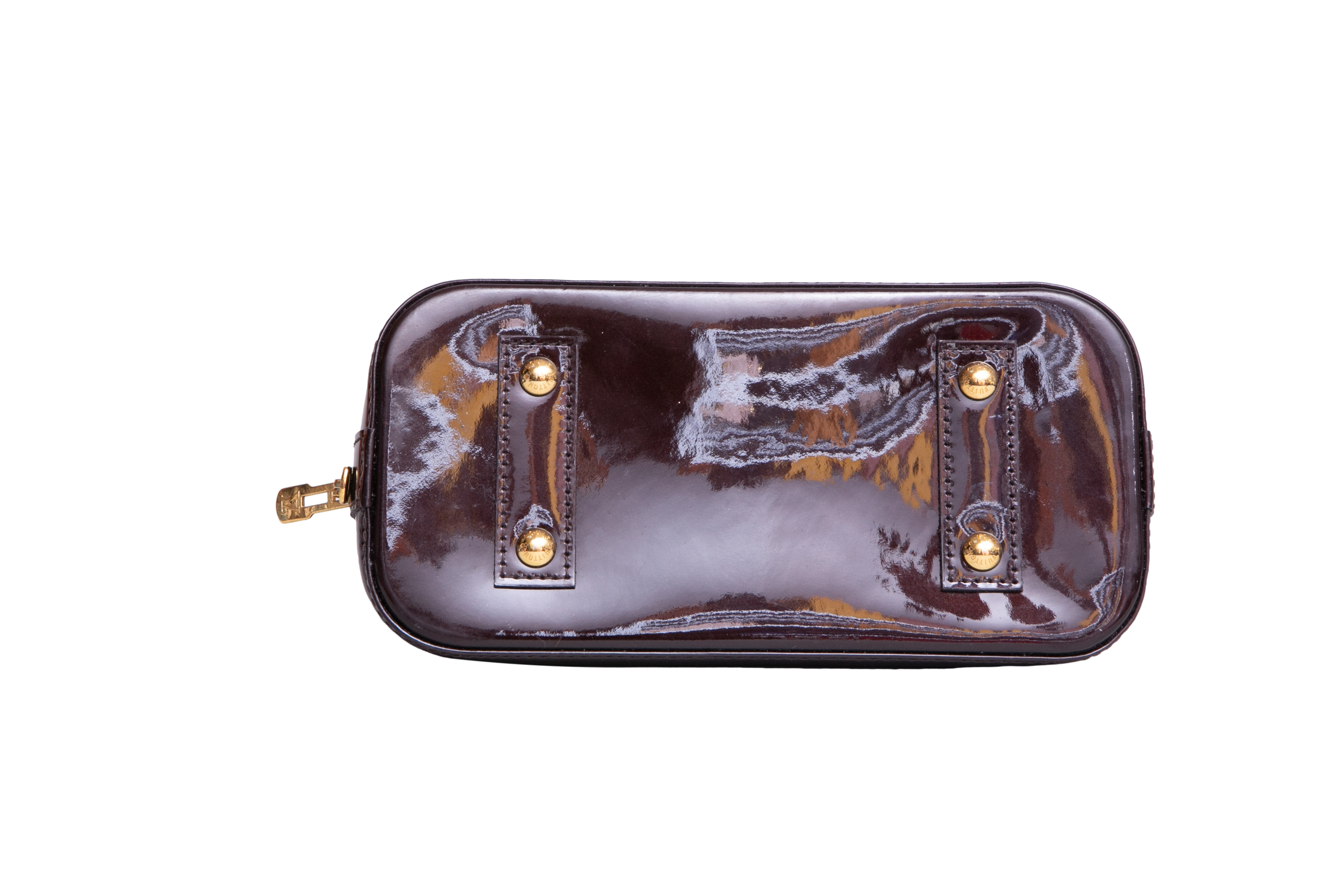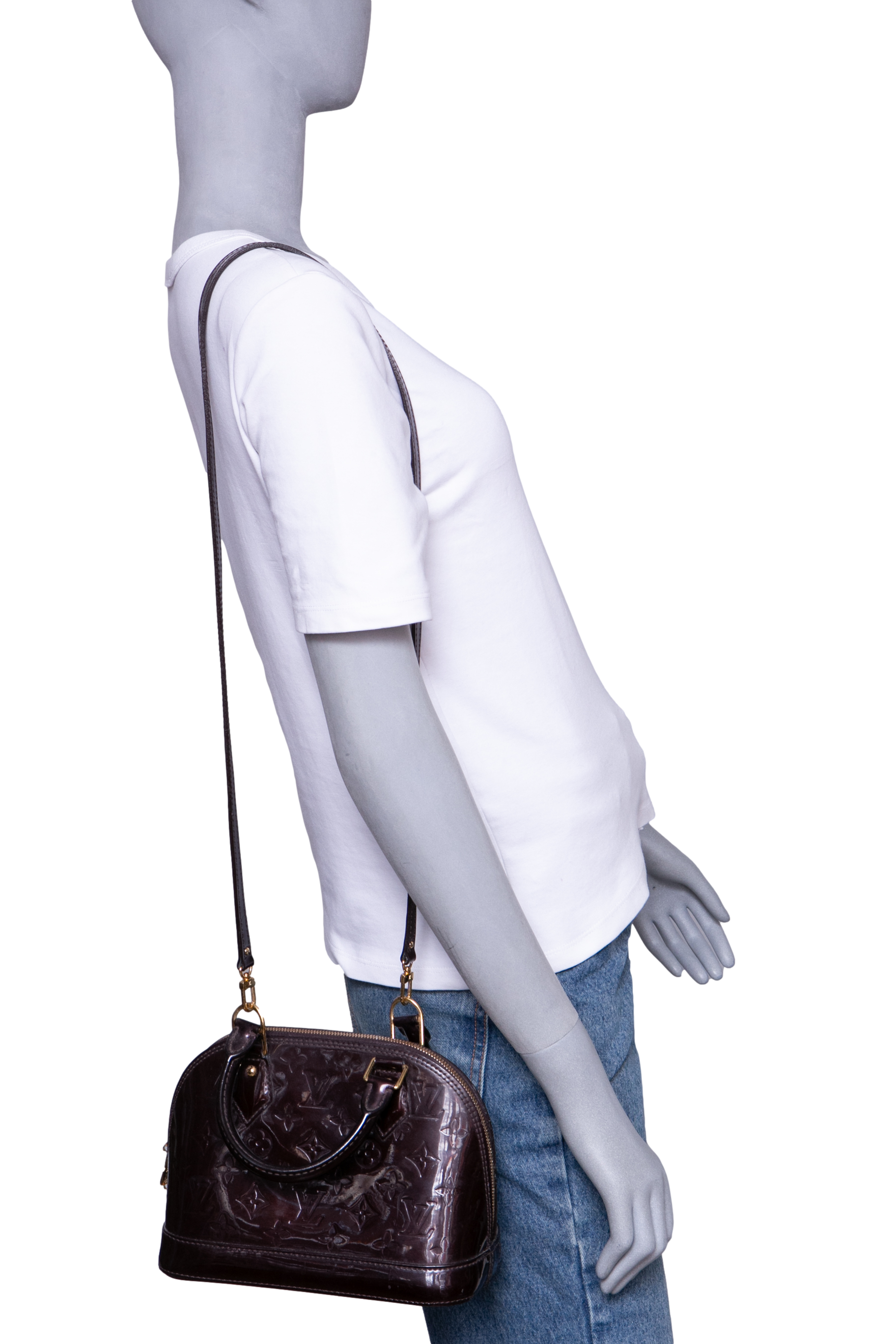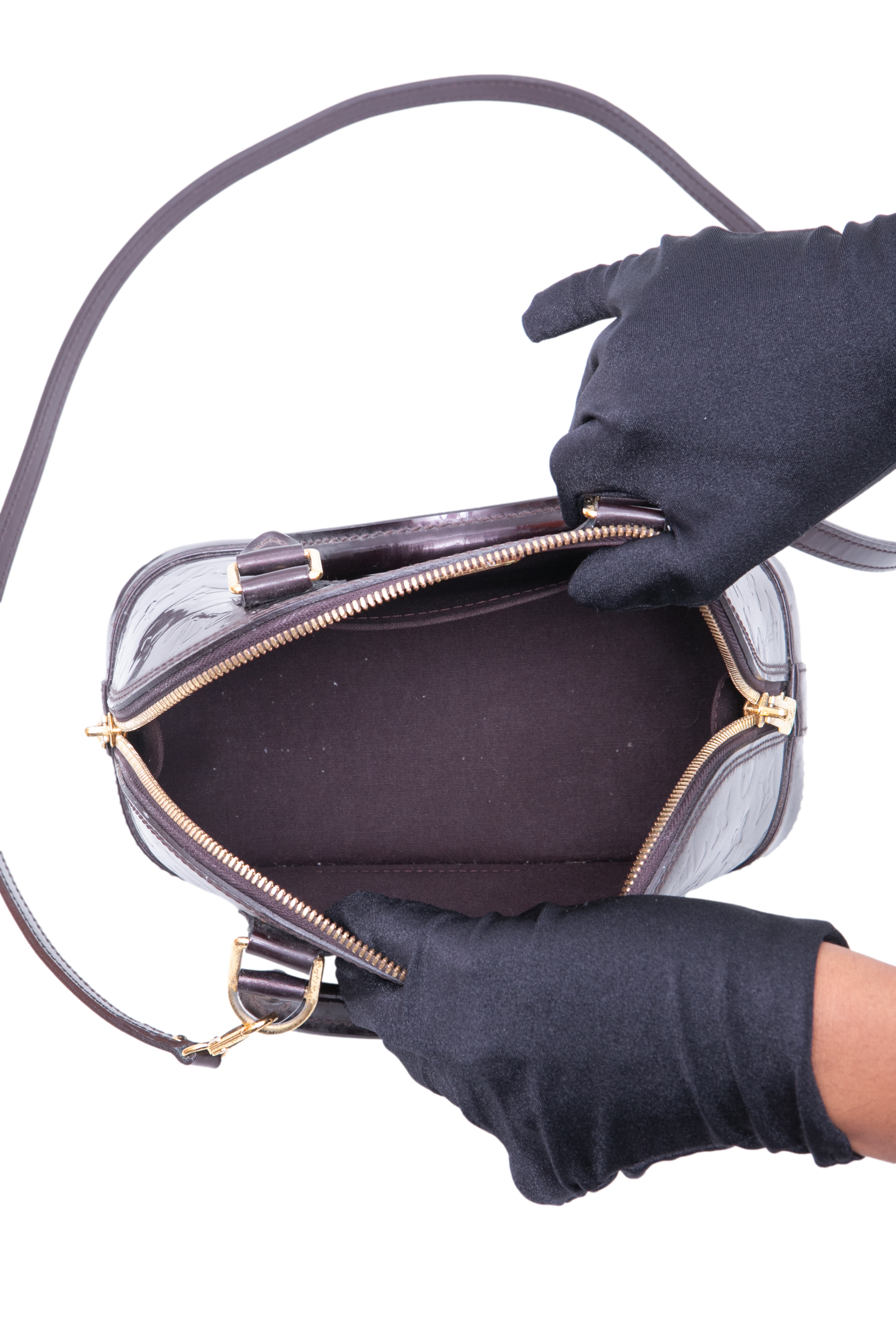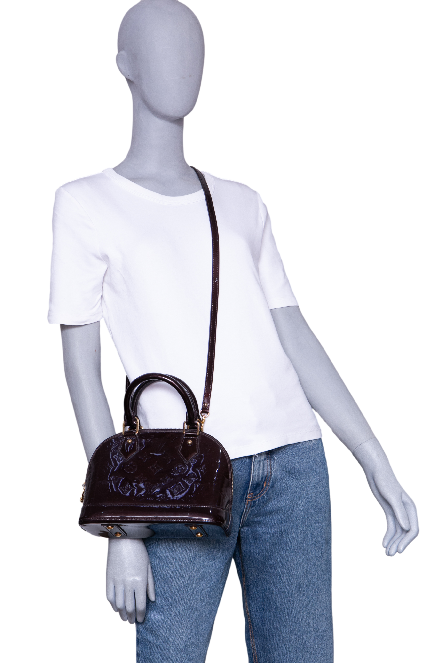 Bolsa modelo Handbag confeccionada em couro verniz Monogram na cor Amarante, um tom de bordô escuro com acabamento glossy. O modelo é um dos mais clássicos da Louis Vuitton, é conhecido por sua silhueta estruturada, base rígida, fechamento em zíper duplo e alças de mão arredondadas. Possui ferragens douradas e acompanha alça longa removível para uso transversal, sendo um modelo estruturado e compacto, ideal para o dia a dia e ocasiões especiais.