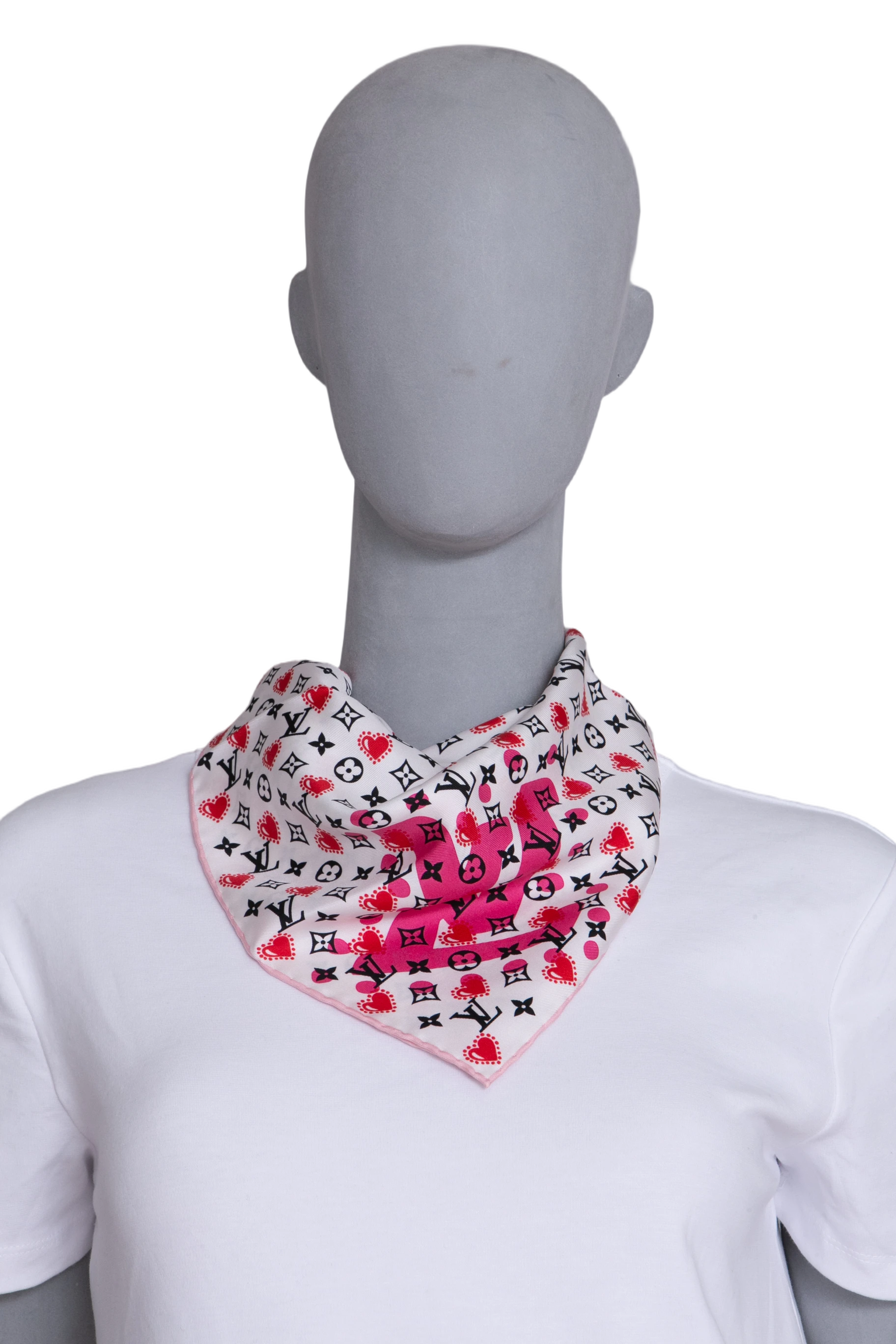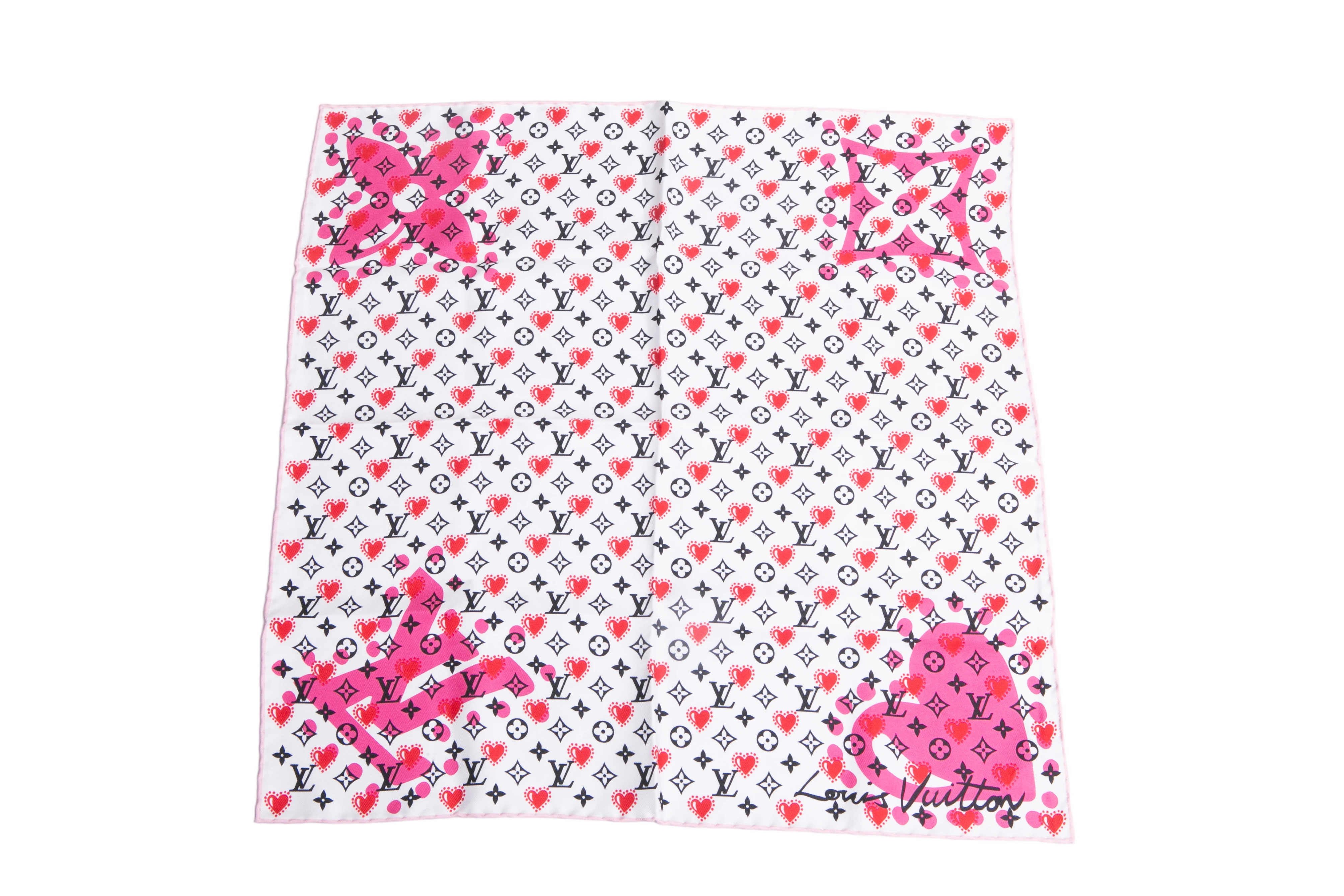Lenço quadrado na cor branco e acabamento rosa claro, com monograma LV estampado e corações vermelhos.