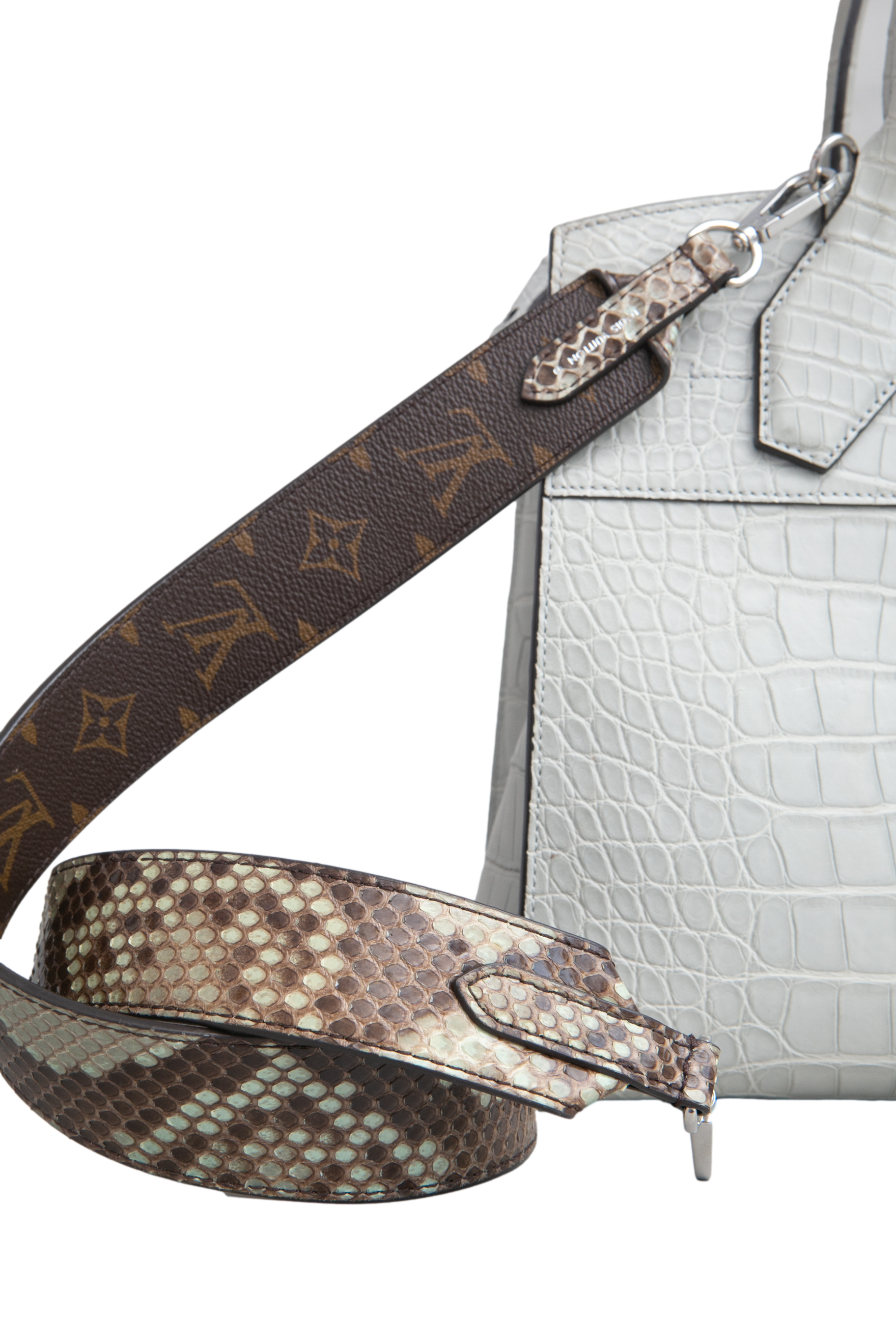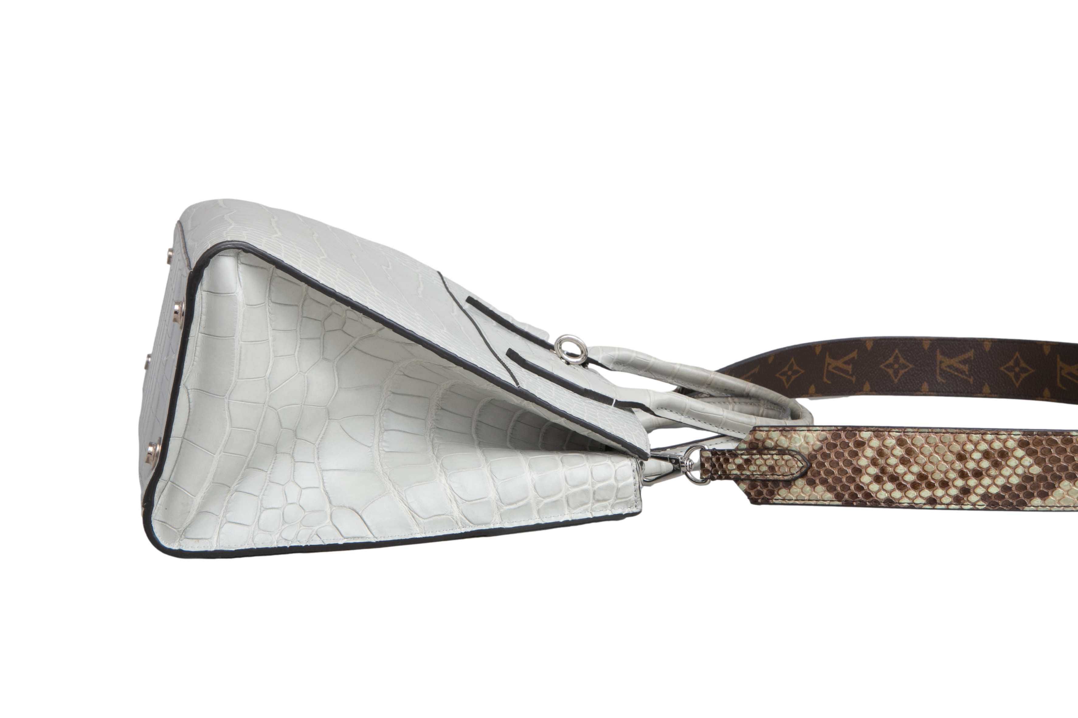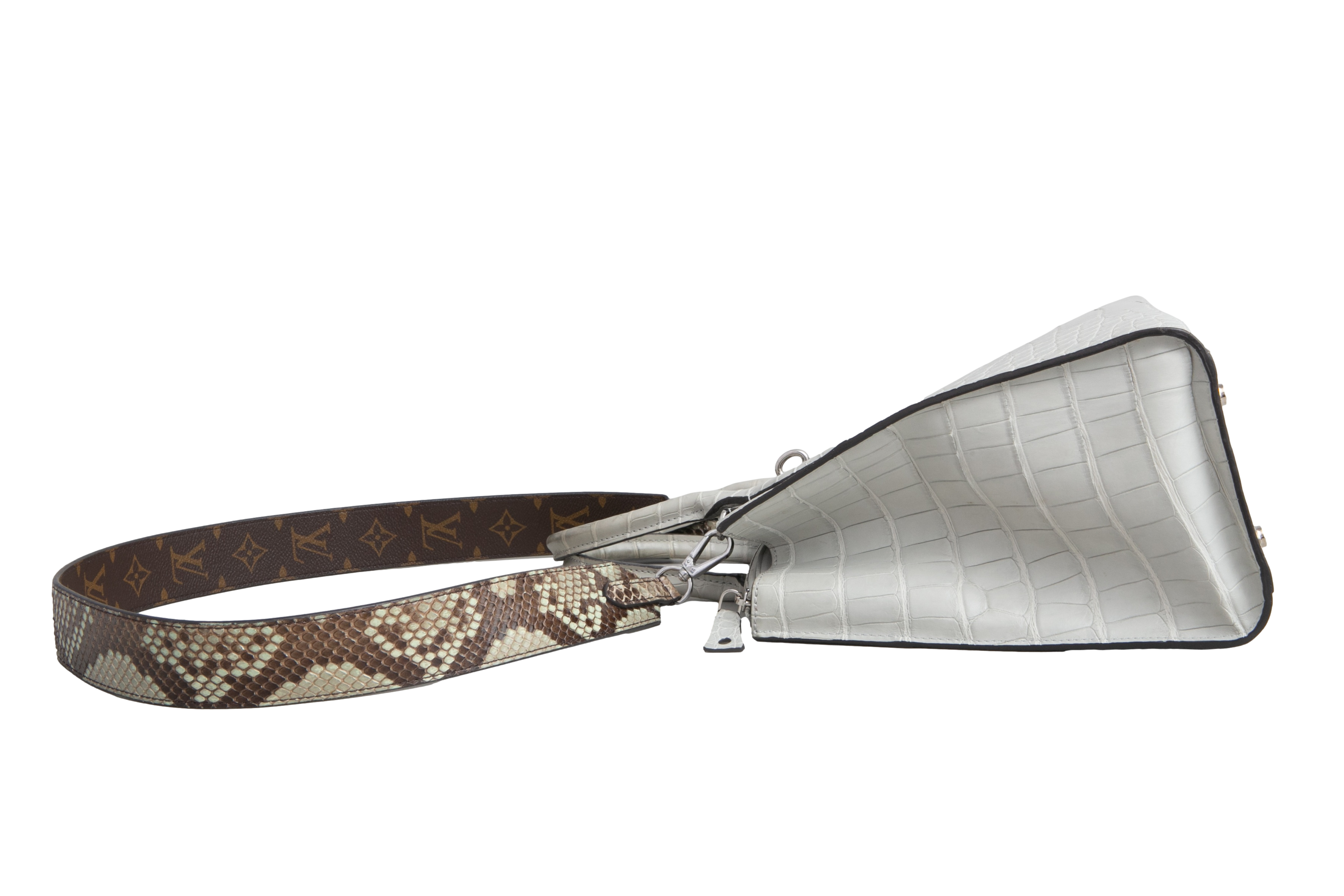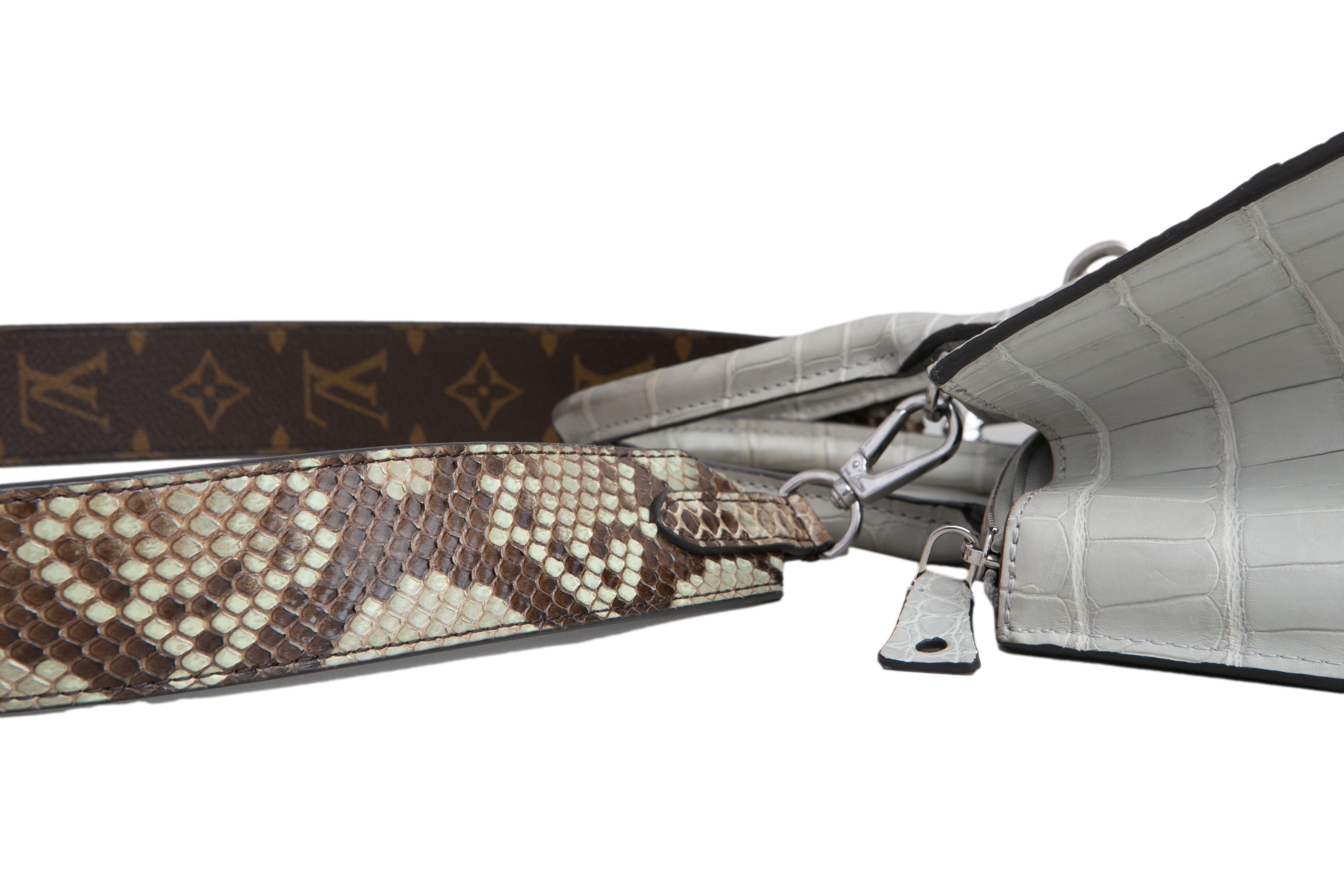 Bolsa em couro croco na cor cinza claro, possui alça longa com estampas em monograma LV e Python, para uso shoulder, crossbody e handle bag