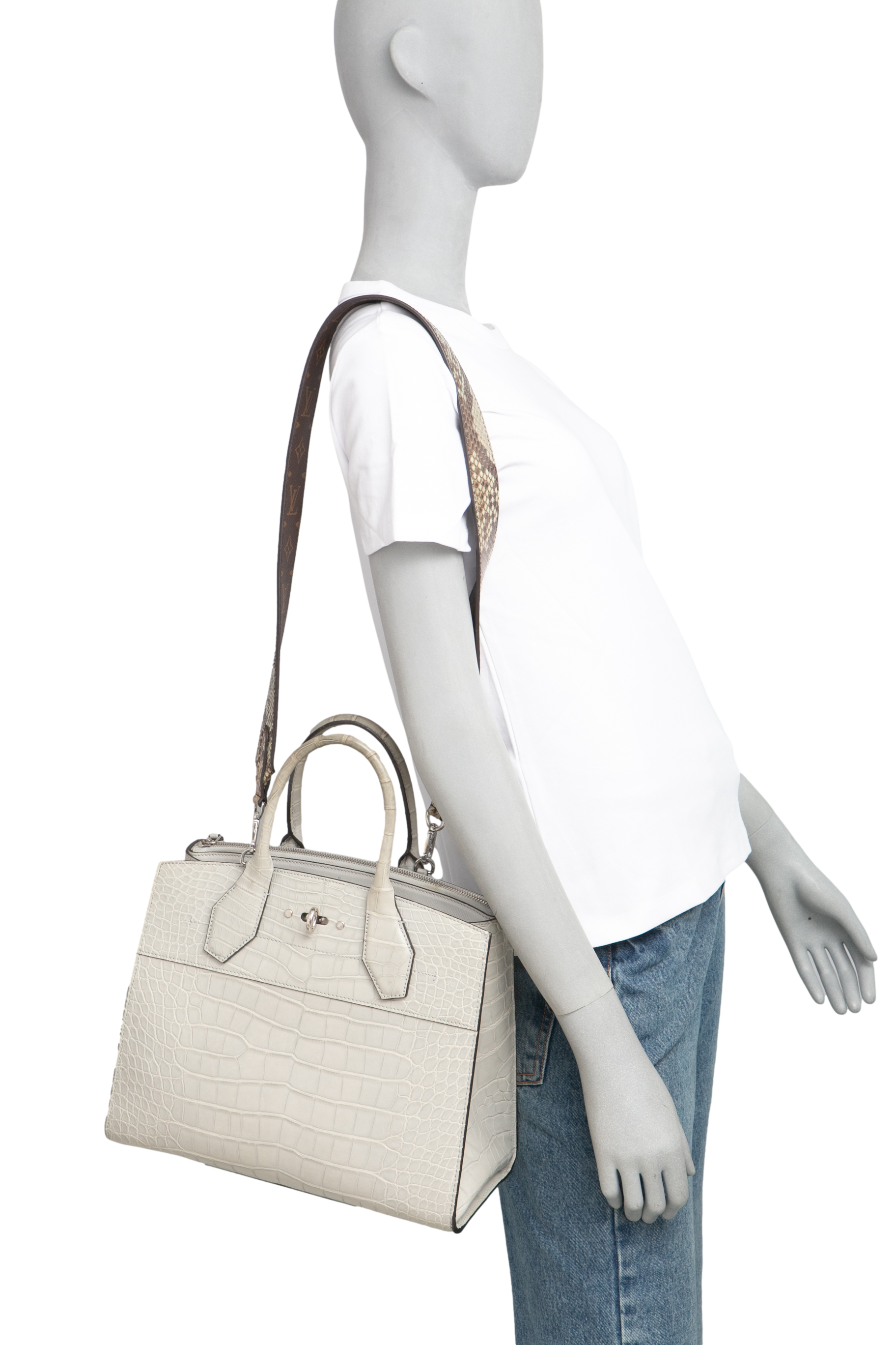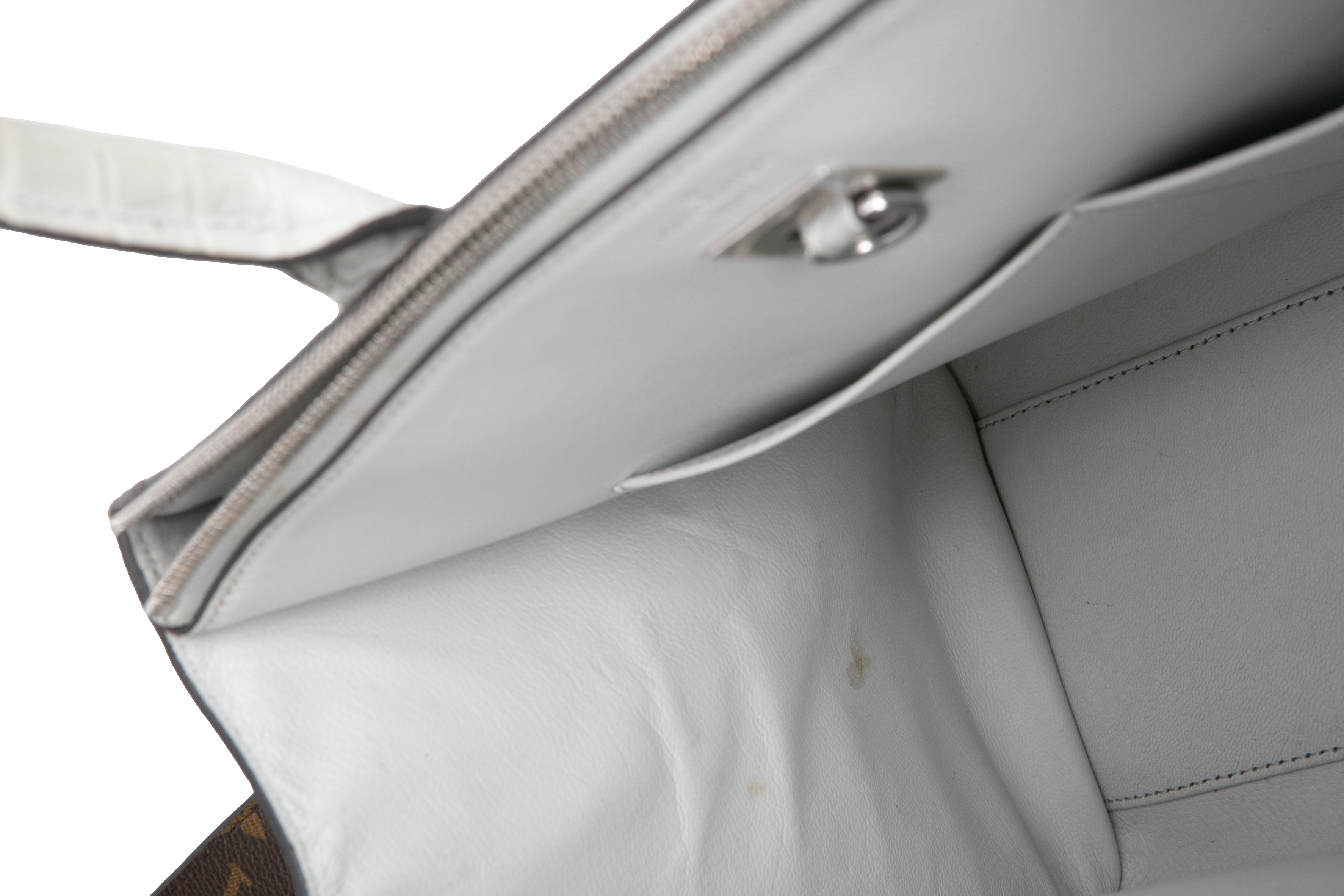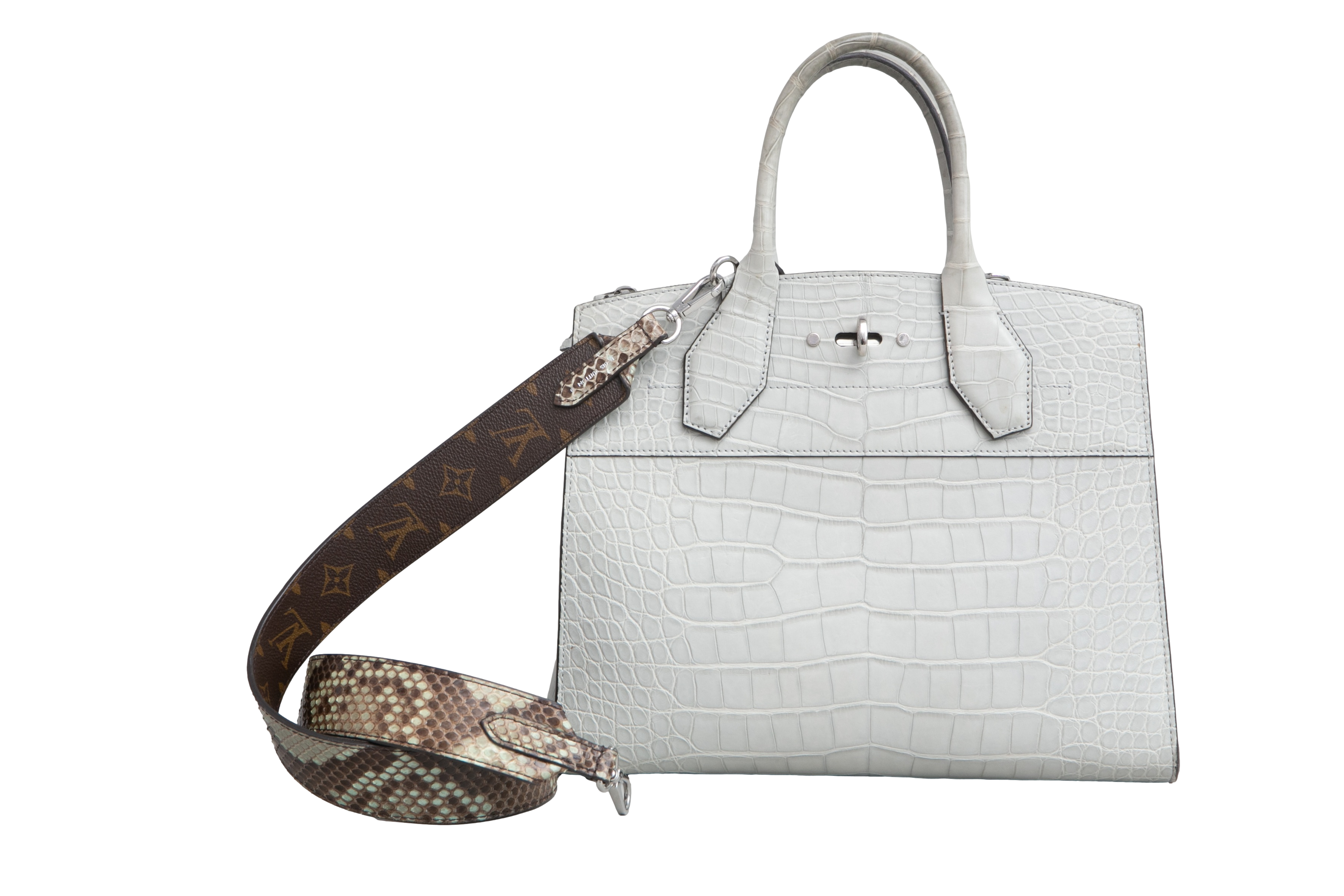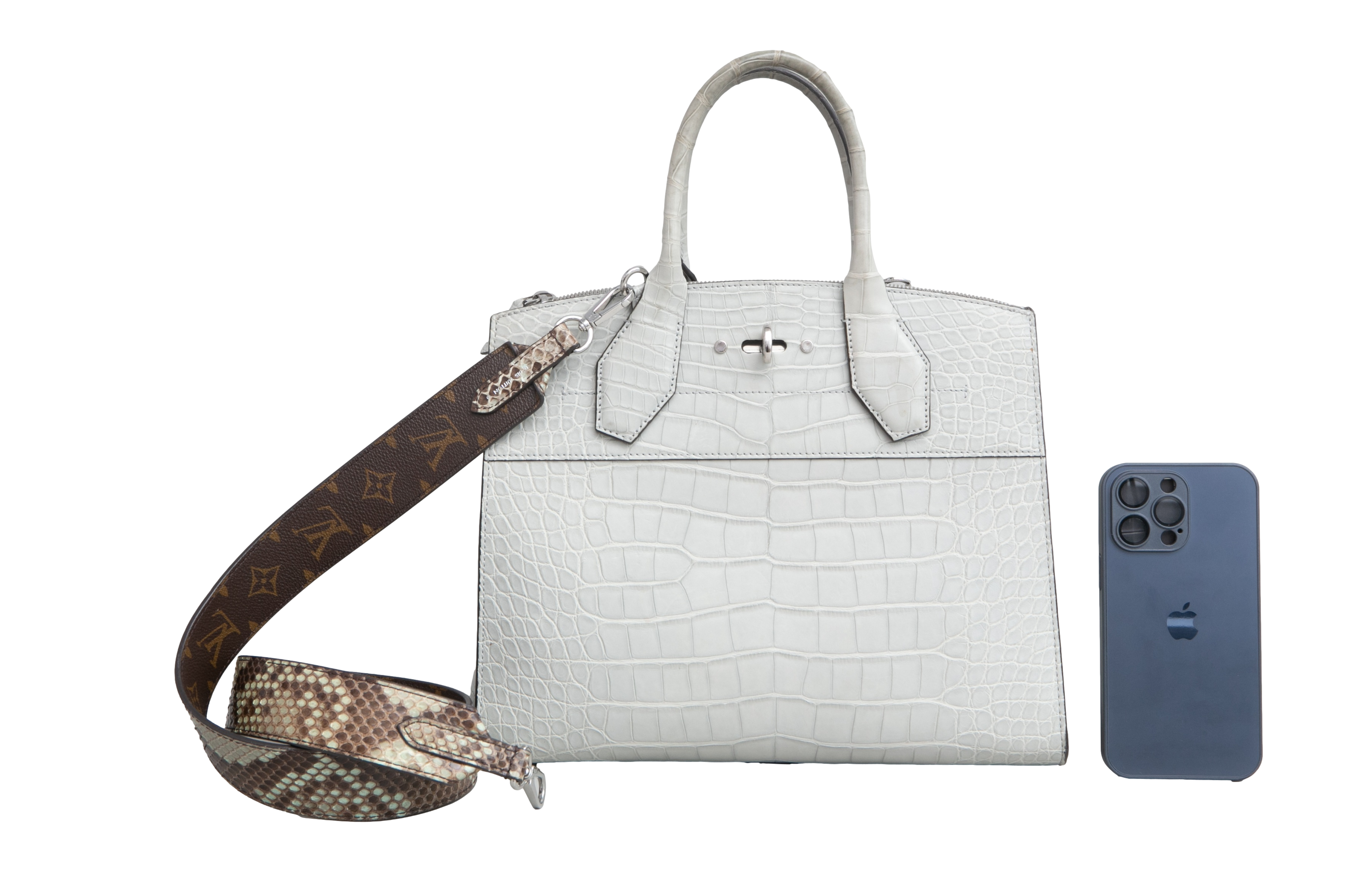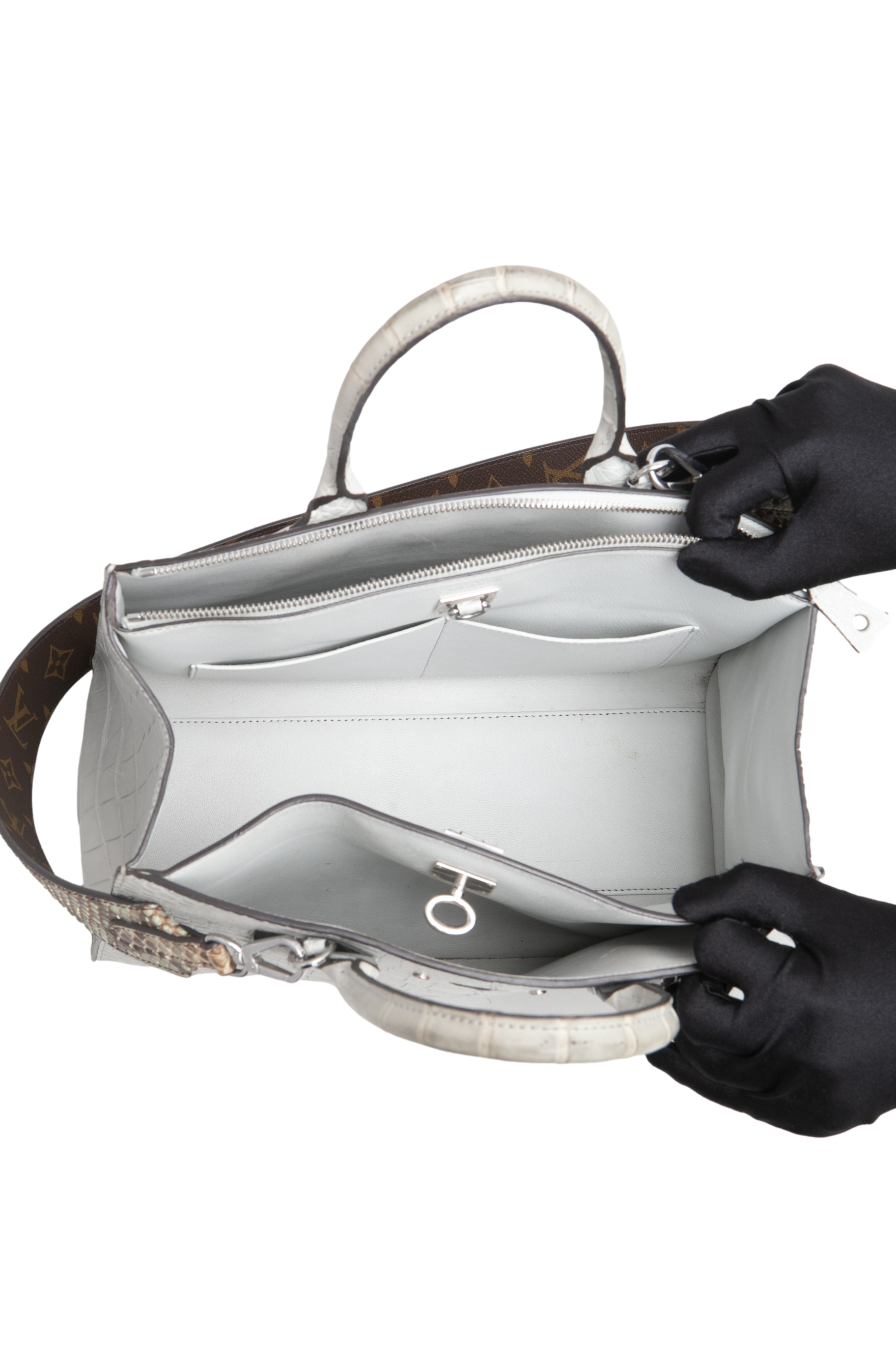 Bolsa em couro croco na cor cinza claro, possui alça longa com estampas em monograma LV e Python, para uso shoulder, crossbody e handle bag