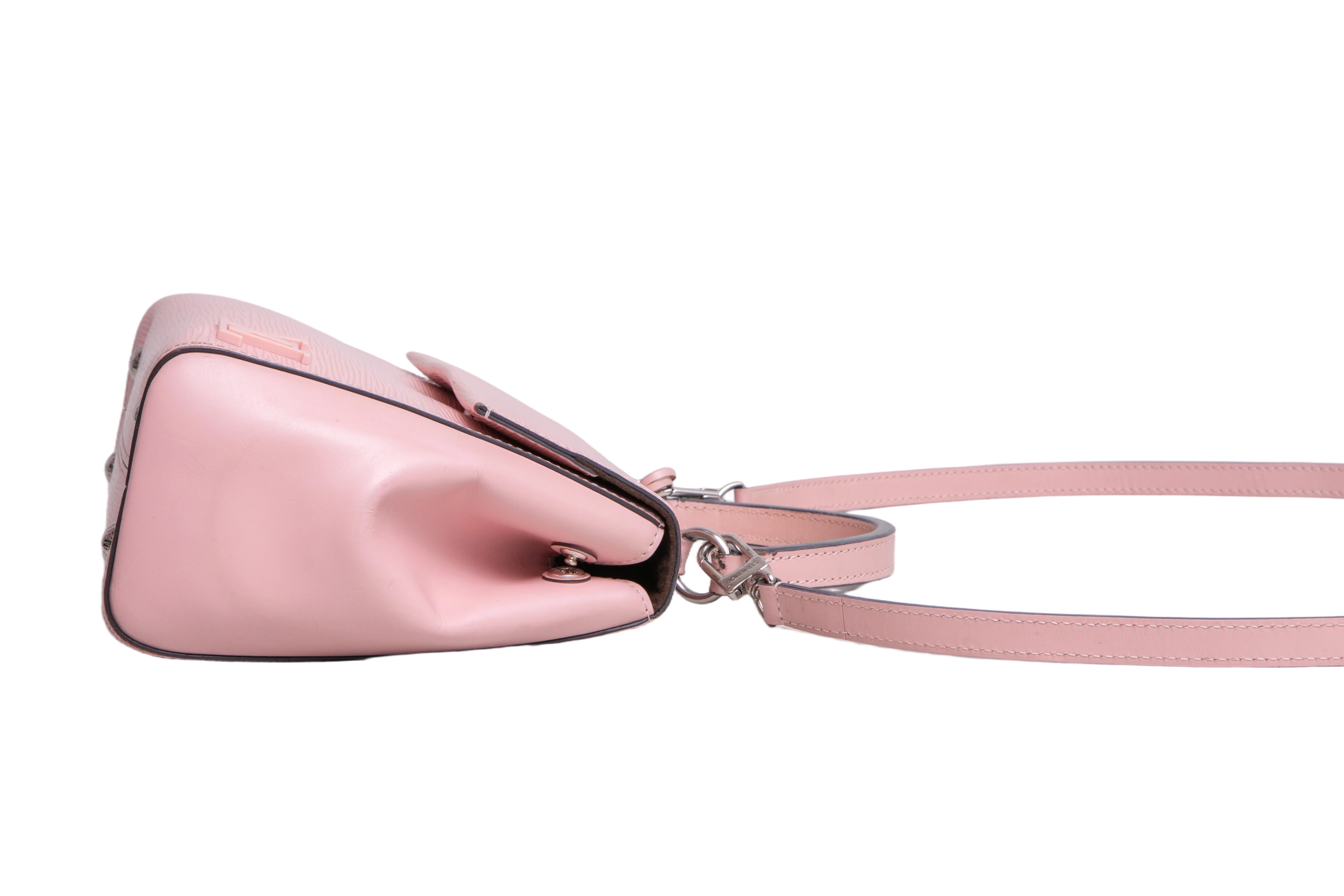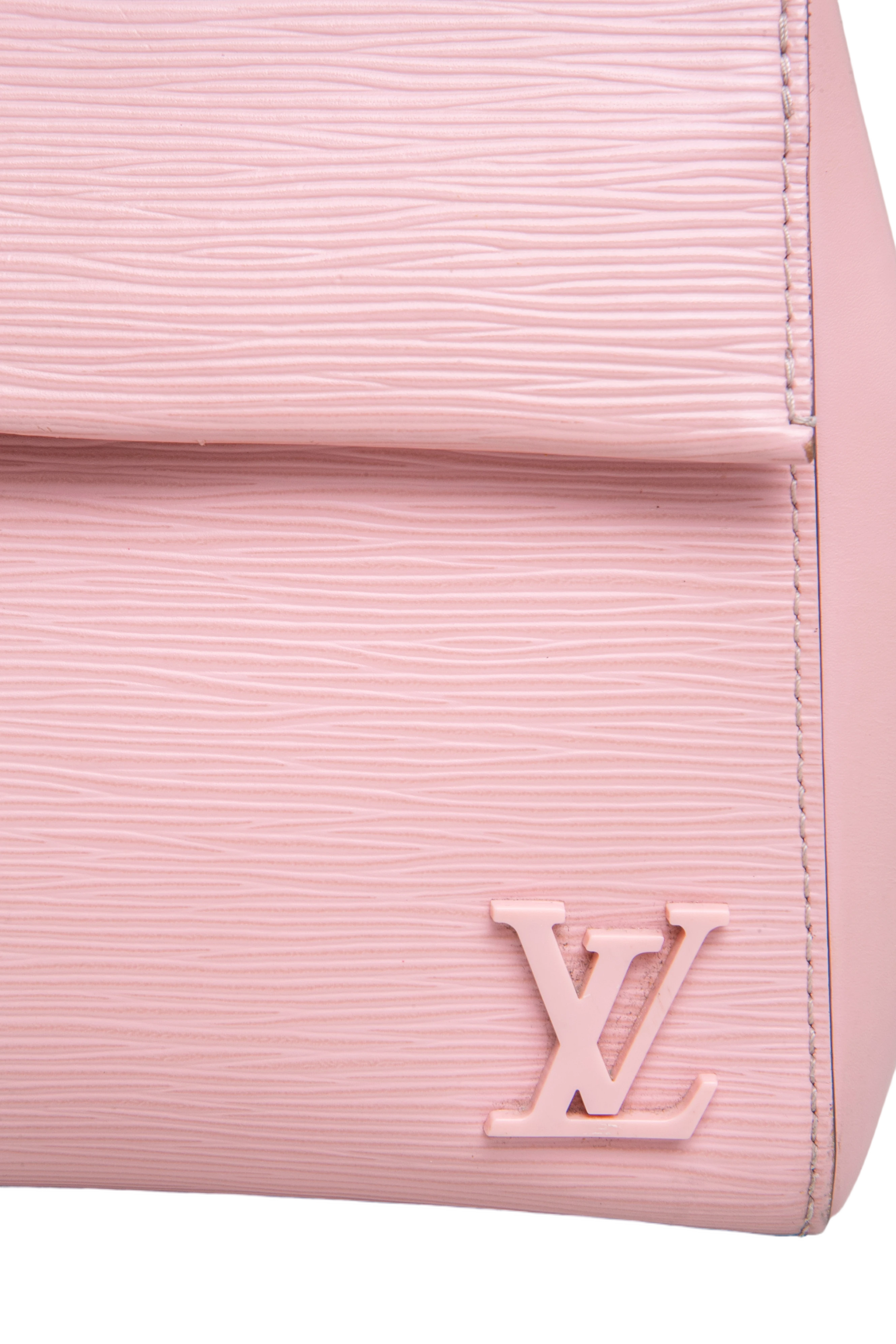 Bolsa em couro epi na cor rosa, com fechamento por aba e botões magnéticos. Possui alça superior de mão e alça longa removível, para uso shoulder, crossbody e handle bag.