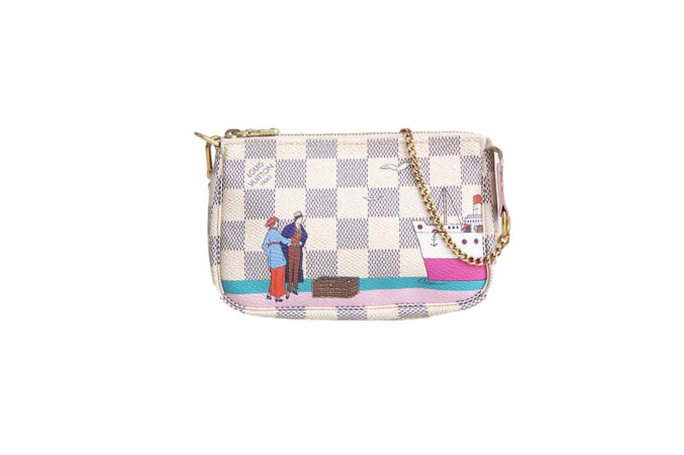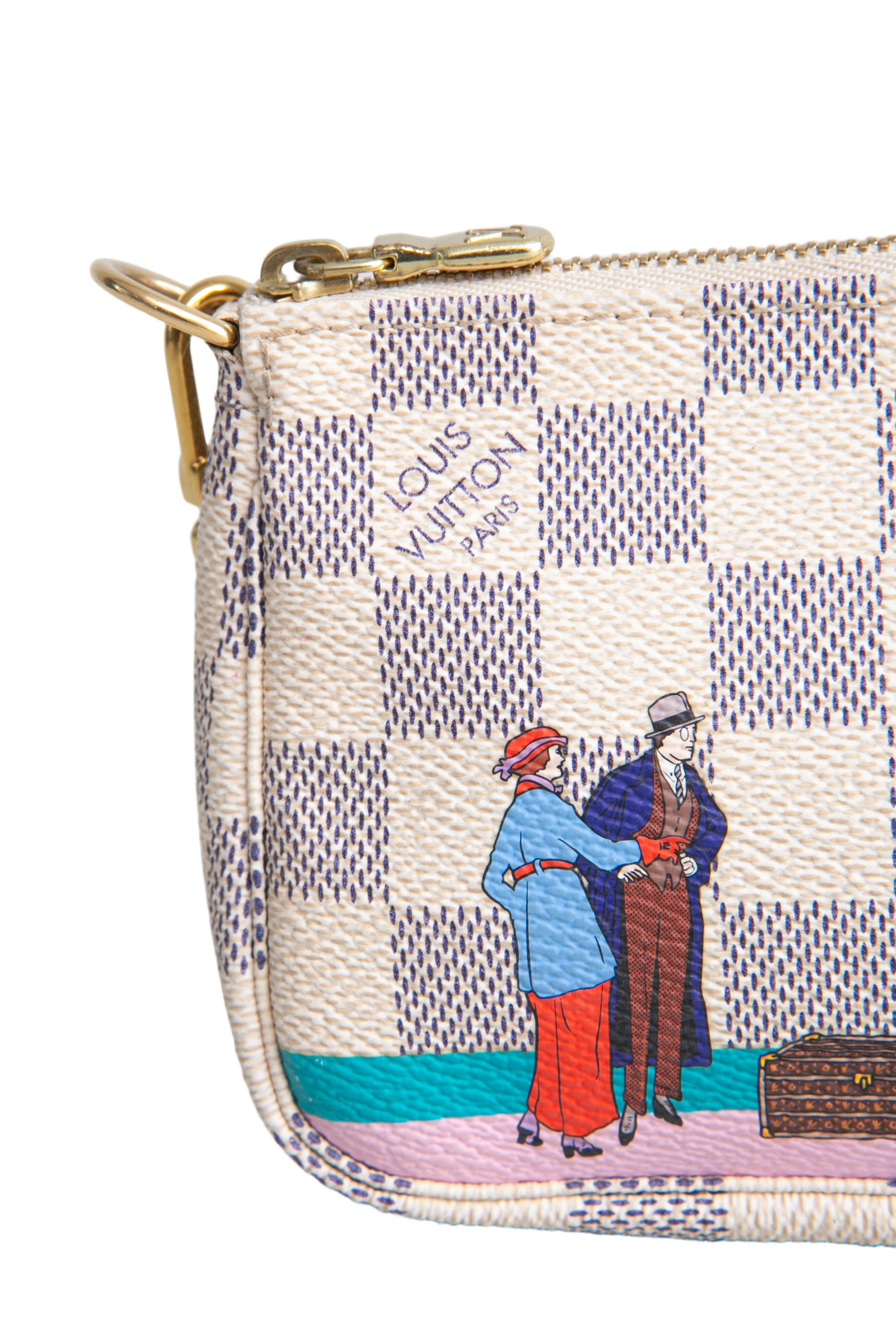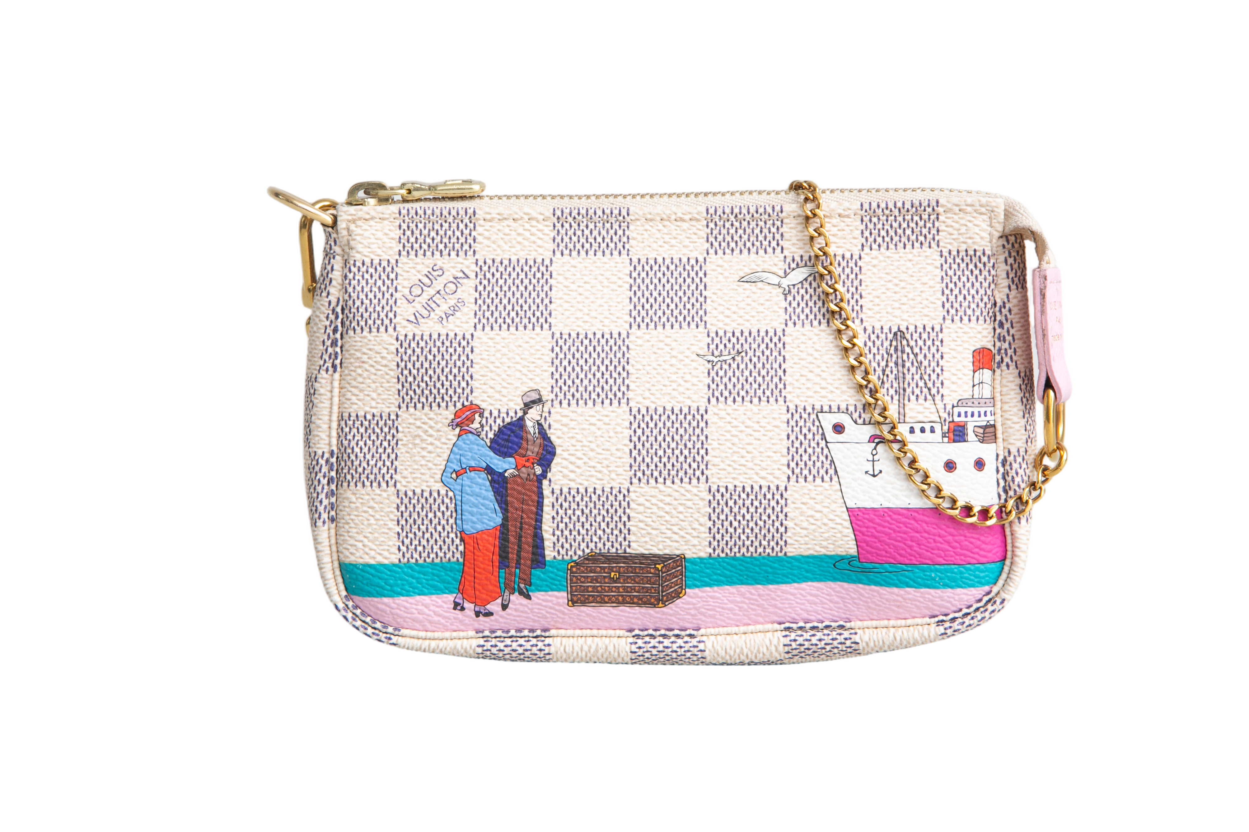 Bolsa em couro Damier Azur com ilustração temática de viagem, apresentando figuras vintage, um navio e uma mala clássica da marca, com fecho em zíper e alça em coorrente, ideal para uso como mini pouch ou carteira de mão.
