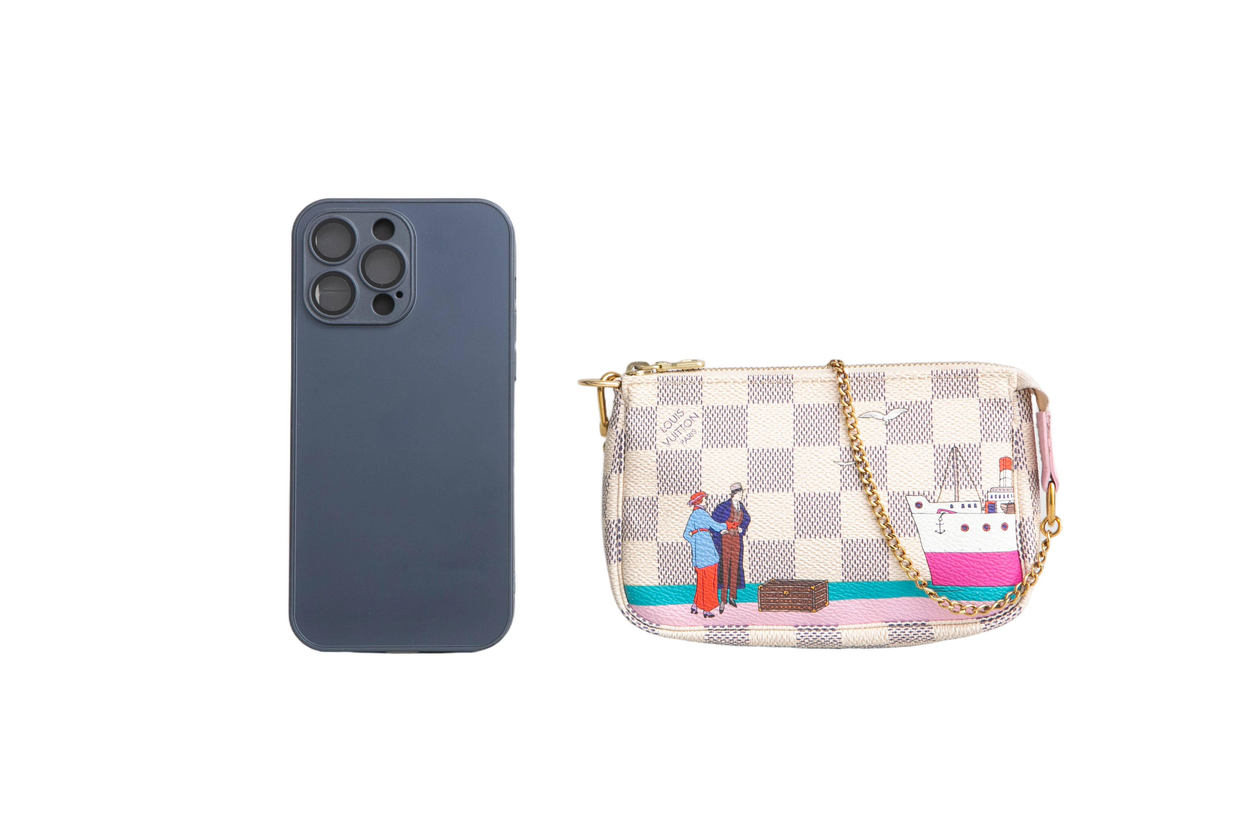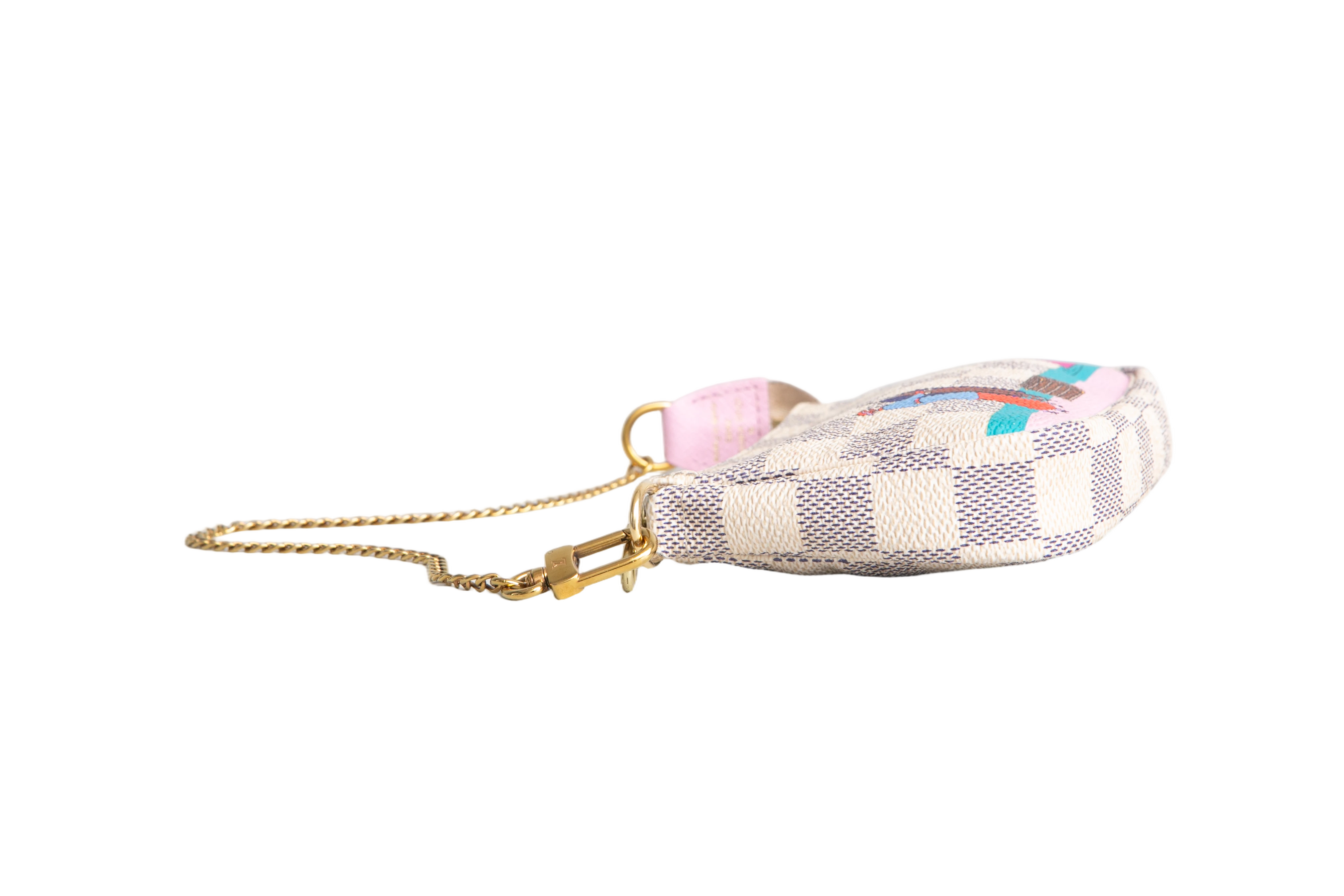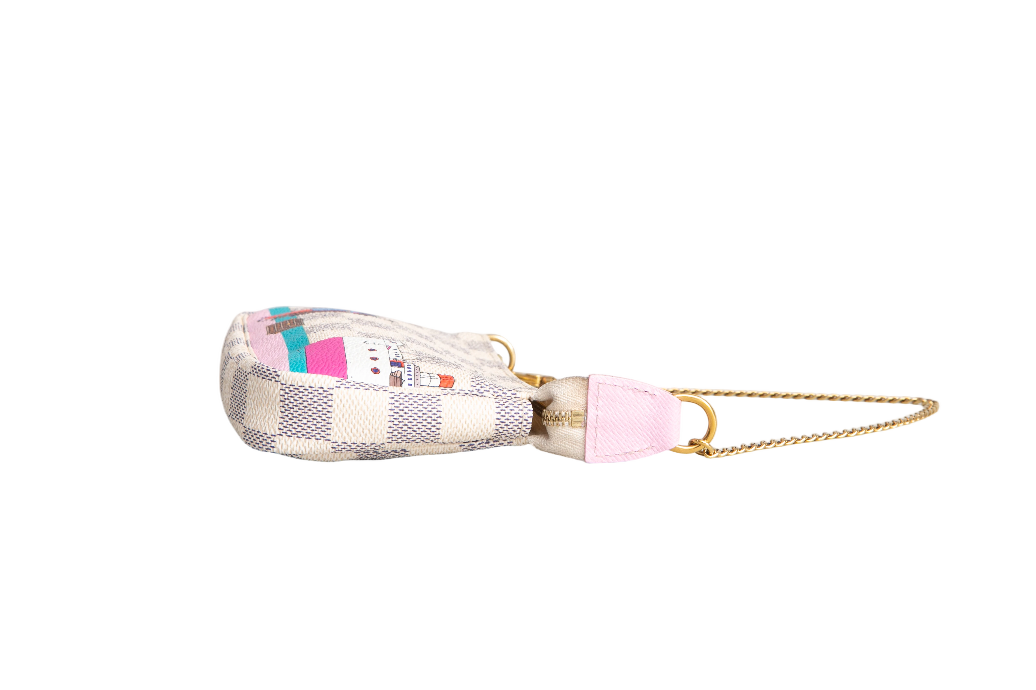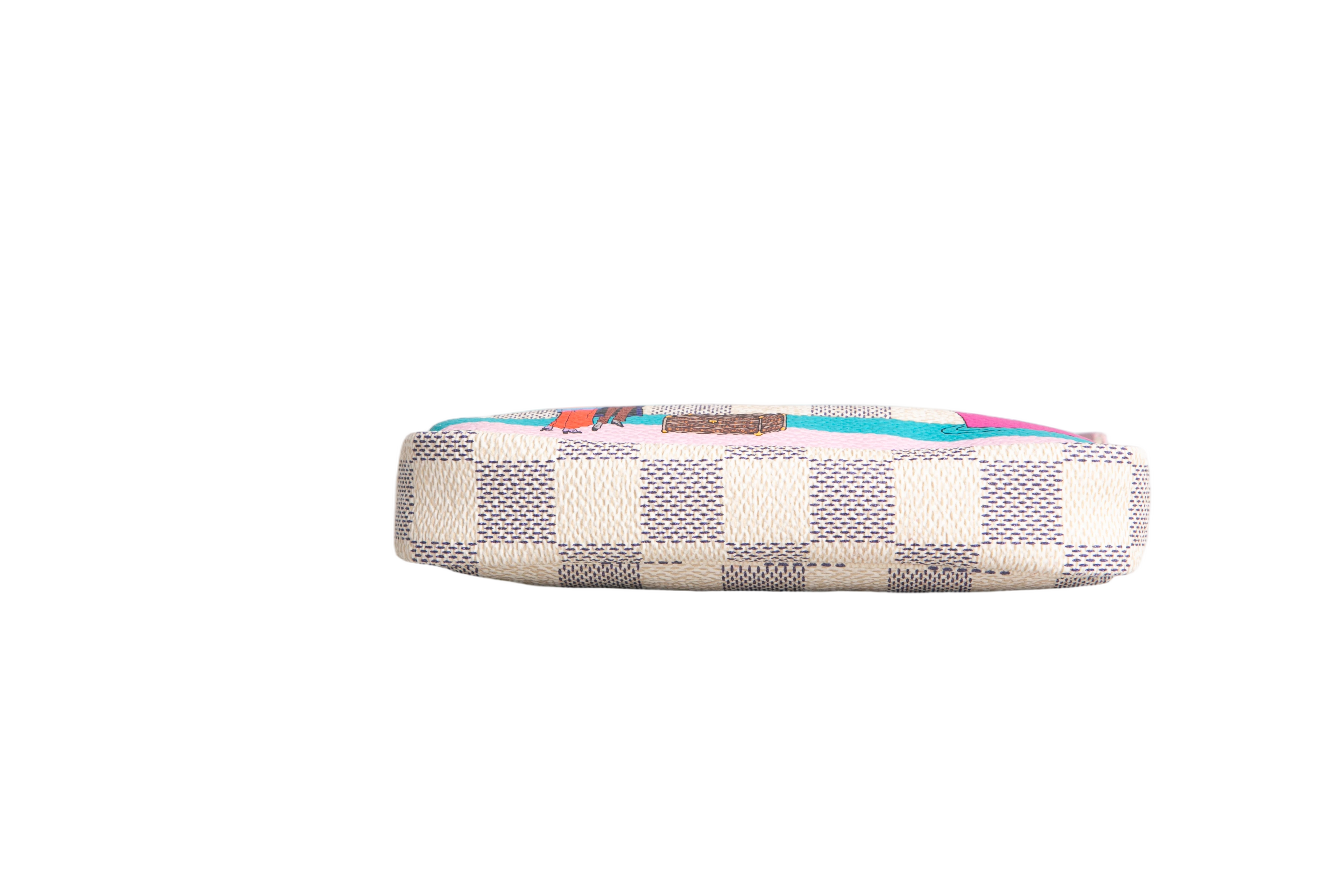 Bolsa em couro Damier Azur com ilustração temática de viagem, apresentando figuras vintage, um navio e uma mala clássica da marca, com fecho em zíper e alça em coorrente, ideal para uso como mini pouch ou carteira de mão.