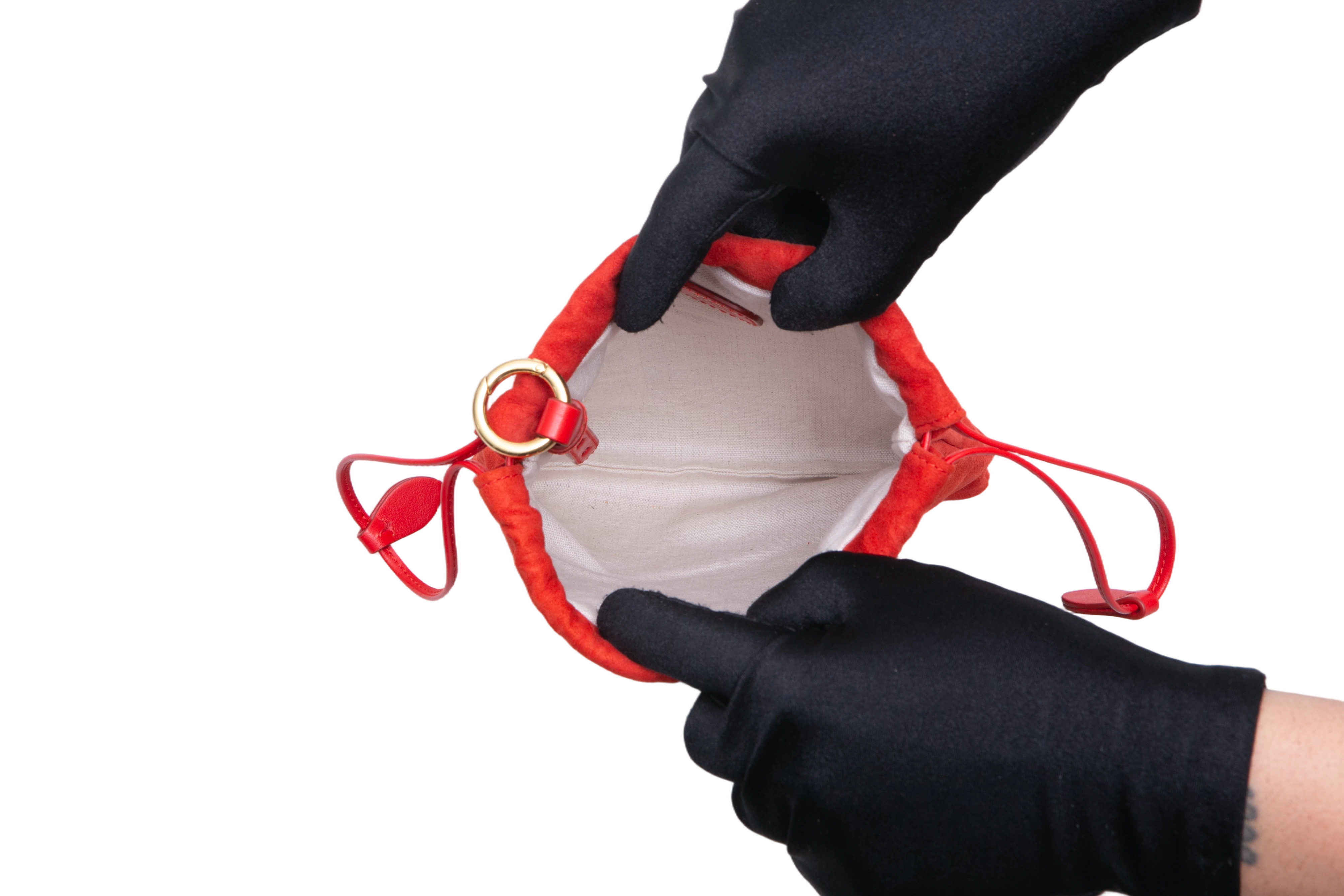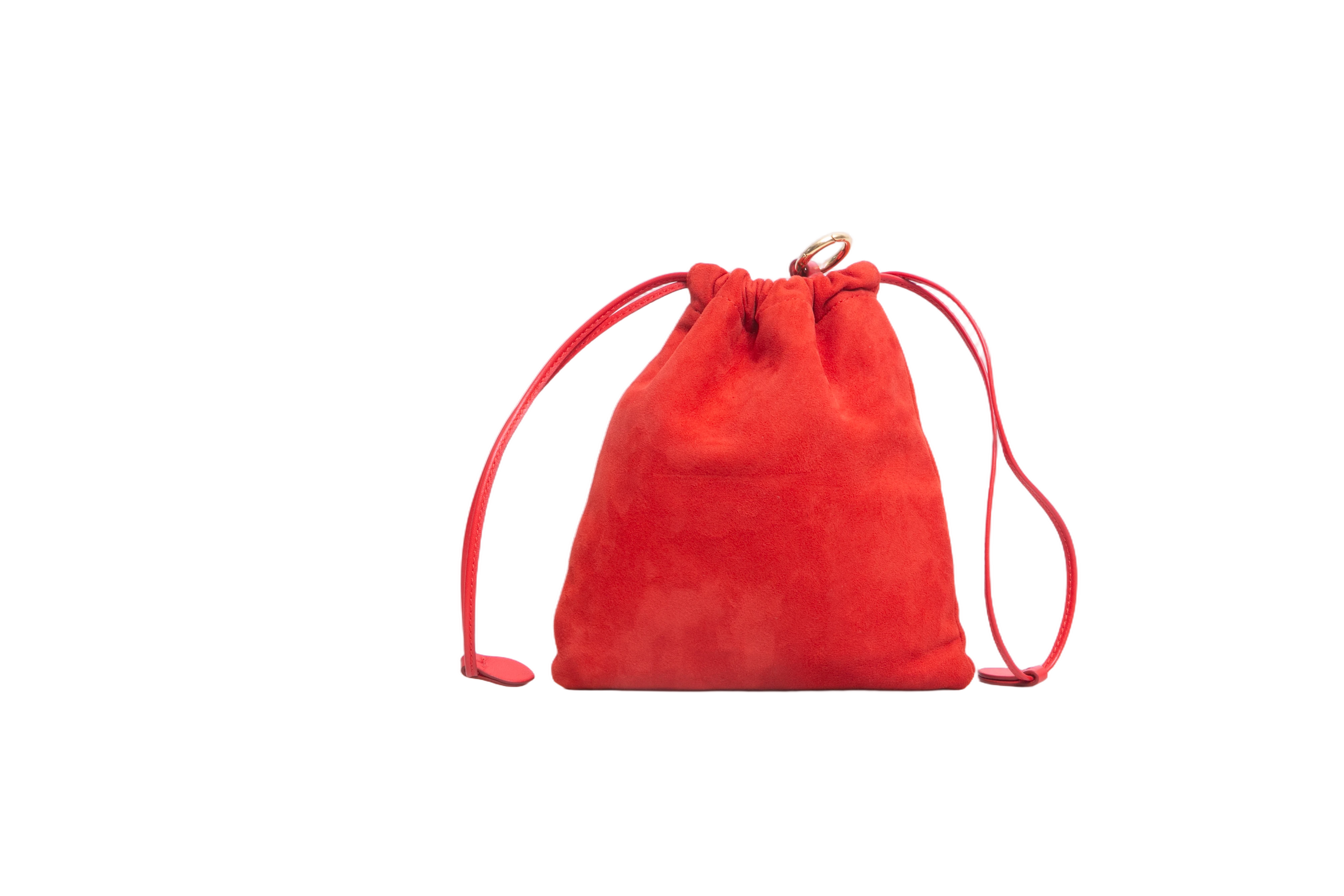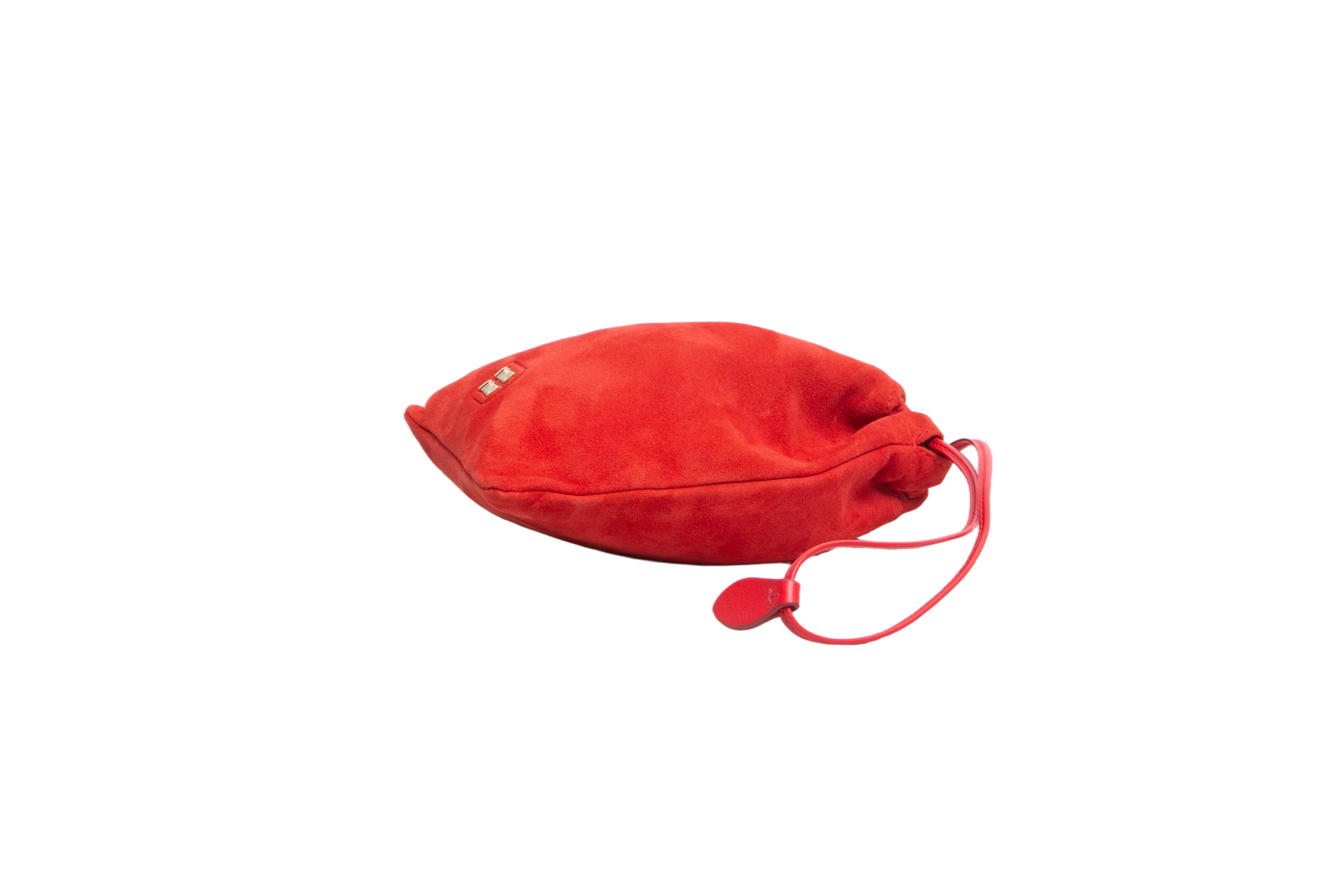 Bolsa em suede vermelho, fechamento por corda, pode ser usada também como pouch (bolsa complemento para bolsas grandes).