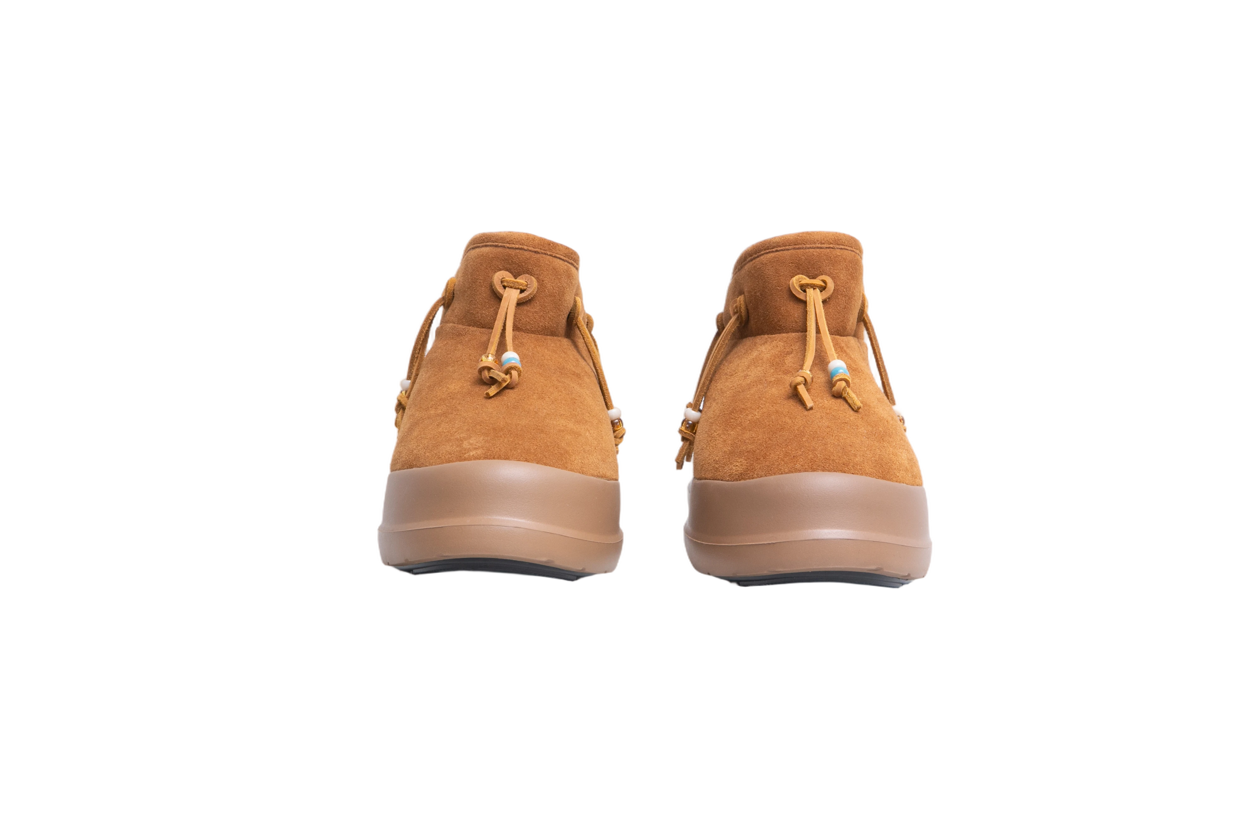 Bota em camurça marrom, com design de cano baixo e solado robusto em borracha. O modelo conta com detalhes em cordões ajustáveis nas laterais, finalizados com miçangas coloridas.