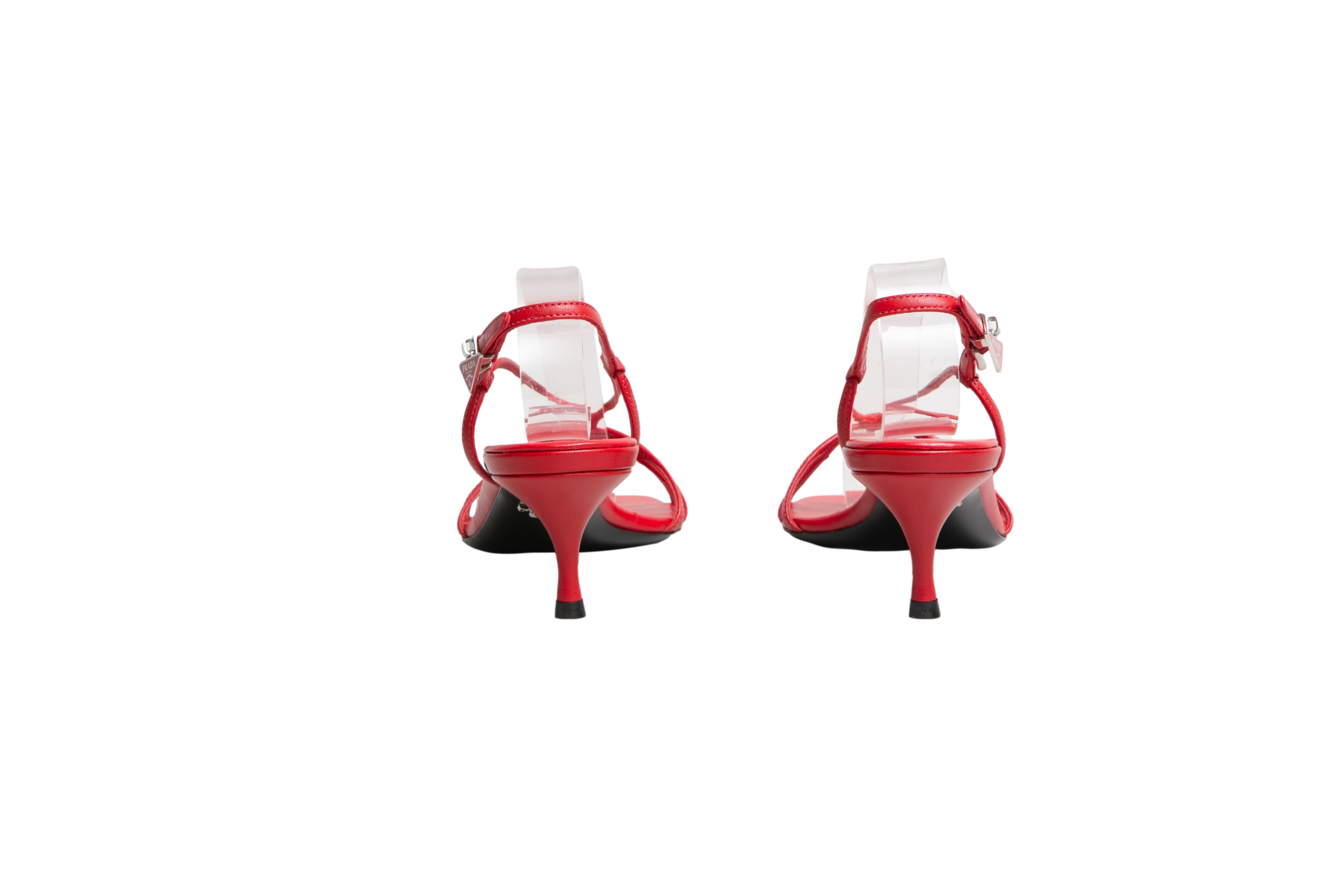 Sandália em couro vinil vermelho, com tiras finas. fechamento por fivela lateral e salto baixo.