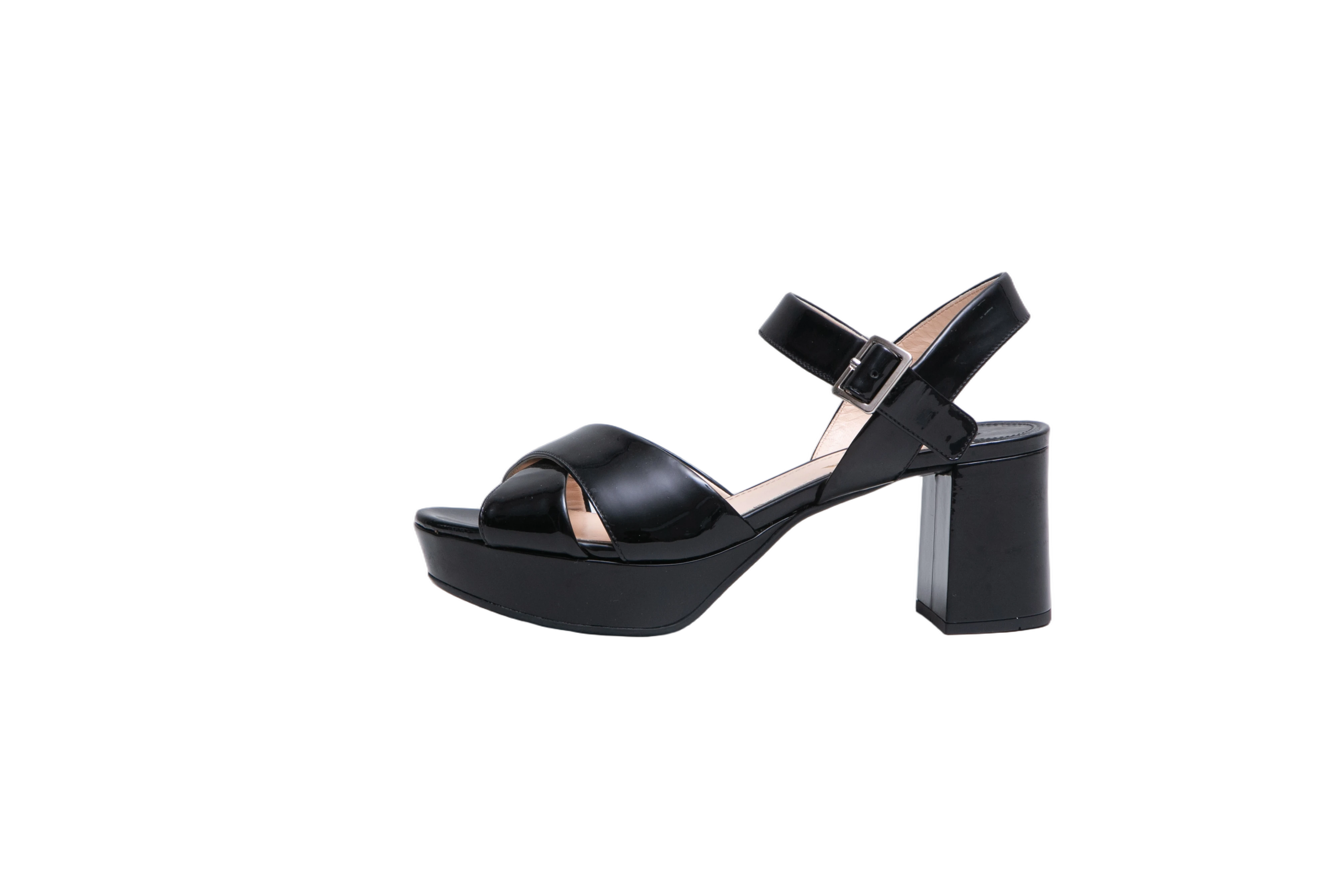 Sandália em verniz preto, com tiras largas cruzadas na parte frontal e fechamento por fivela lateral ajustável. Possui meia-pata, além do salto bloco estruturado.