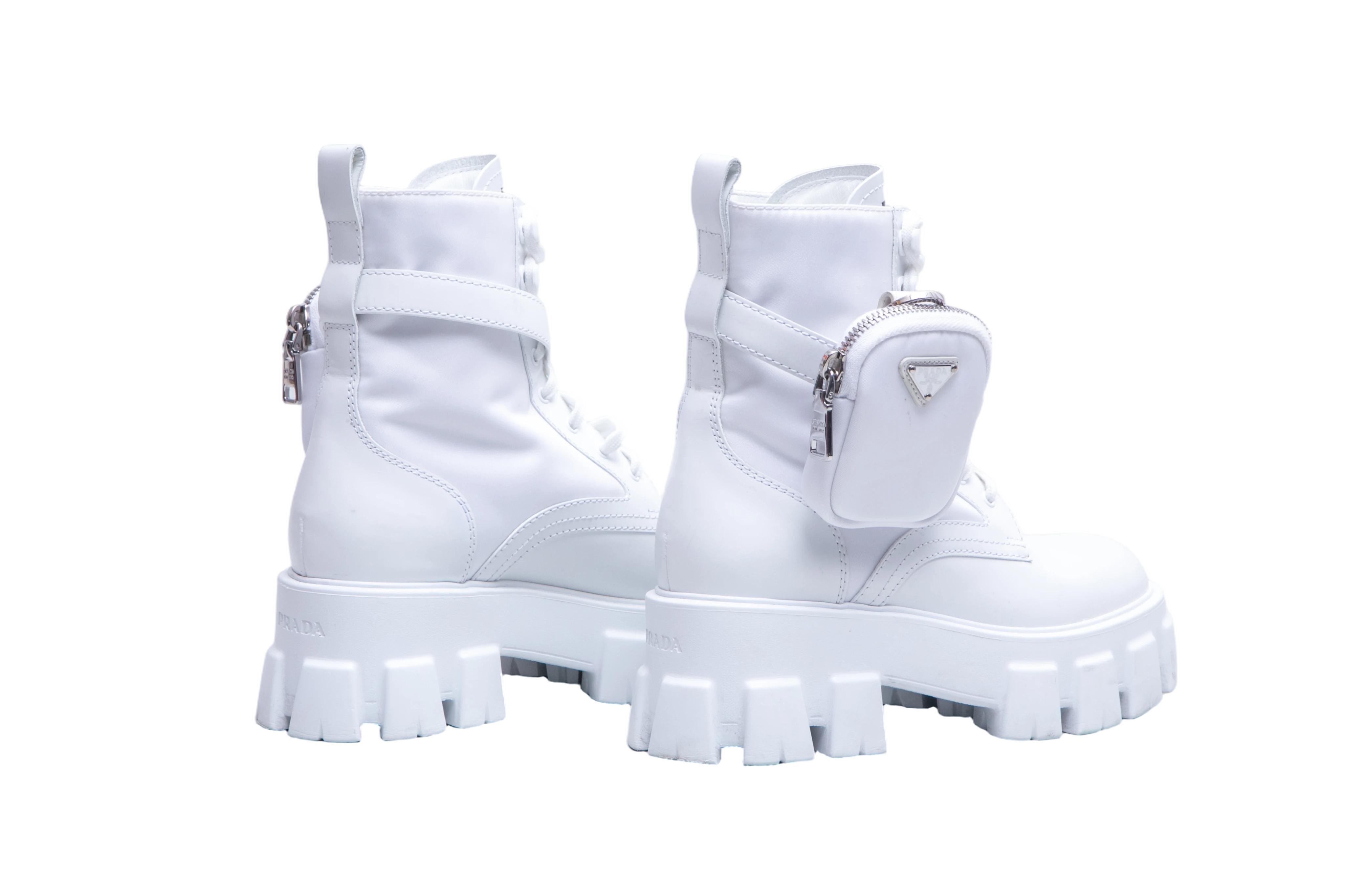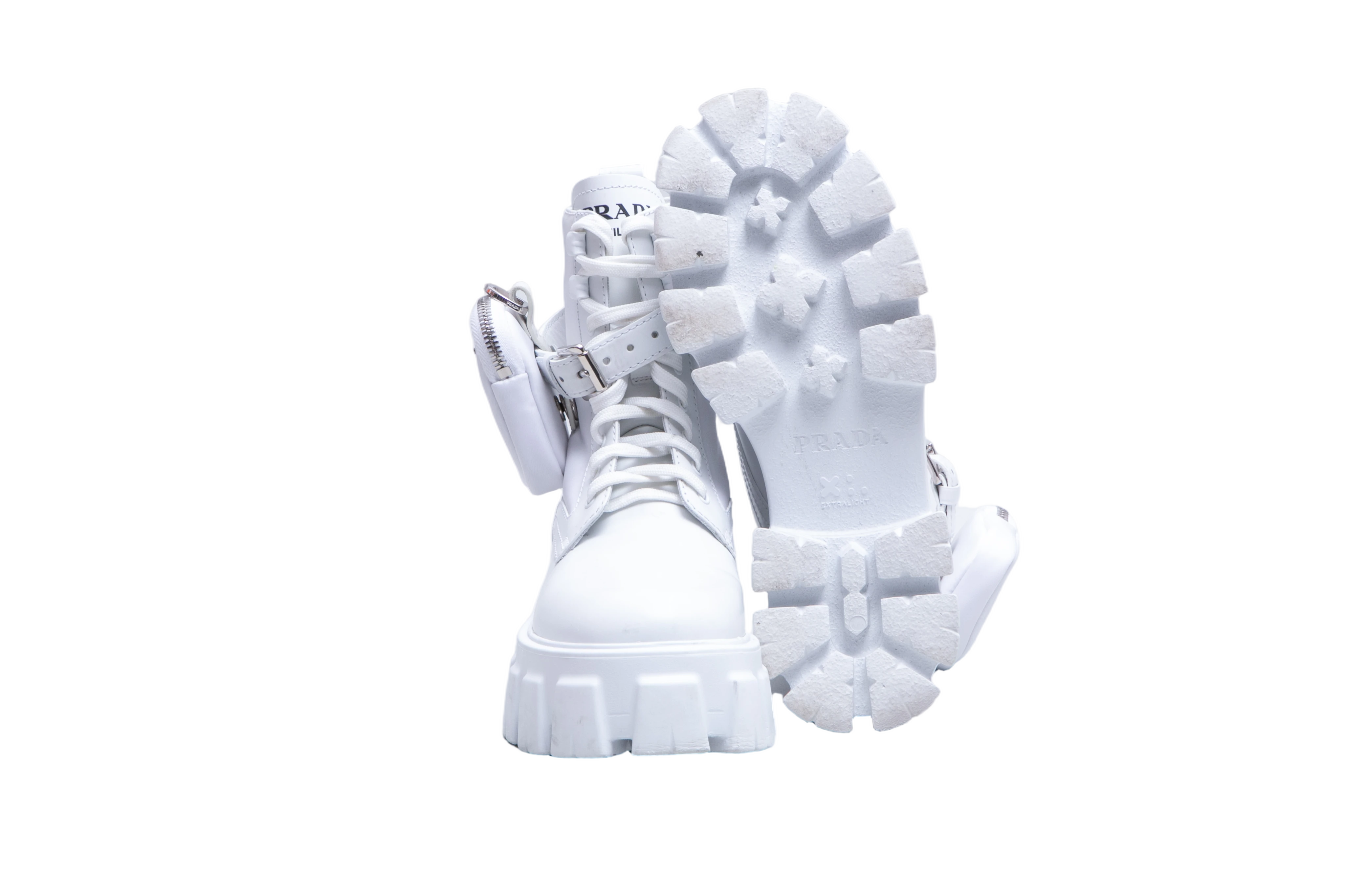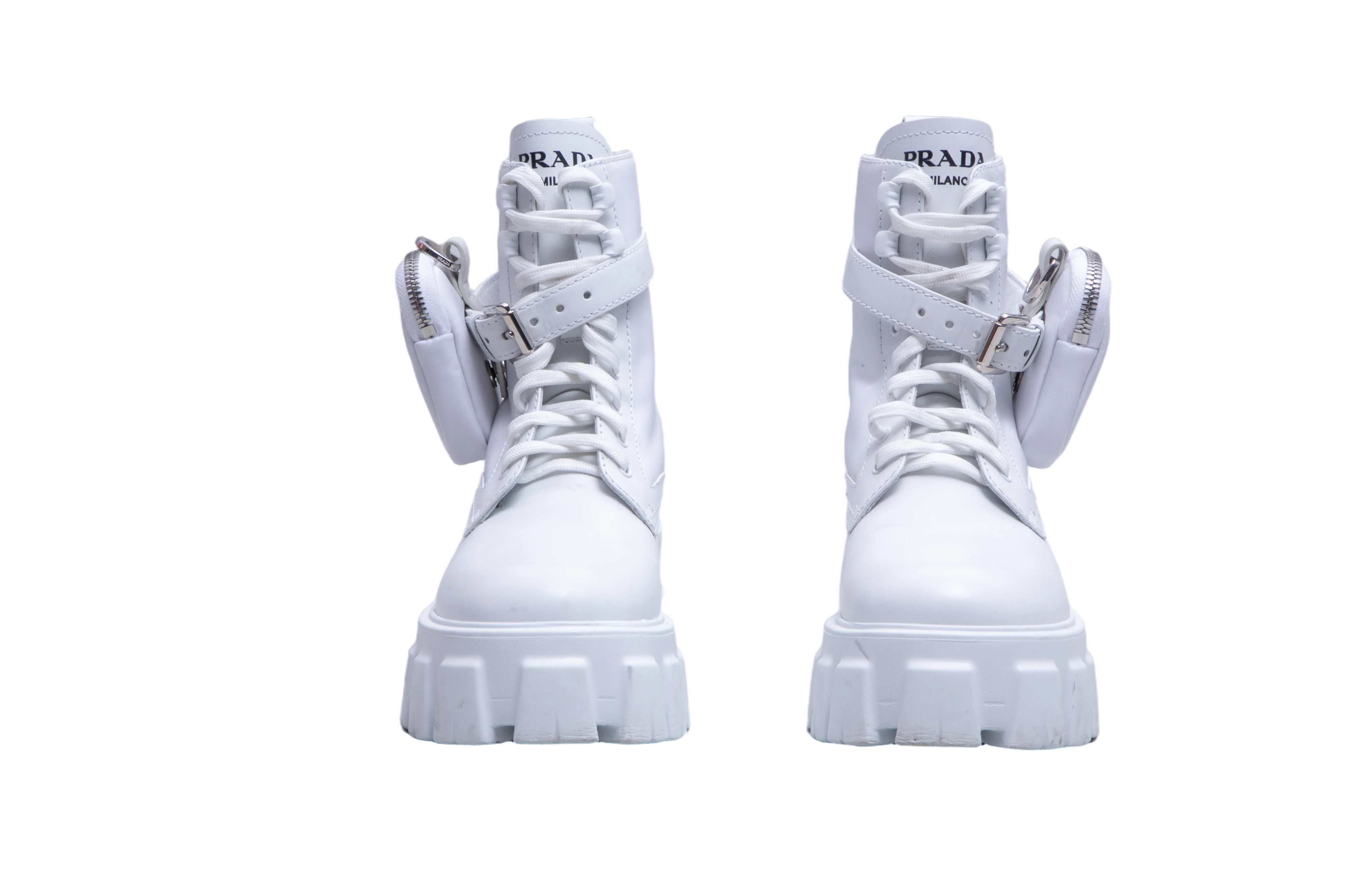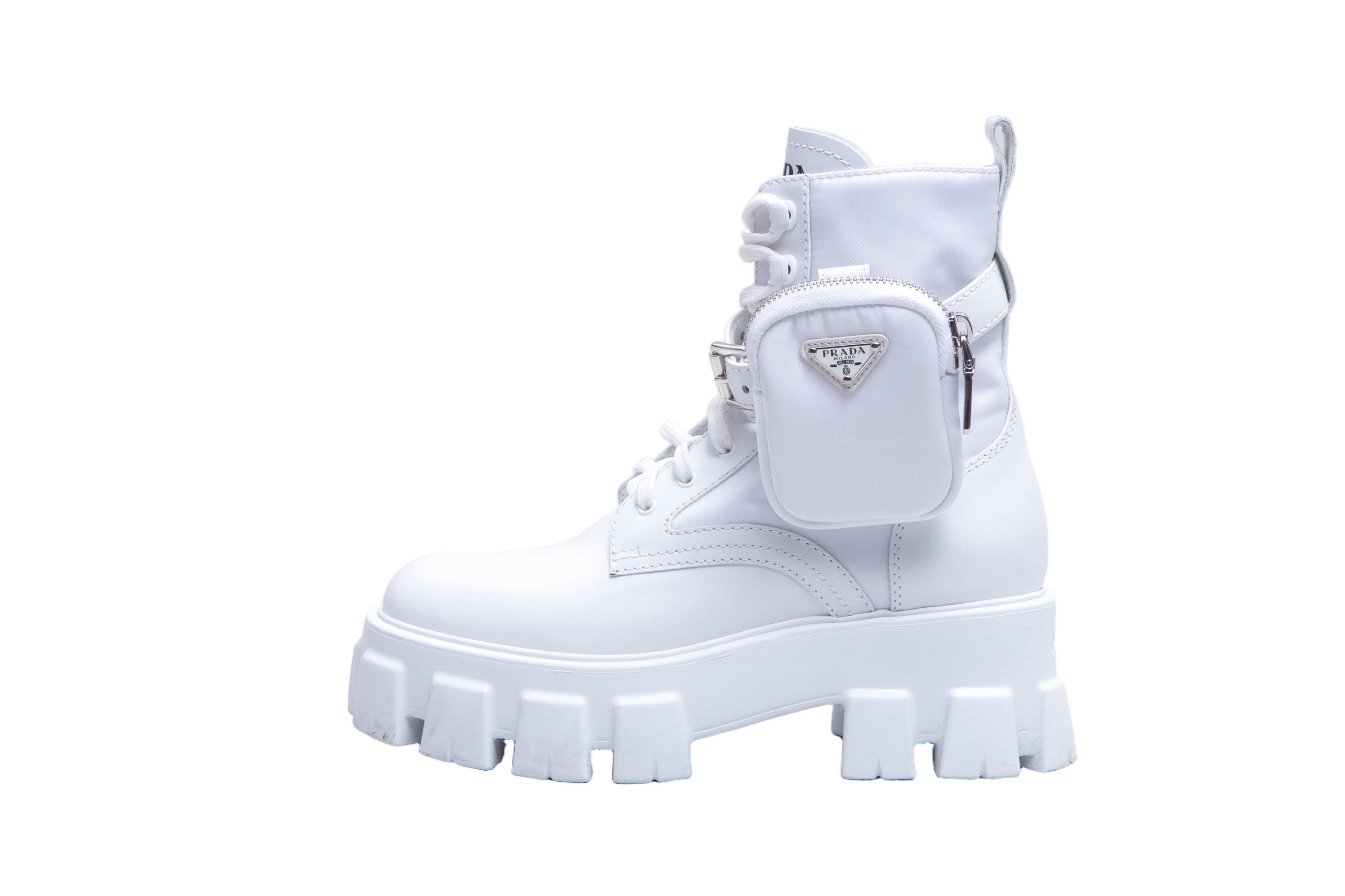Bota de cano médio confeccionada em couro na cor branca, com design robusto. Possui amarração frontal, fechamento com tira e fivela ajustável e detalhe de mini pouch lateral removível com o logo triangular Prada em metal. O solado é plataforma tratorada em borracha.