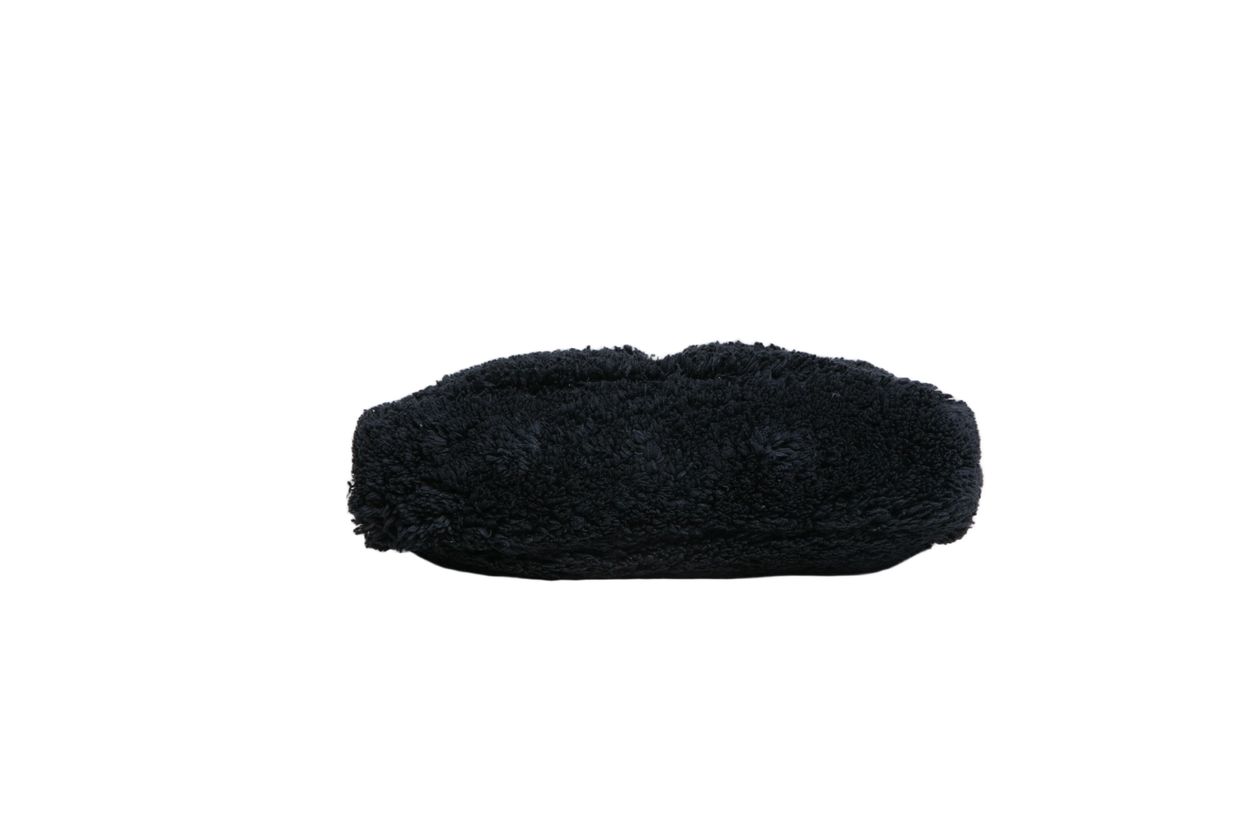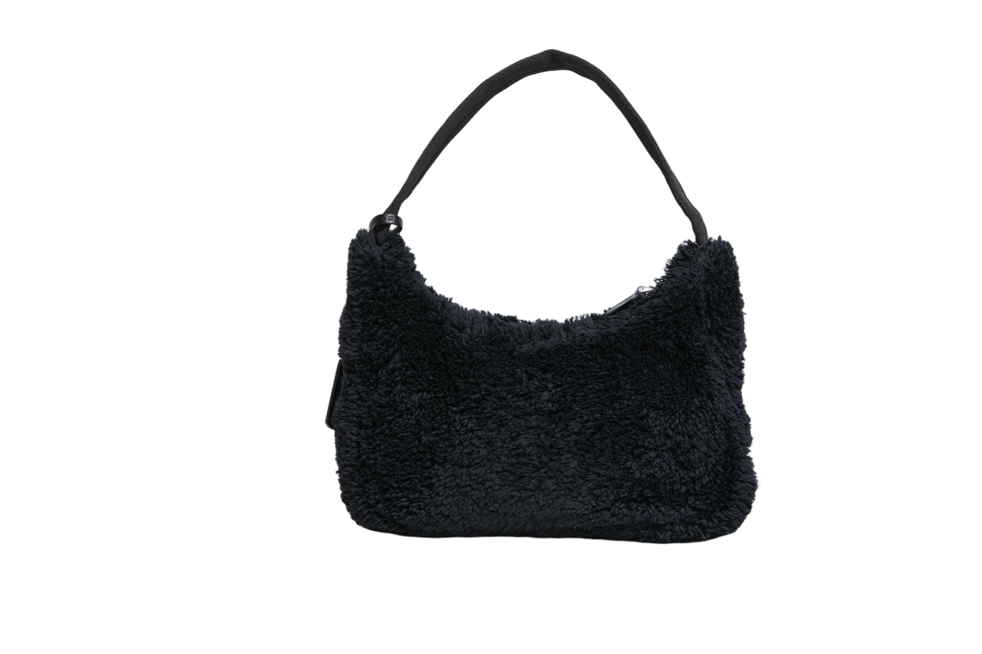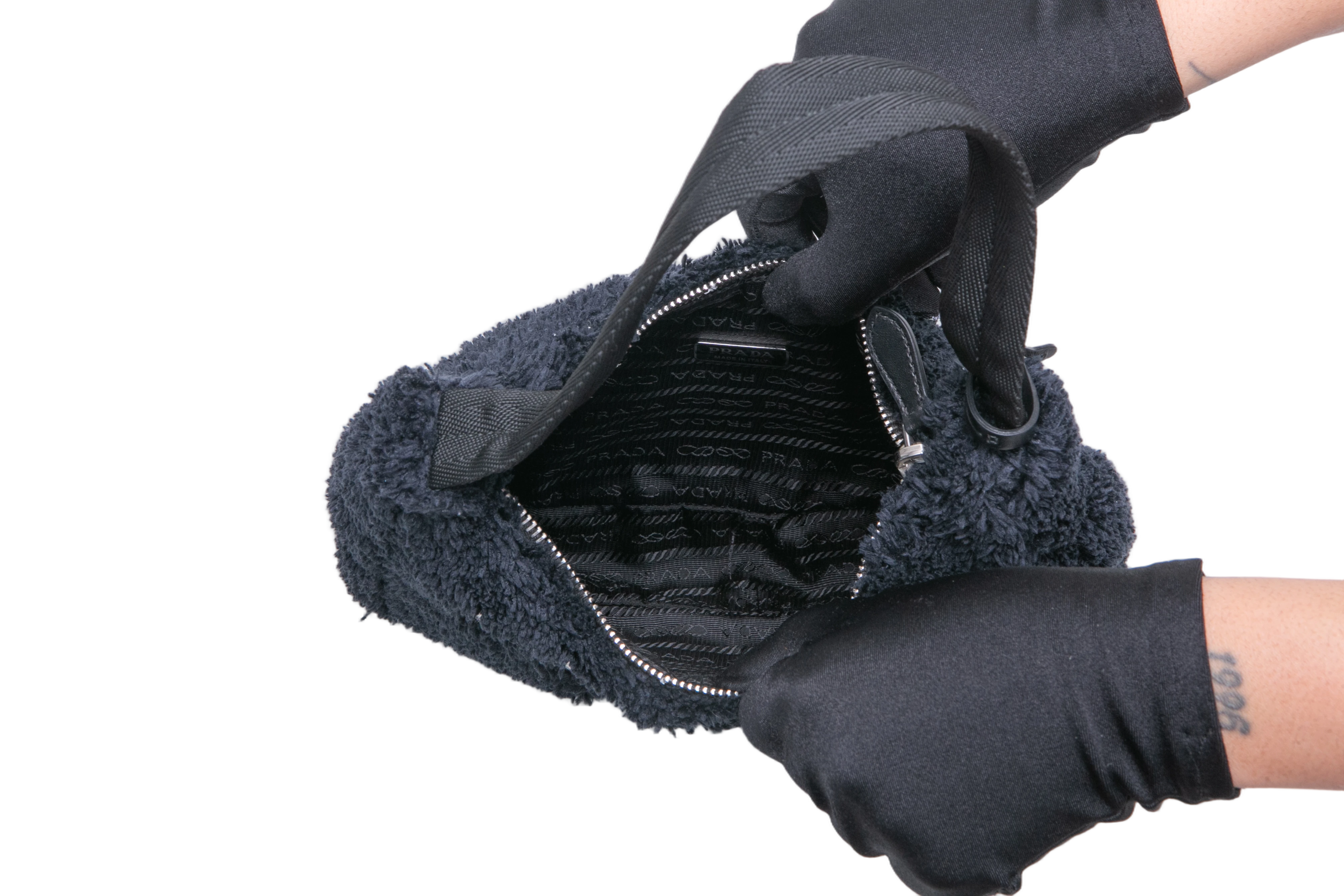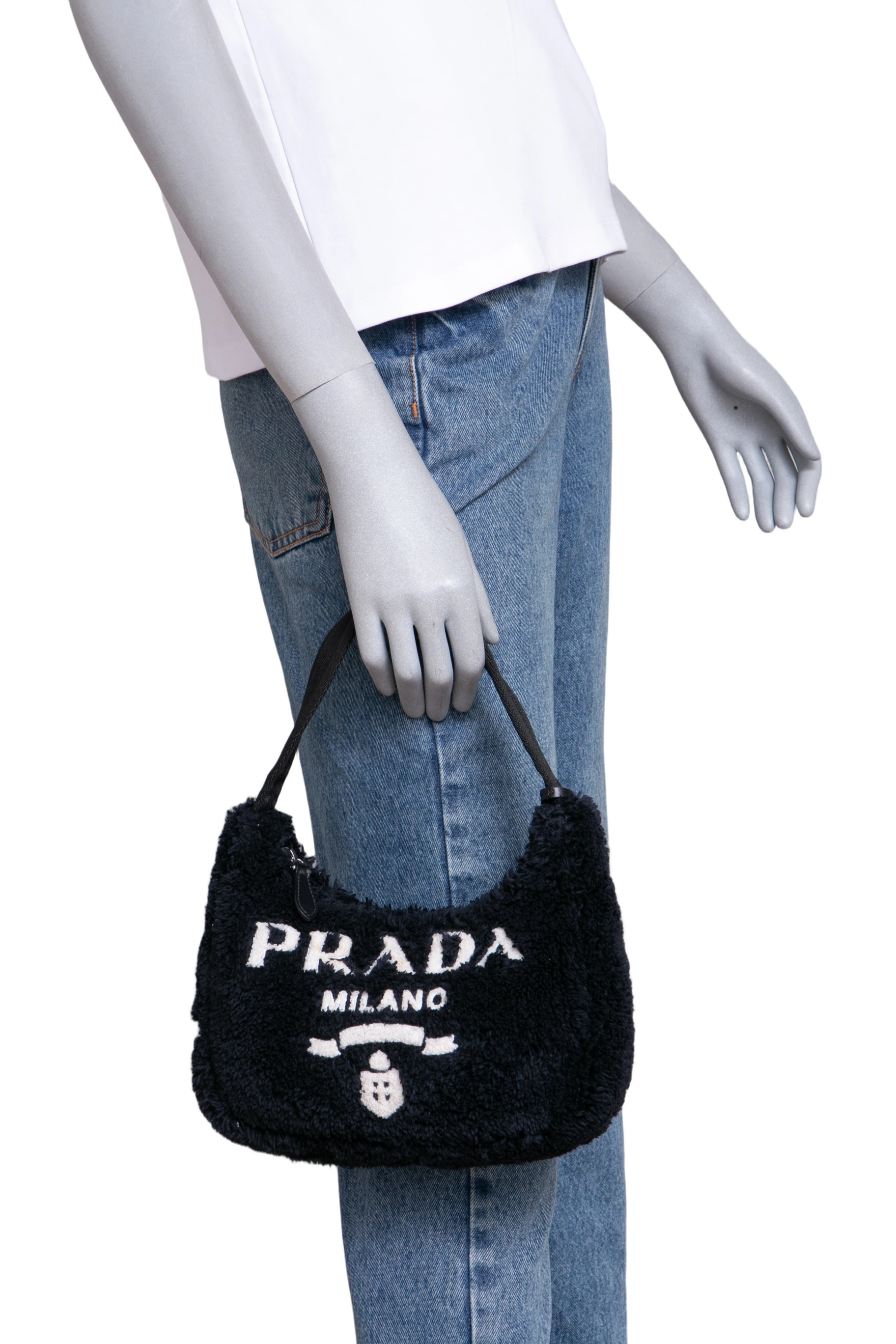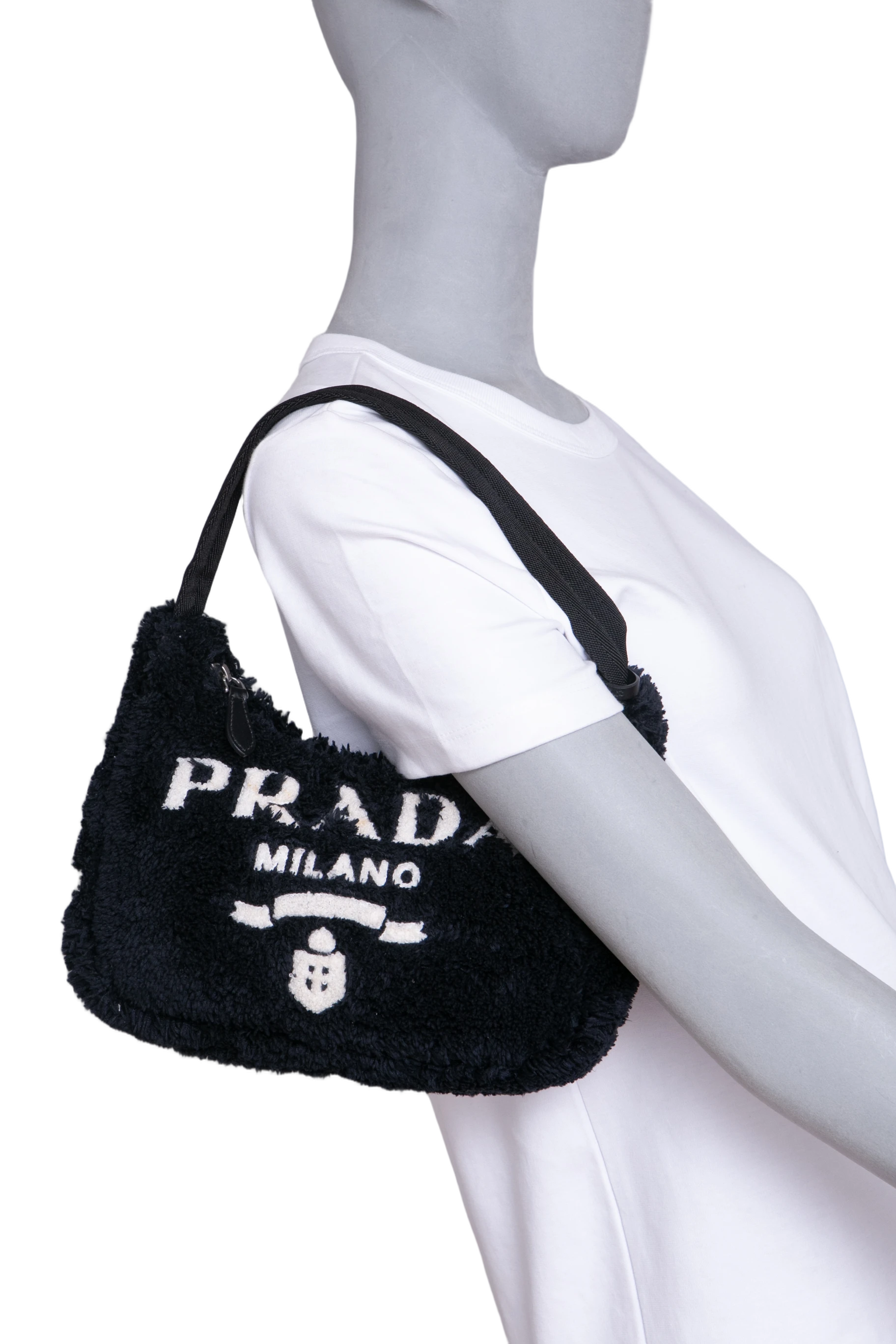 Bolsa confeccionada em tecido de pelúcia macia em tom preto e bordado frontal com o logo Prada Milano em branco, fecho em zíper, não possui alça longa, para uso shoulder e handle bag