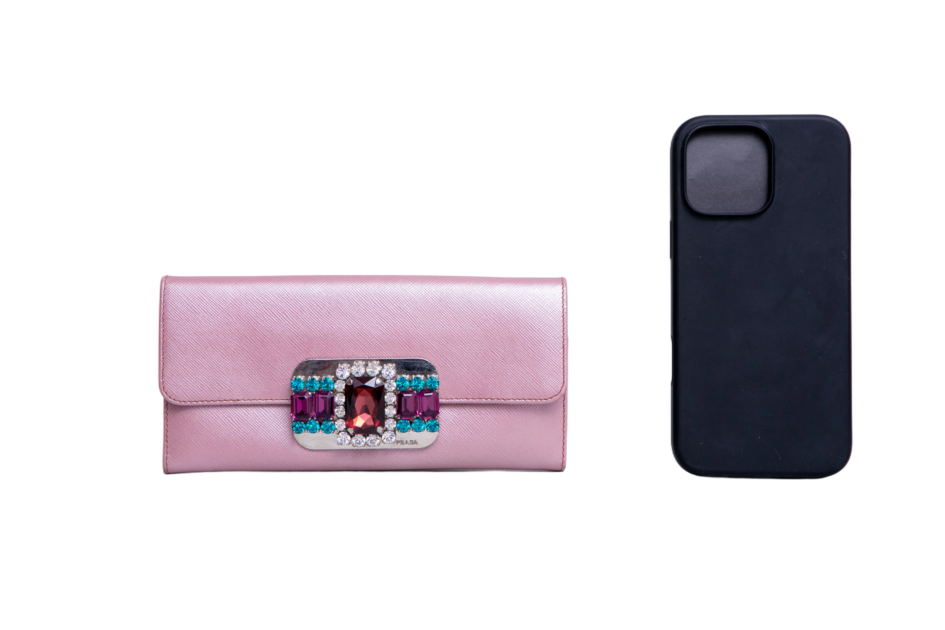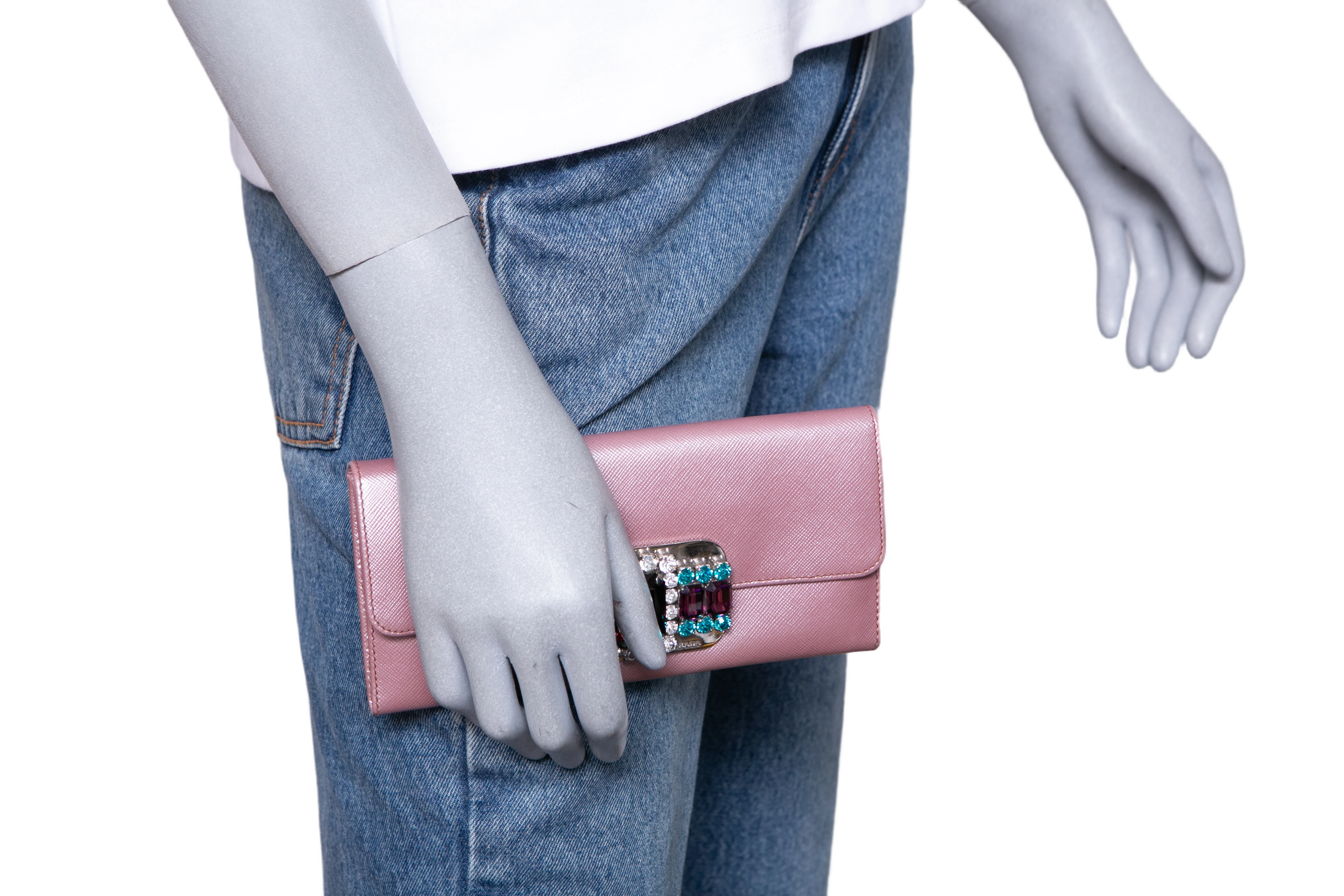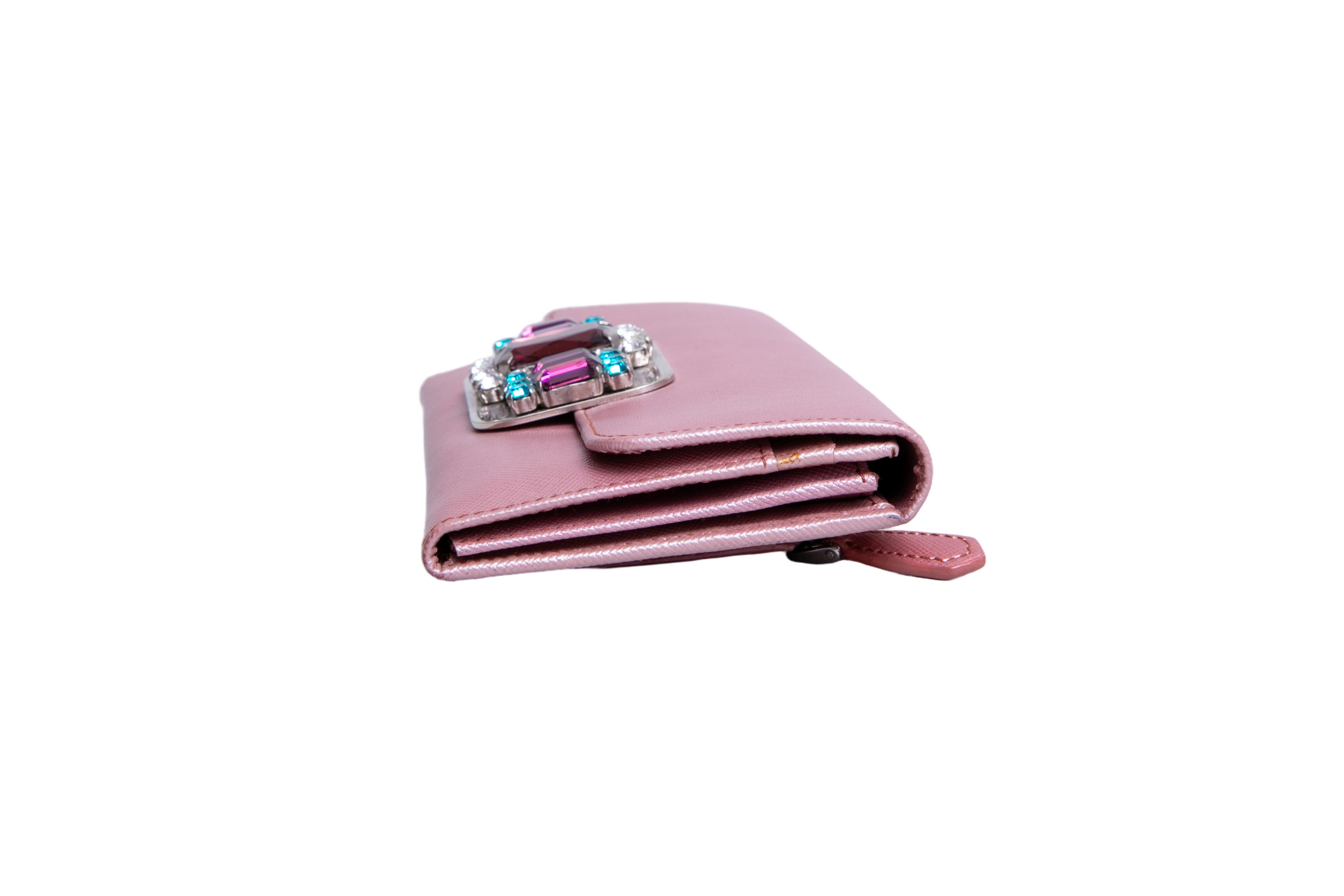 Carteira confeccionada em couro saffiano na cor rosa. Possui formato retangular, fechamento por aba e detalhe frontal em pedrarias.