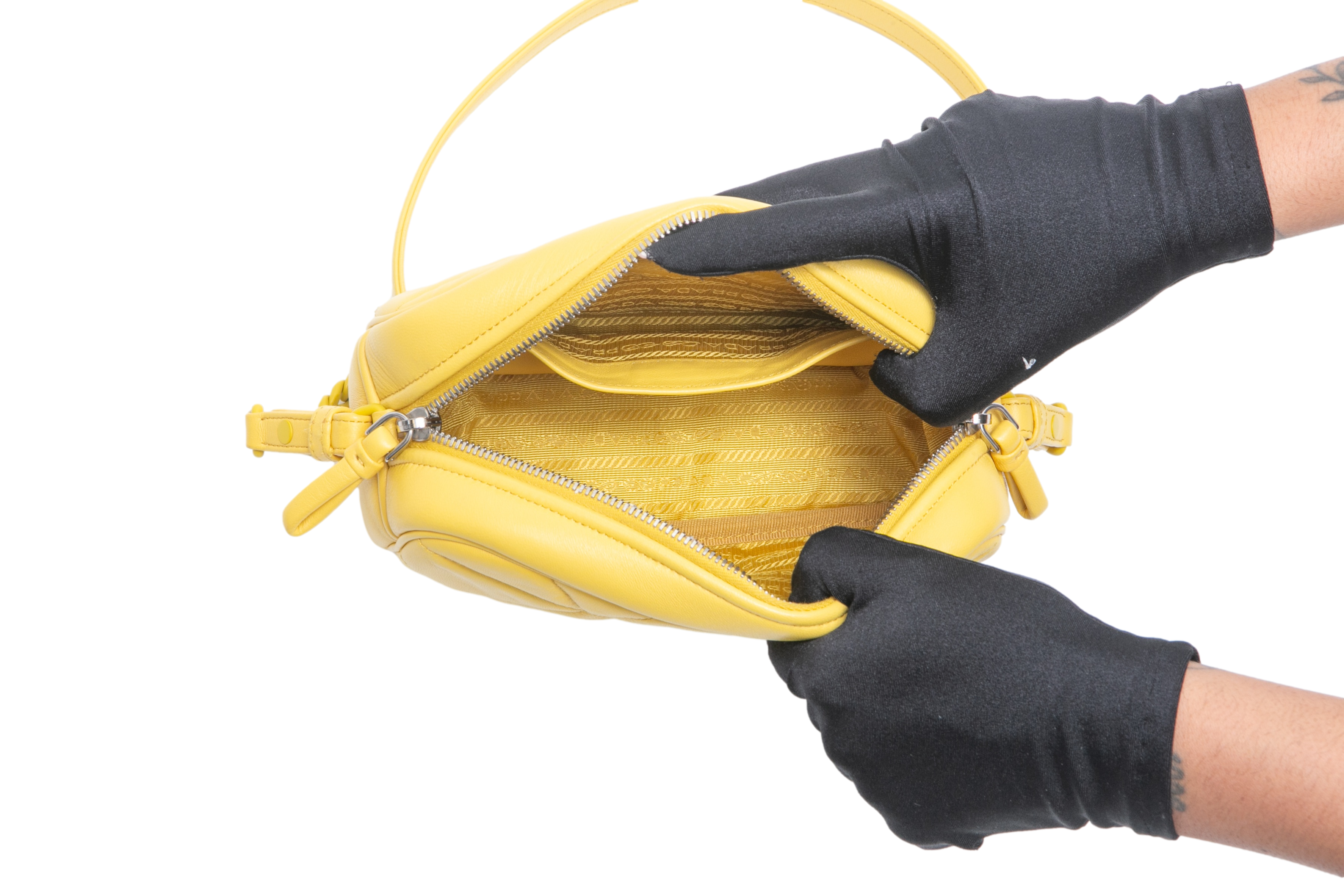O interior é forrado e possui compartimentos que facilitam a organização de itens essenciais, como carteira, celular e chaves. O logo discreto da Prada confere um toque de sofisticação adicional, evidenciando a autenticidade e o prestígio da marca.