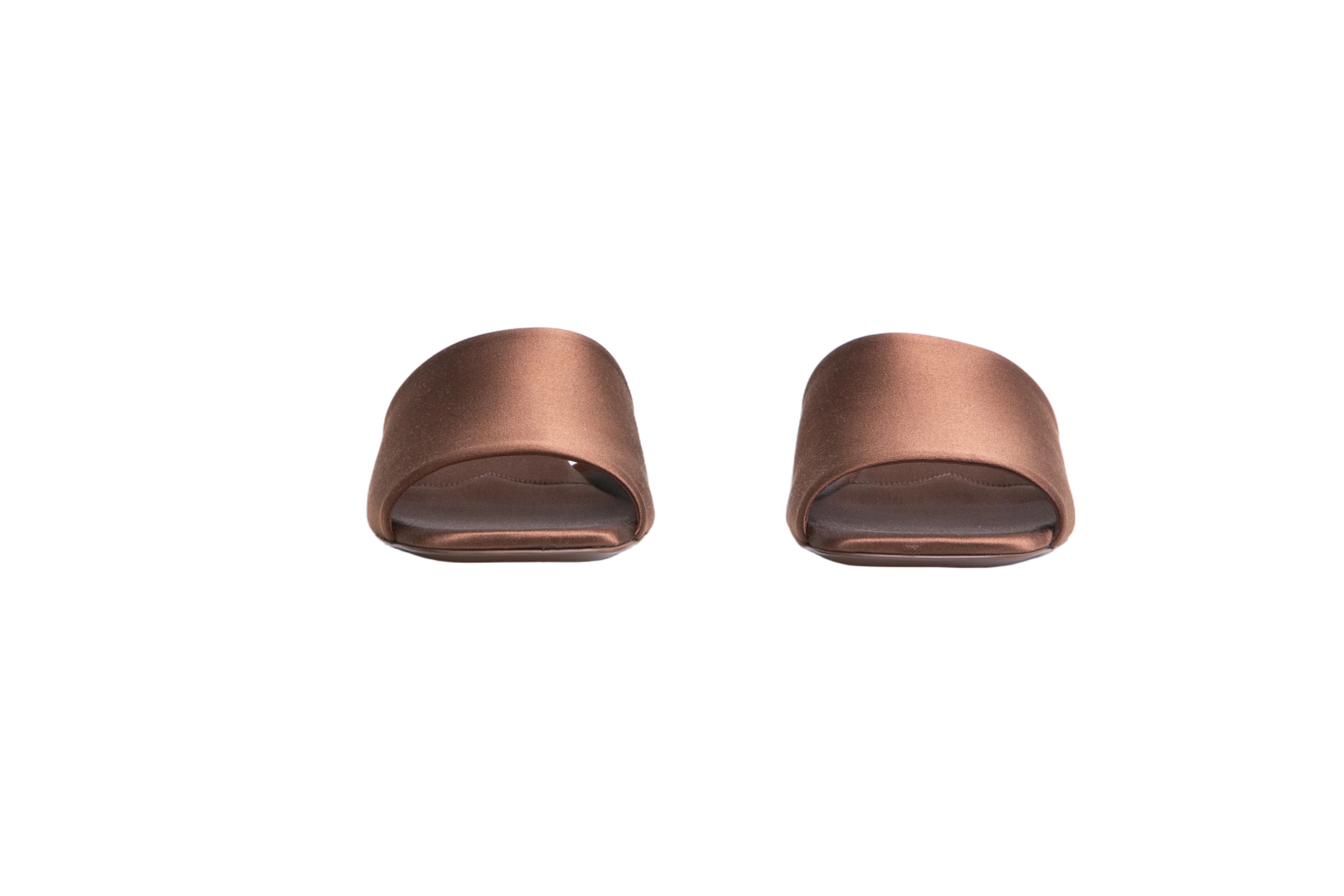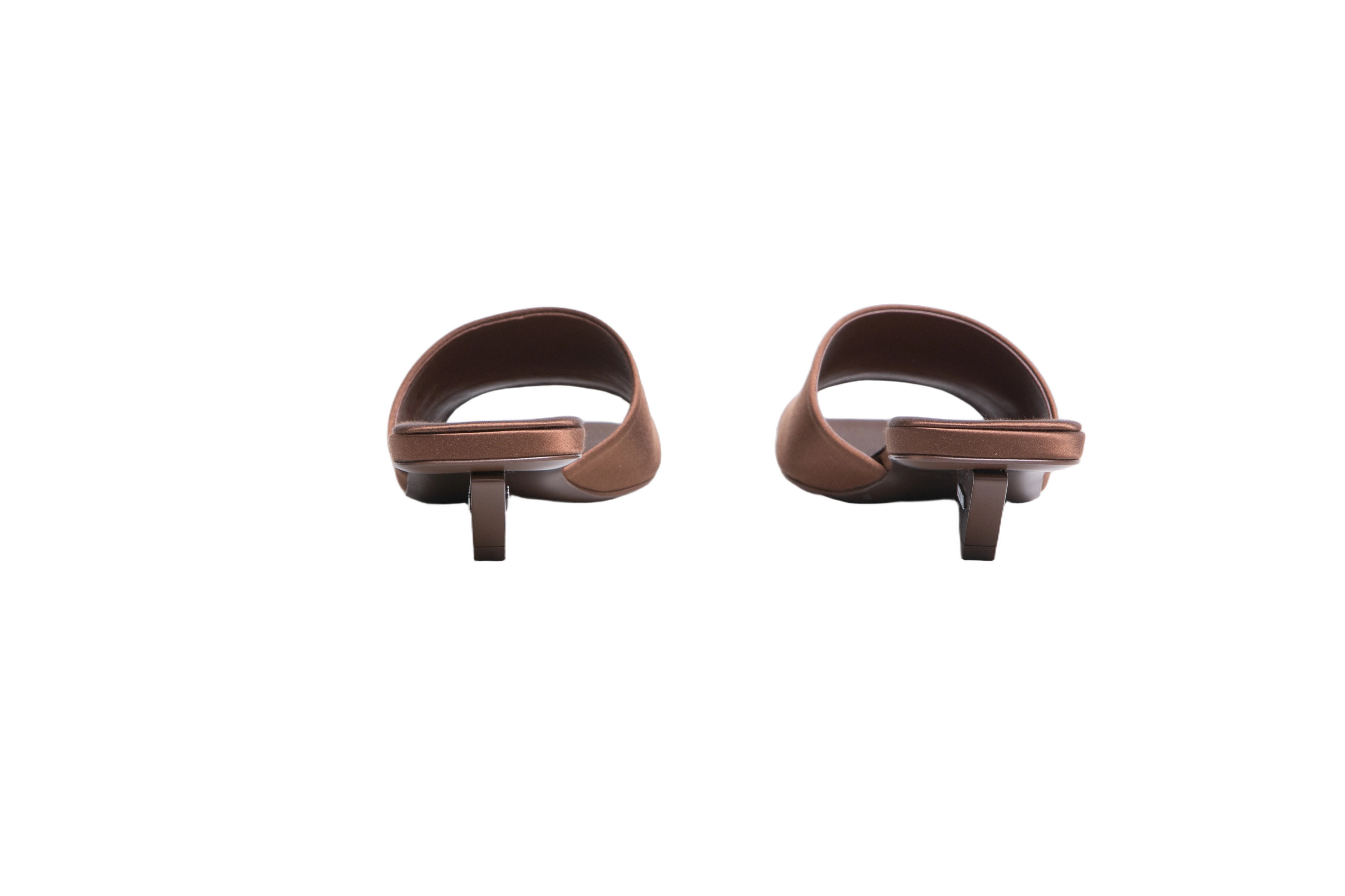 Sandália em cetim marrom, modelo slide de bico quadrado com tira larga única na parte frontal. Possui salto baixo geométrico de aproximadamente 3 cm, com logo da marca em destaque na lateral.