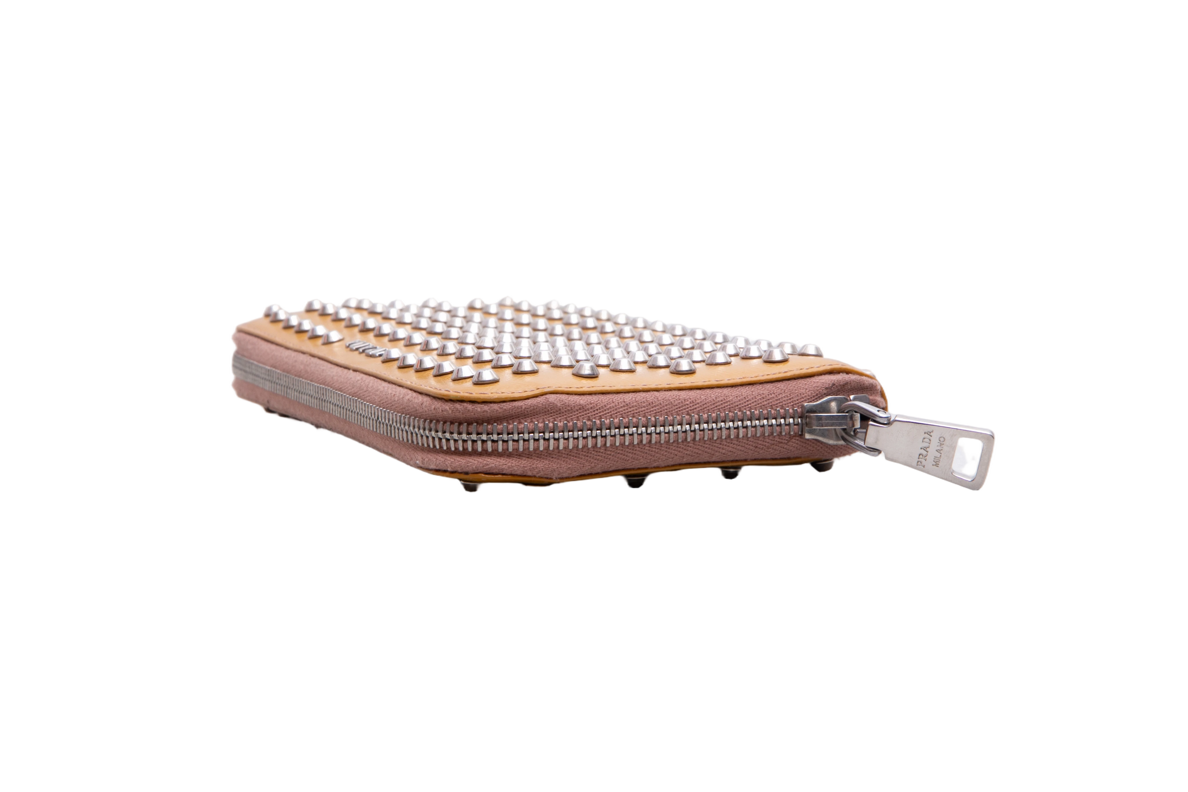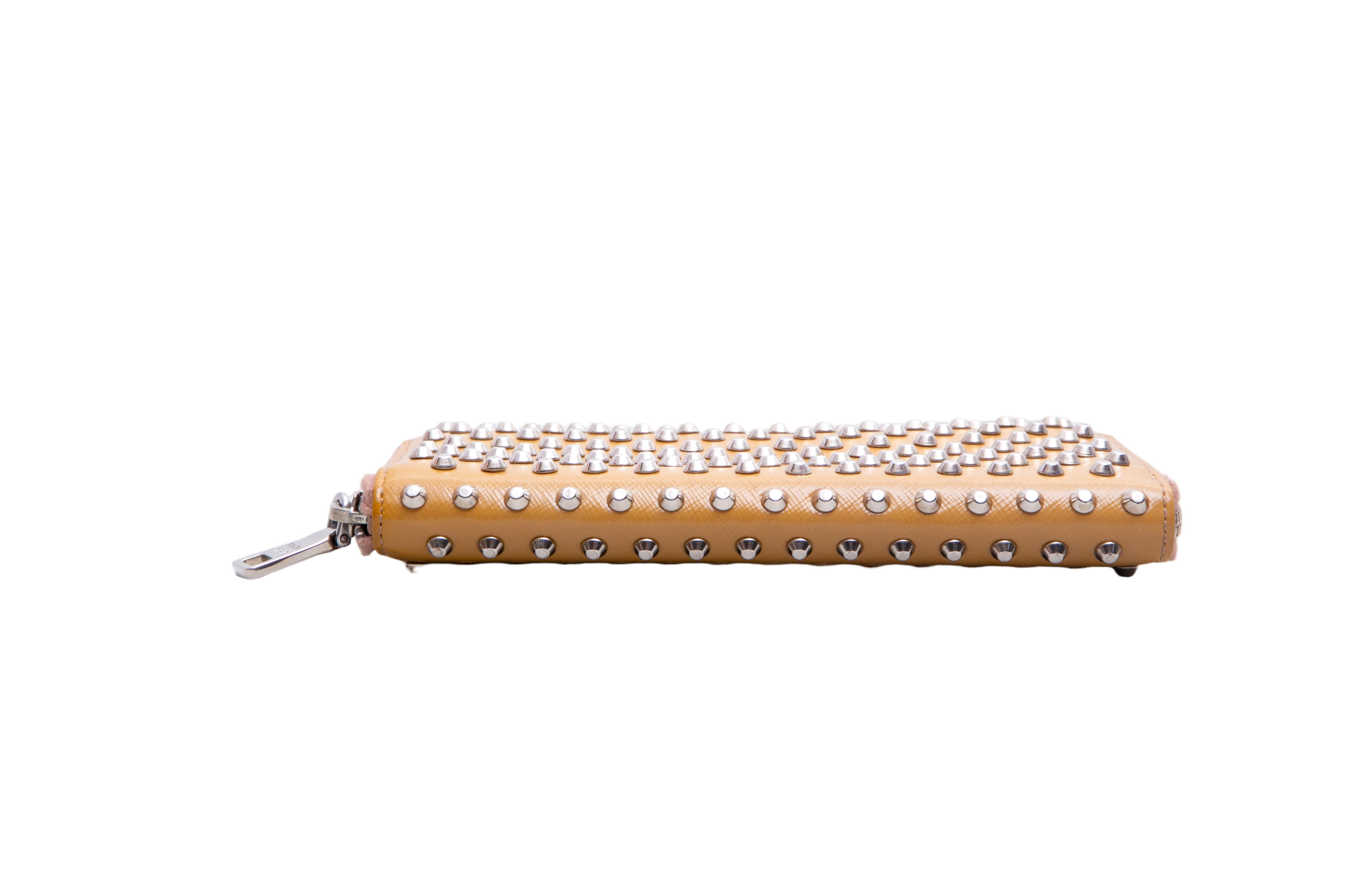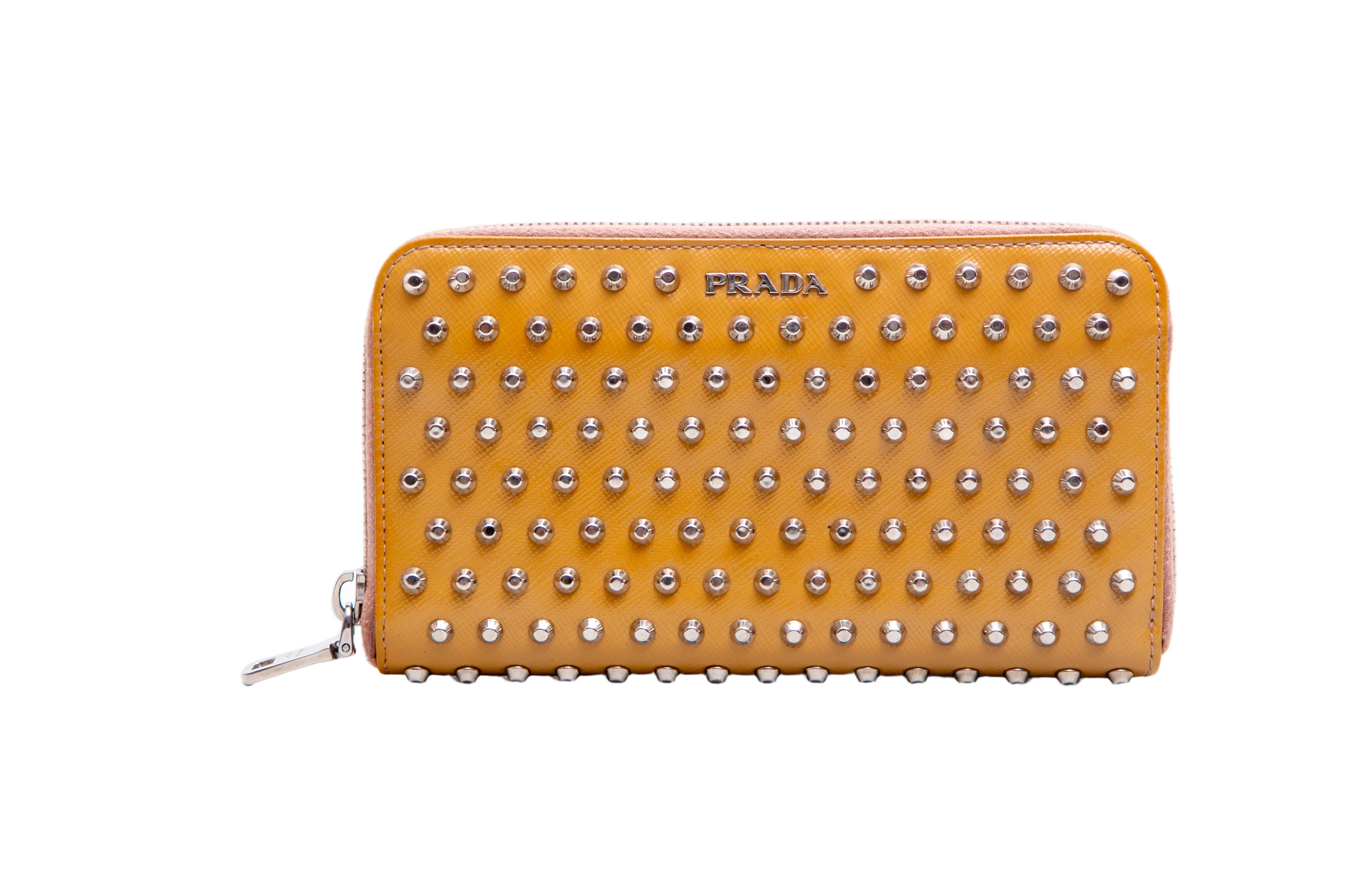 Carteira confeccionada em couro saffiano na cor mostarda, com aplicação de studs metálicos. Possui fechamento por zíper e logo Prada em metal na parte frontal.