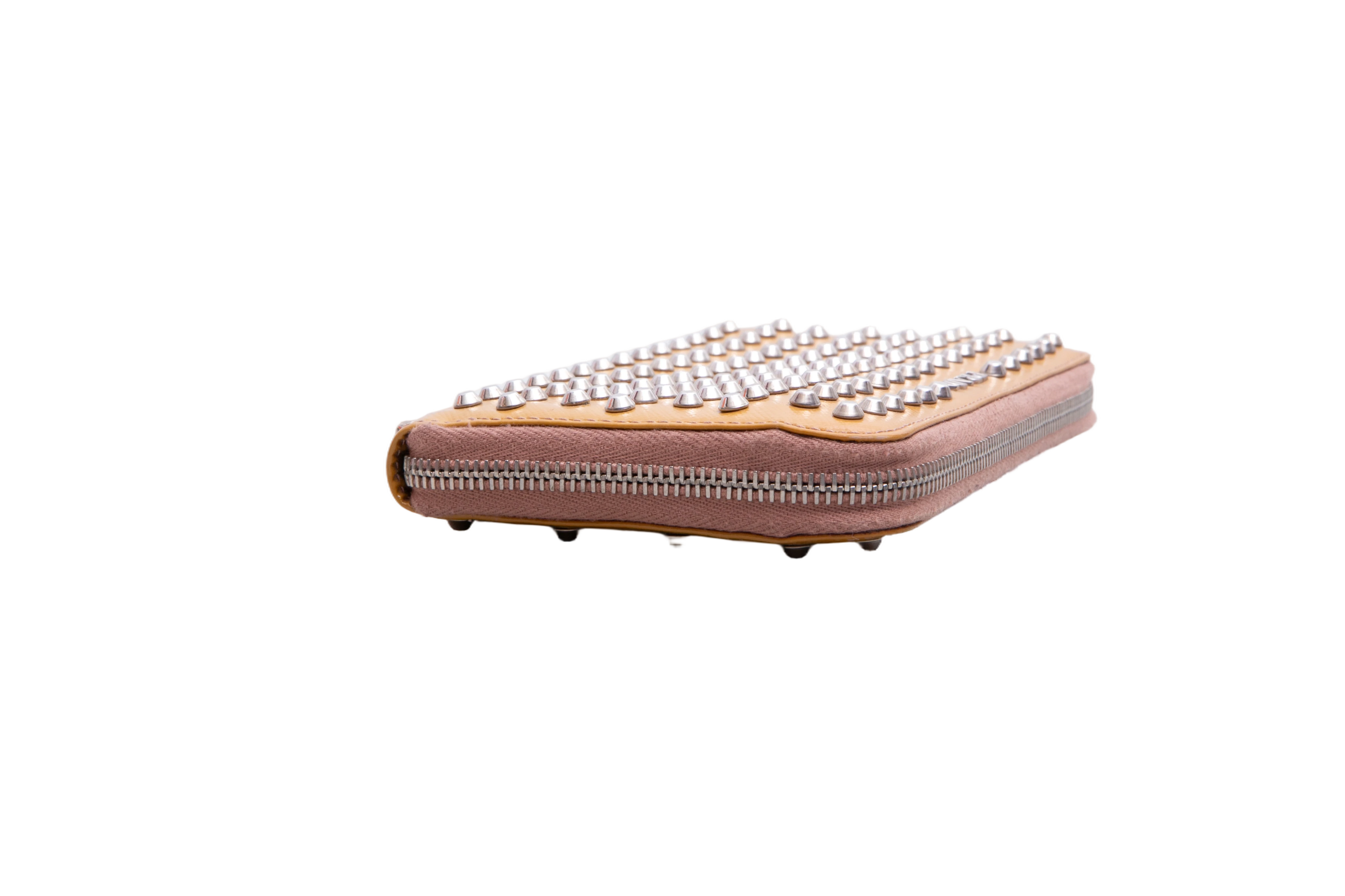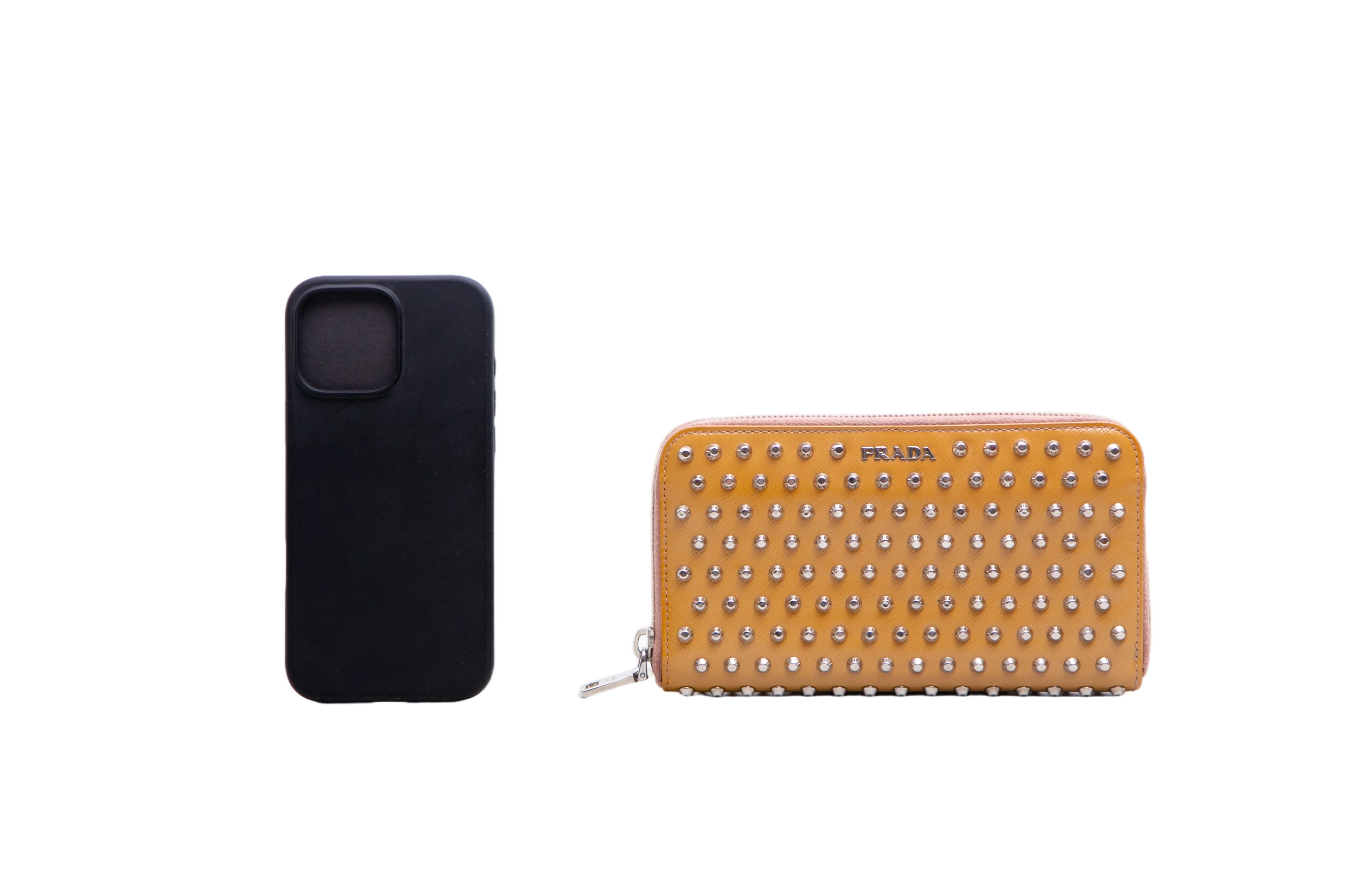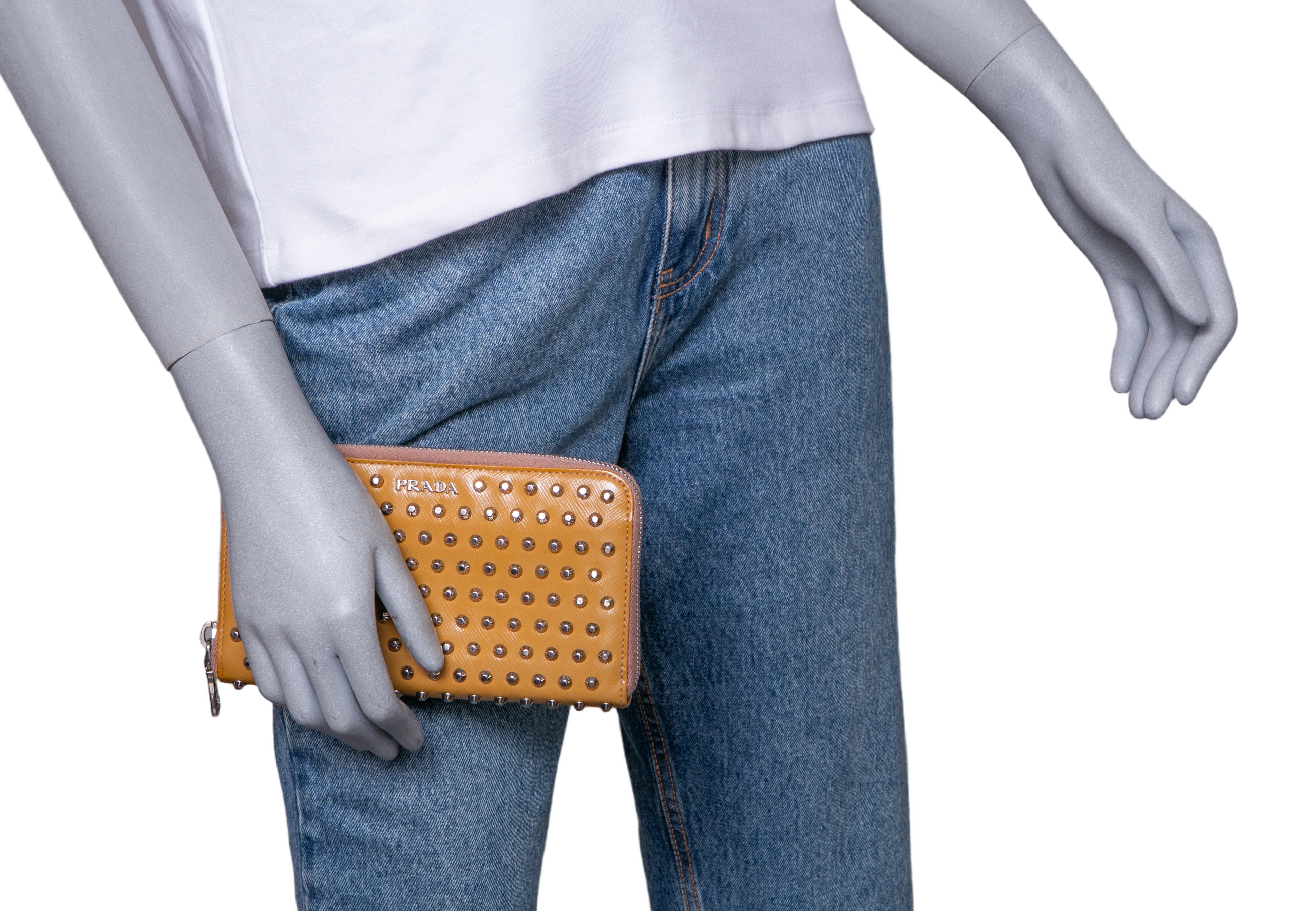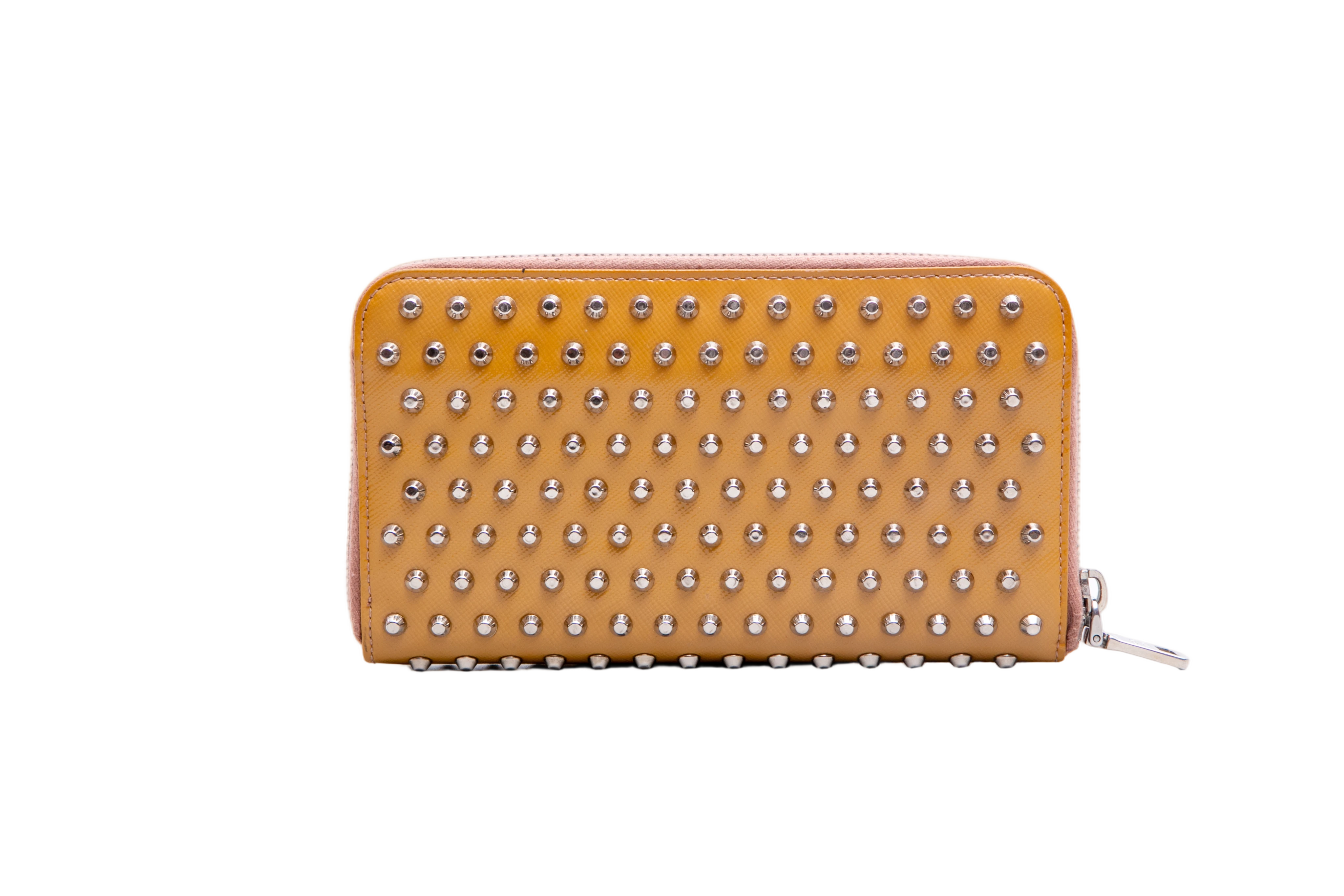 Carteira confeccionada em couro saffiano na cor mostarda, com aplicação de studs metálicos. Possui fechamento por zíper e logo Prada em metal na parte frontal.