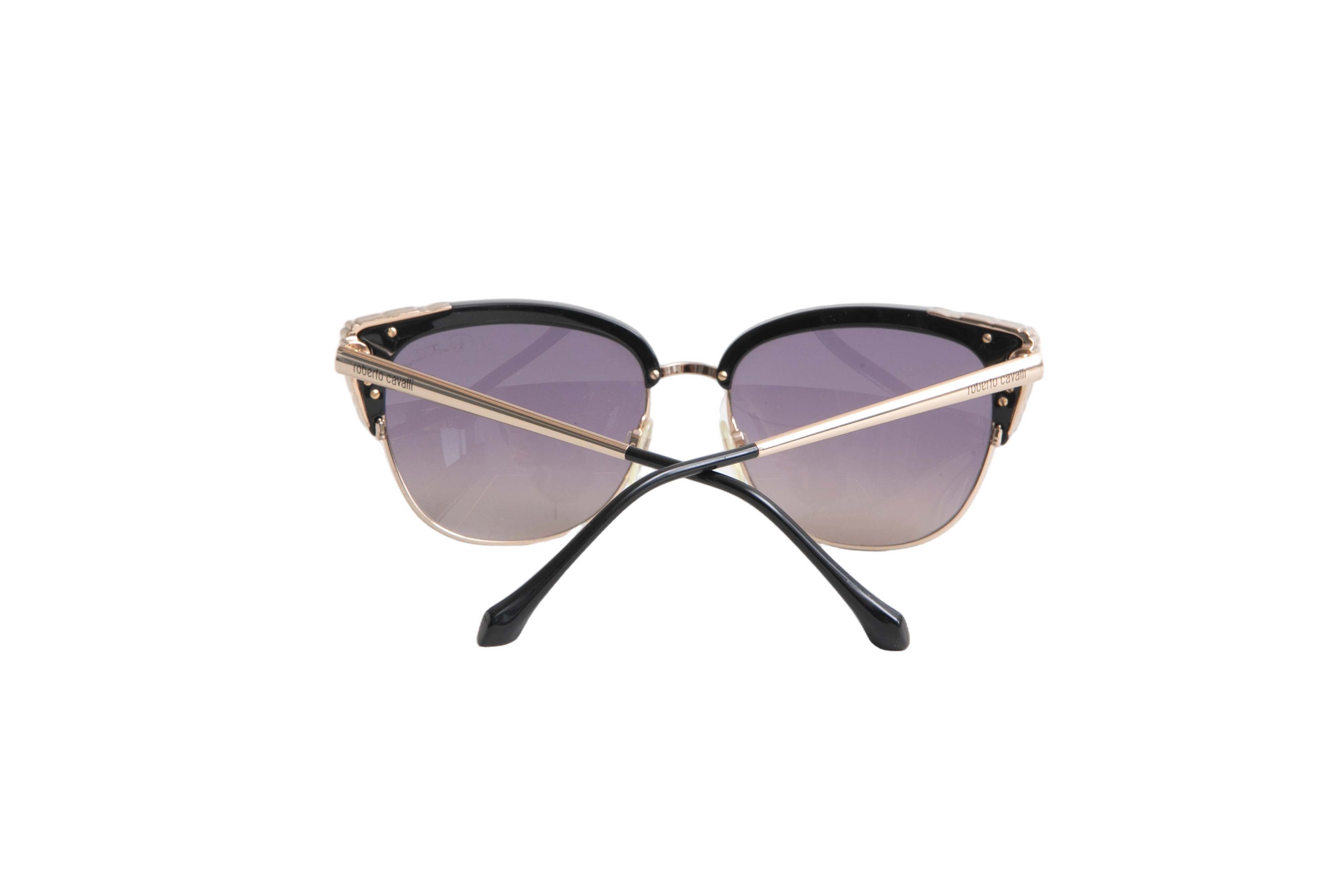 Óculos de sol com armação metálica dourada e detalhes em acetato preto na parte superior. Possui lentes em tom degradê roxo e formato levemente arredondado.
