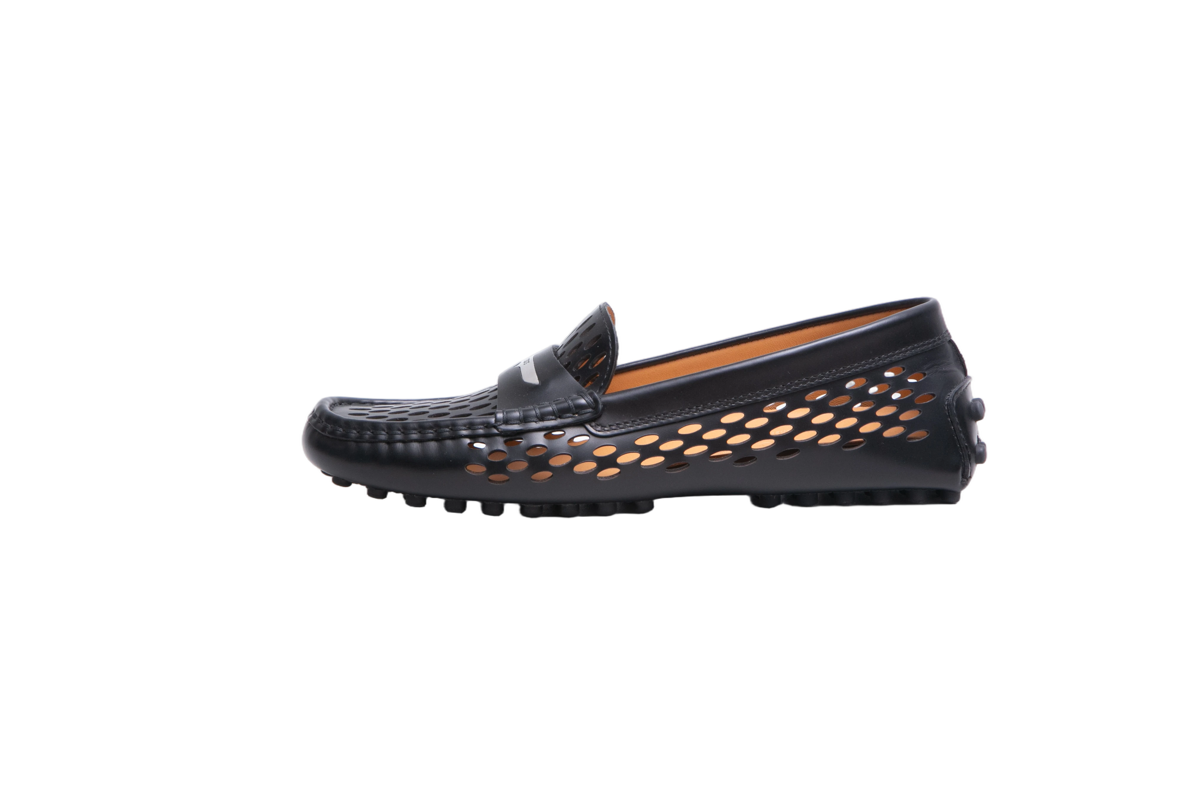 Mocassim em couro preto, com design vazado em formato geométrico. Possui detalhe em placa metálica com assinatura da marca na parte superior e acabamento em costura manual no cabedal. O interior é forrado em couro caramelo e solado conta com bolinhas de borracha.