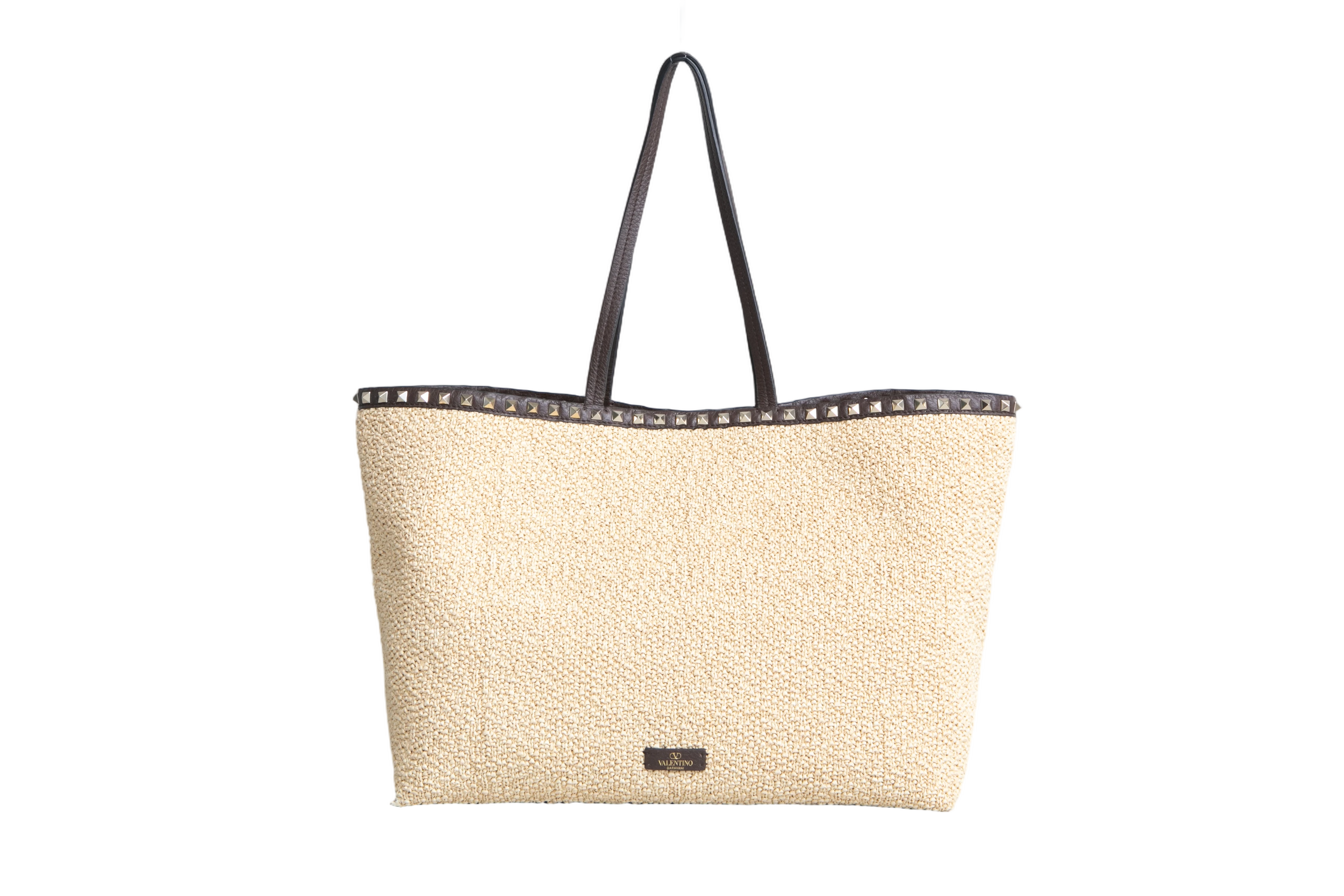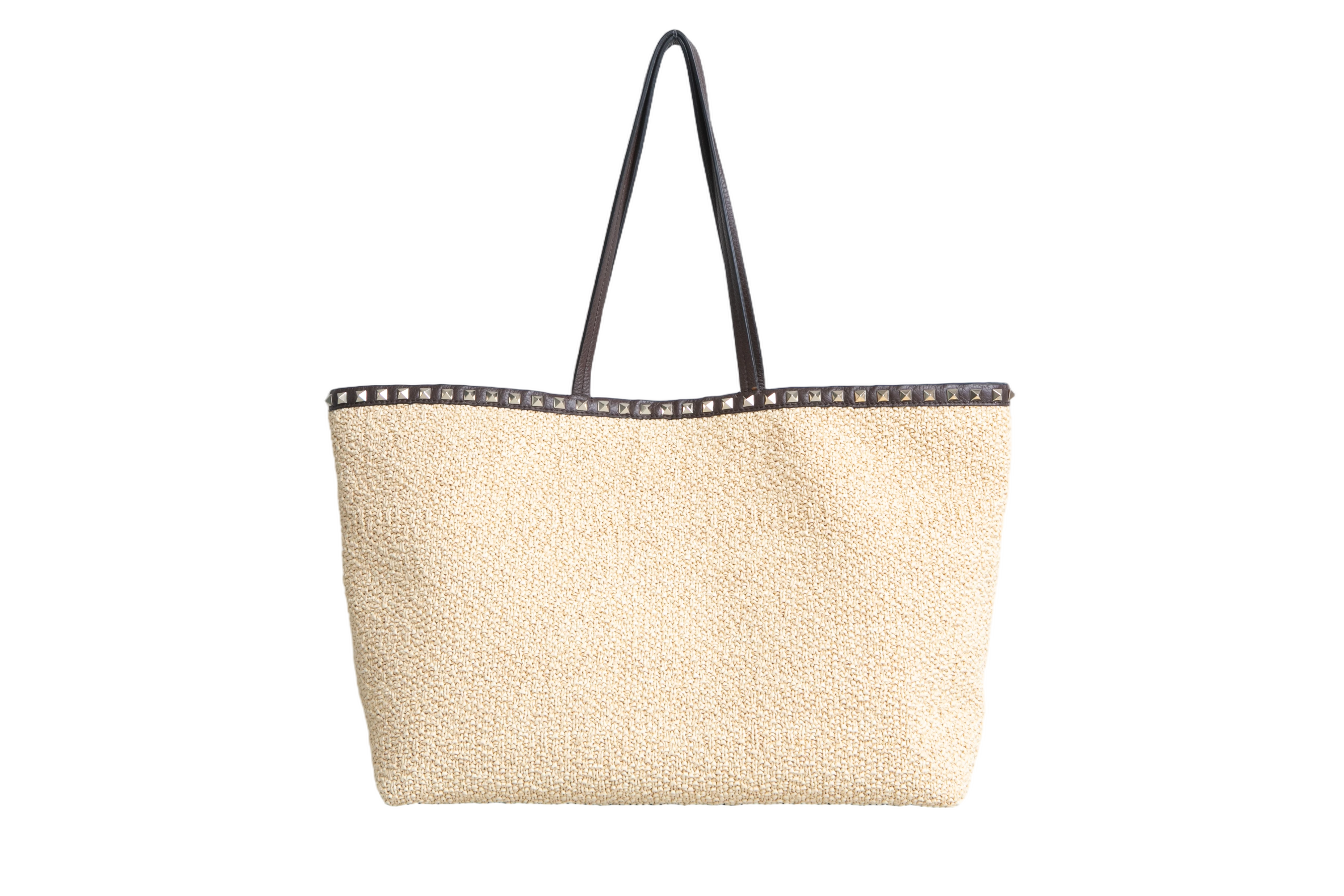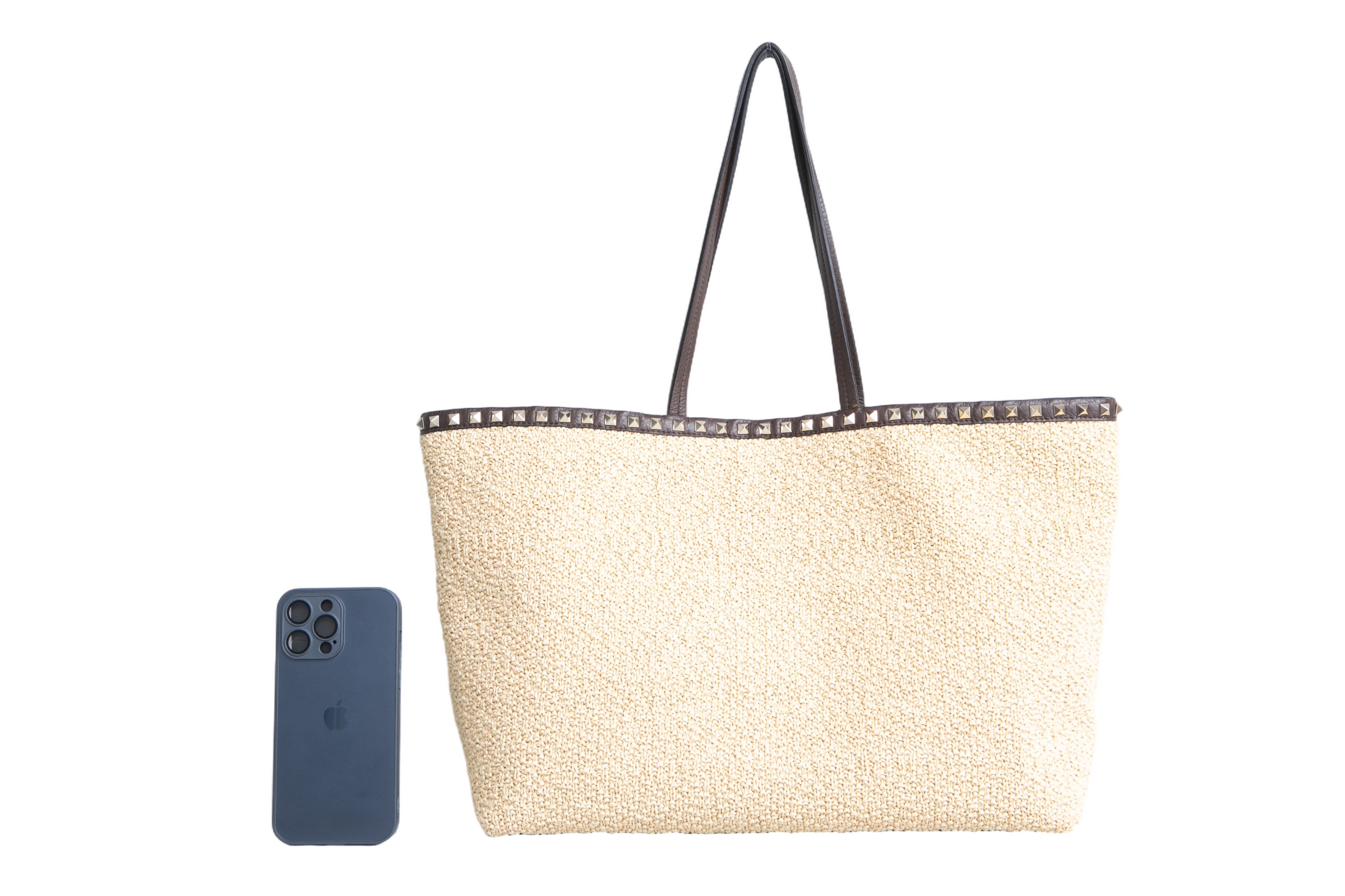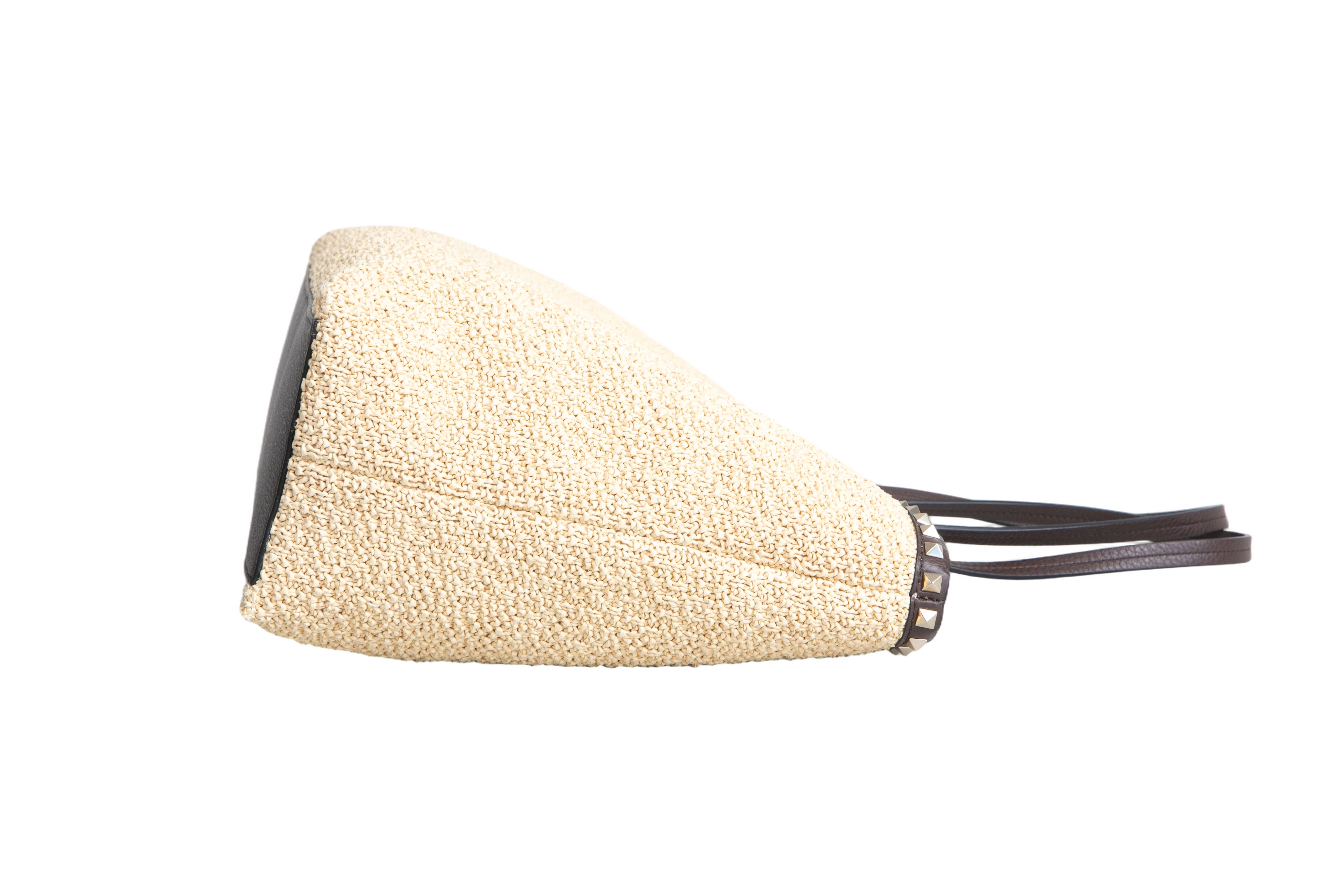 Valentino Rockstud Raffia Tote Natural/Dark Brown. Peça em perfeito estado, possui pequenos sinais de uso na raffia. Acomoda todos os tamanhos de telefone.